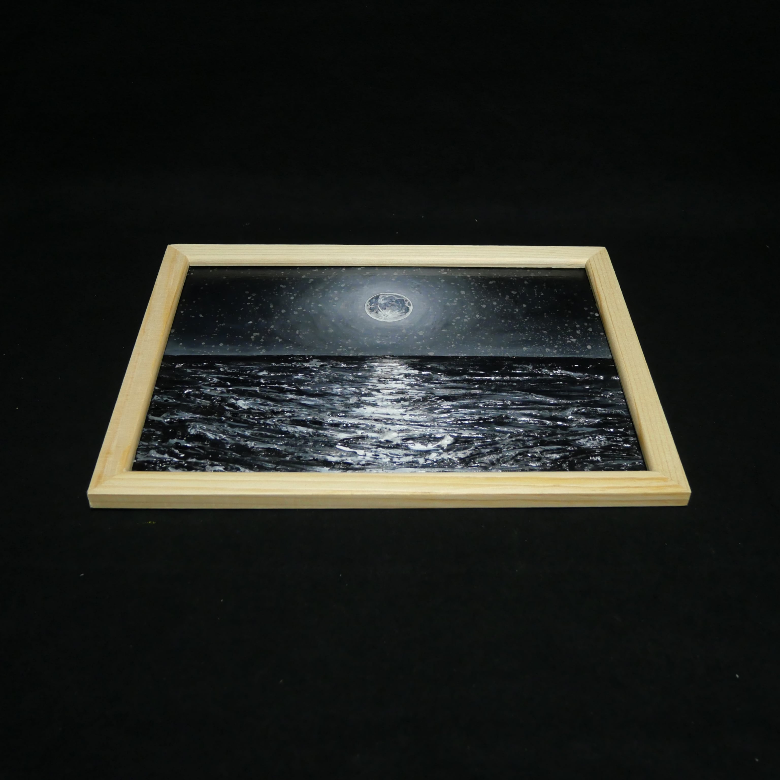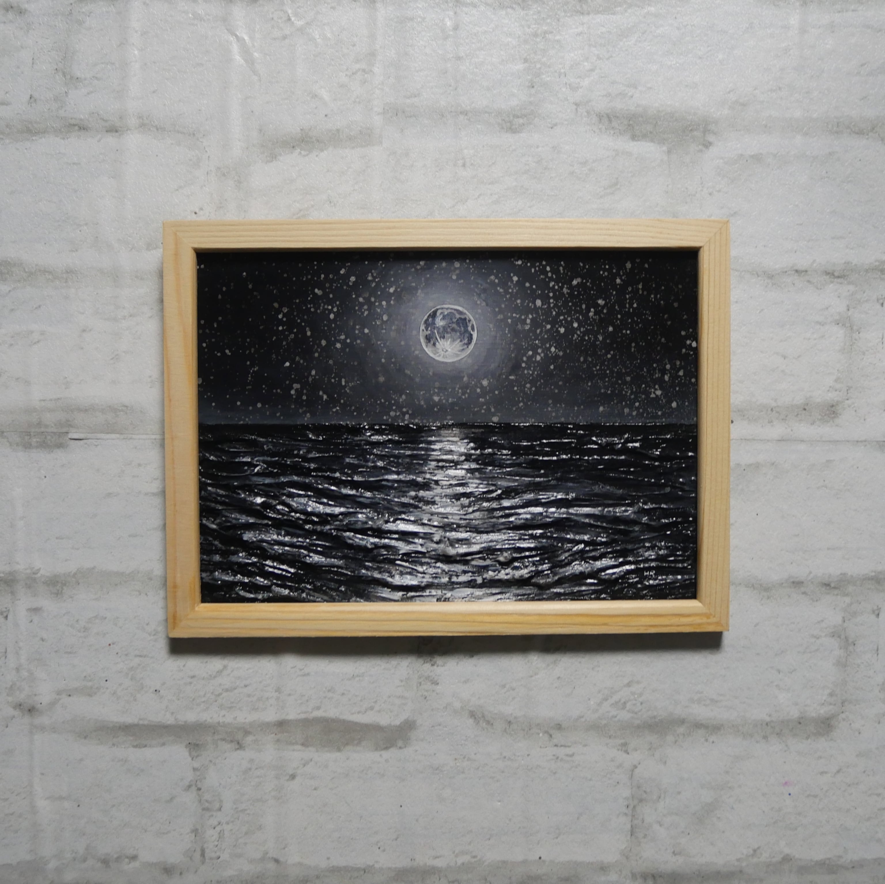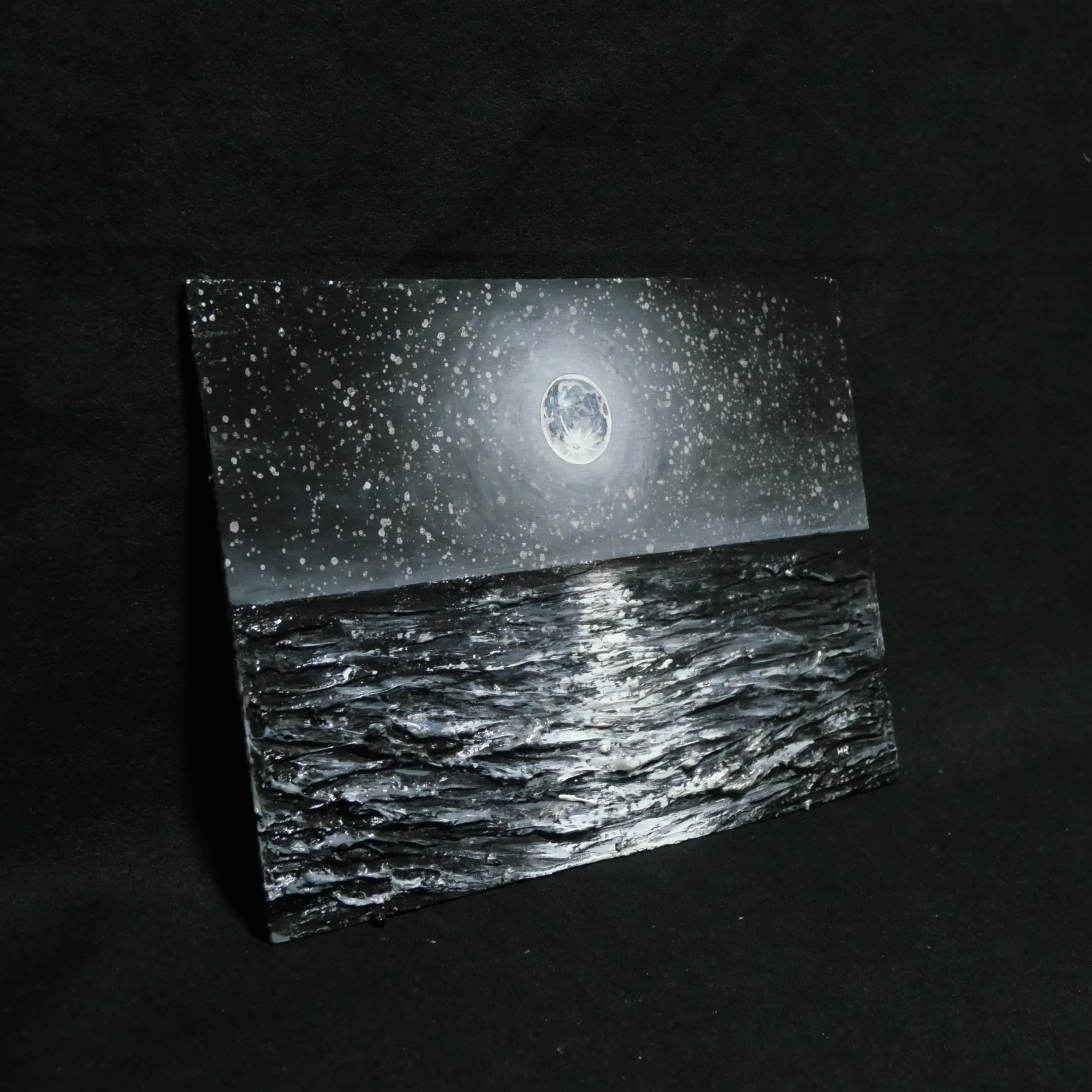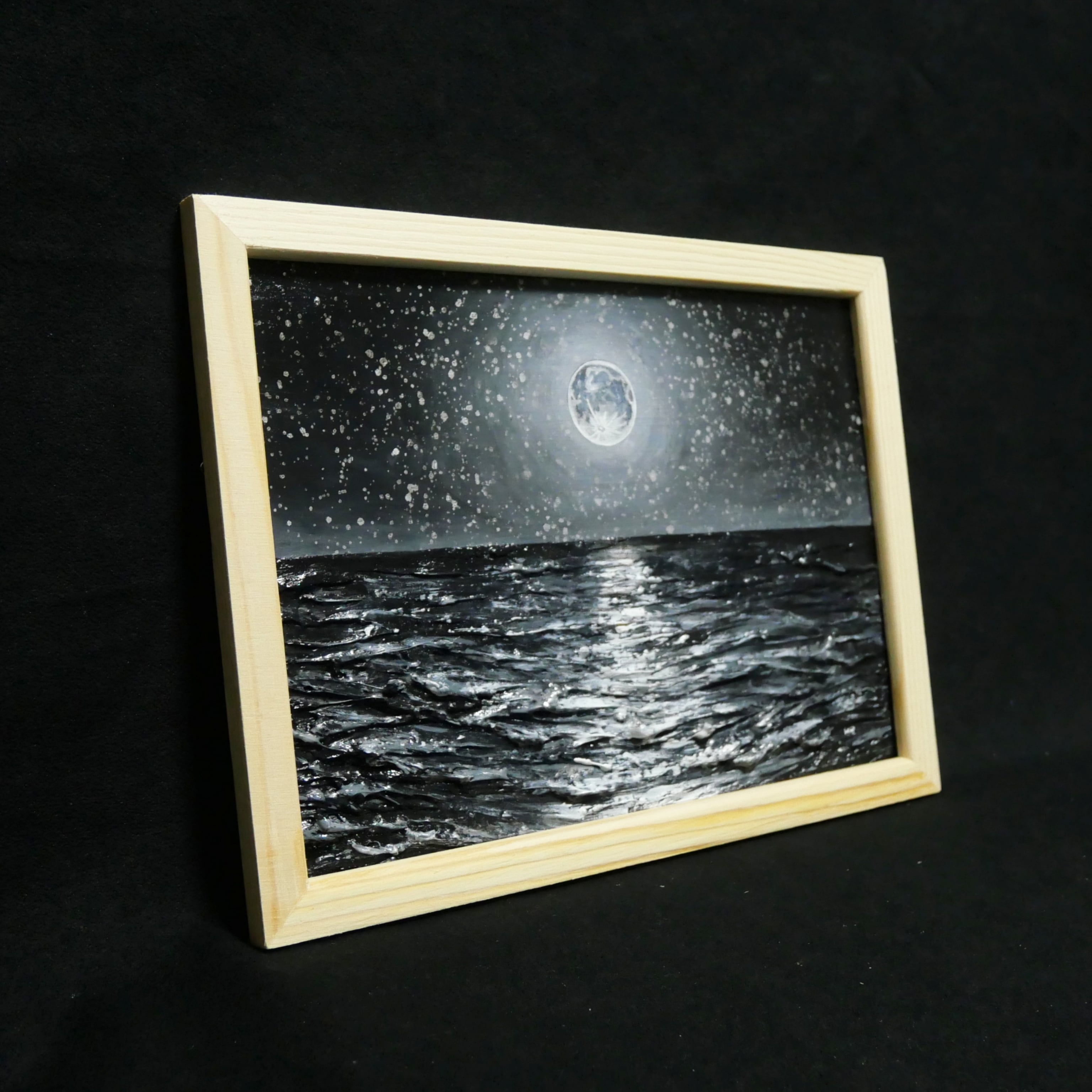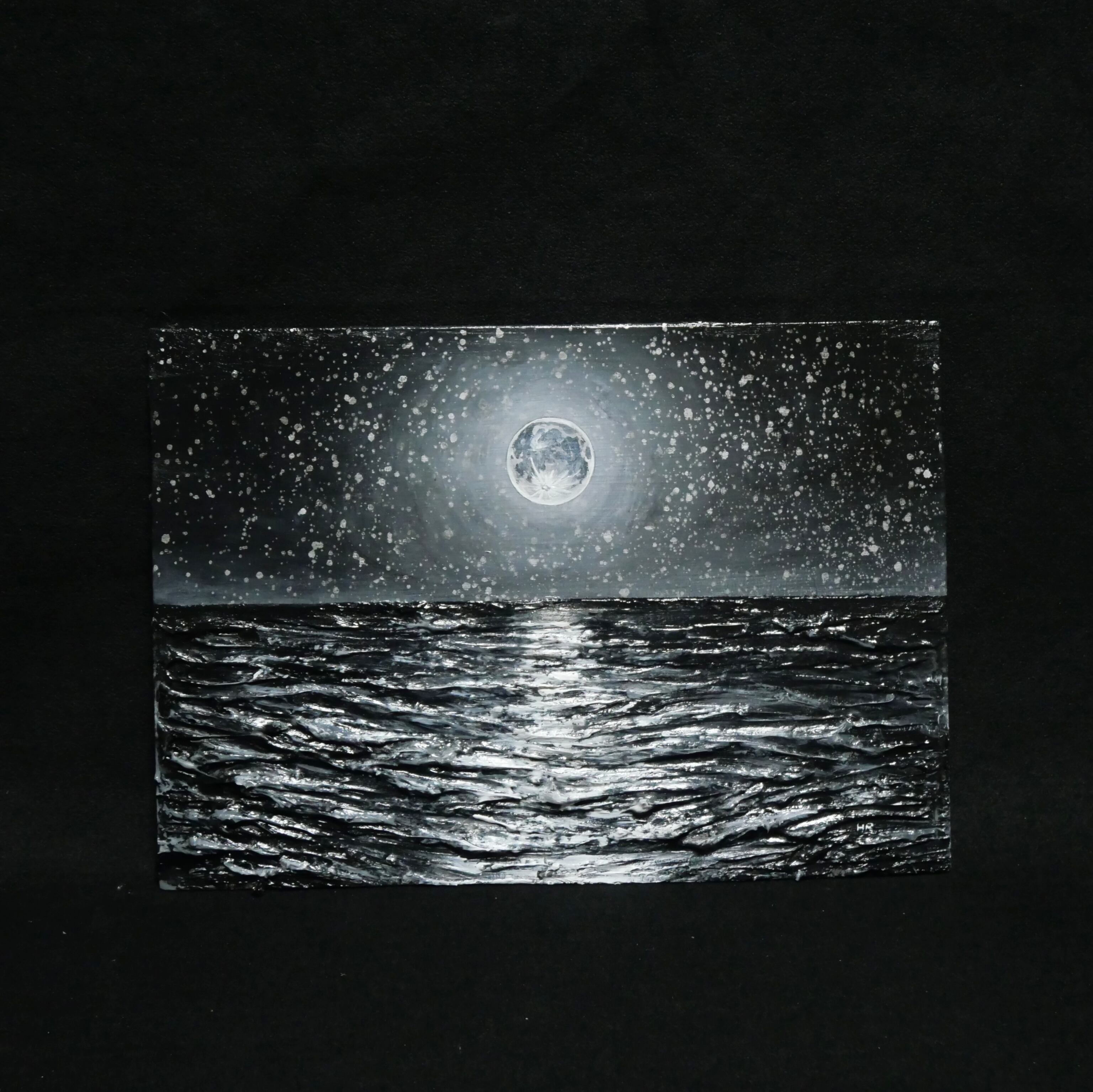 「白黒の満月と星空の海」は、幻想的なモノクロームの世界を広げる特別な油絵作品です。画面いっぱいに広がる波の力強い動きと、空に瞬く無数の星々との対比が印象的で、満月の神秘的な輝きが一層際立っています。鑑賞者を深い安らぎと内省の時間へと導くこの作品は、まさに心の奥深くに響く力強い表現です。