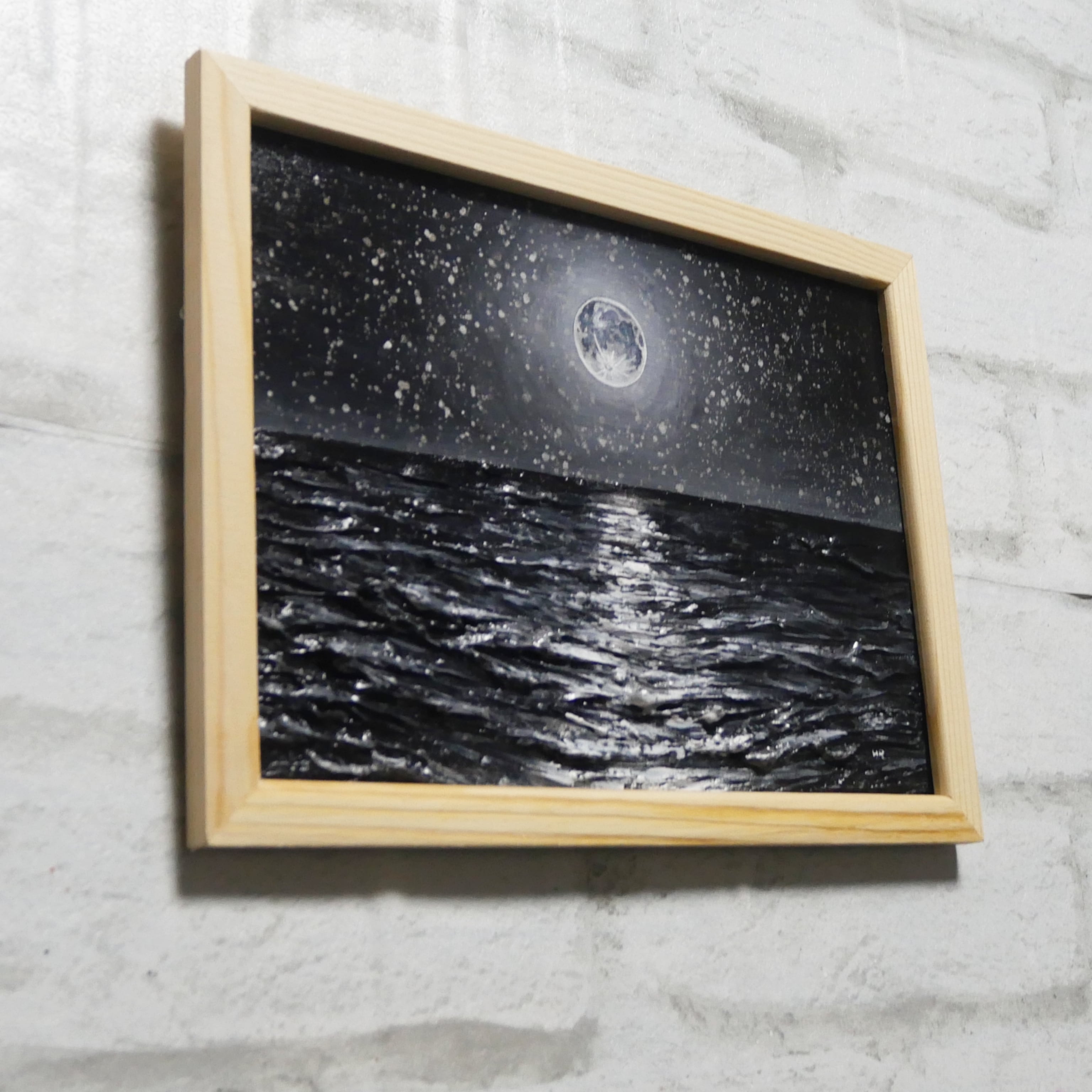 油絵 油彩 油彩画 絵 絵画 【白黒の満月と星空の海】