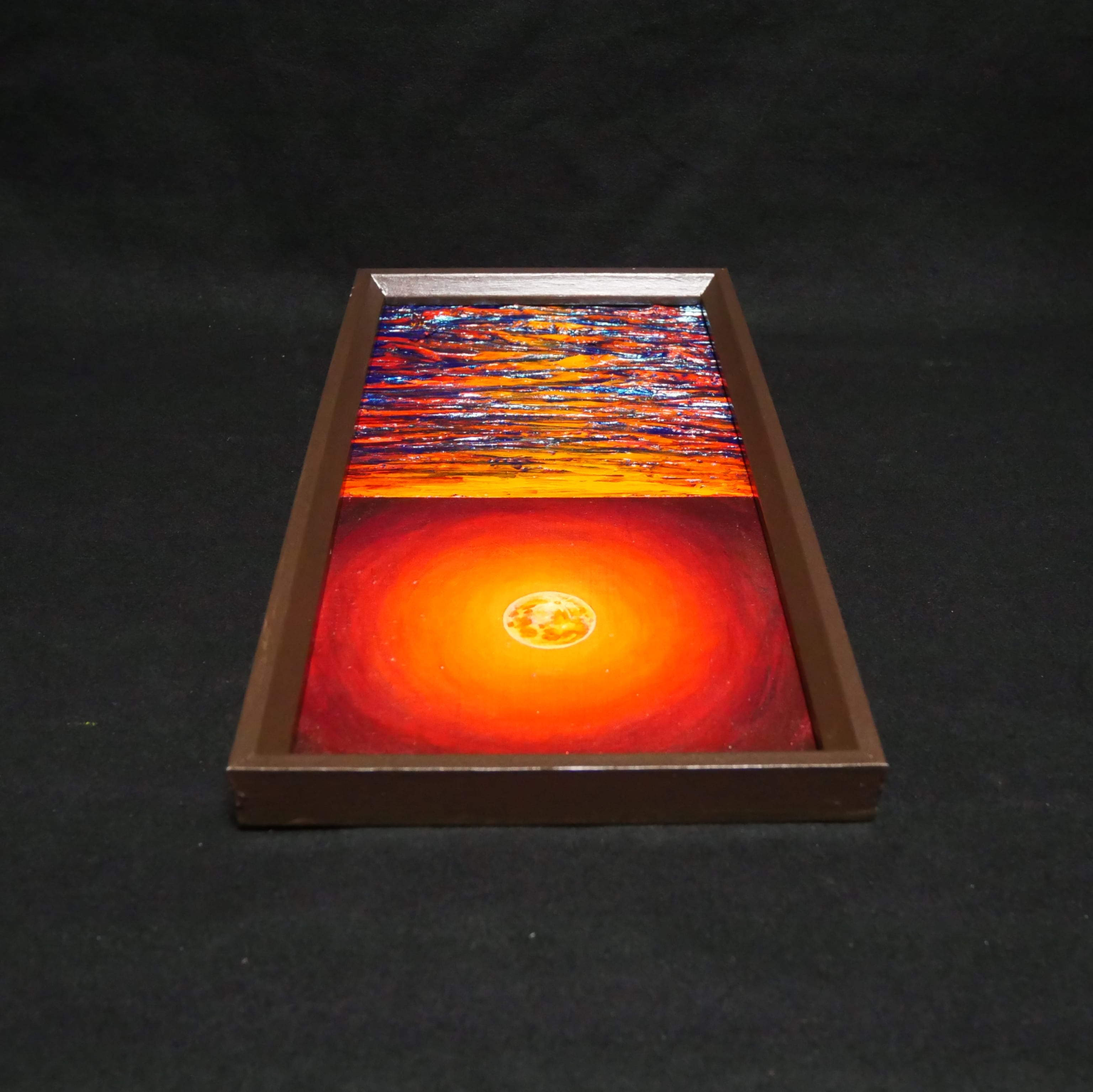 「神秘的な夜」は、幻想的な夜空と海を描いた美しい油絵作品です。特に、燃え盛るオレンジ色の満月が夜空の中心で輝き、その周囲に広がる深い赤から黒へのグラデーションが、圧倒的な存在感を放っています。この作品は、月の神秘性と夜の静寂を見事に表現しており、見る者の想像力を掻き立てることでしょう。