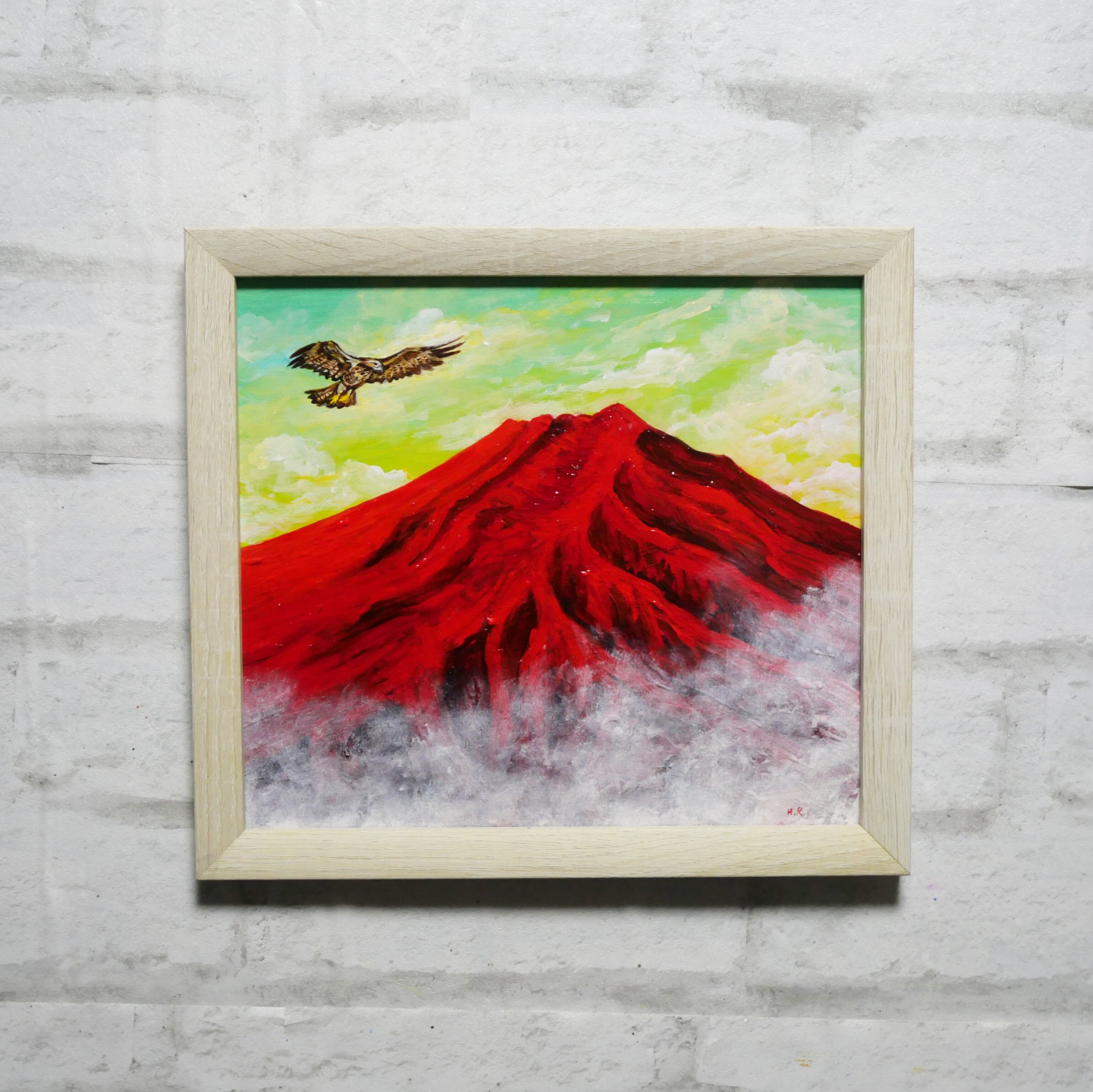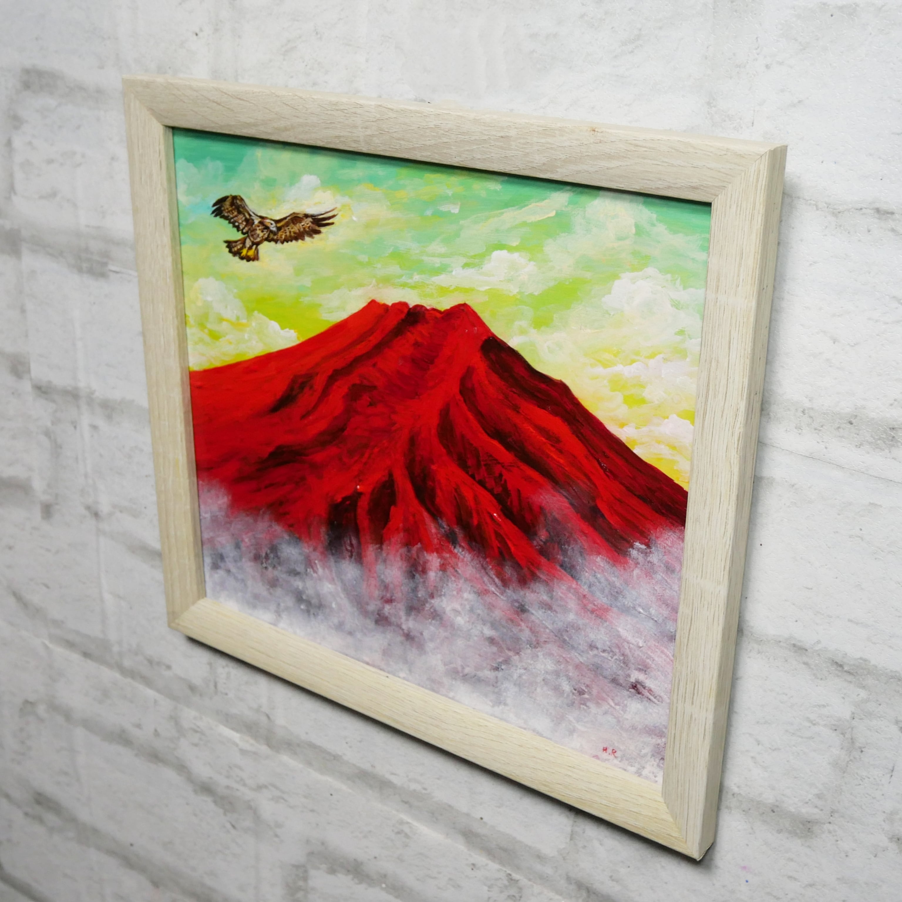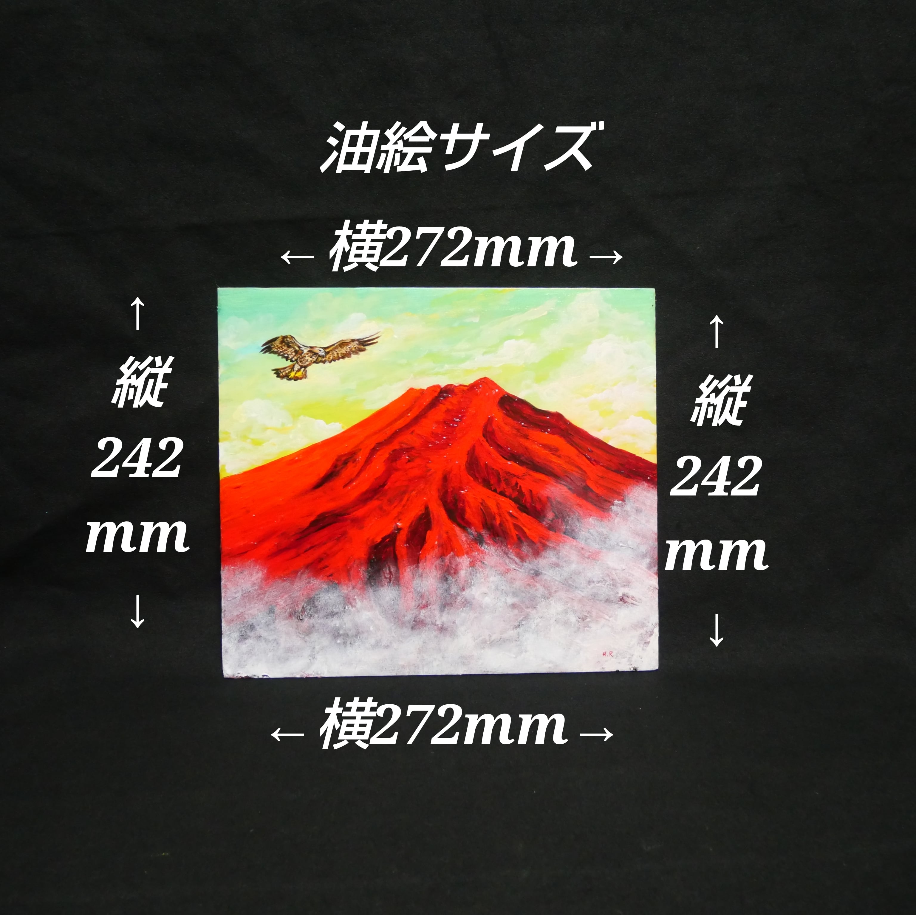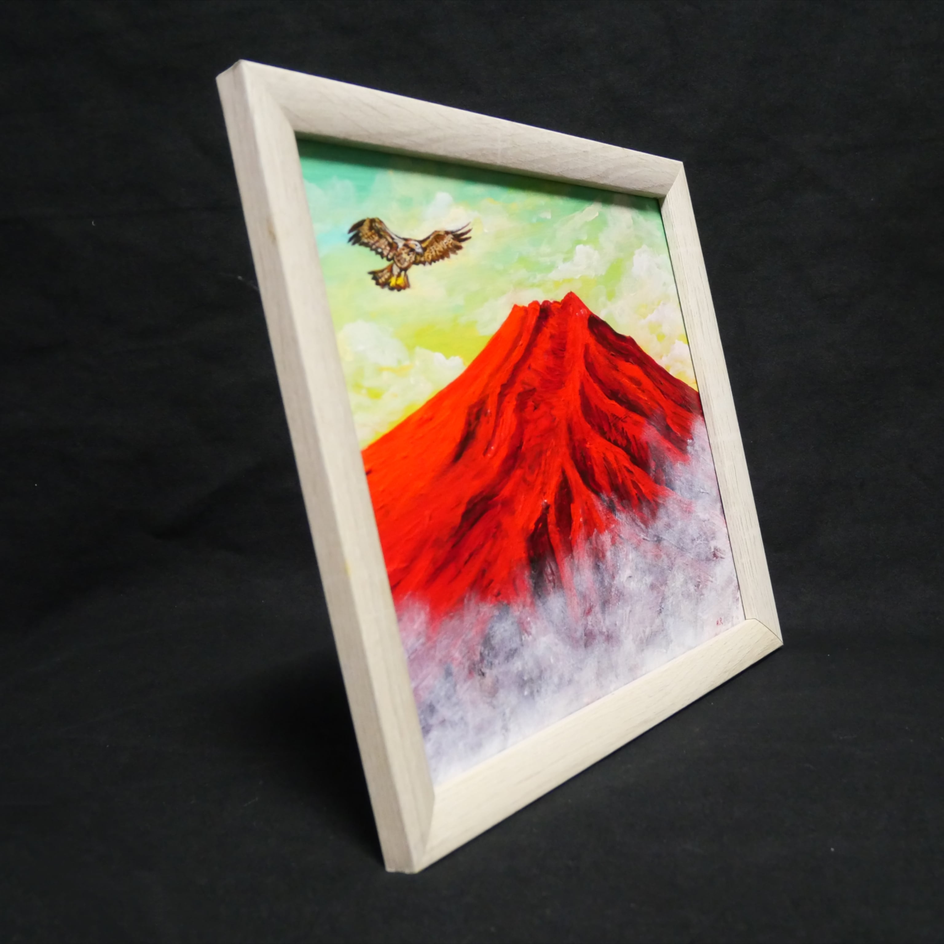 「富士山と鷹」は、圧倒的なエネルギーと鮮やかな色彩が感じられる美しい油絵作品です。特に、真紅に染まる富士山は、見る者に深い感動を与えるインパクトがあります。この作品は、夏から秋にかけての早朝にのみ見られる稀有な気象現象「赤富士」を捉え、古来から願望成就や商売繁盛の象徴とされています。
