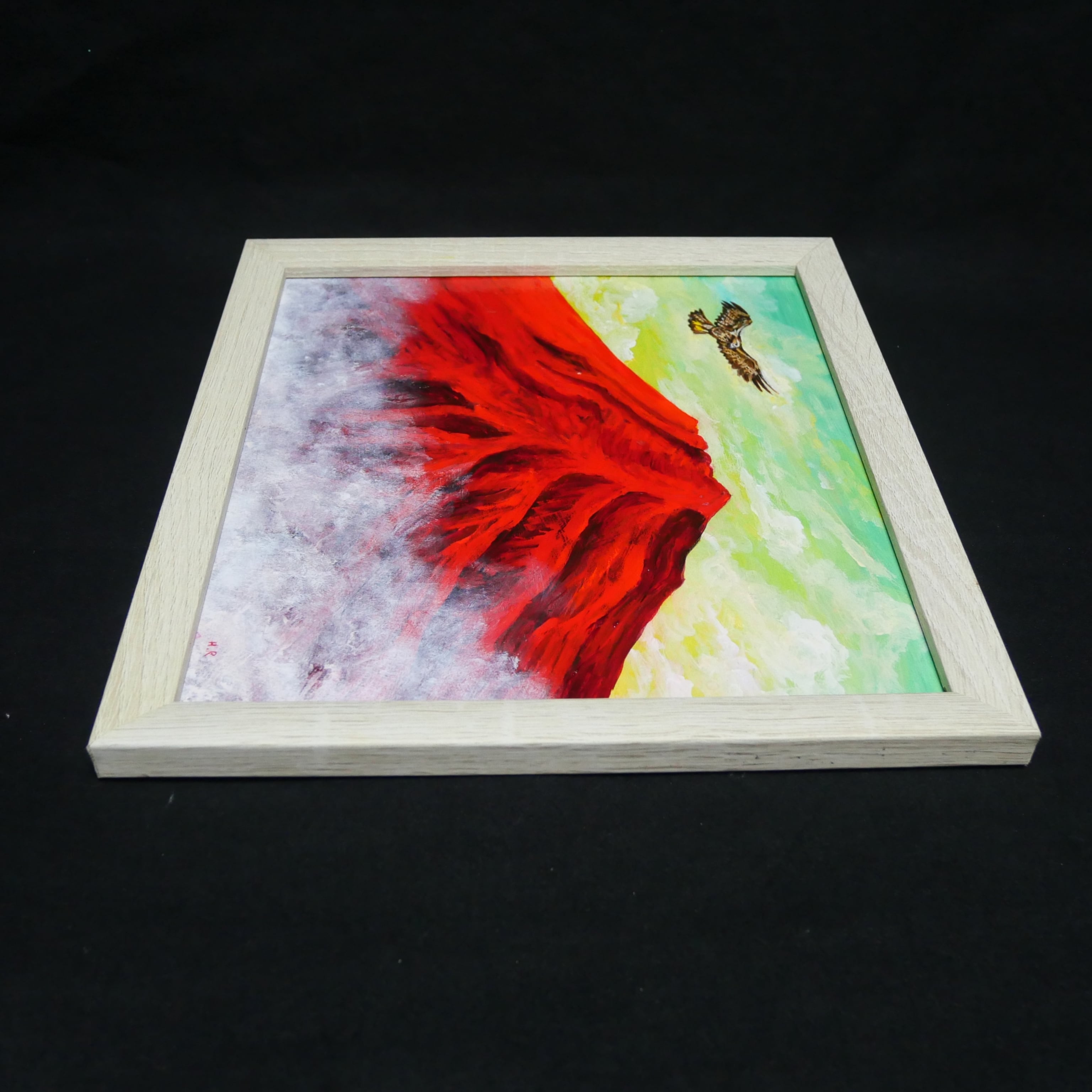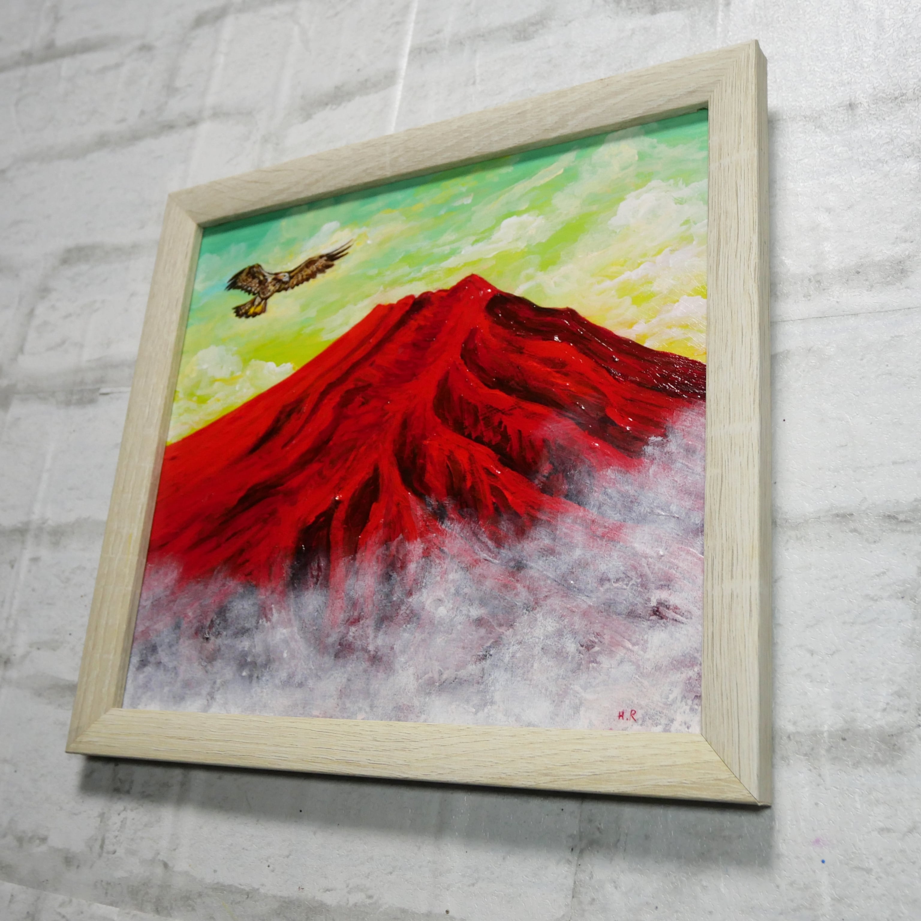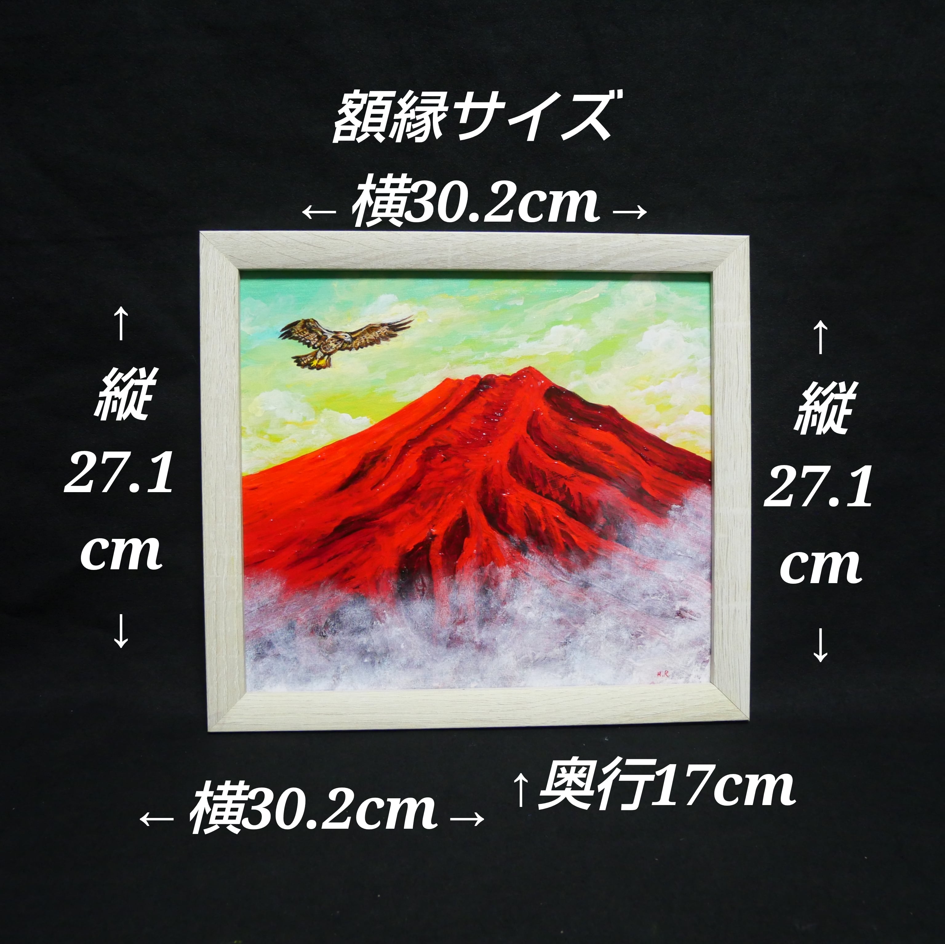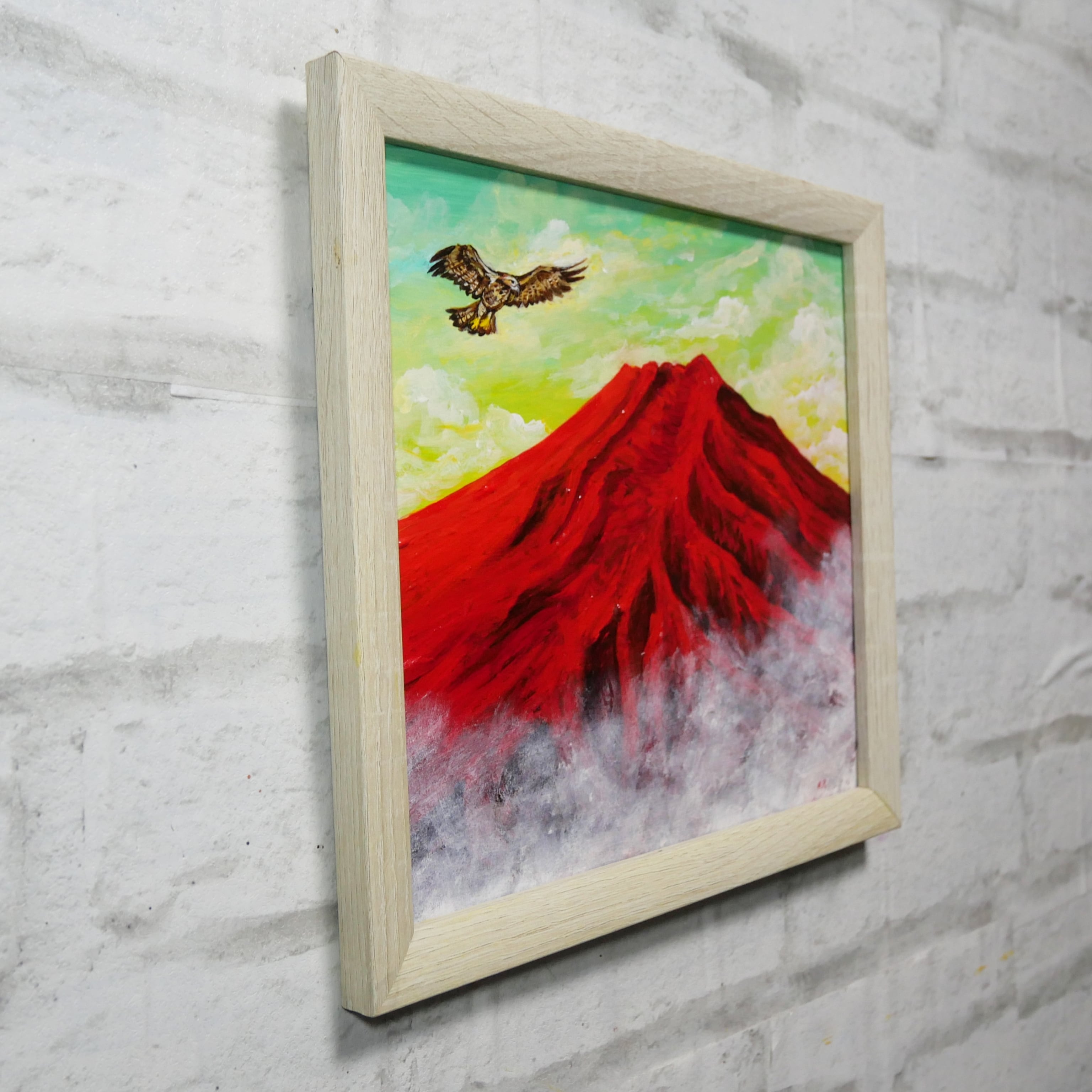「富士山と鷹」は、圧倒的なエネルギーと鮮やかな色彩が感じられる美しい油絵作品です。特に、真紅に染まる富士山は、見る者に深い感動を与えるインパクトがあります。この作品は、夏から秋にかけての早朝にのみ見られる稀有な気象現象「赤富士」を捉え、古来から願望成就や商売繁盛の象徴とされています。