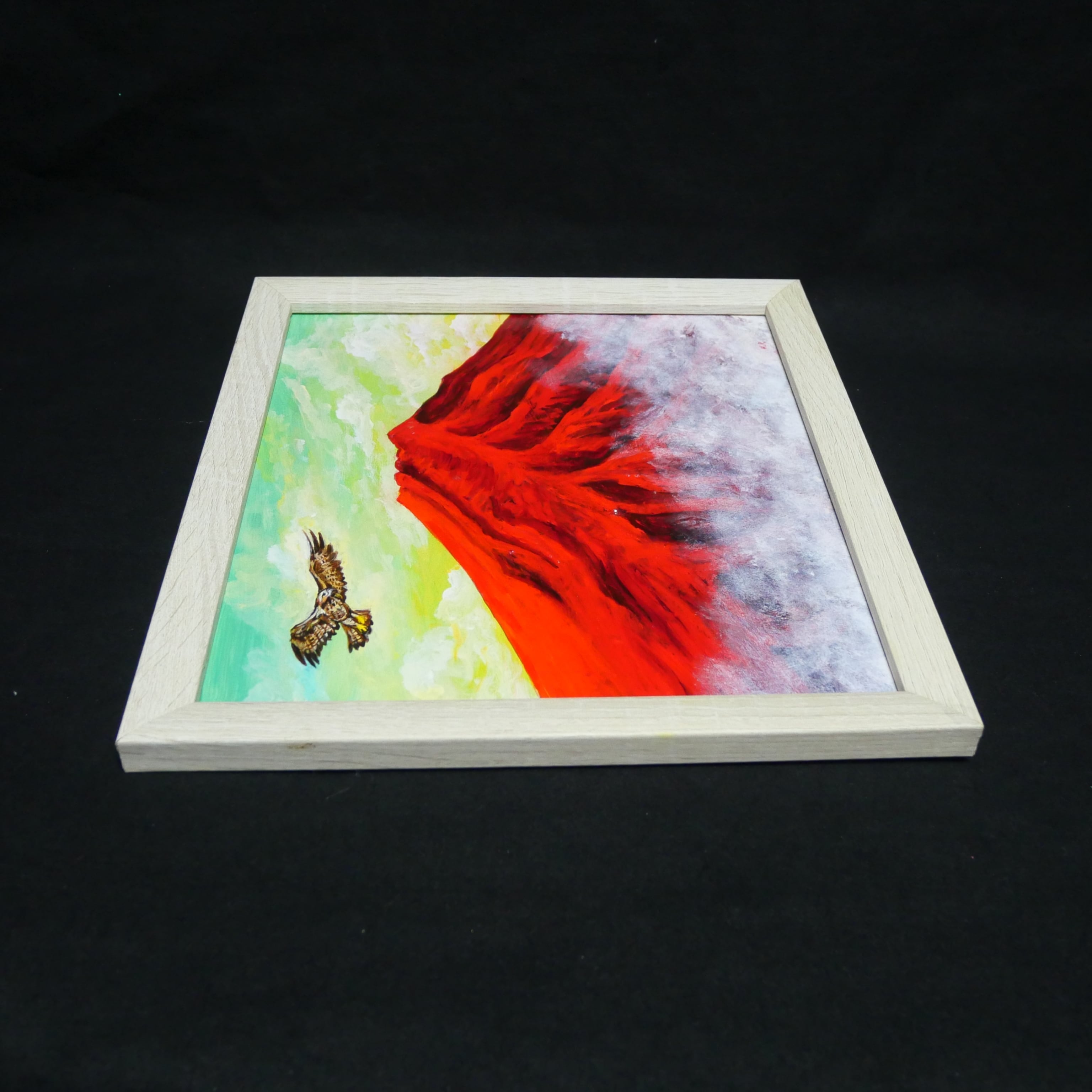 画面上部を自由に飛翔する鷹の姿は、未来への希望と力強さを感じさせるモチーフです。空の黄色やターコイズブルーとのコントラストが幻想的で、自然の美しさと生命の躍動を見事に表現しています。「富士山と鷹」は、見る人の心に安らぎと活力を与え、特別な空間を創り出す一品と言えるでしょう。