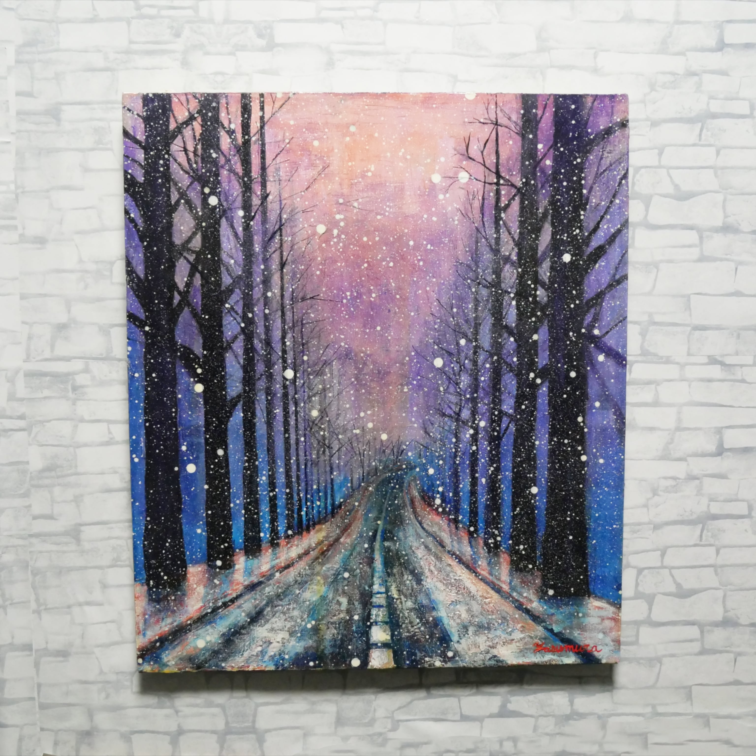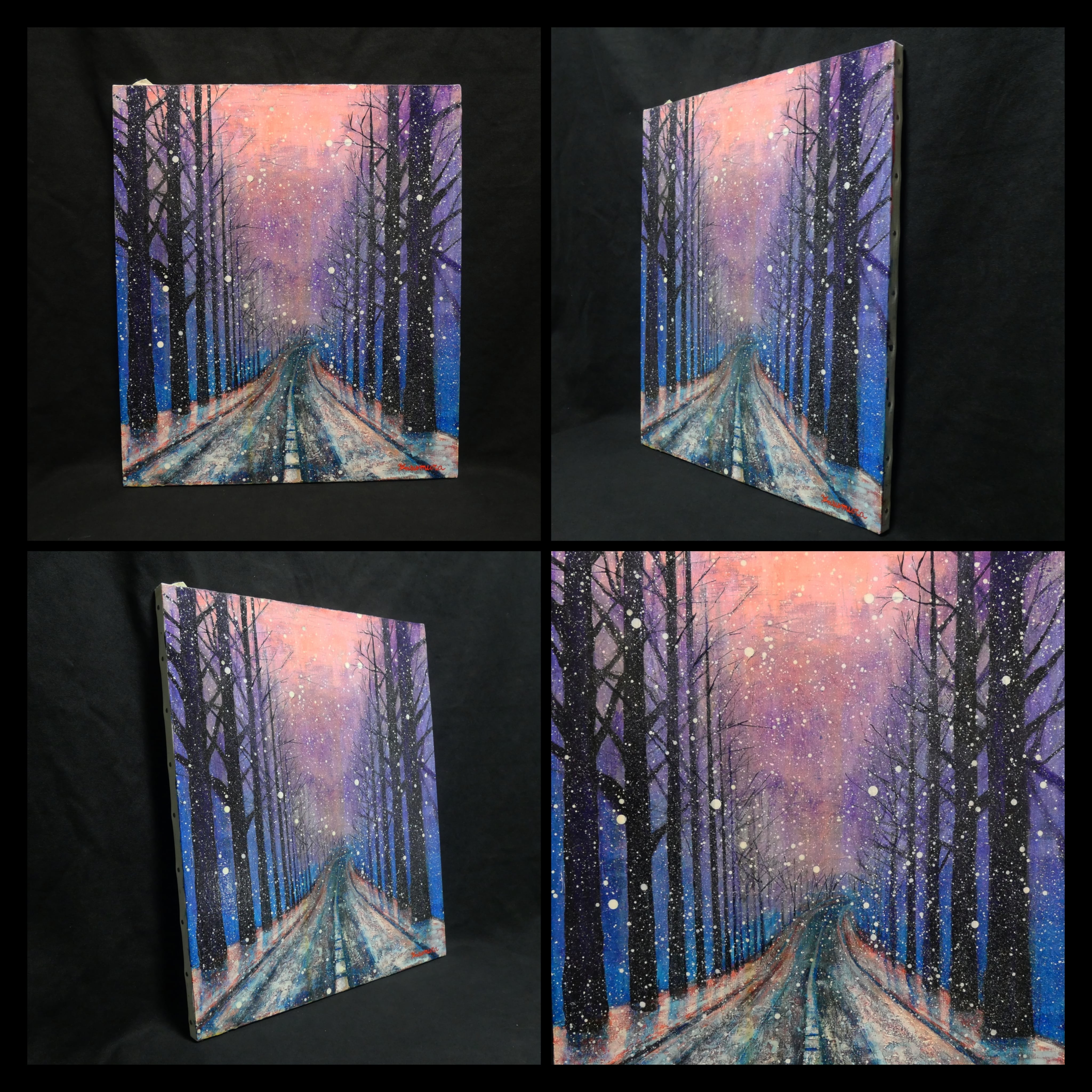 「雪降る幻想」は、深い青からピンク、紫へのグラデーションが織りなす冬の夜の静寂を見事に捉えた油絵です。縦530mm、横455mmのサイズは、空間に神秘的な雰囲気をもたらし、観る人を魅了します。雪明かりが輝く中、冬の森林と雪に覆われた道路が描かれ、まるでその場にいるかのような感覚を抱かせます。