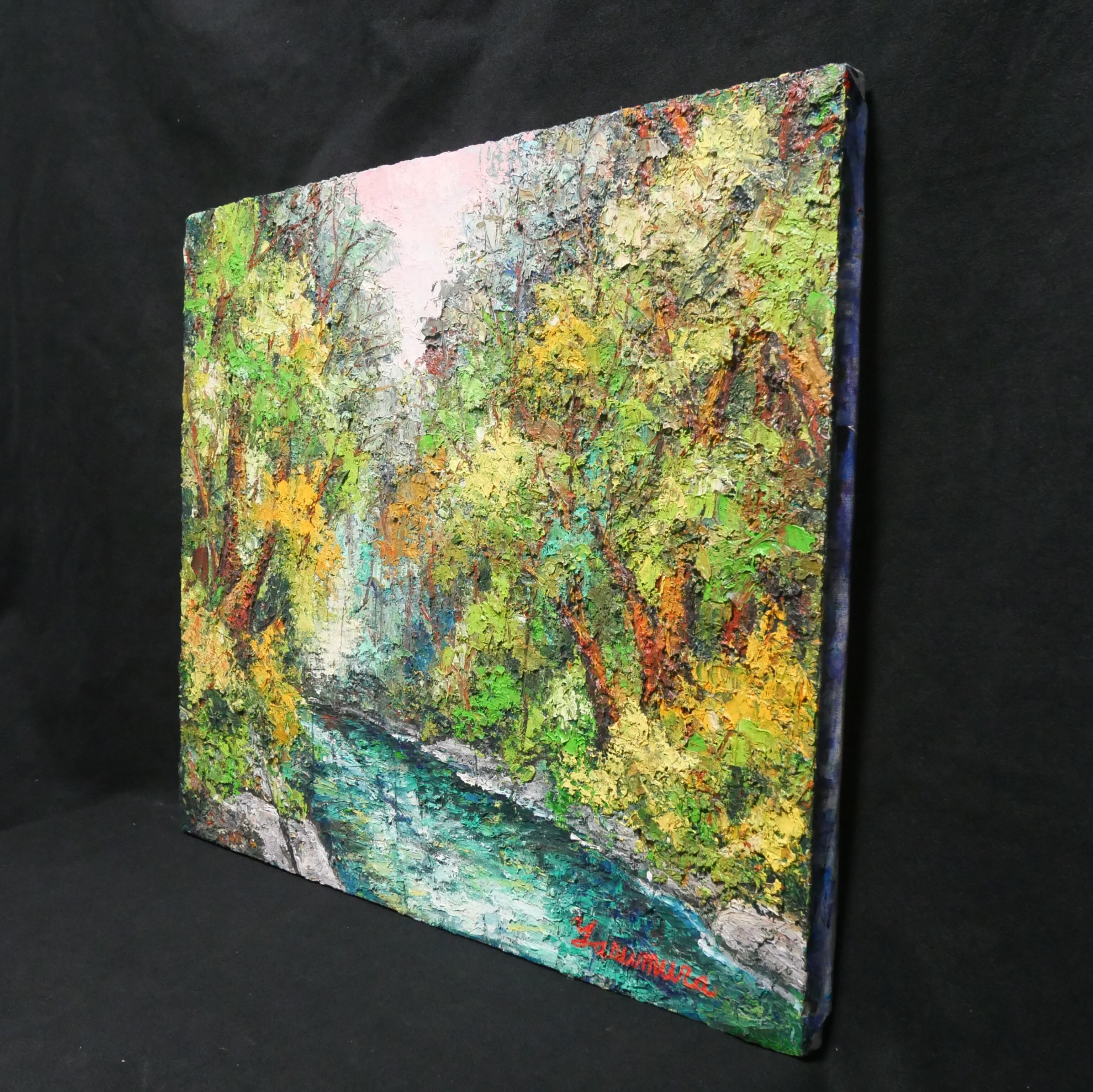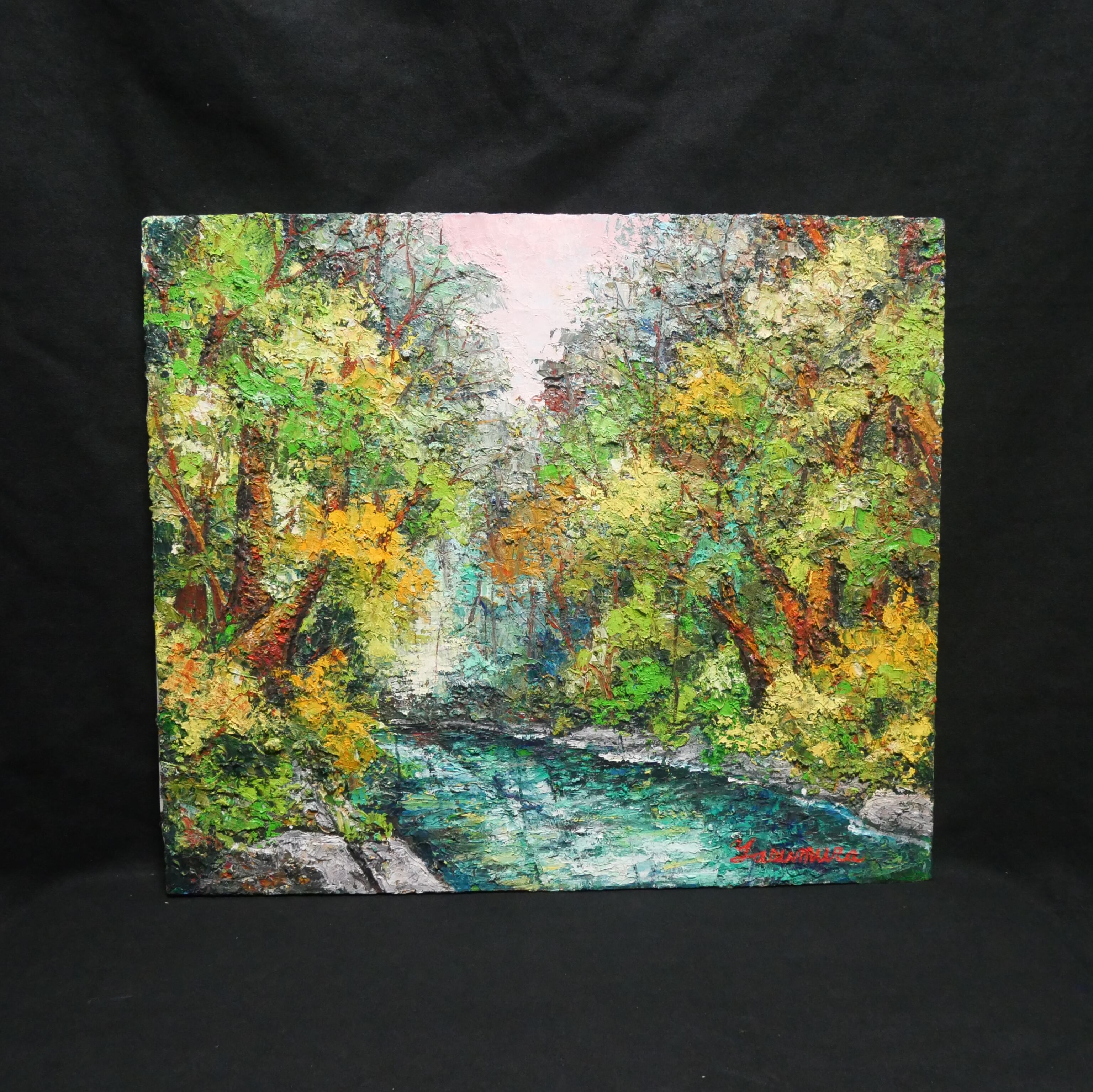「新緑の渓流」は、自然のエネルギーを余すところなく表現した特別な油絵です。縦455mm、横530mmのサイズは、広がる緑の風景を背景に心を和ませ、観る人を自然の中へといざないます。鮮やかな新緑と水色の川の美しいコントラストが際立ち、まるで実際に渓流のほとりにいるかのような臨場感をもたらします。