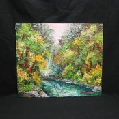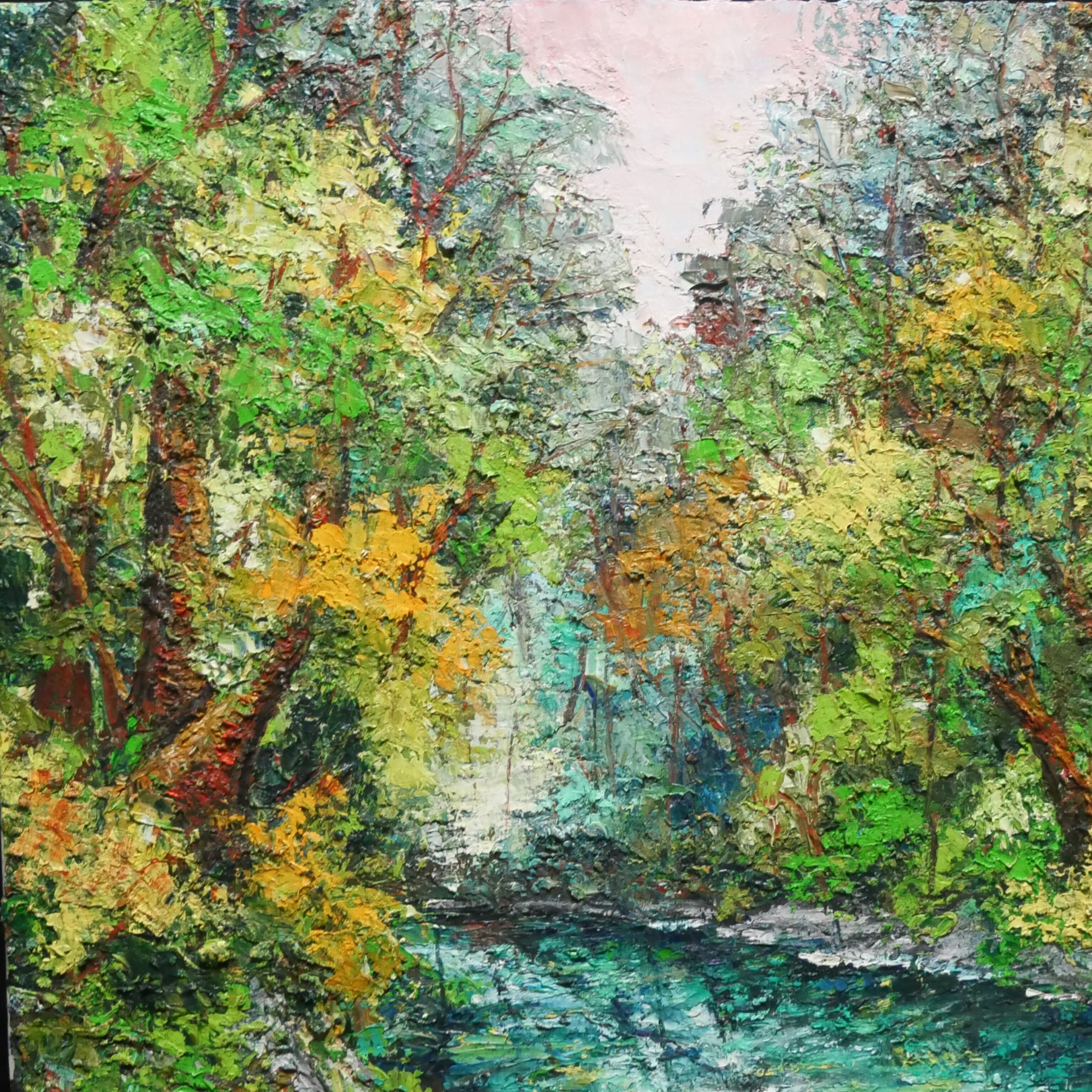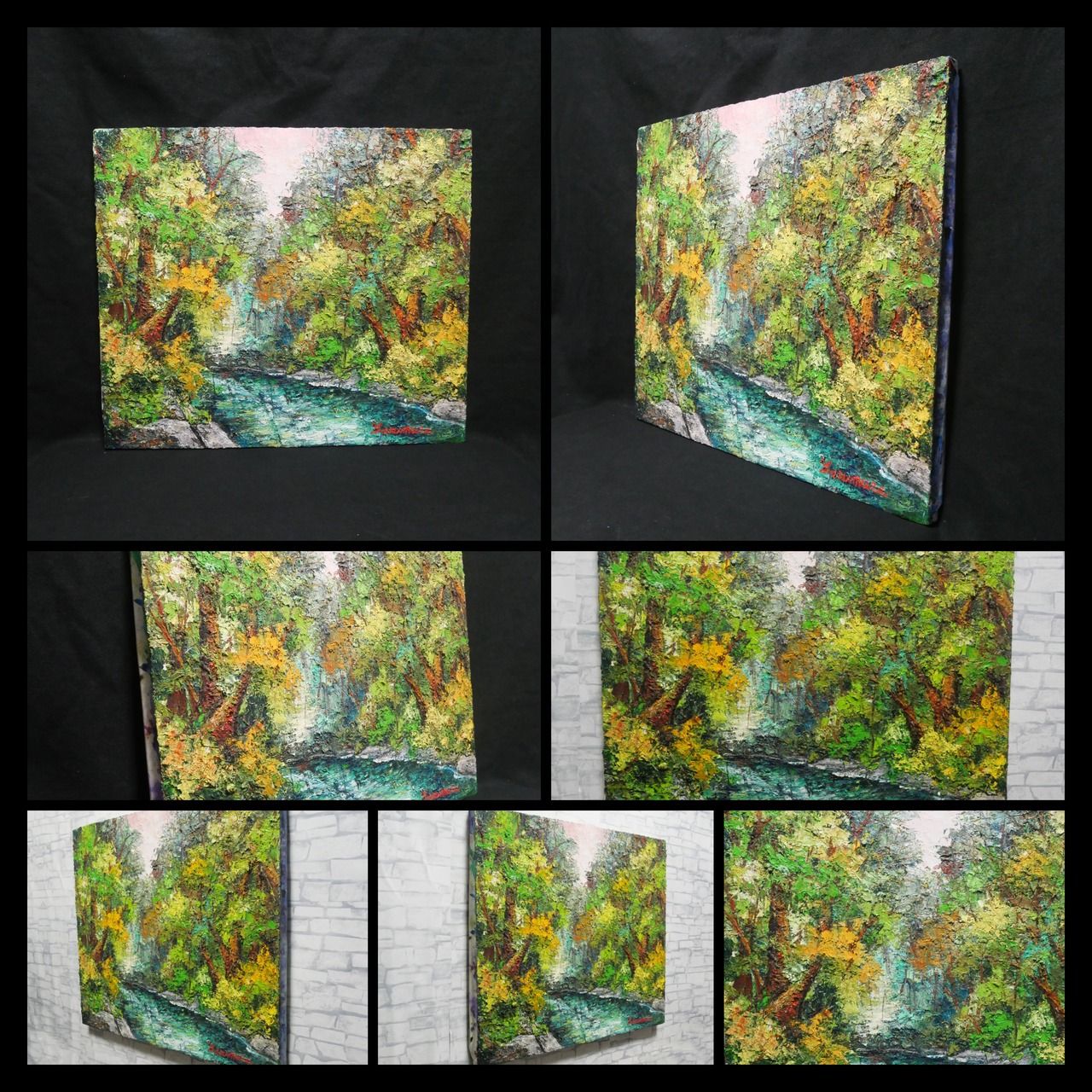 本作品では、ホルベインの油絵具を使用し、色彩の変化や質感の表現に注力しています。木々の葉に混じる黄緑色、黄色、赤みを帯びた色合いが、季節の移ろいと光の差し込み方を巧みに引き立てており、深い森の奥行きを鮮やかに描写しています。立体感のある絵の具の塗り重ねが、木々の幹や水面のきらめきを表現し、見る人の心を豊かにします。