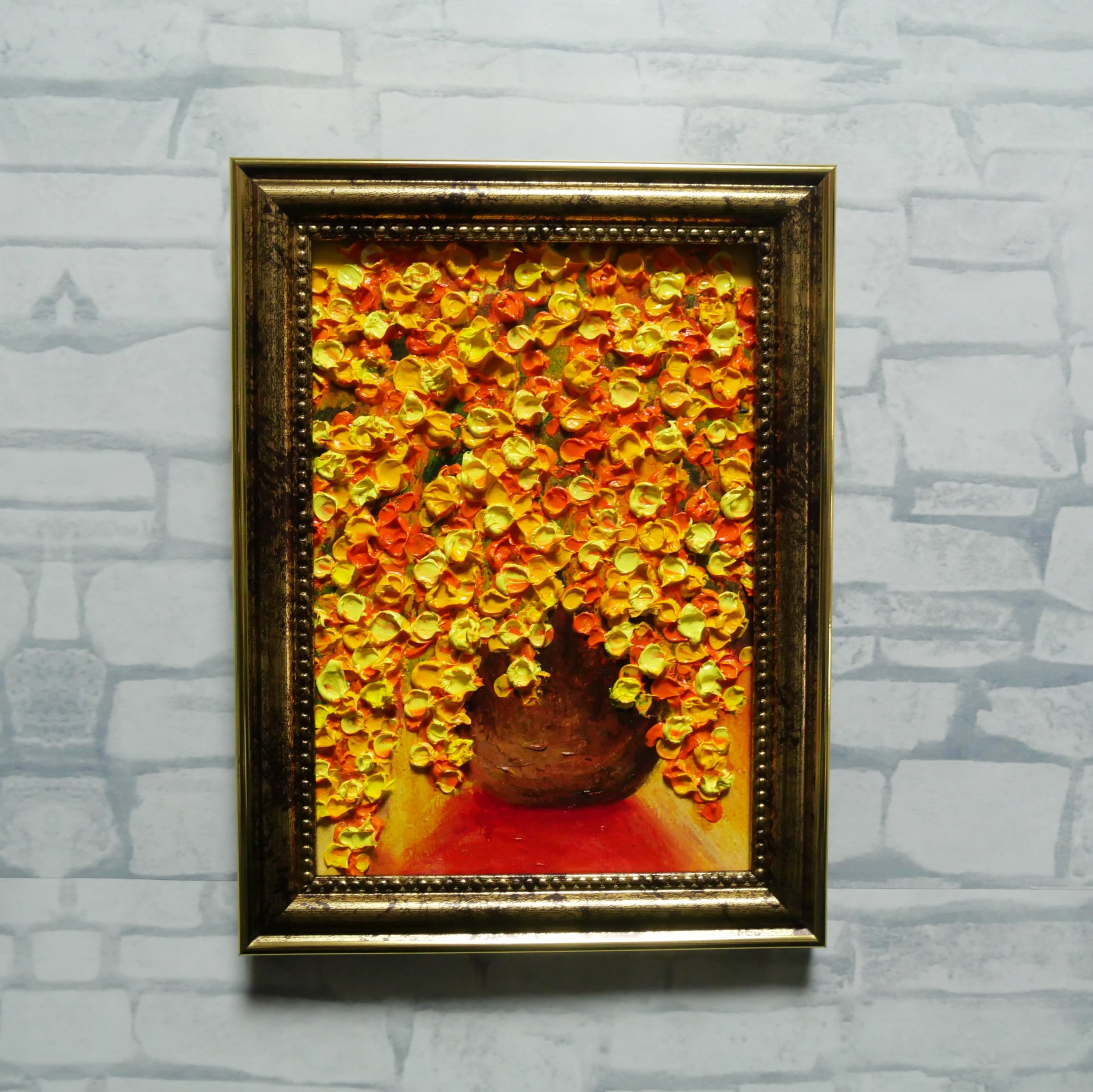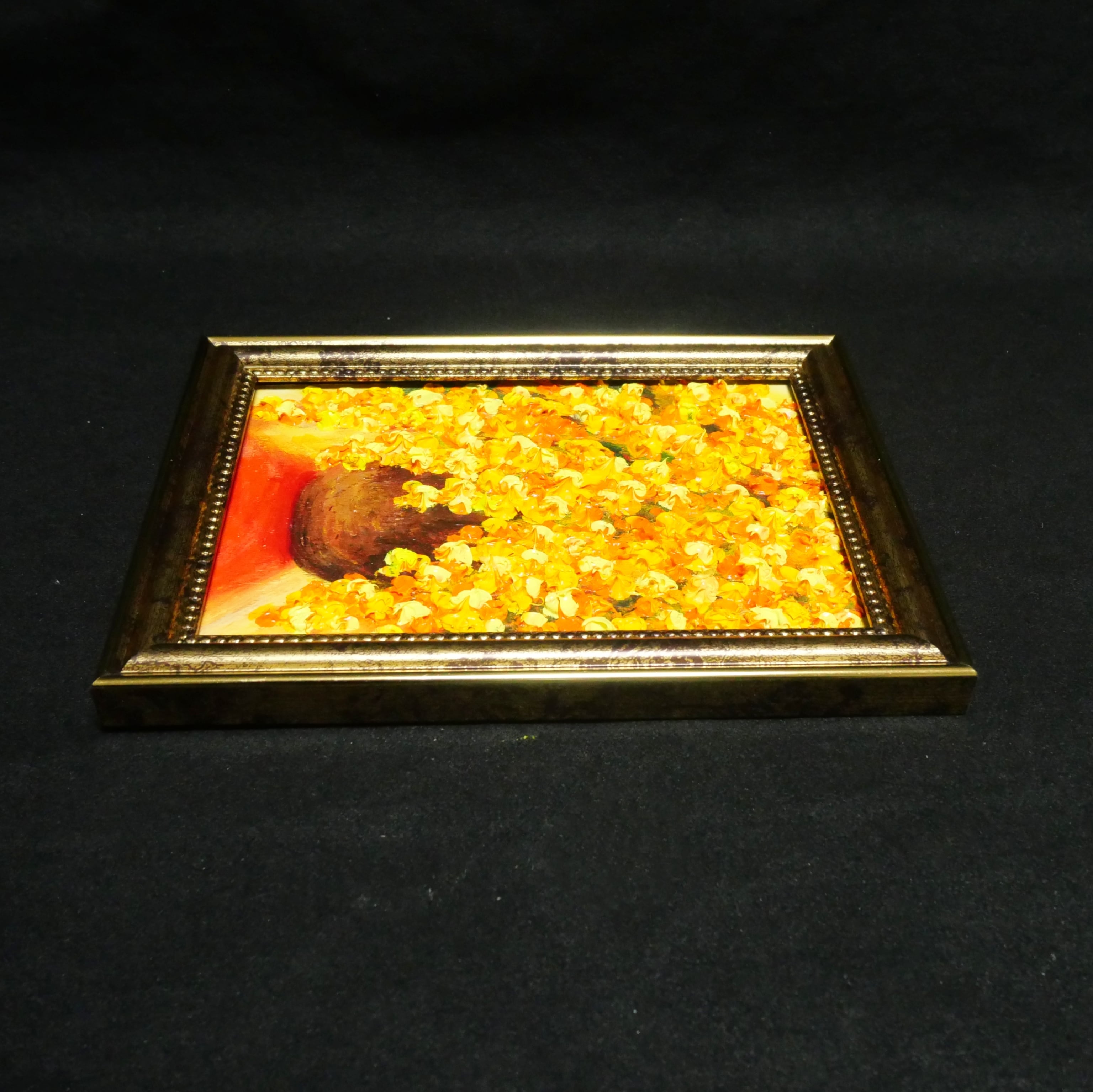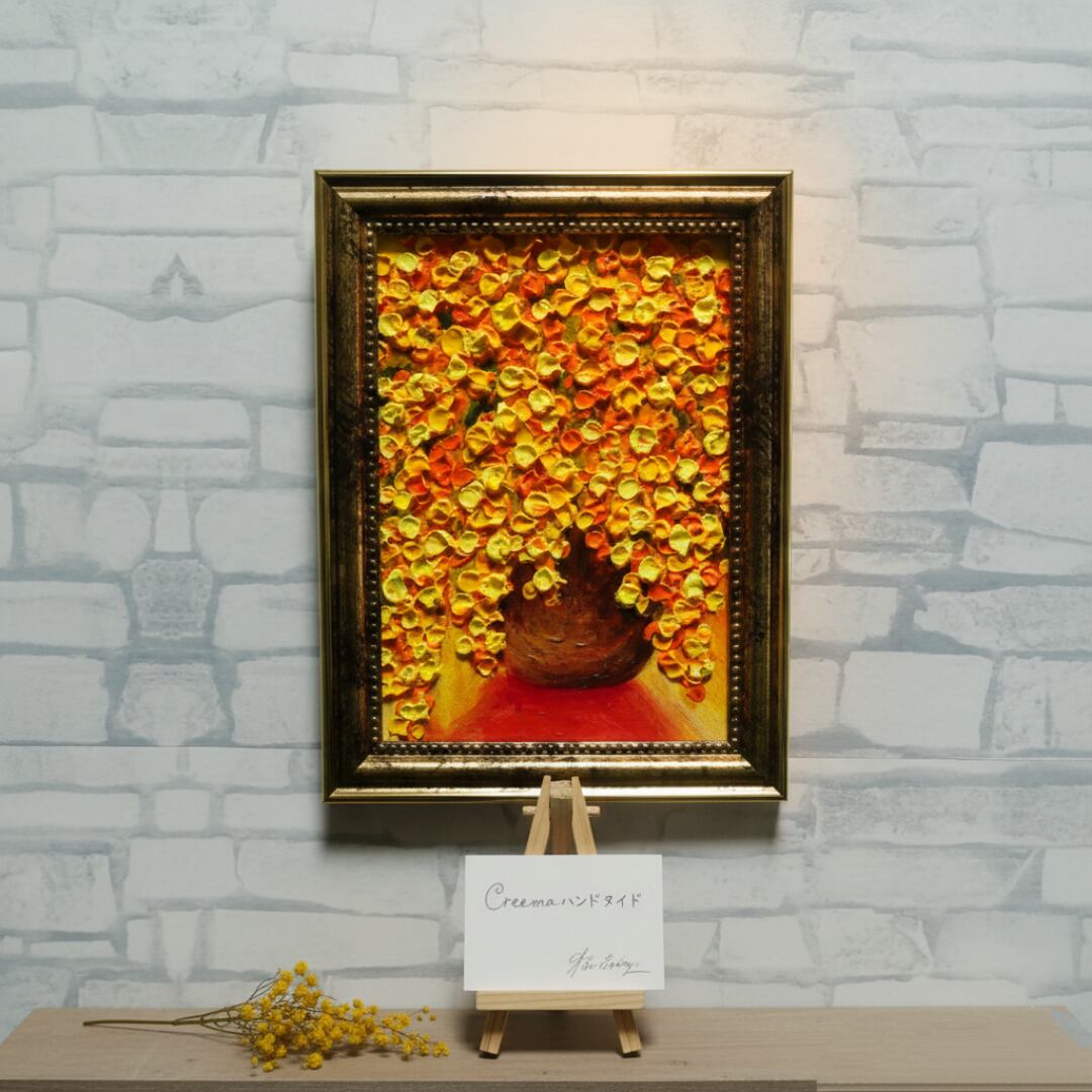 本作品では、ホルベインの油絵具を使用しており、暖色系の色彩構成が見る人を明るく照らします。特に、アンティークゴールドの額縁がその魅力を一層引き立て、飾る空間を華やかな雰囲気に仕上げます。また、スタンド付きと金具付きで、壁ならびにテーブルに置いても手軽に飾ることができ、さまざまなインテリアにマッチします。