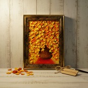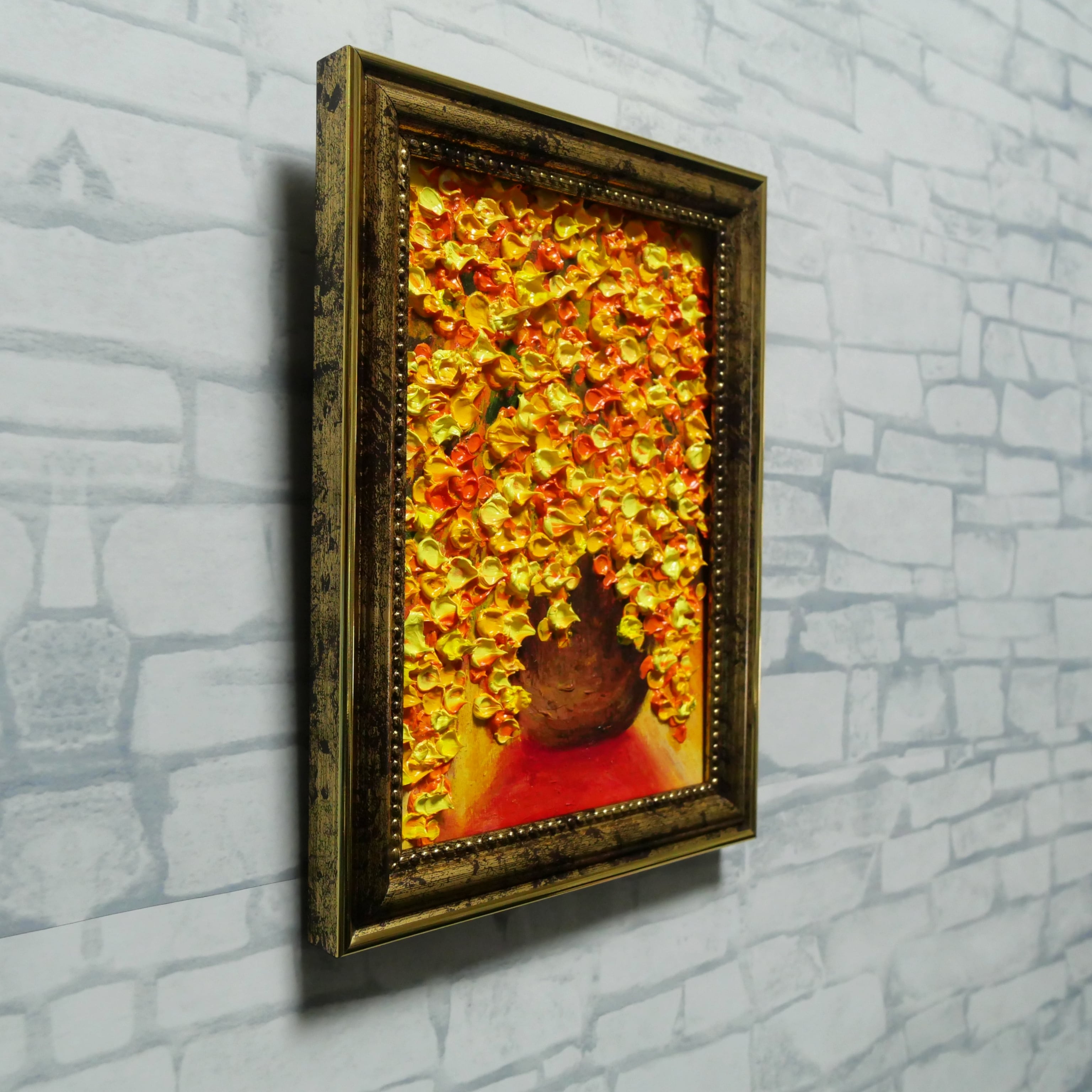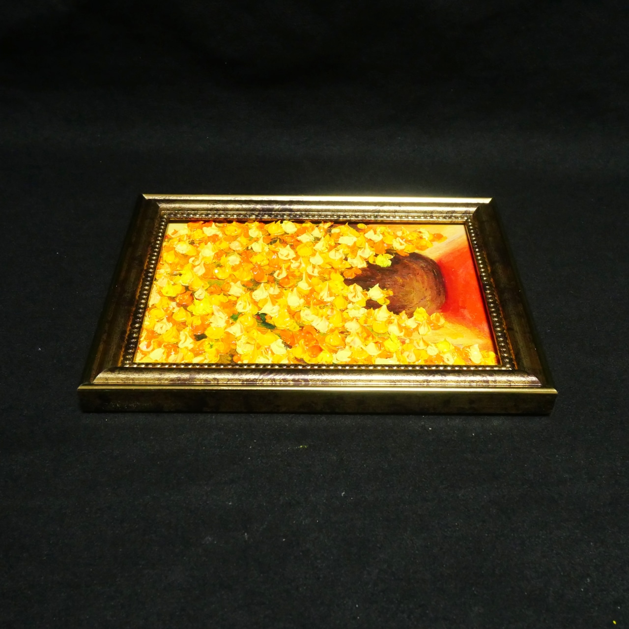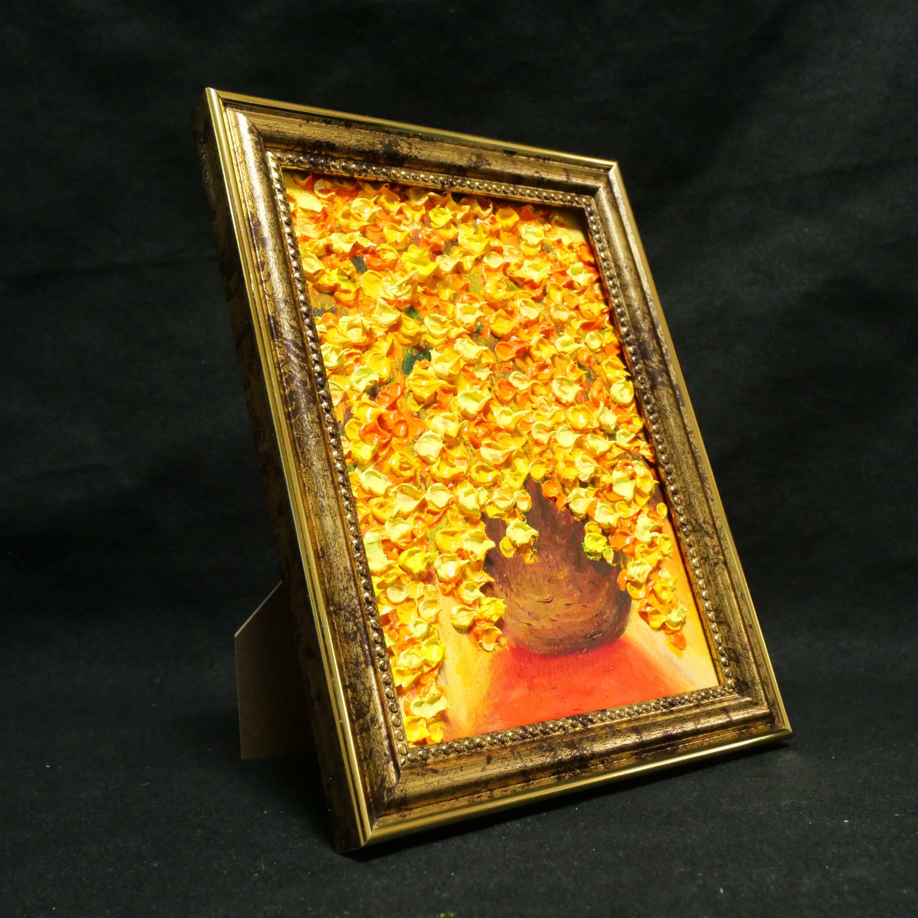 本作品では、ホルベインの油絵具を使用しており、暖色系の色彩構成が見る人を明るく照らします。特に、アンティークゴールドの額縁がその魅力を一層引き立て、飾る空間を華やかな雰囲気に仕上げます。また、スタンド付きと金具付きで、壁ならびにテーブルに置いても手軽に飾ることができ、さまざまなインテリアにマッチします。