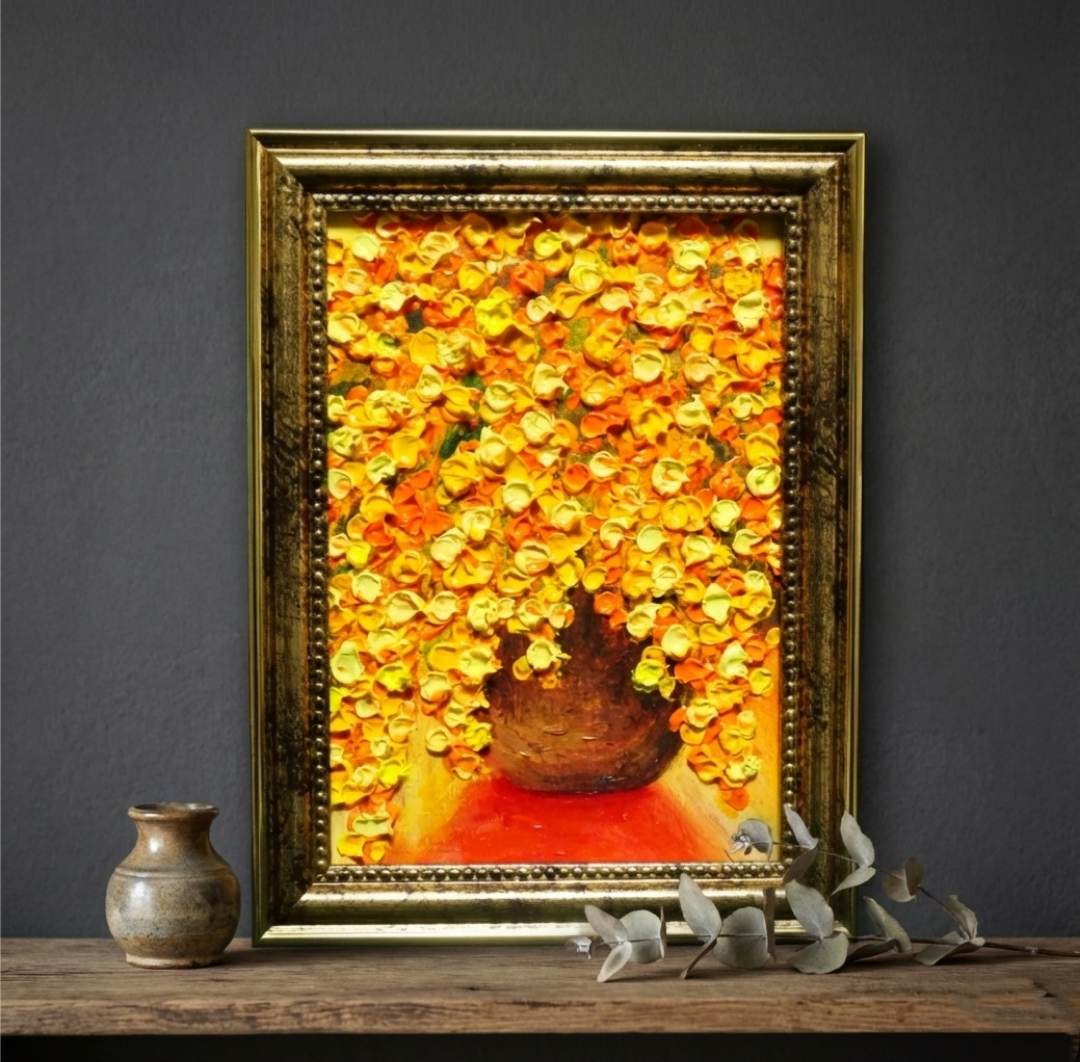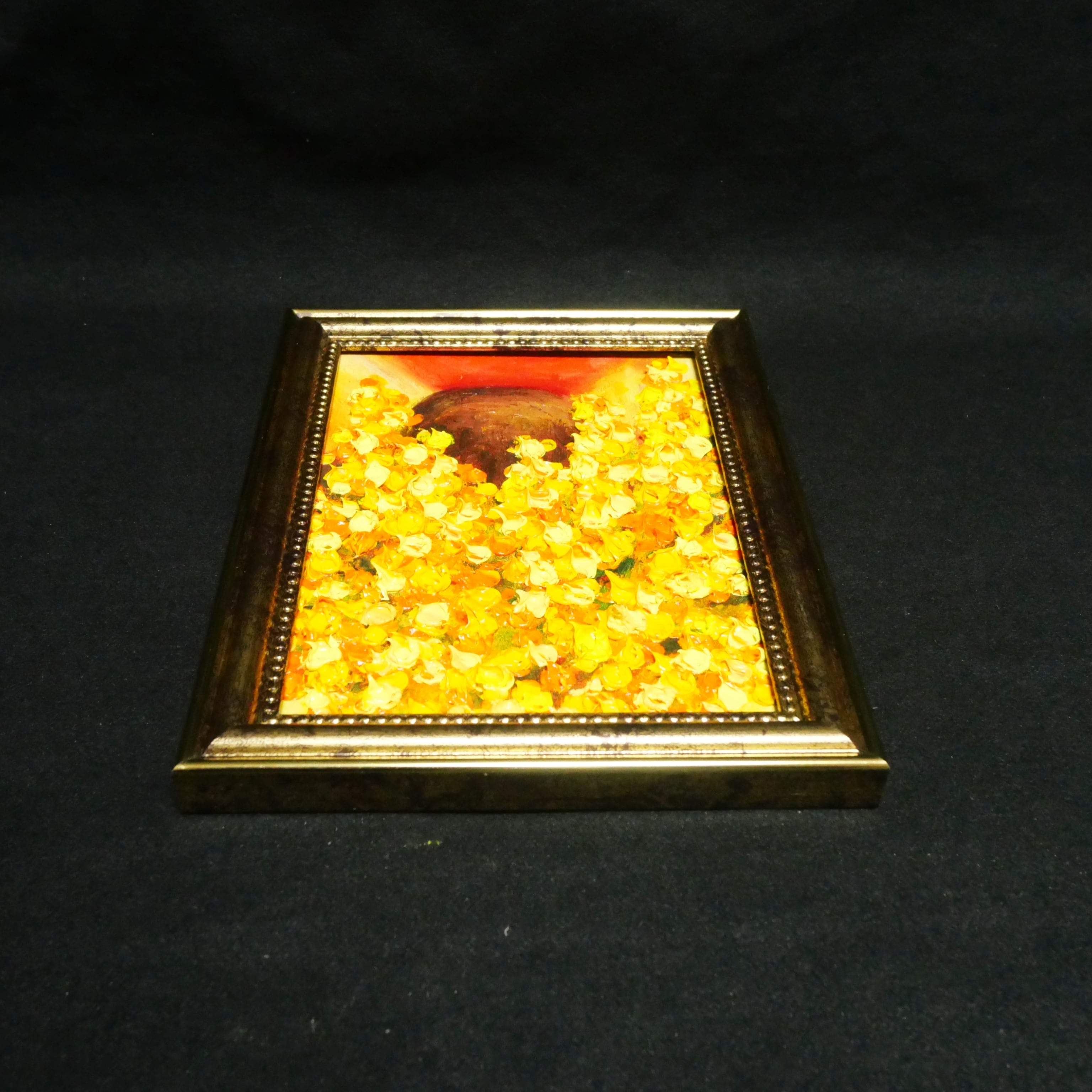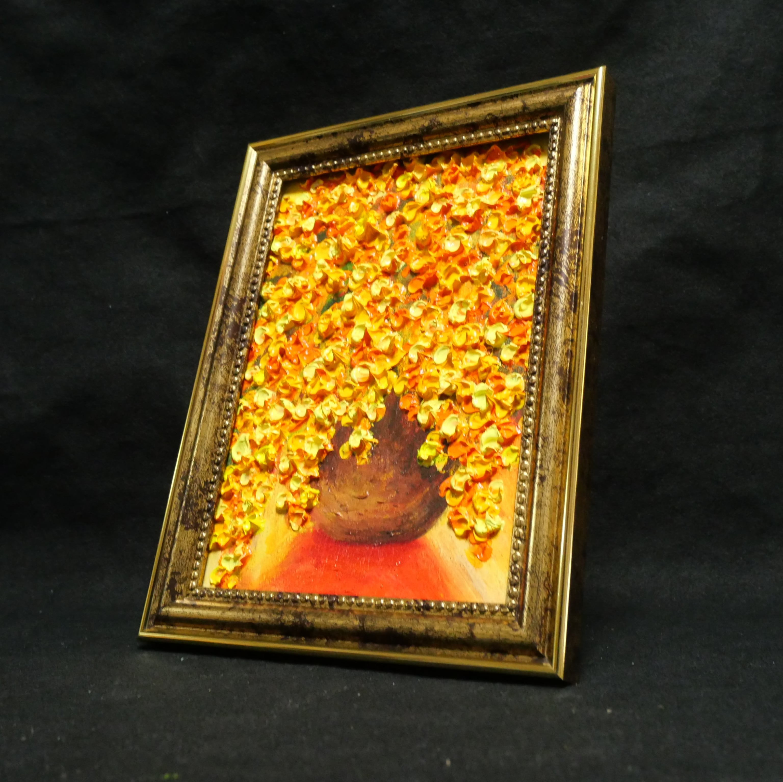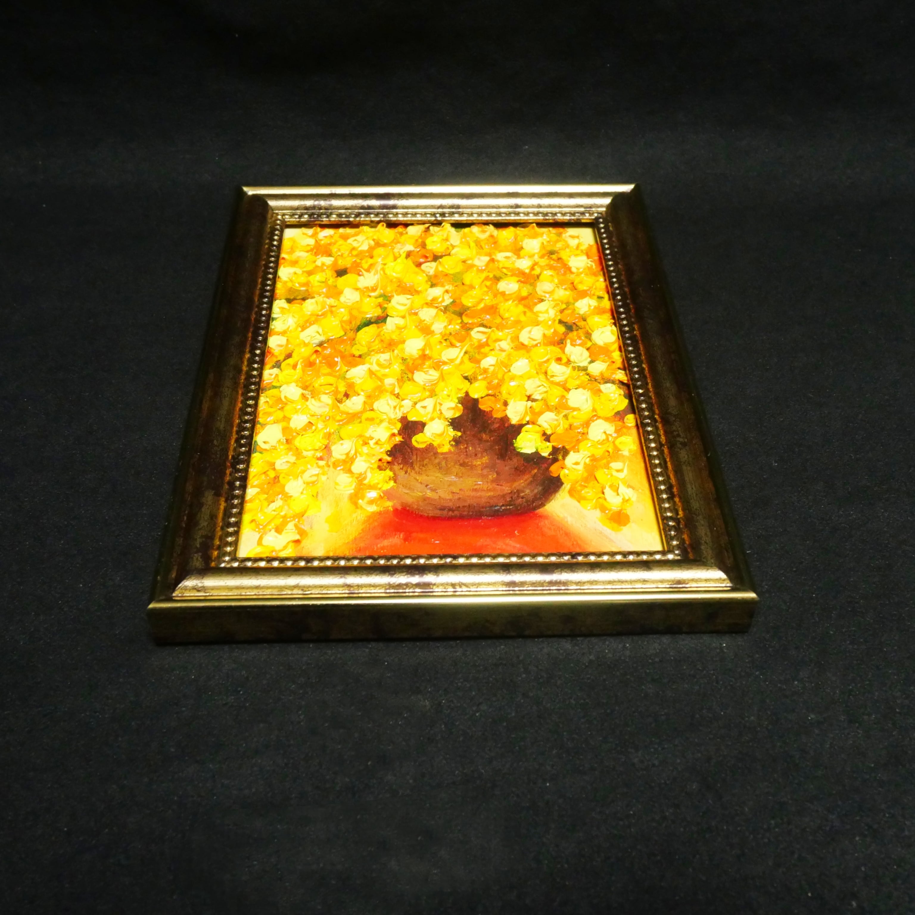 「ミモザ」は、春の訪れを感じさせる特別な油絵です。縦18.0cm、横13.0cmのサイズは、心温まるミモザの花々が描かれ、見る人に幸福感をもたらします。厚塗りの技法で表現された花びらの凹凸は、光が当たることで美しい陰影を生み出し、作品に立体感と生き生きとしたエネルギーを与えています。