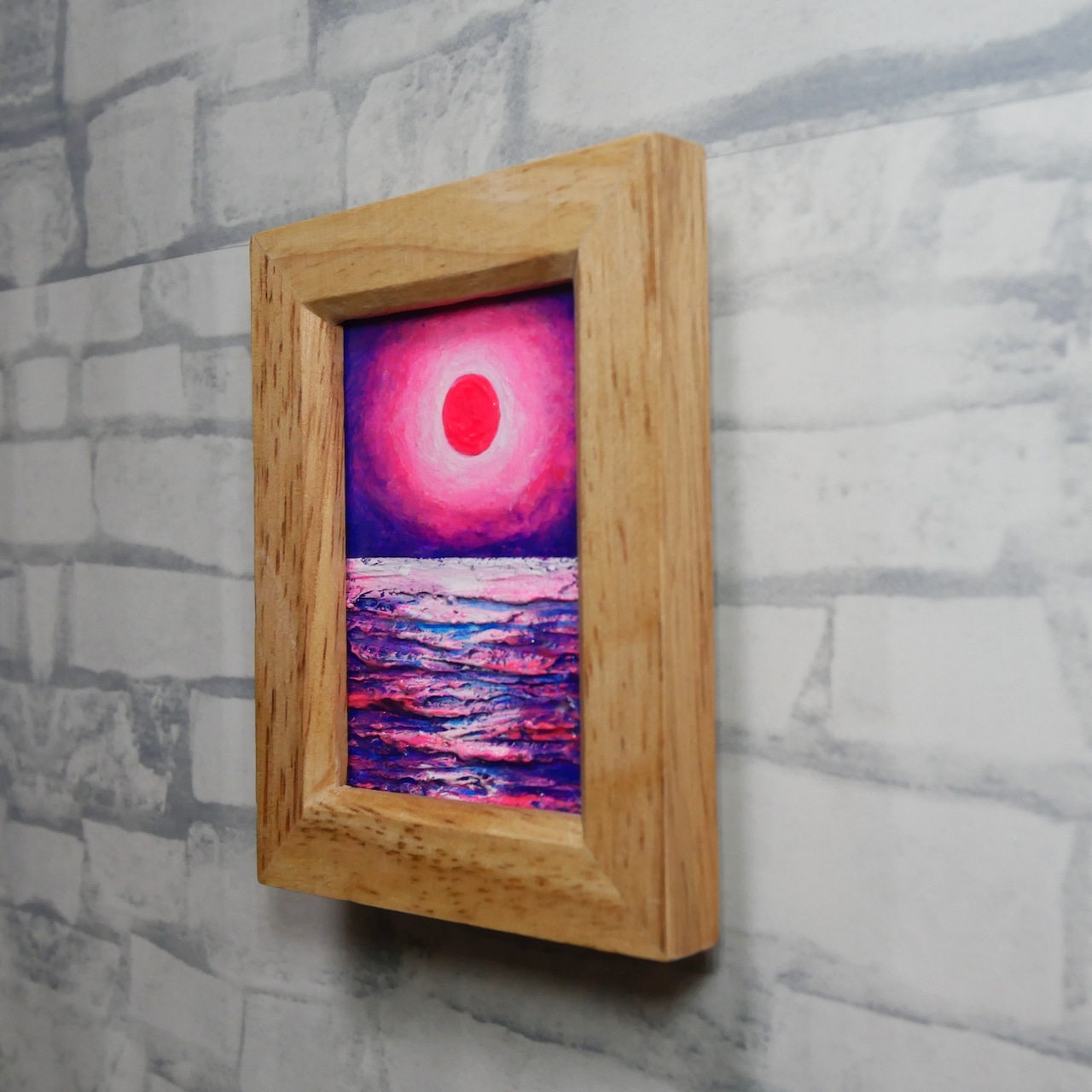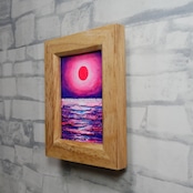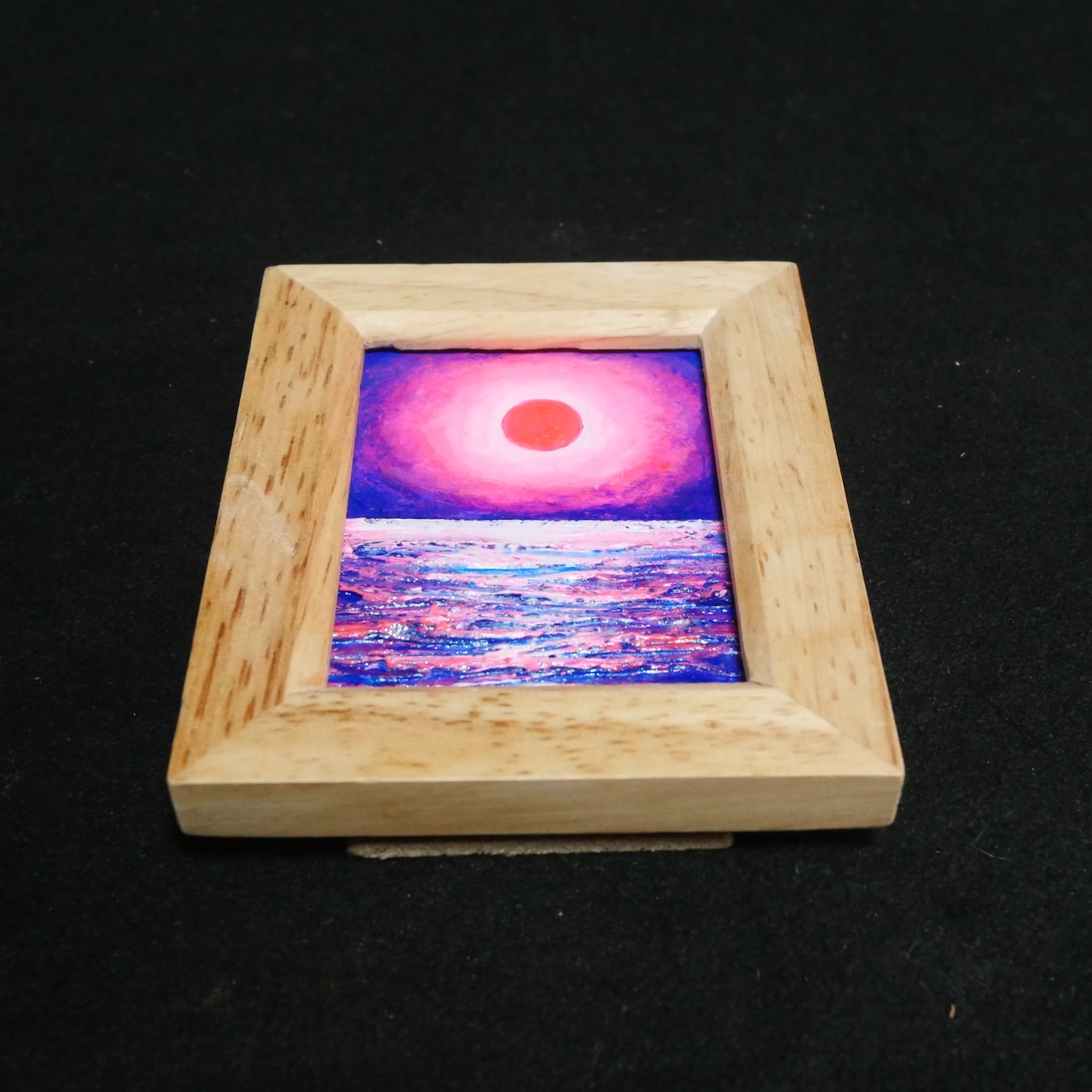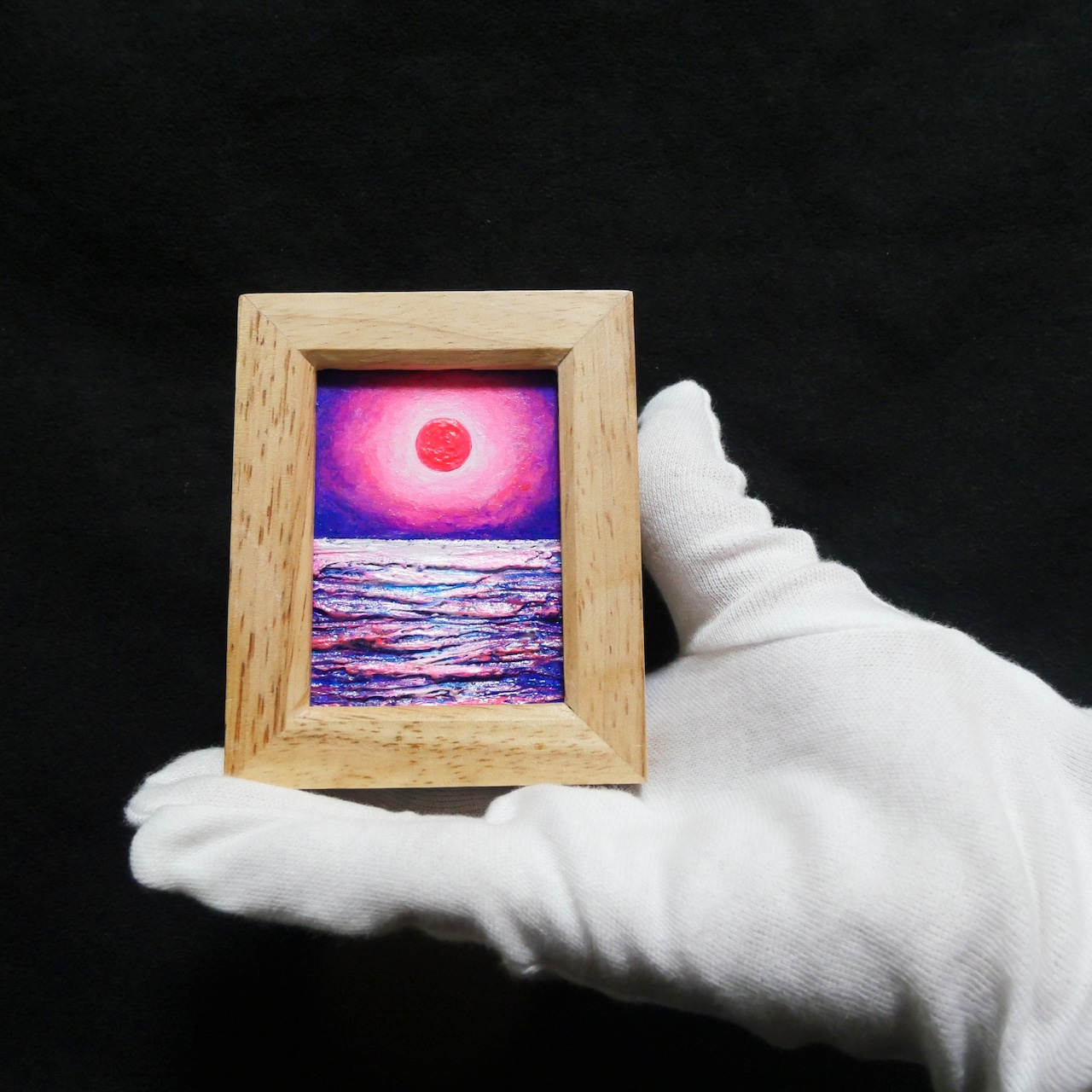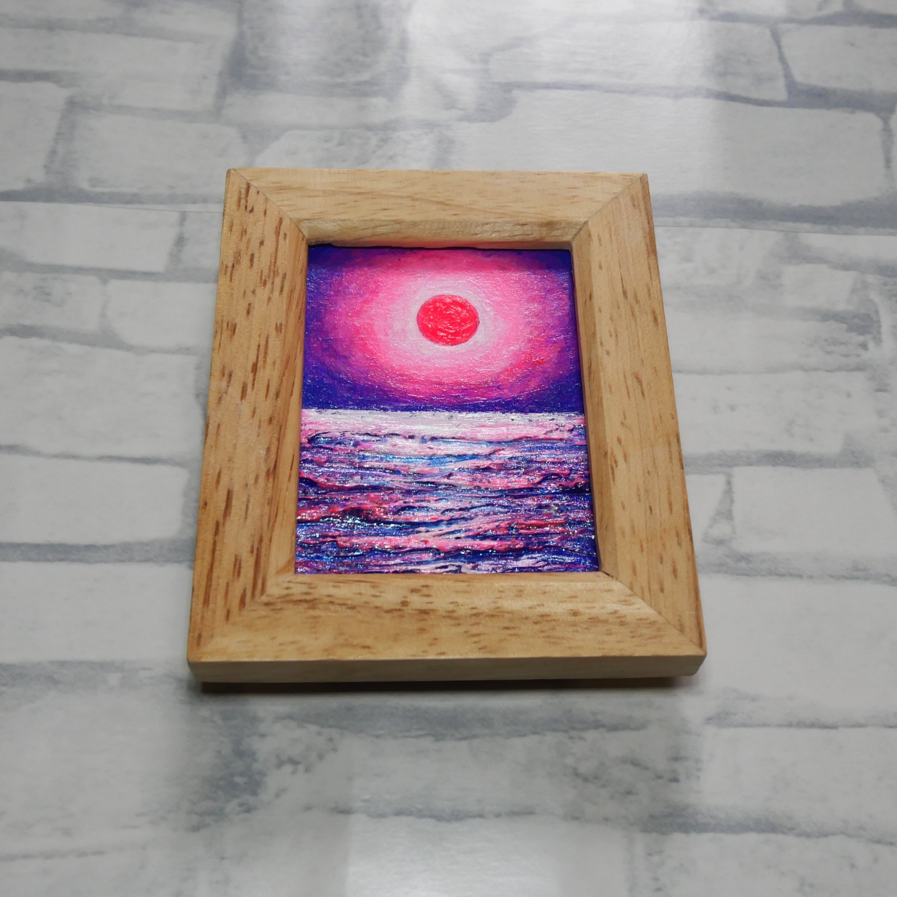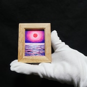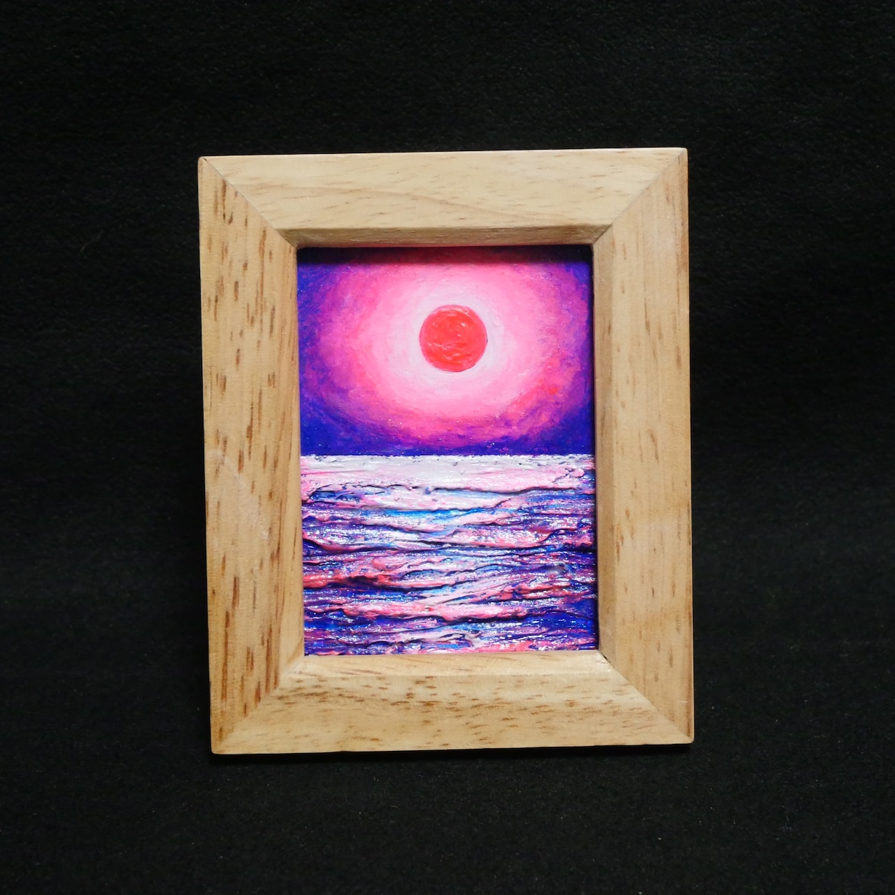 「ストロベリームーン」は、幻想的な海の情景を描いた特別なミニ絵画です。縦9.8cm、横8cm、厚さ1cmのサイズは、空と海を彩る鮮やかなピンク色と青色のコントラストが目を引き、多くの人を魅了します。特に、真紅の月(または夕日)が空に浮かぶその様子は、その存在感が強烈で、見る人をこの作品の世界へと引き込んでいきます。