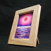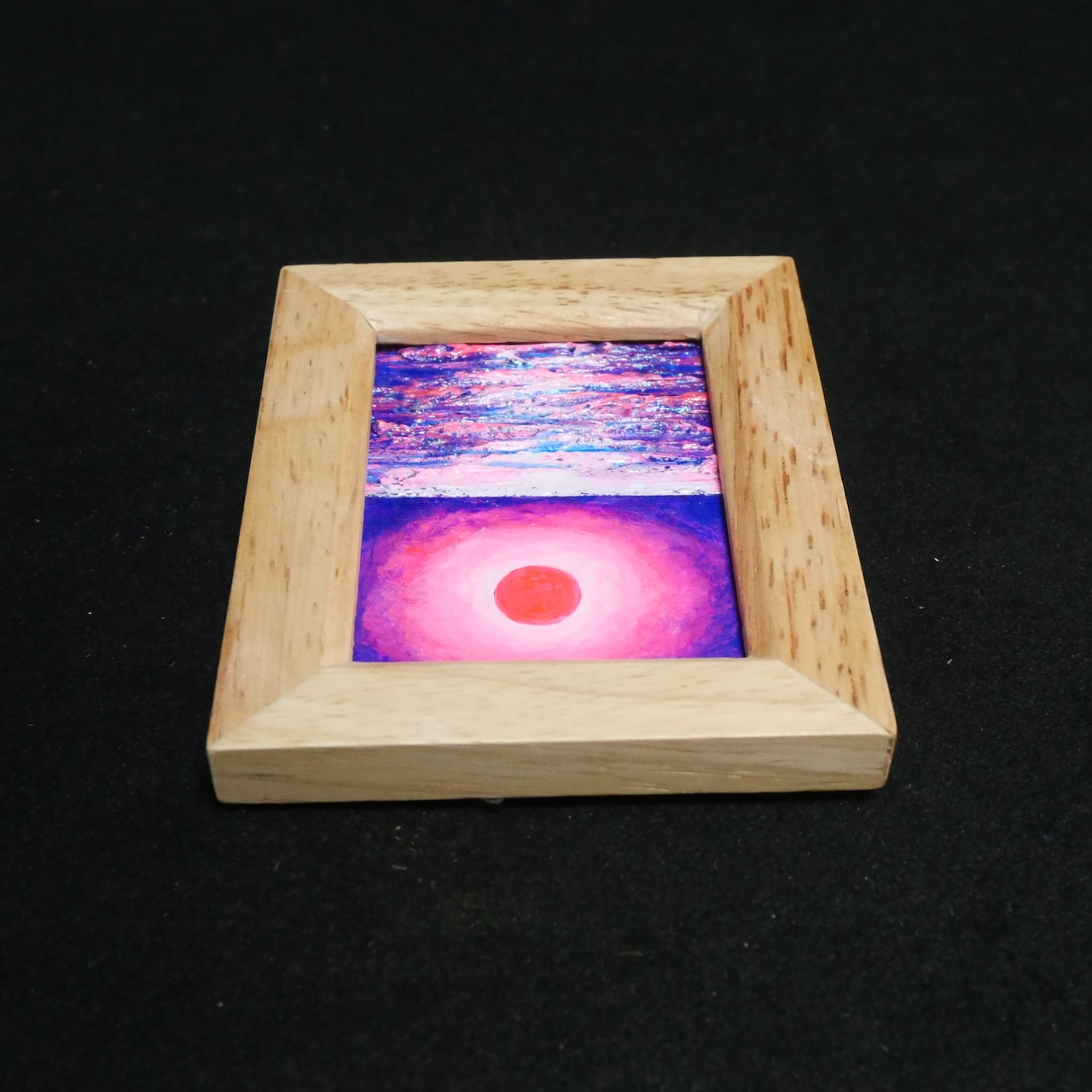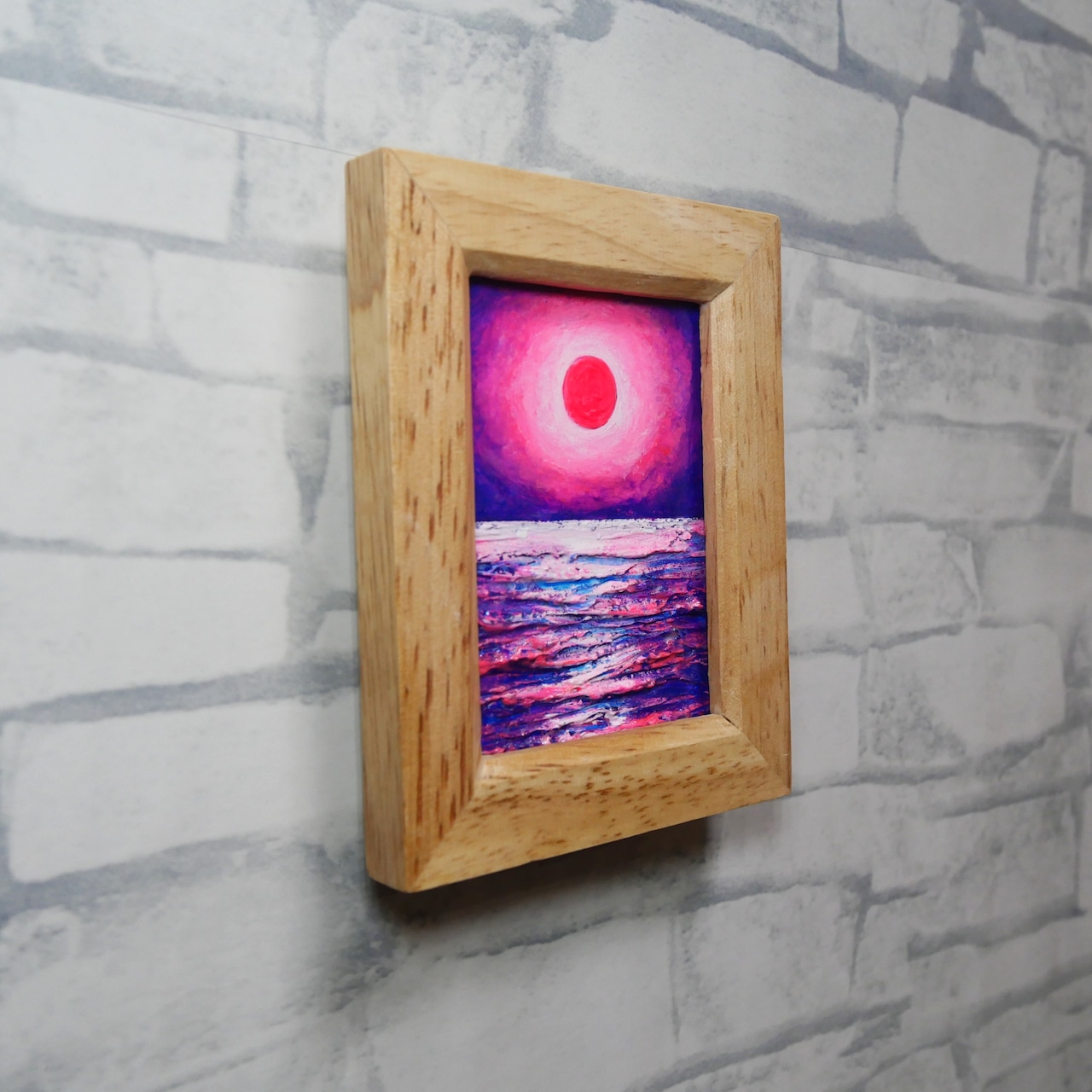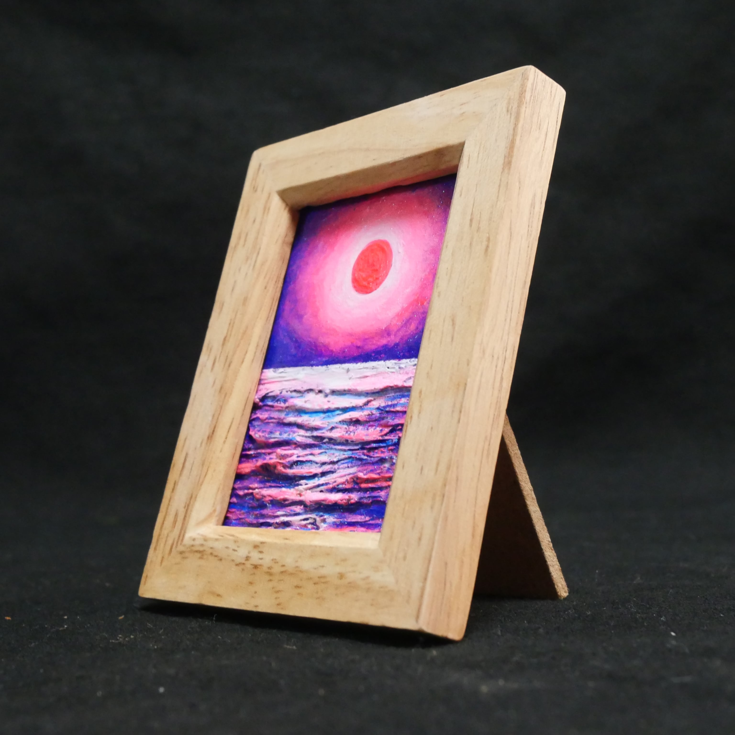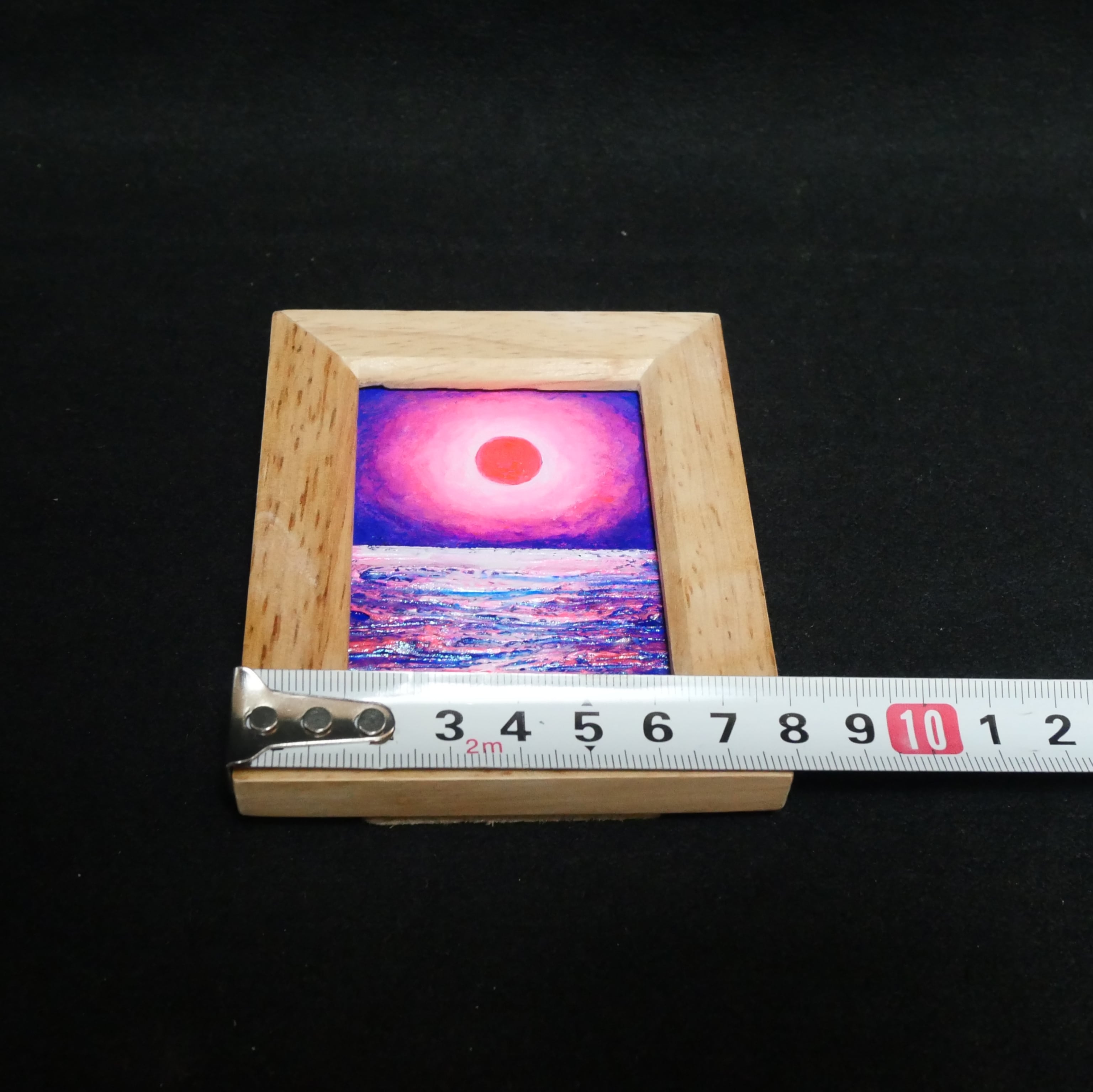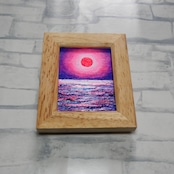 「ストロベリームーン」は、幻想的な海の情景を描いた特別なミニ絵画です。縦9.8cm、横8cm、厚さ1cmのサイズは、空と海を彩る鮮やかなピンク色と青色のコントラストが目を引き、多くの人を魅了します。特に、真紅の月(または夕日)が空に浮かぶその様子は、その存在感が強烈で、見る人をこの作品の世界へと引き込んでいきます。