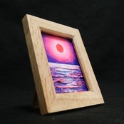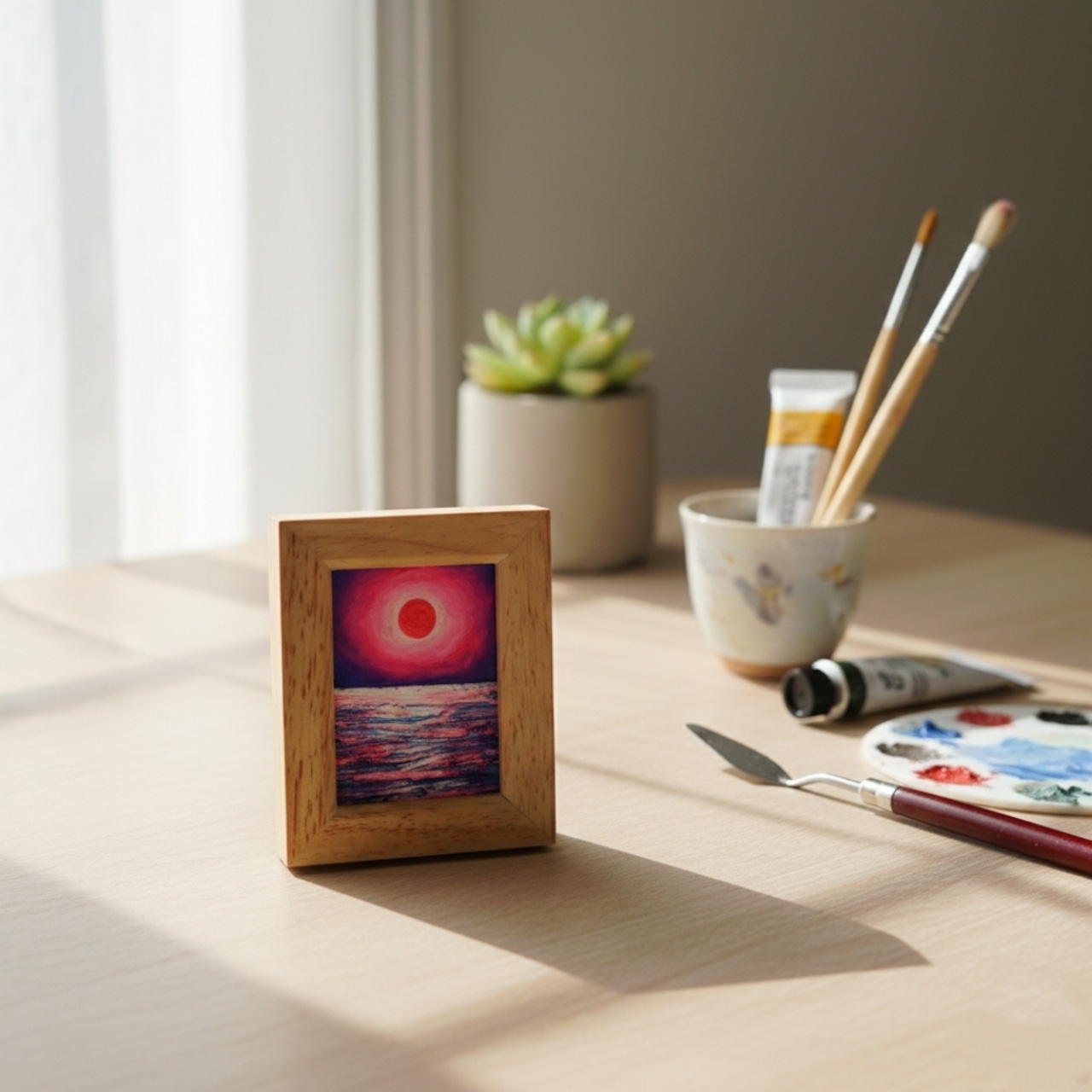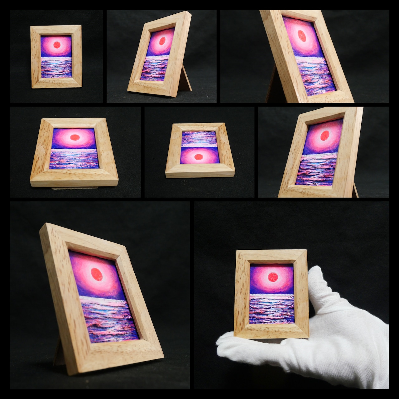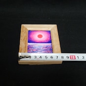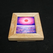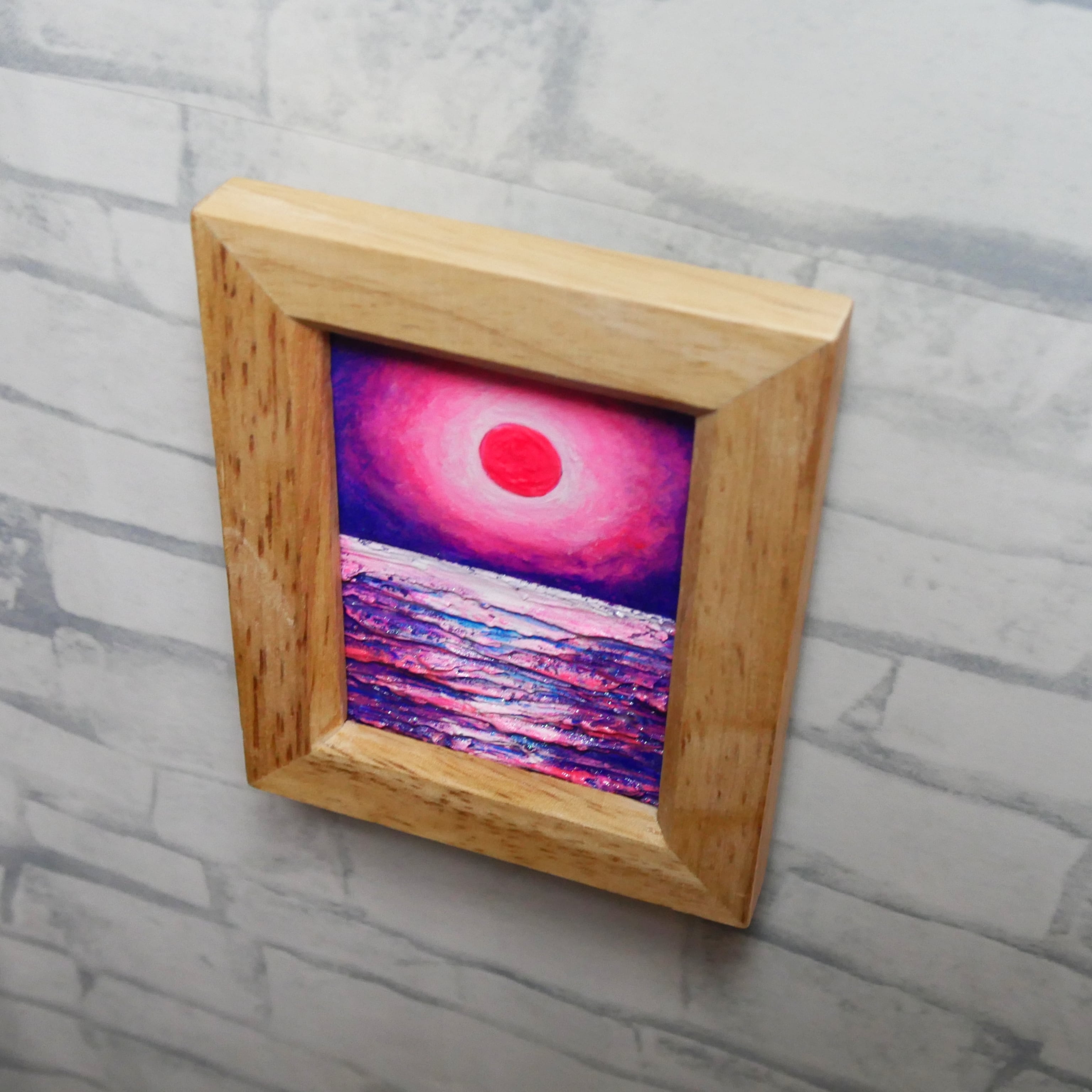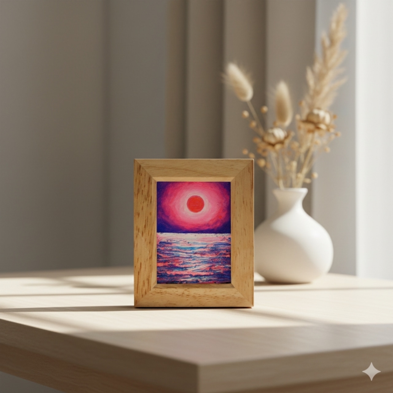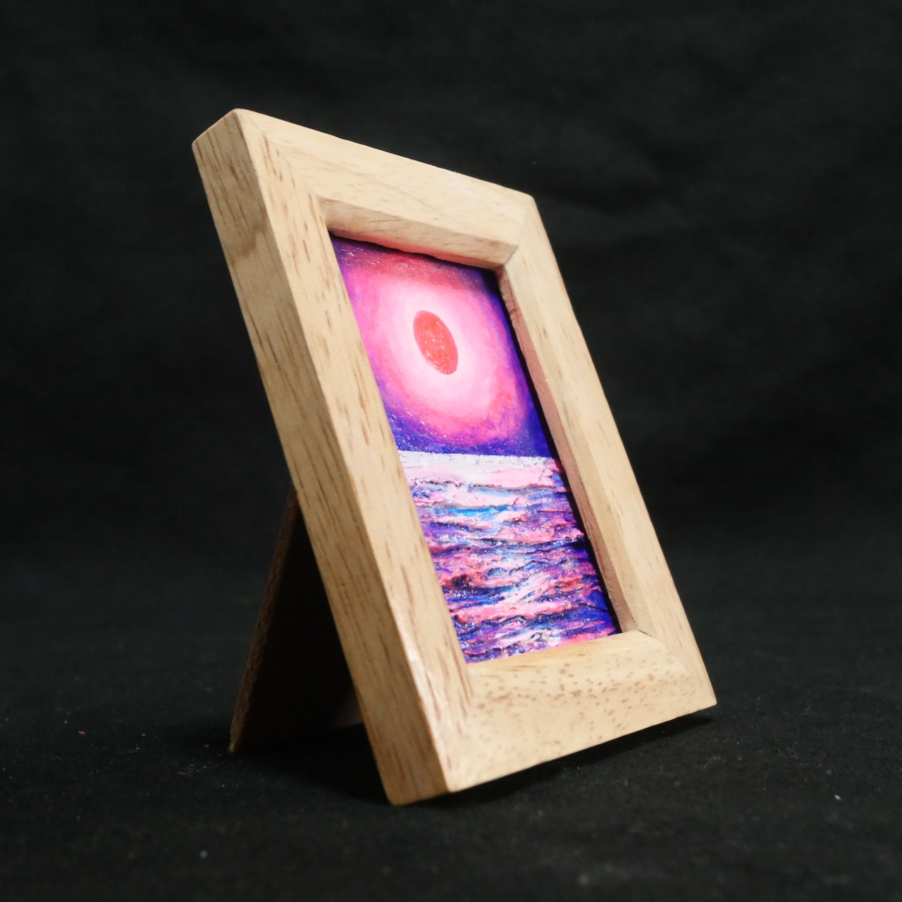 「ストロベリームーン」は、幻想的な海の情景を描いた特別なミニ絵画です。縦9.8cm、横8cm、厚さ1cmのサイズは、空と海を彩る鮮やかなピンク色と青色のコントラストが目を引き、多くの人を魅了します。特に、真紅の月(または夕日)が空に浮かぶその様子は、その存在感が強烈で、見る人をこの作品の世界へと引き込んでいきます。