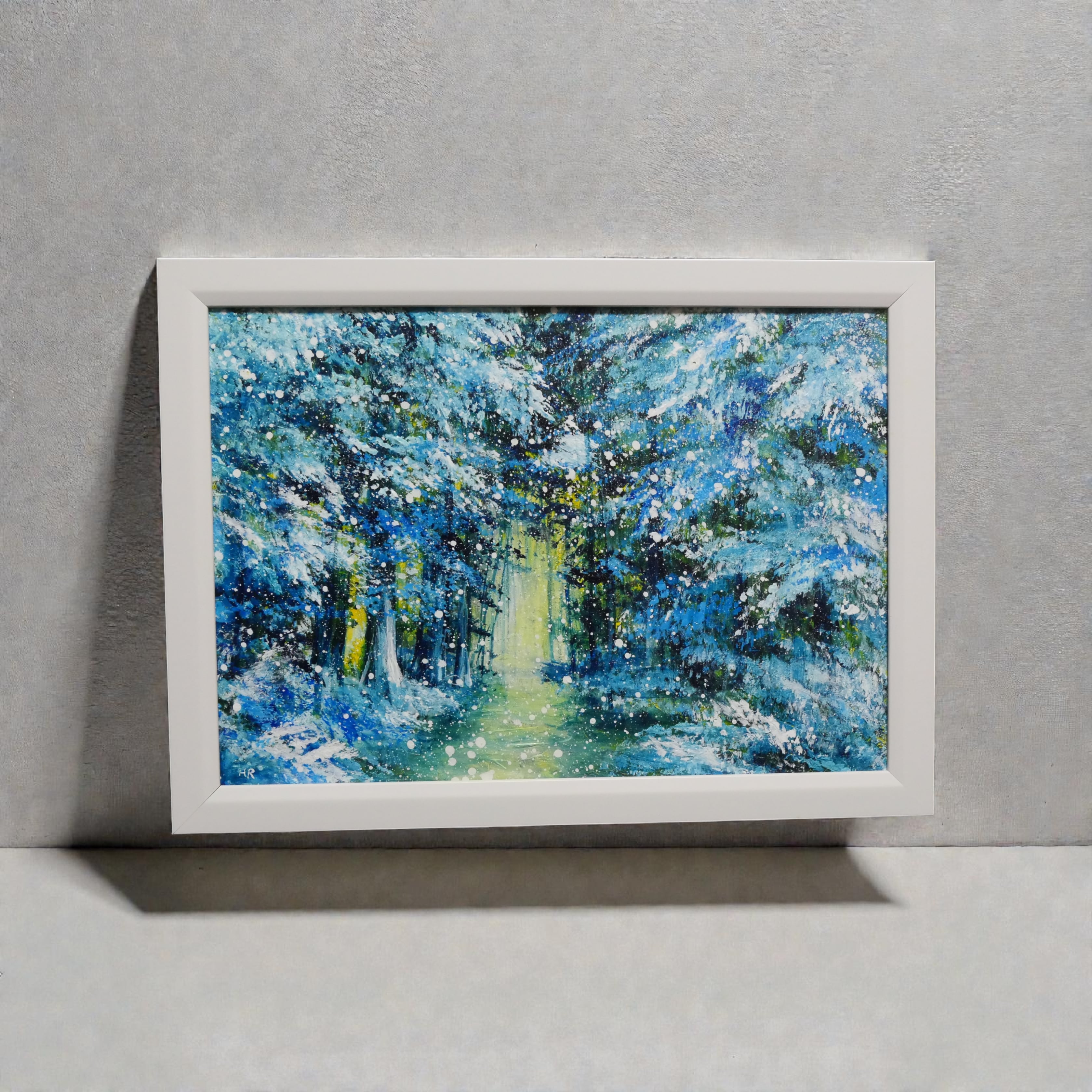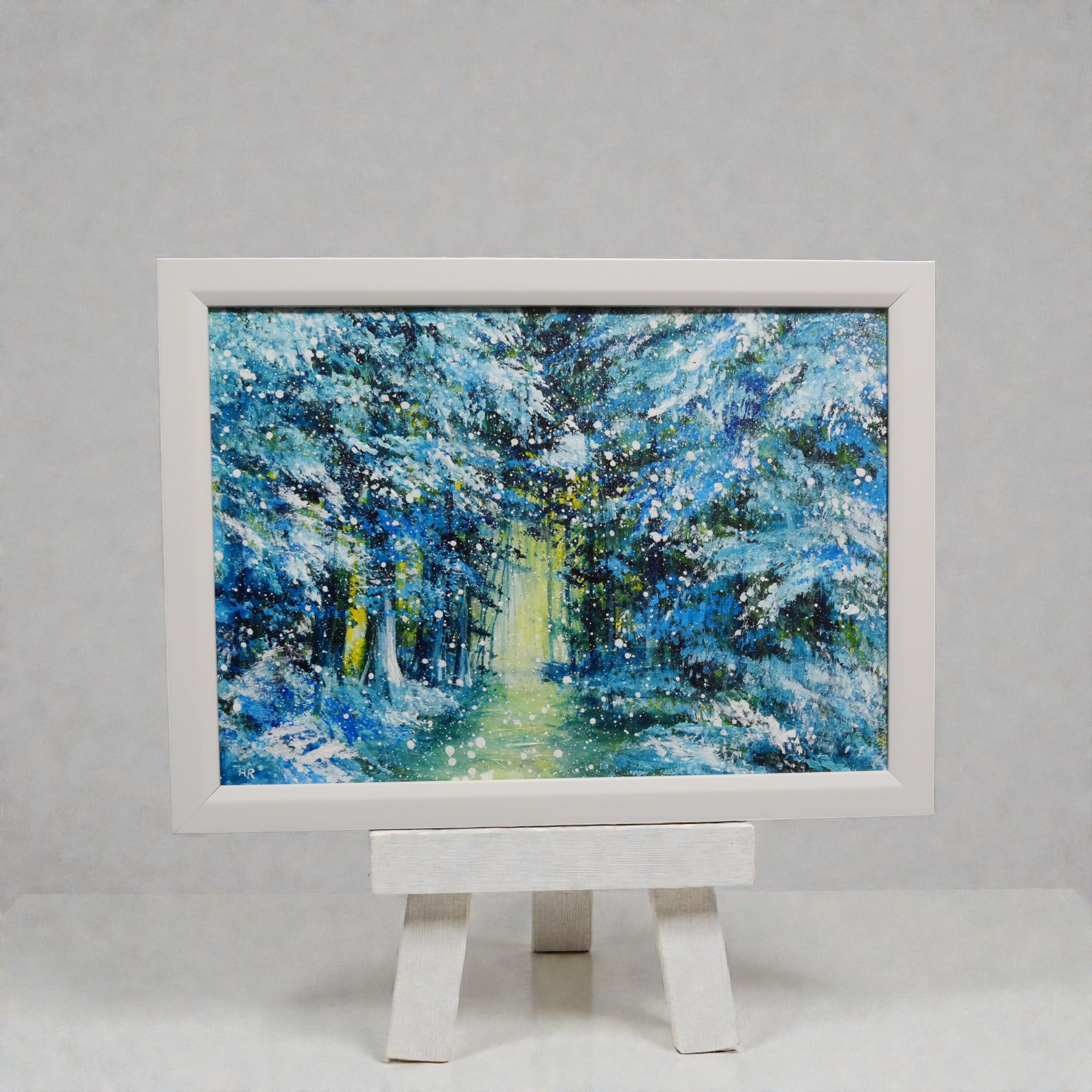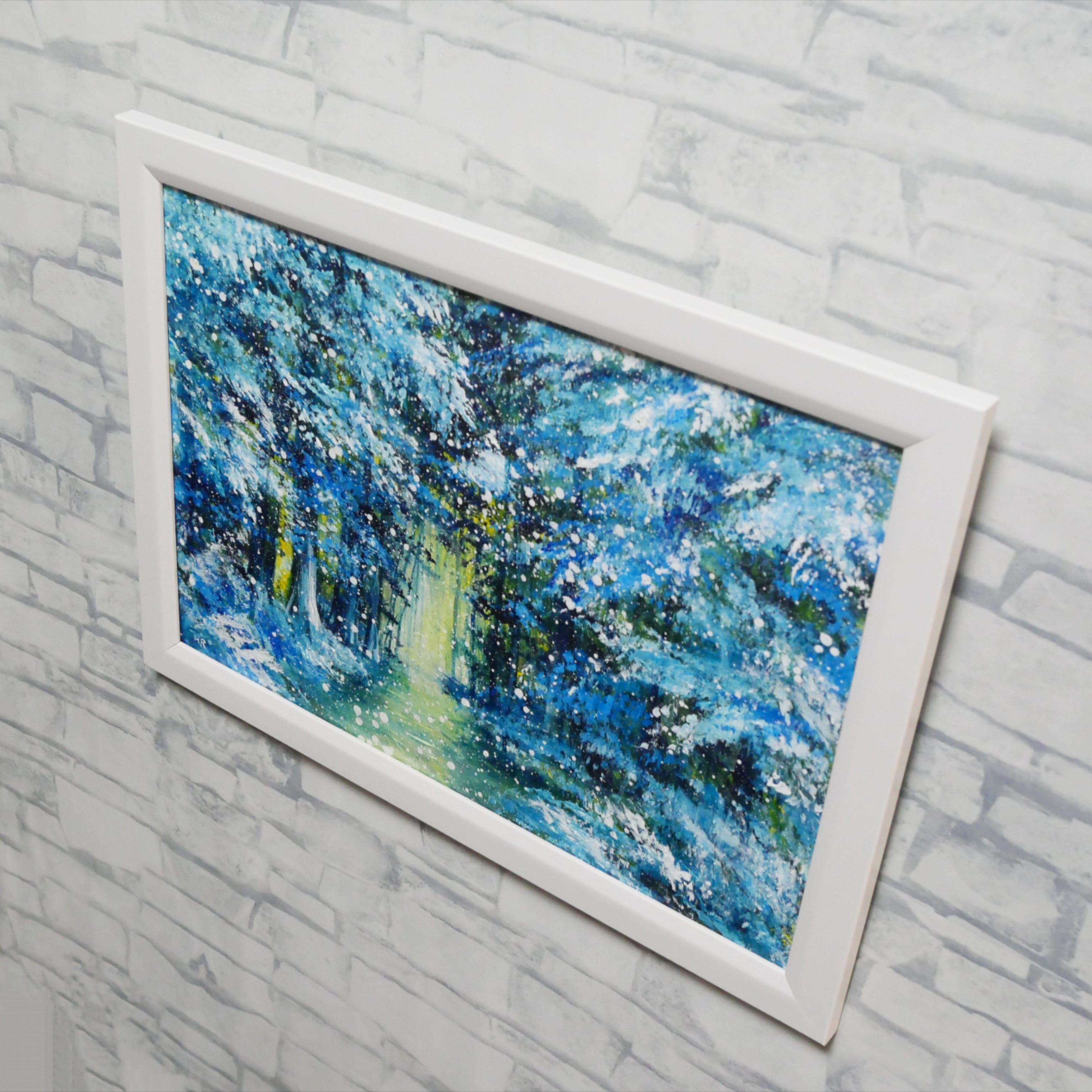 本作品では、ホルベインの油絵具を使用し、荒々しいタッチで描かれた木々の枝には、ふんだんに積もった雪の重みが伝わります。特に目を引くのは、森の奥へと続く暖かい小道です。この小道は暖色系の黄色や黄緑色で描かれ、冷たい森の中で唯一の光を放っています。この光が、鑑賞者を作品の世界へと引き込み、希望や物語性を生み出しています。