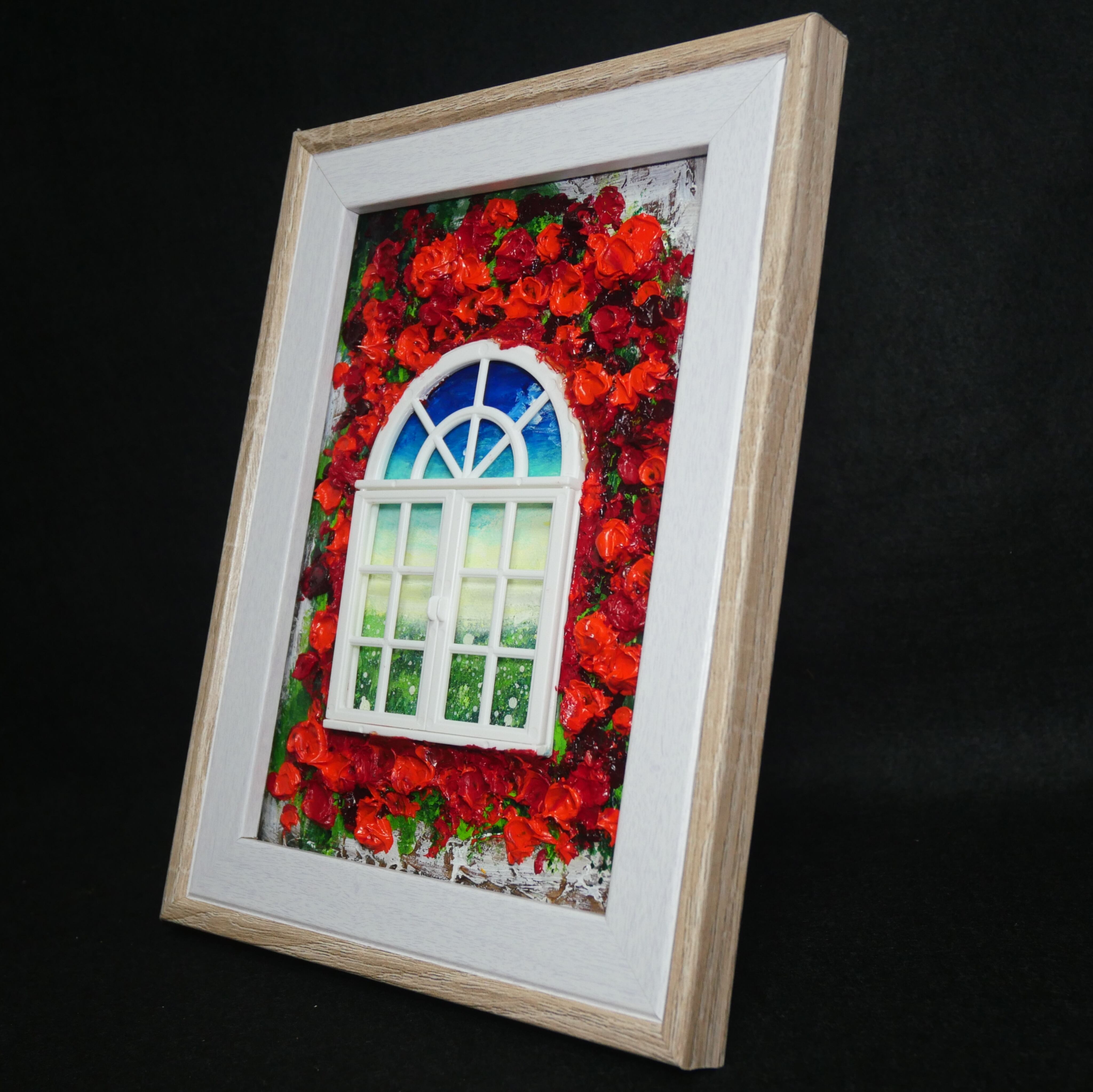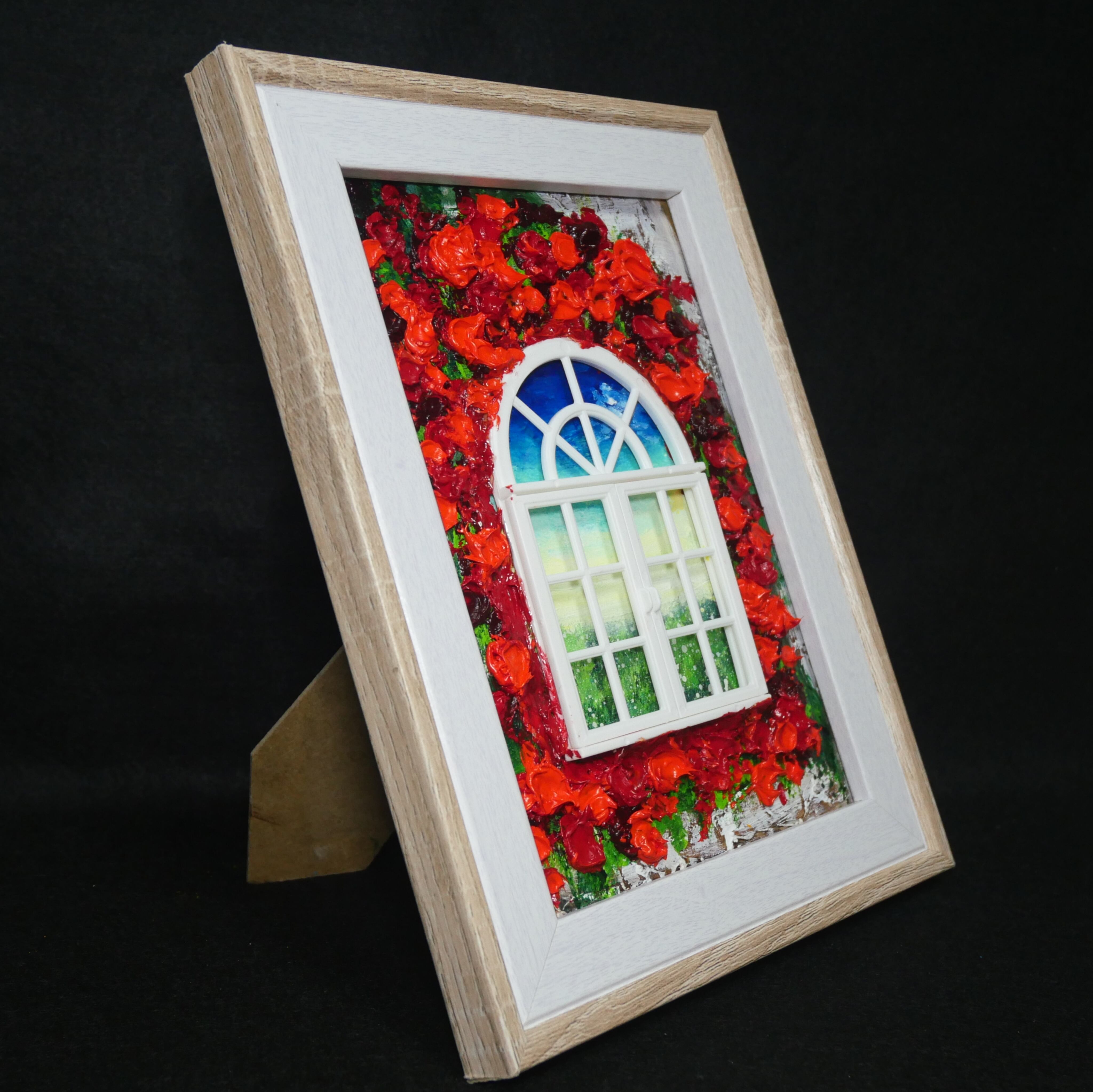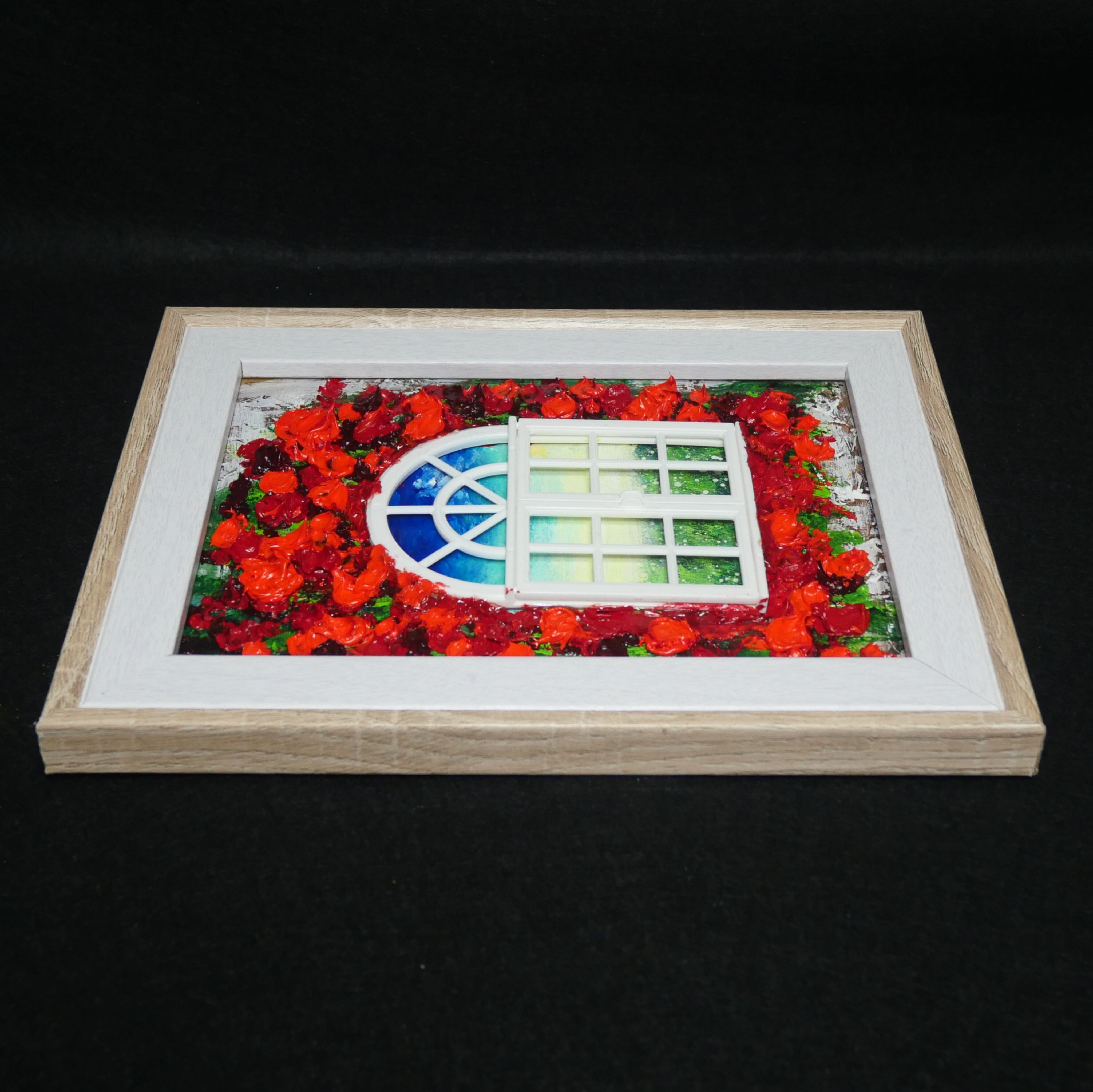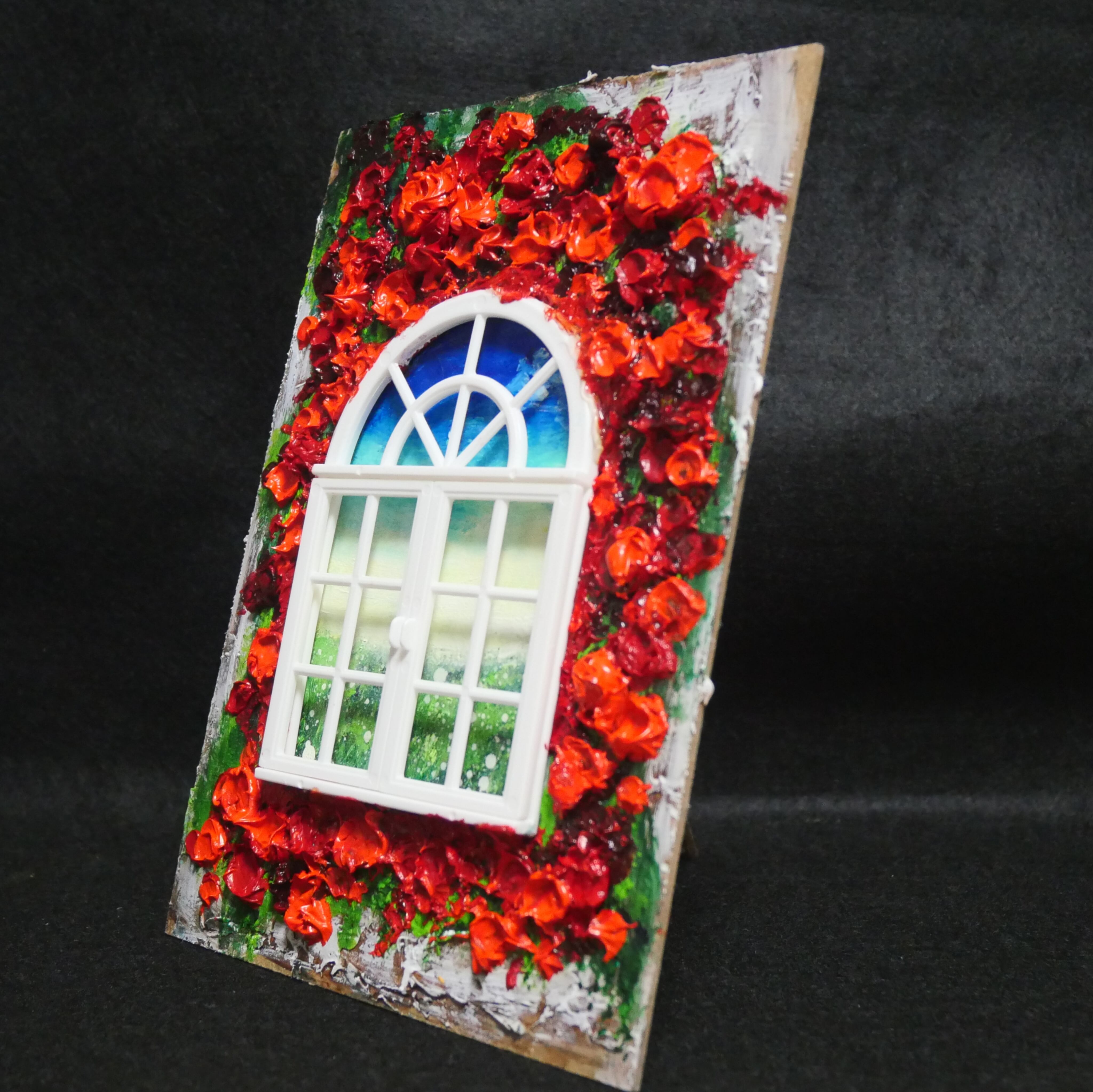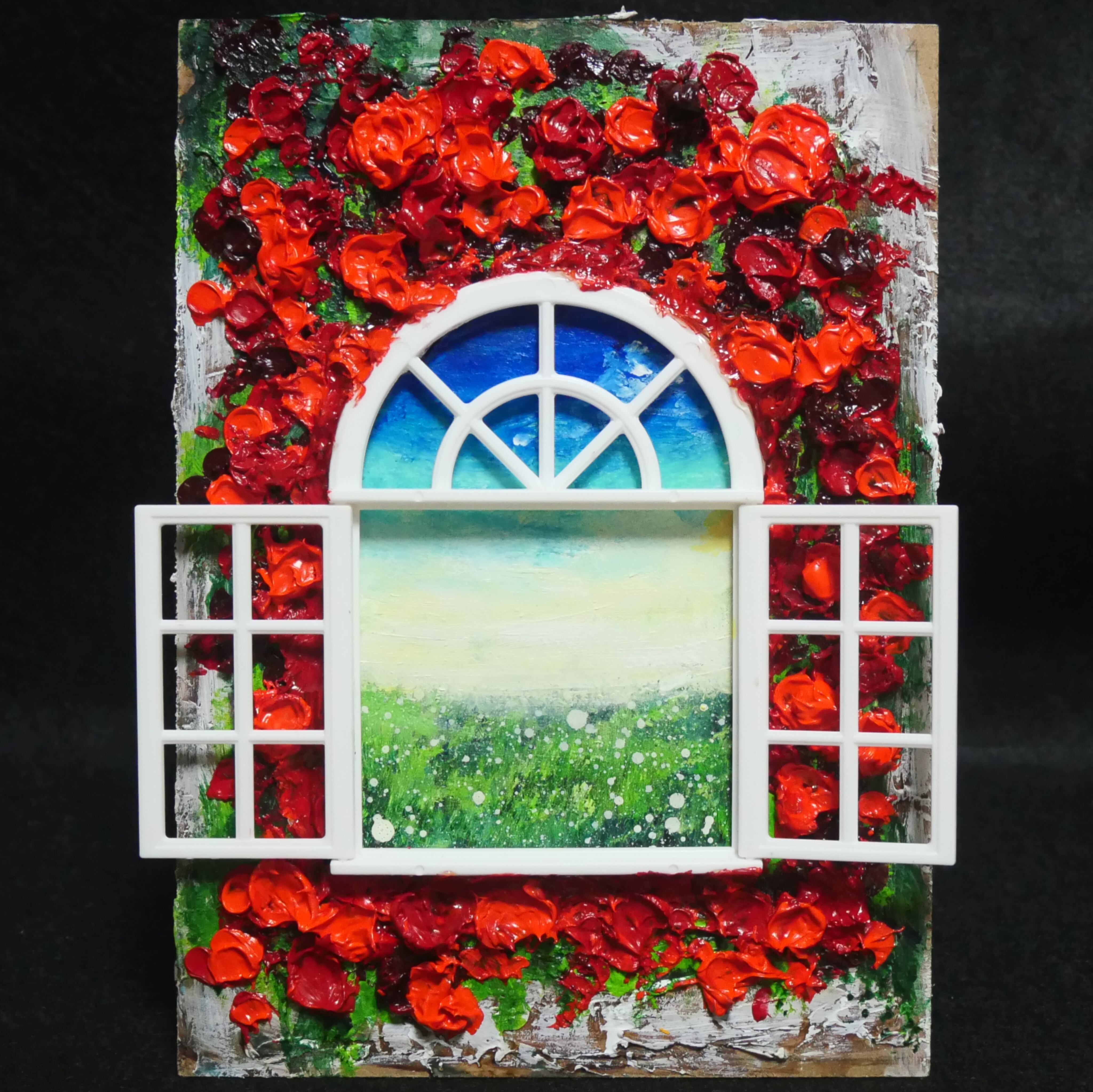 本作品においては、ホルベインの油絵の具を使用した赤い花が、立体感を見事に表現しています。この絵は単なる平面の作品ではなく、ミニチュアの窓枠と窓が物理的に配置されており、奥行きと現実感を生み出すユニークなデザインが特徴です。これにより、観る人の想像力を掻き立てる、インタラクティブな体験を提供します。