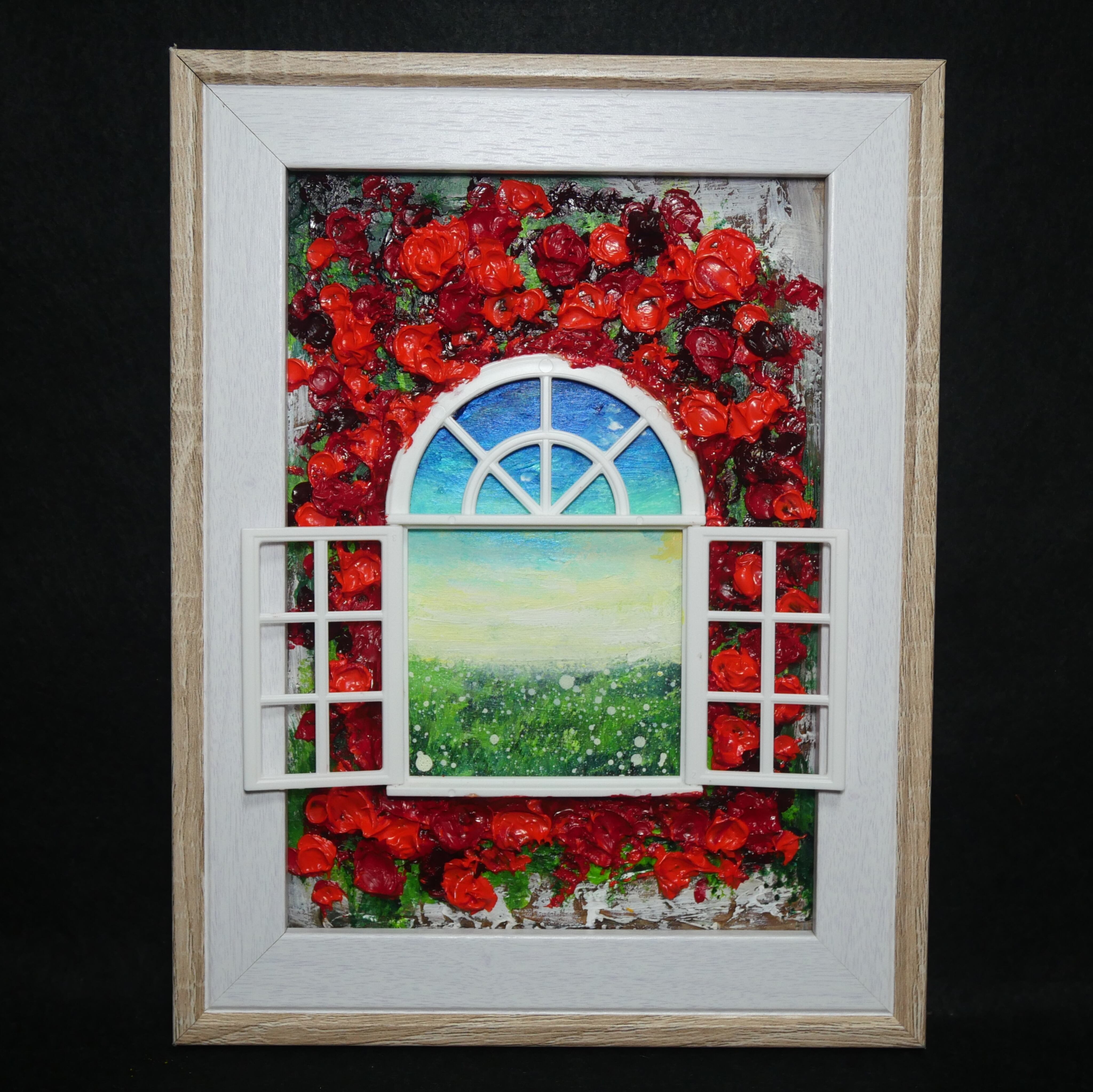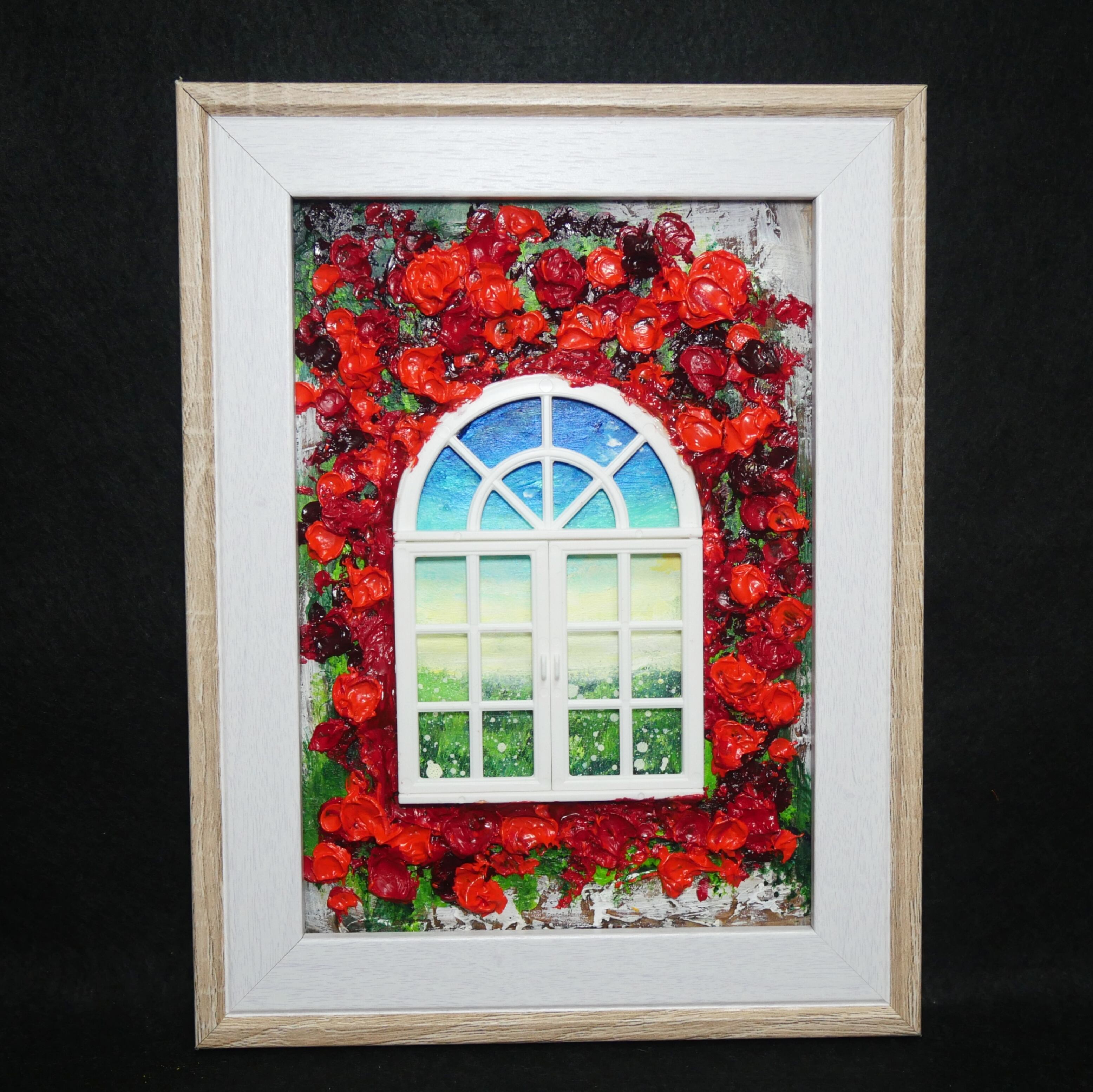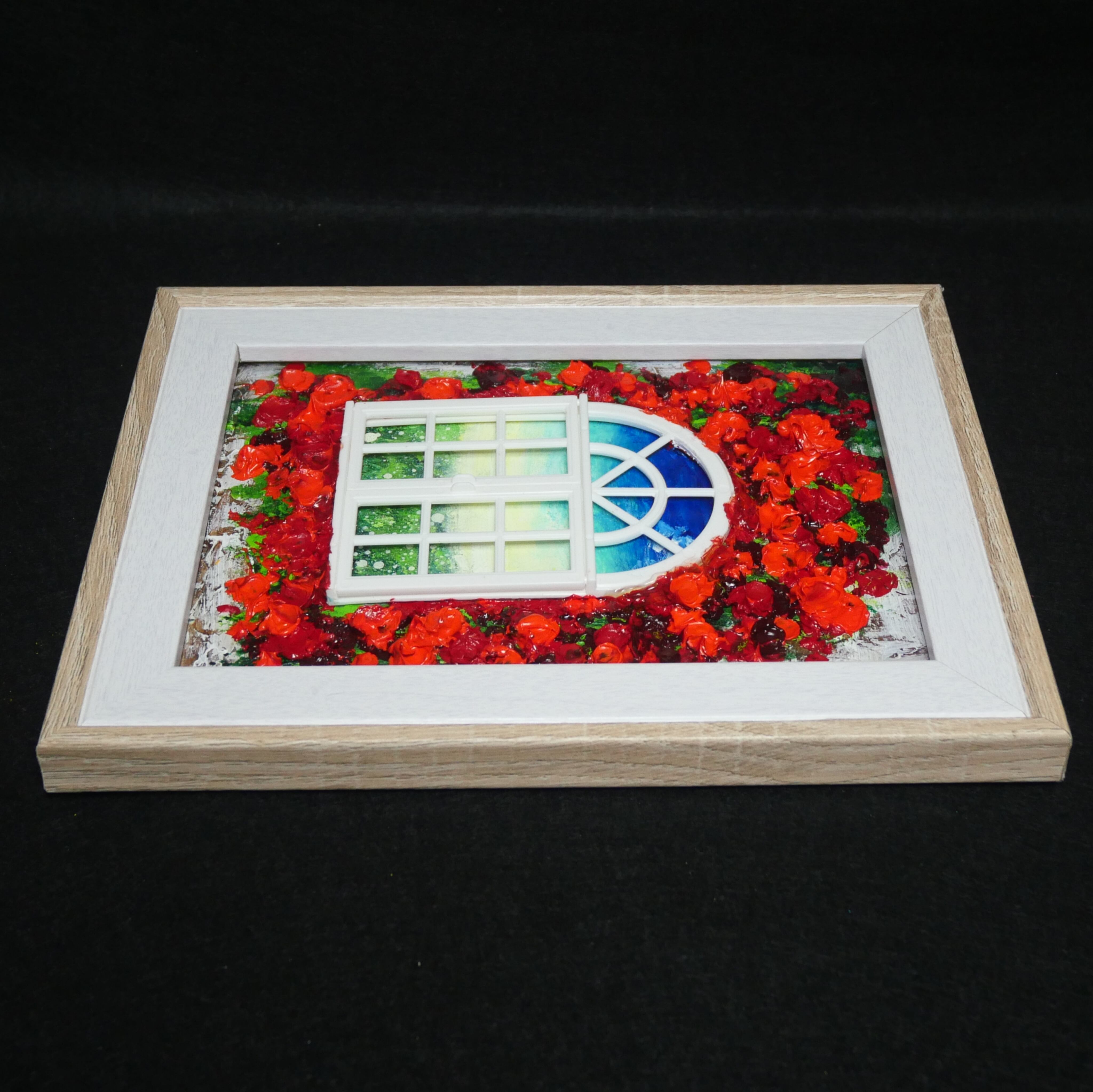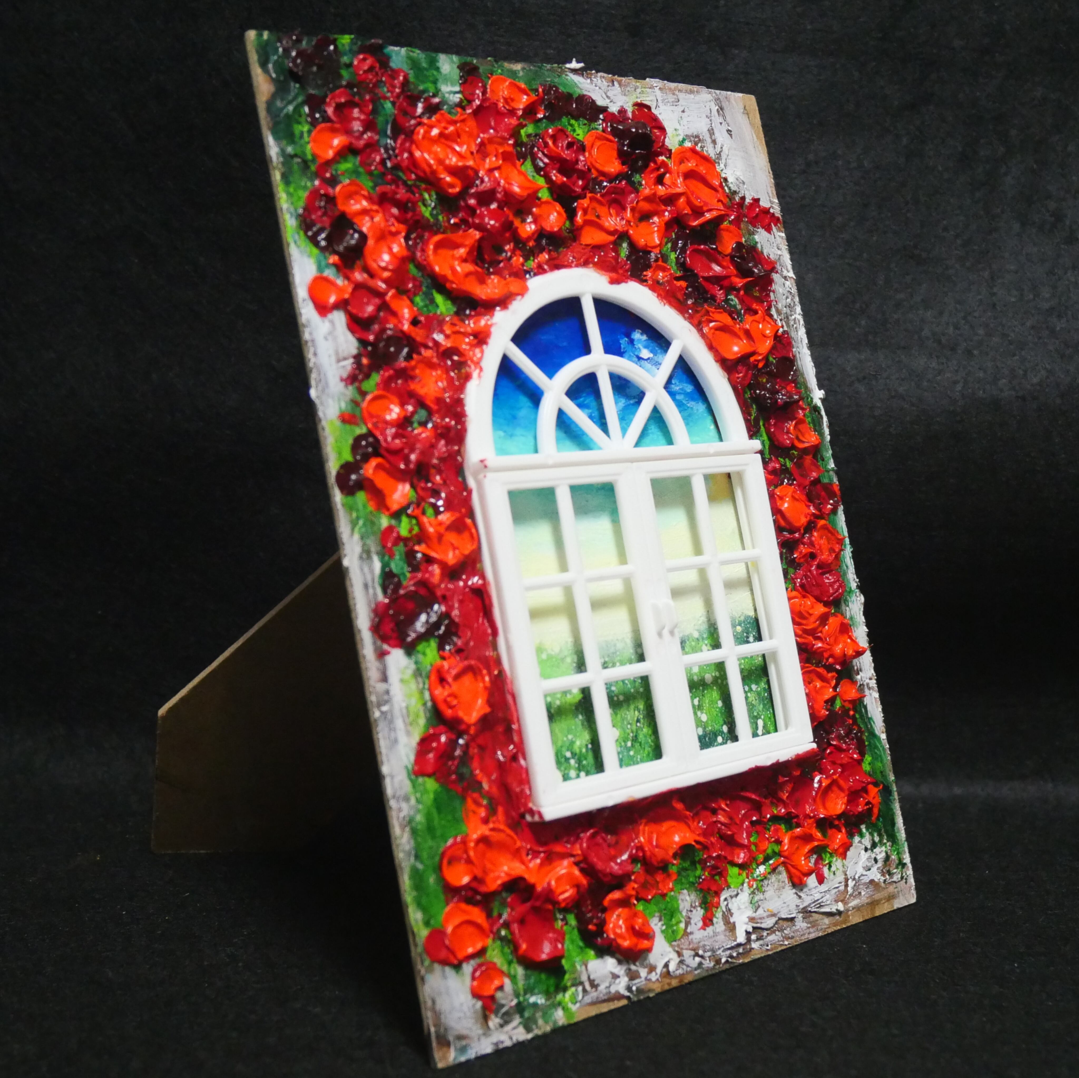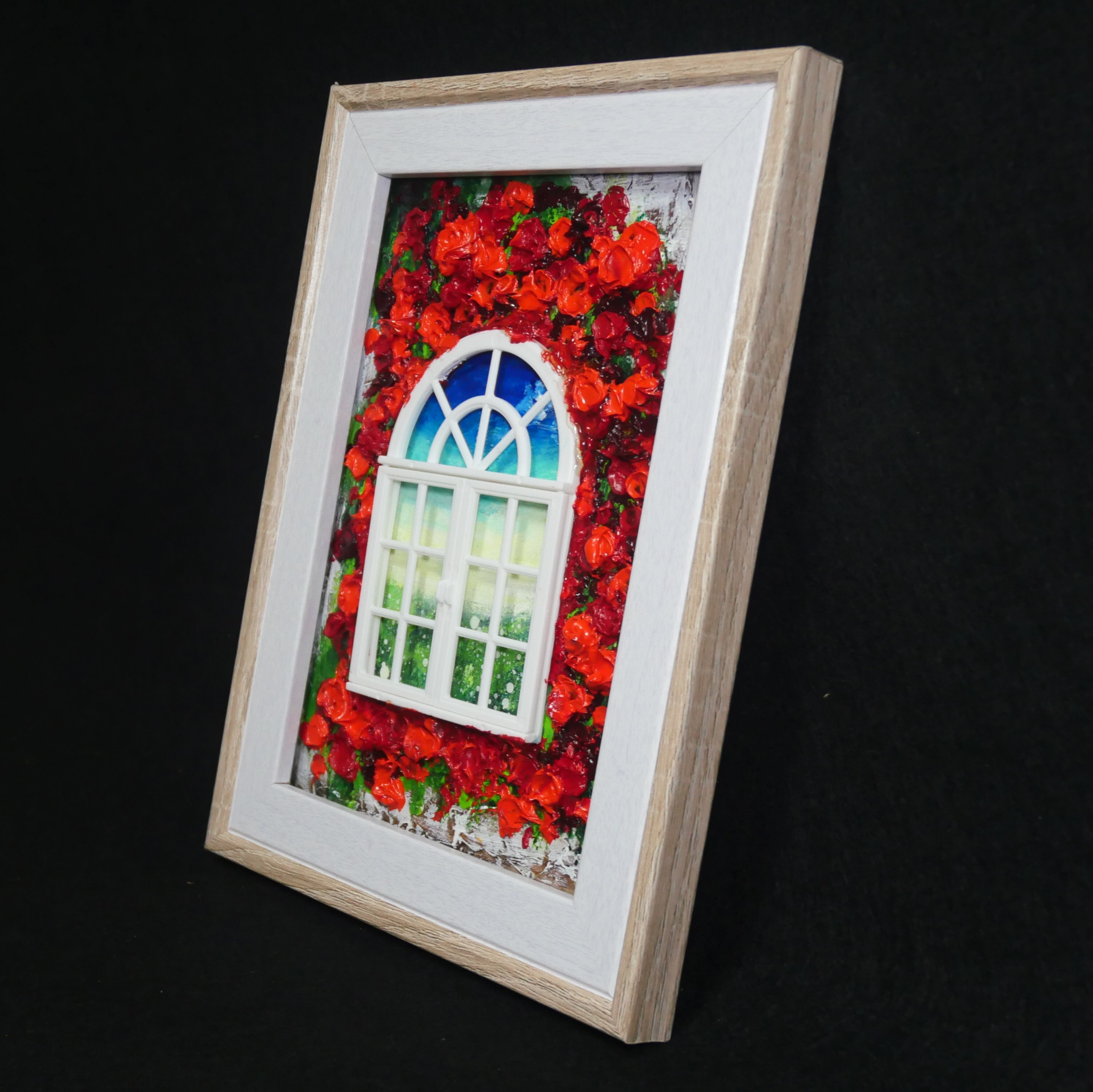 本作品においては、ホルベインの油絵の具を使用した赤い花が、立体感を見事に表現しています。この絵は単なる平面の作品ではなく、ミニチュアの窓枠と窓が物理的に配置されており、奥行きと現実感を生み出すユニークなデザインが特徴です。これにより、観る人の想像力を掻き立てる、インタラクティブな体験を提供します。