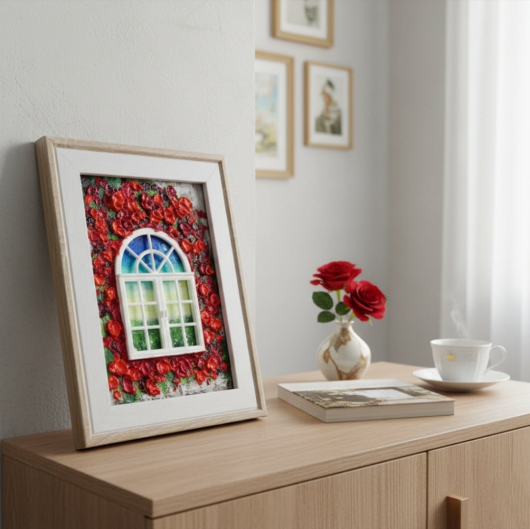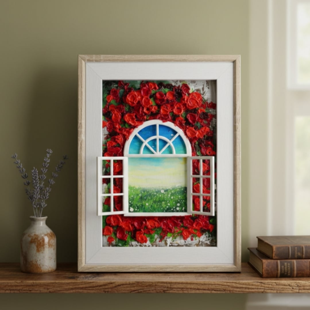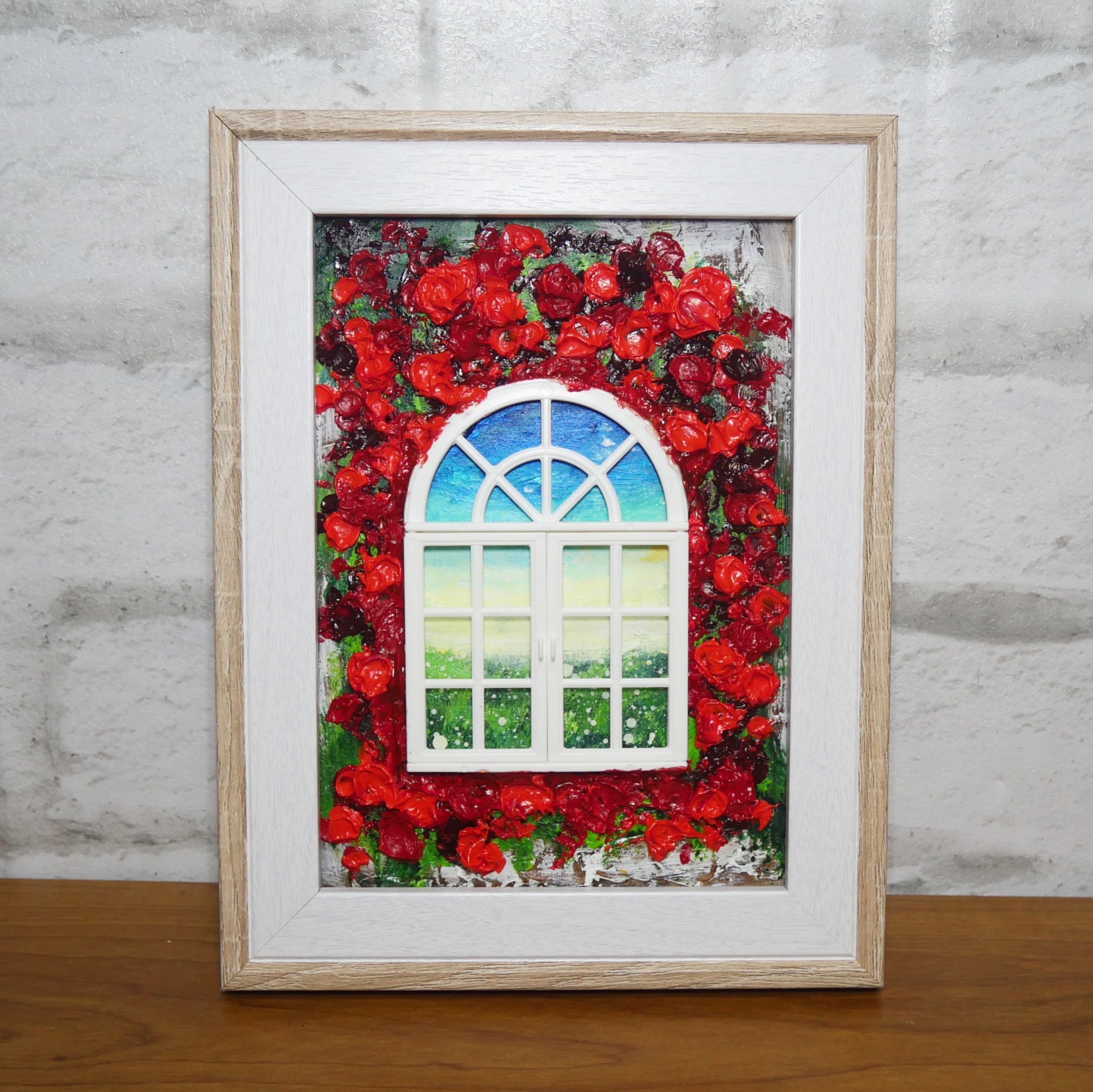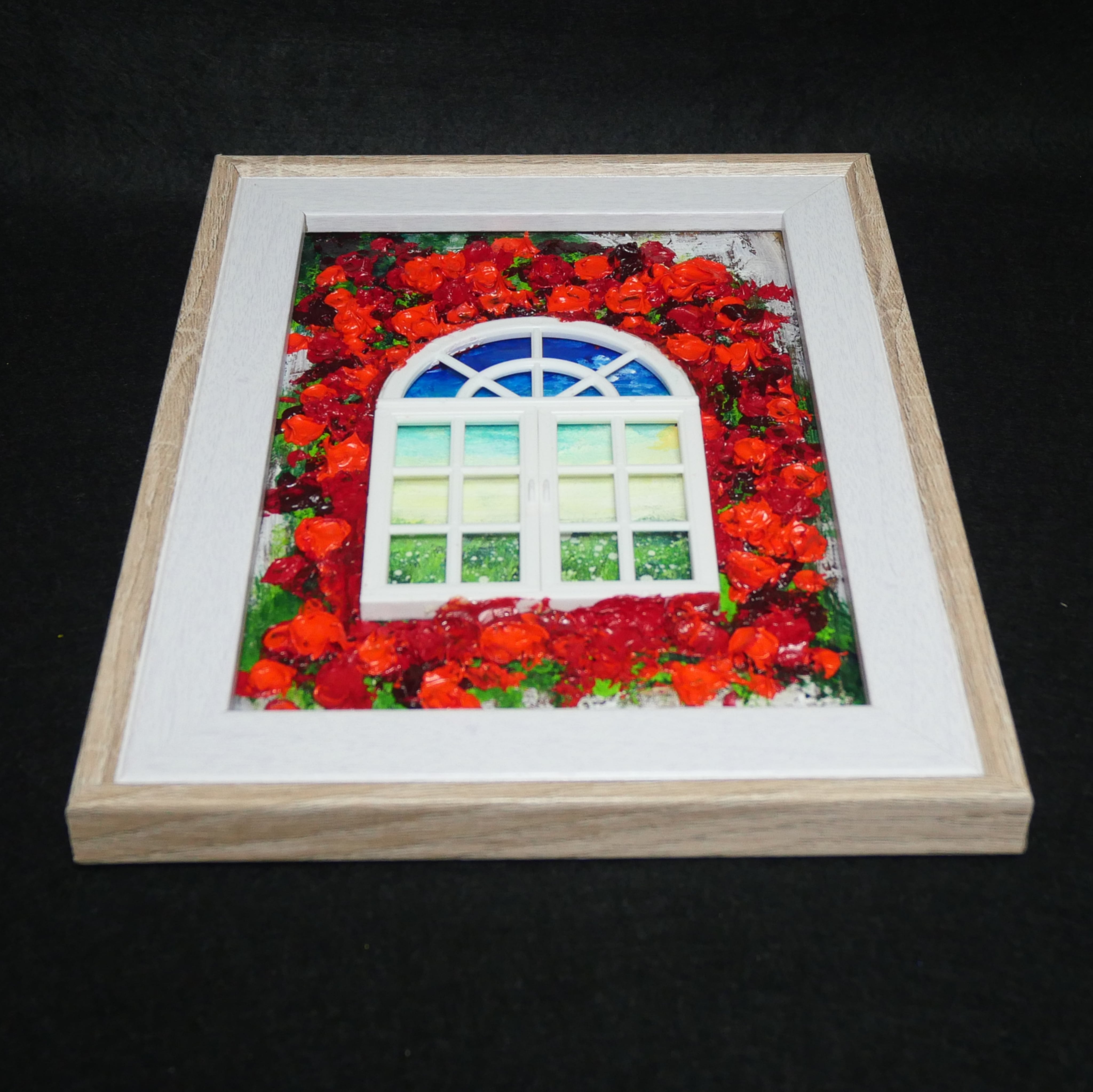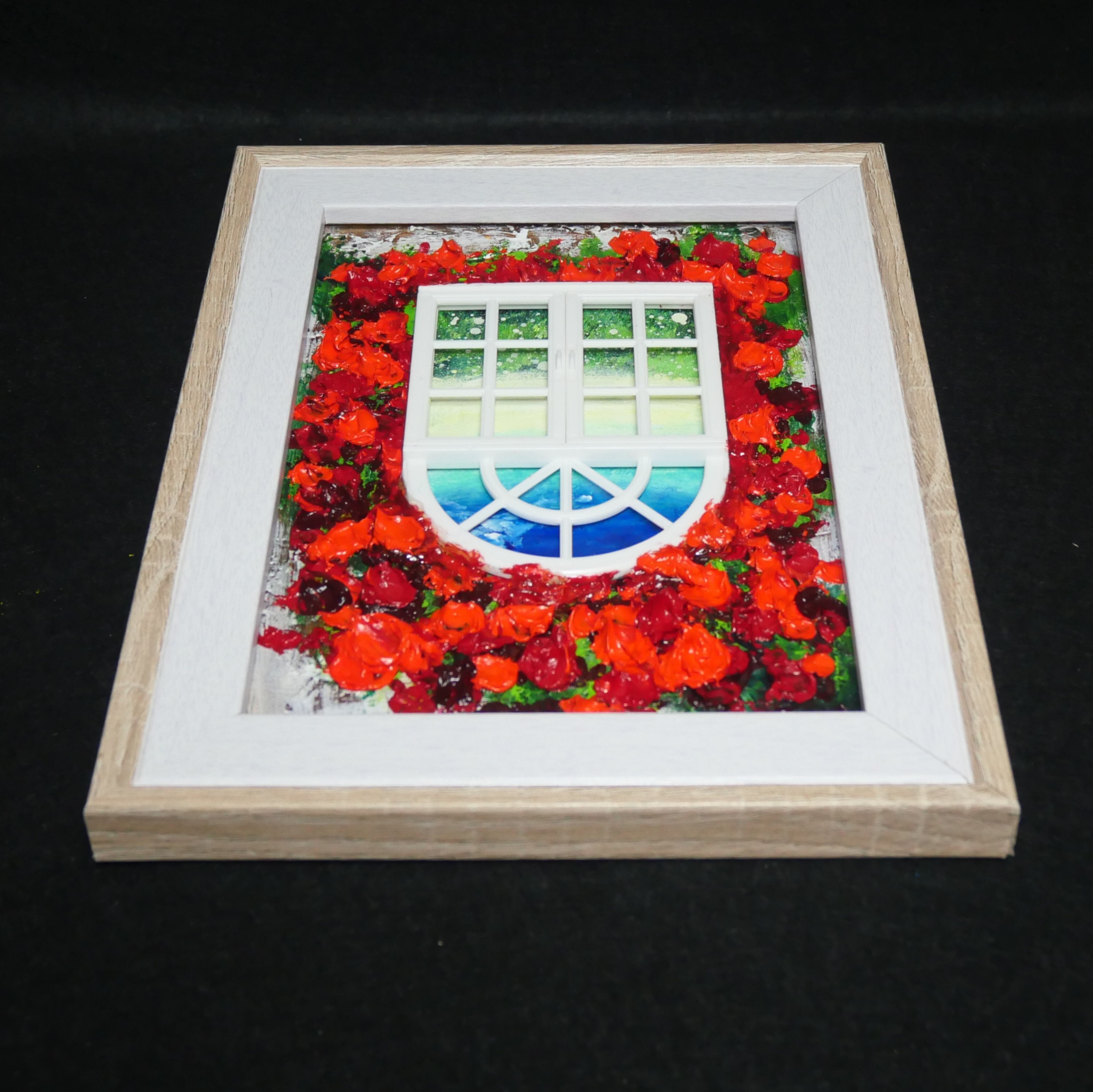 本作品においては、ホルベインの油絵の具を使用した赤い花が、立体感を見事に表現しています。この絵は単なる平面の作品ではなく、ミニチュアの窓枠と窓が物理的に配置されており、奥行きと現実感を生み出すユニークなデザインが特徴です。これにより、観る人の想像力を掻き立てる、インタラクティブな体験を提供します。