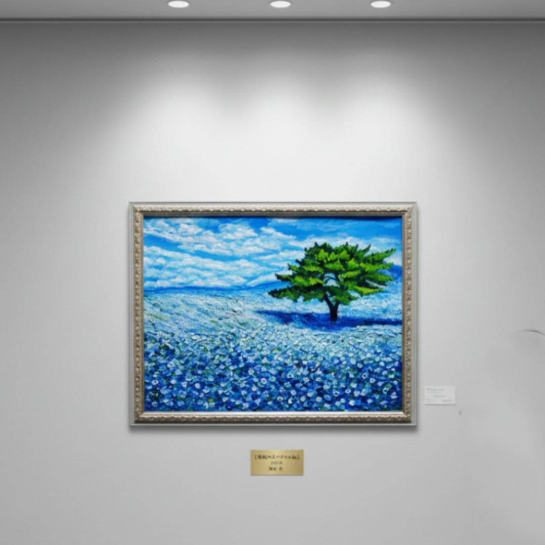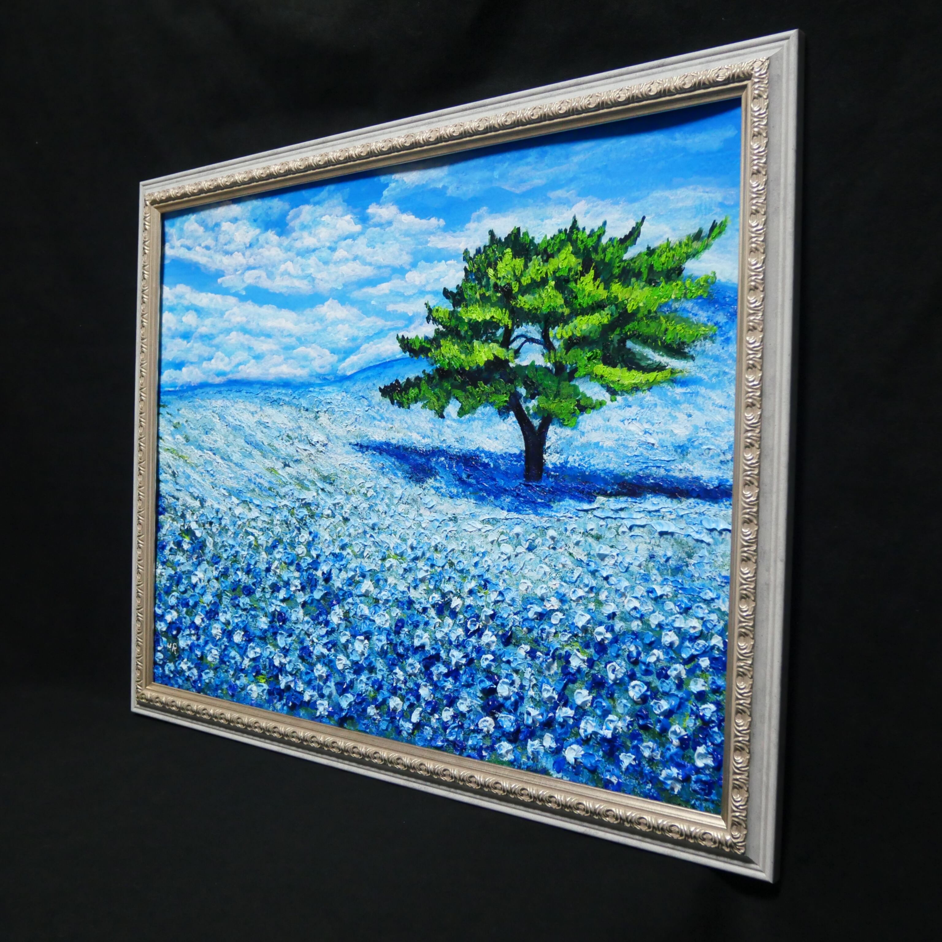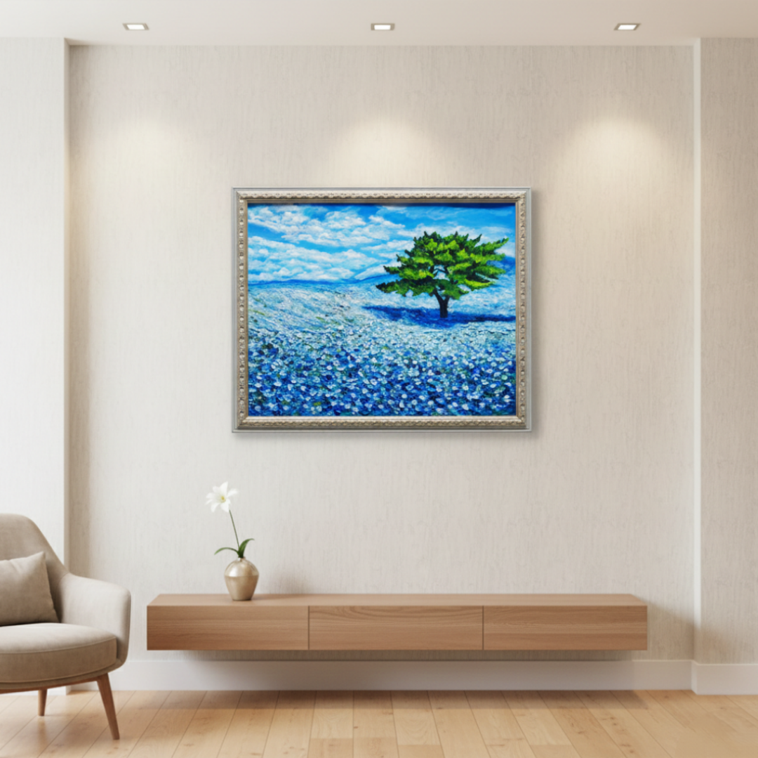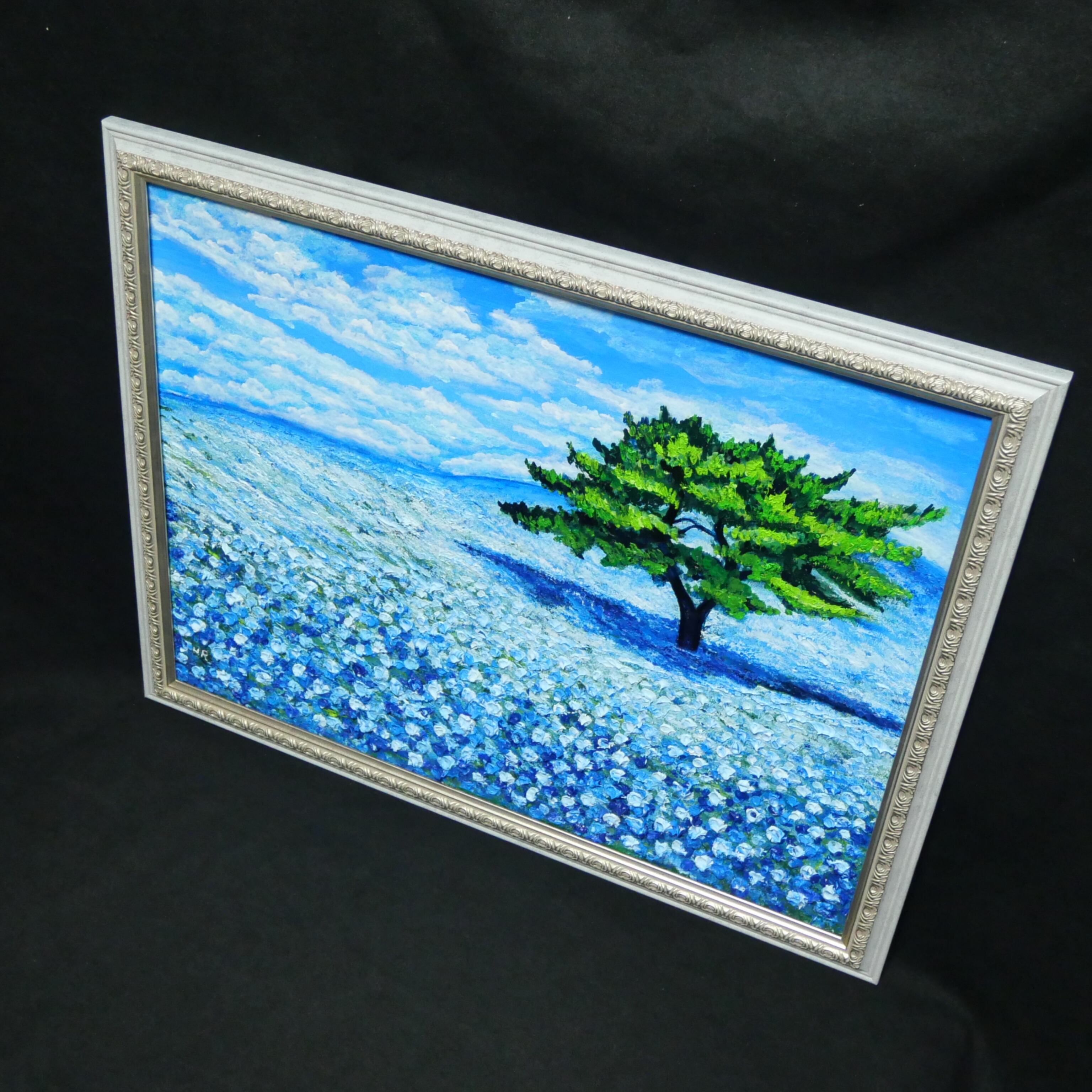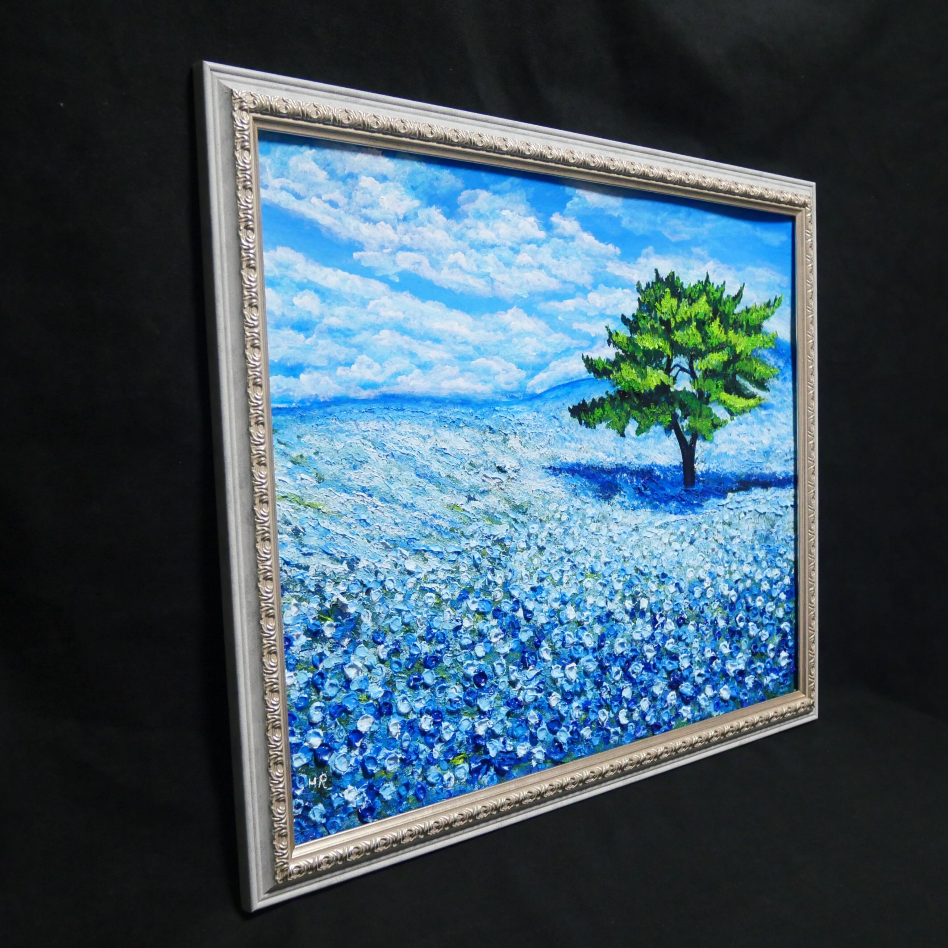 「青空のネモフィラの丘」は、一面に広がる鮮やかなネモフィラの青い花畑と、空高く伸びる一本の緑豊かな木、そして爽やかな青空と白い雲が見事に調和した風景を描いた特別な油絵作品です。サイズは横50.9cm×縦39.2cmで、自然の温もりと命の輝きが感じられる、心に深い癒しをもたらす作品となっています。
