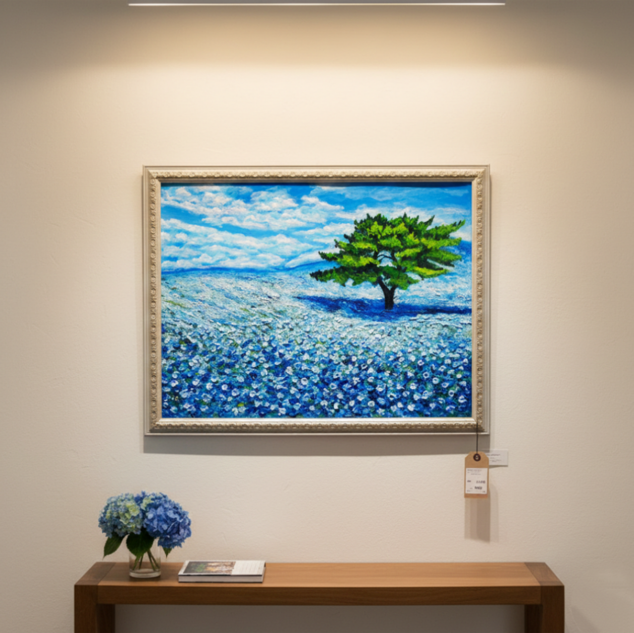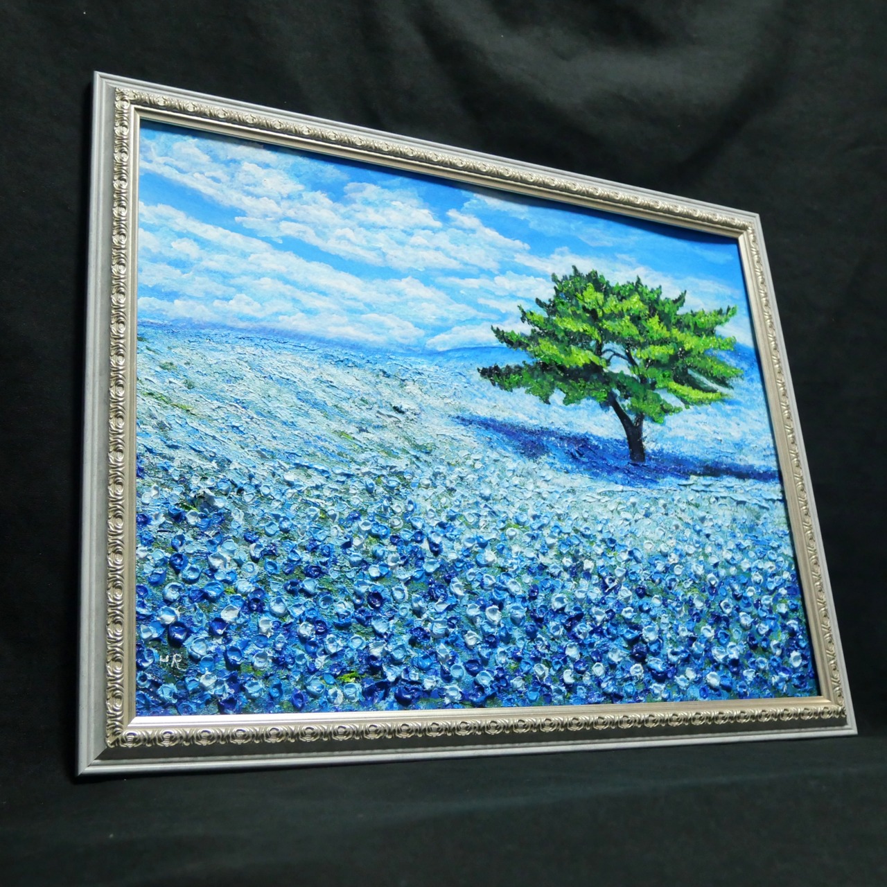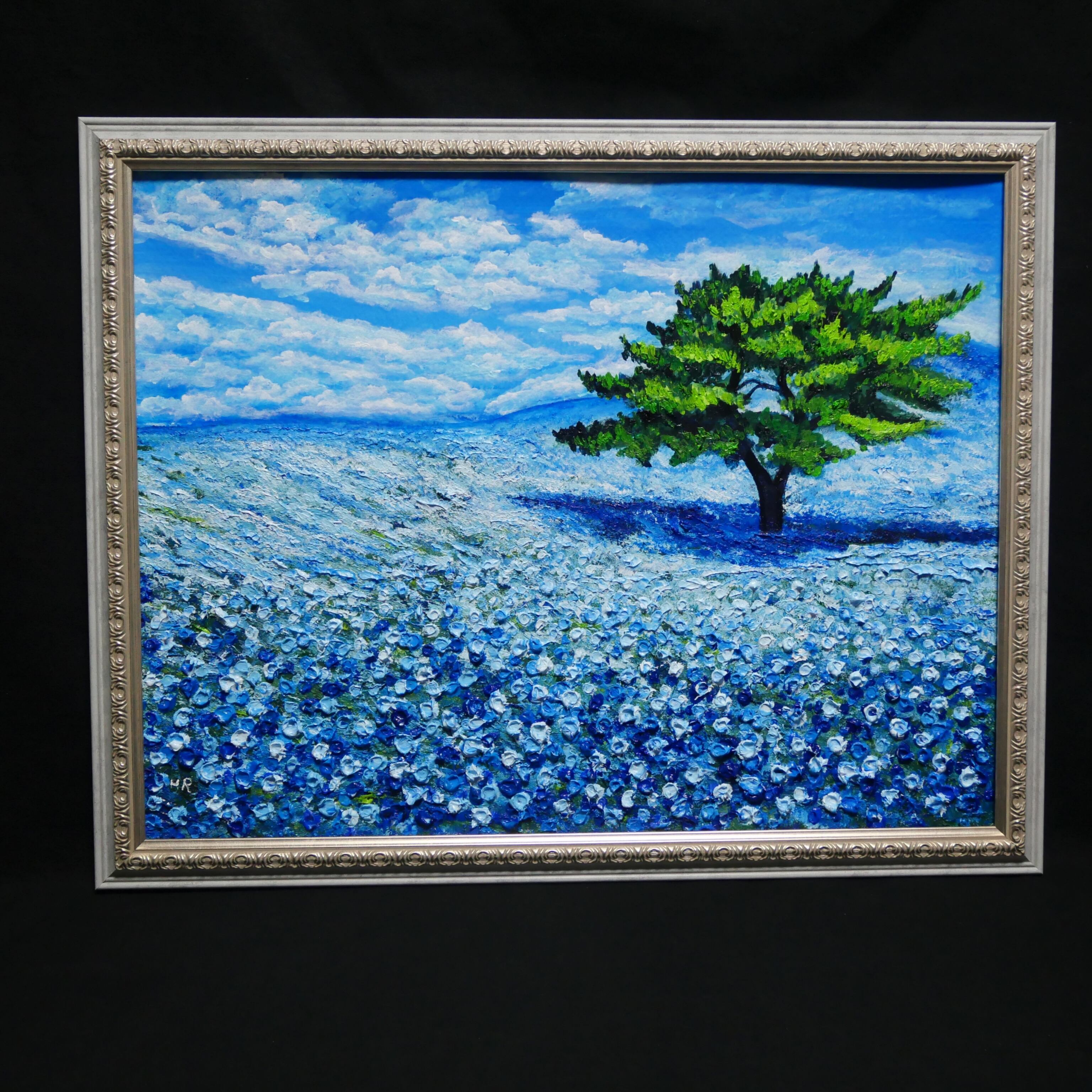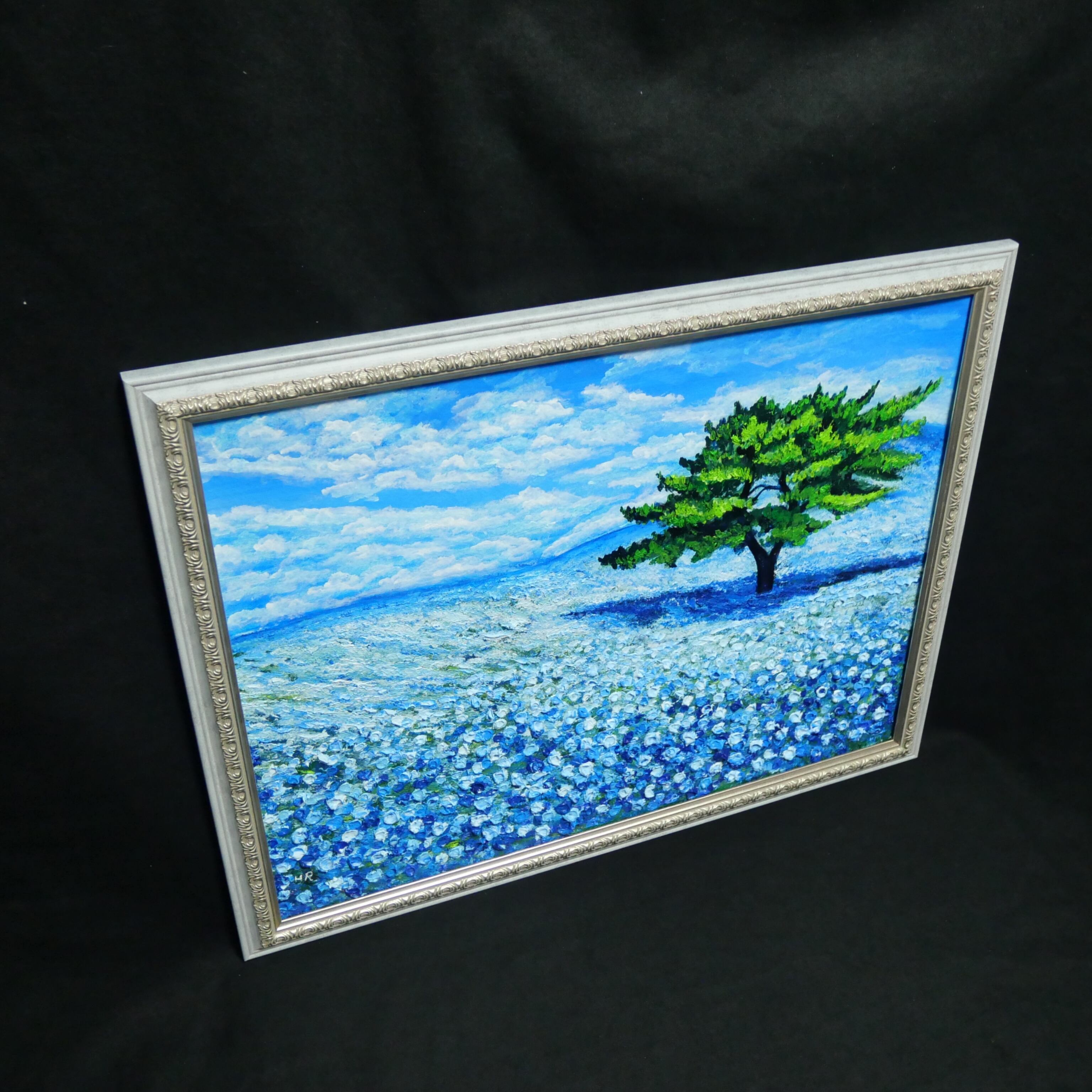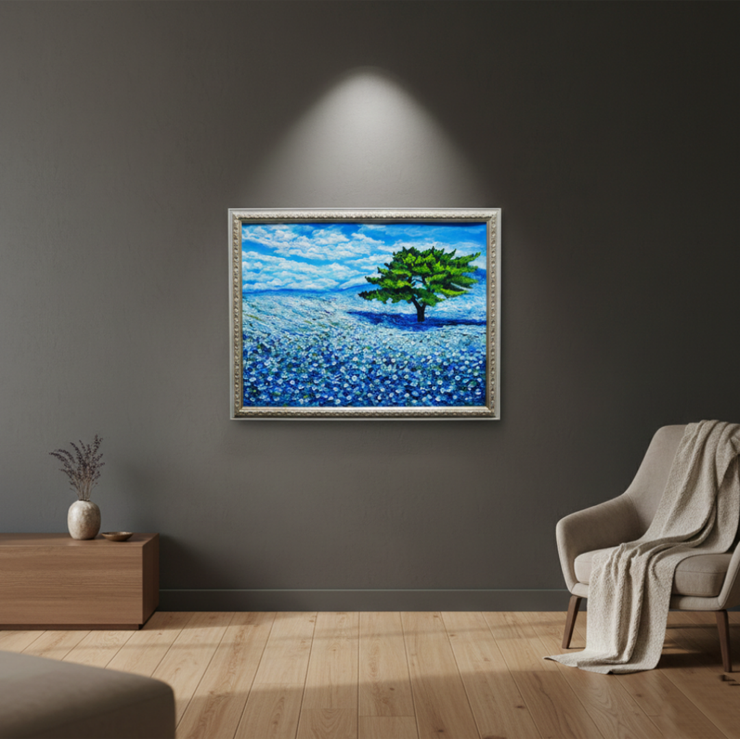 「青空のネモフィラの丘」は、一面に広がる鮮やかなネモフィラの青い花畑と、空高く伸びる一本の緑豊かな木、そして爽やかな青空と白い雲が見事に調和した風景を描いた特別な油絵作品です。サイズは横50.9cm×縦39.2cmで、自然の温もりと命の輝きが感じられる、心に深い癒しをもたらす作品となっています。