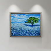 さらに、右側に堂々と佇む一本の木が、この青い世界に力強いアクセントを加えています。豊かな緑の葉と幹は、生命力に満ち、風景に奥行きとバランスをもたらしています。また、油絵ならではの厚みのある絵の具の質感が、花の可憐さや雲の柔らかさ、木の力強さをより一層引き立てています。この「青空のネモフィラの丘」は、新しい生活を始める人々を応援する「どこでも成功」というネモフィラの花言葉のように、前向きで爽やかな気持ちを与えてくれる一枚です。