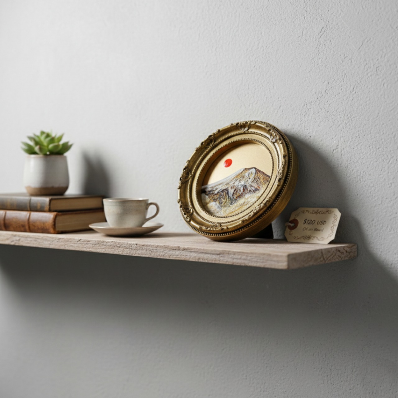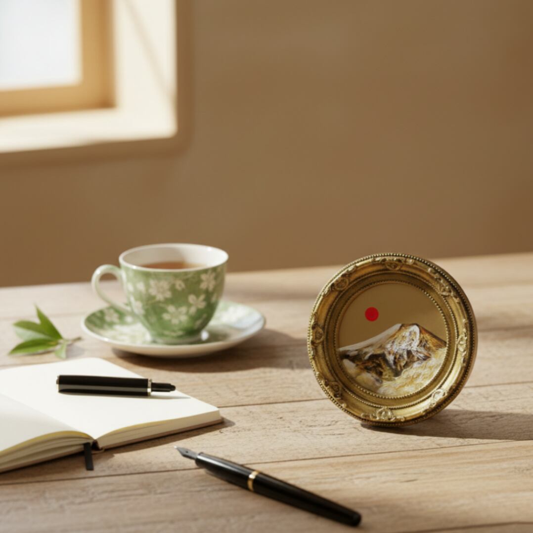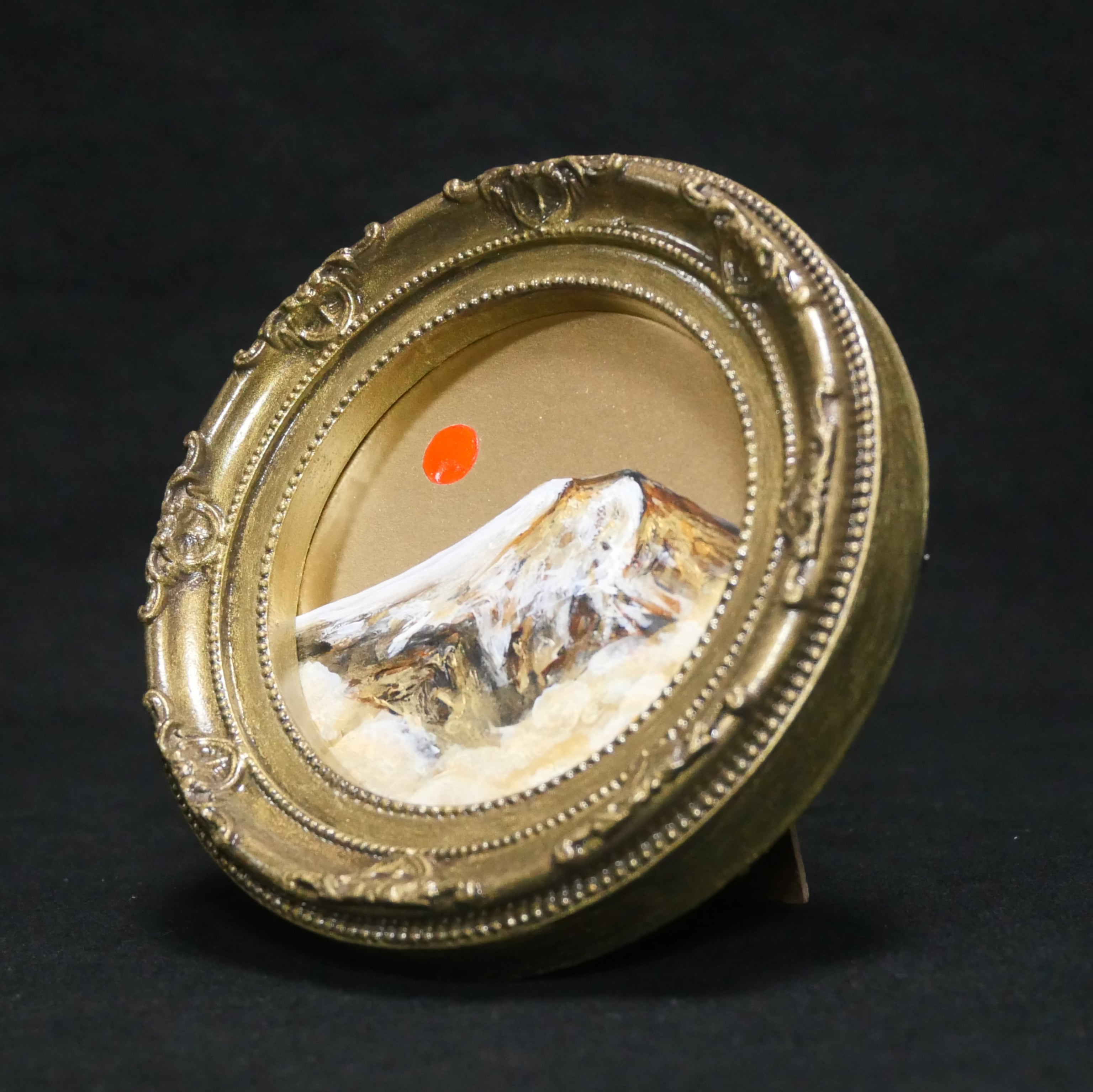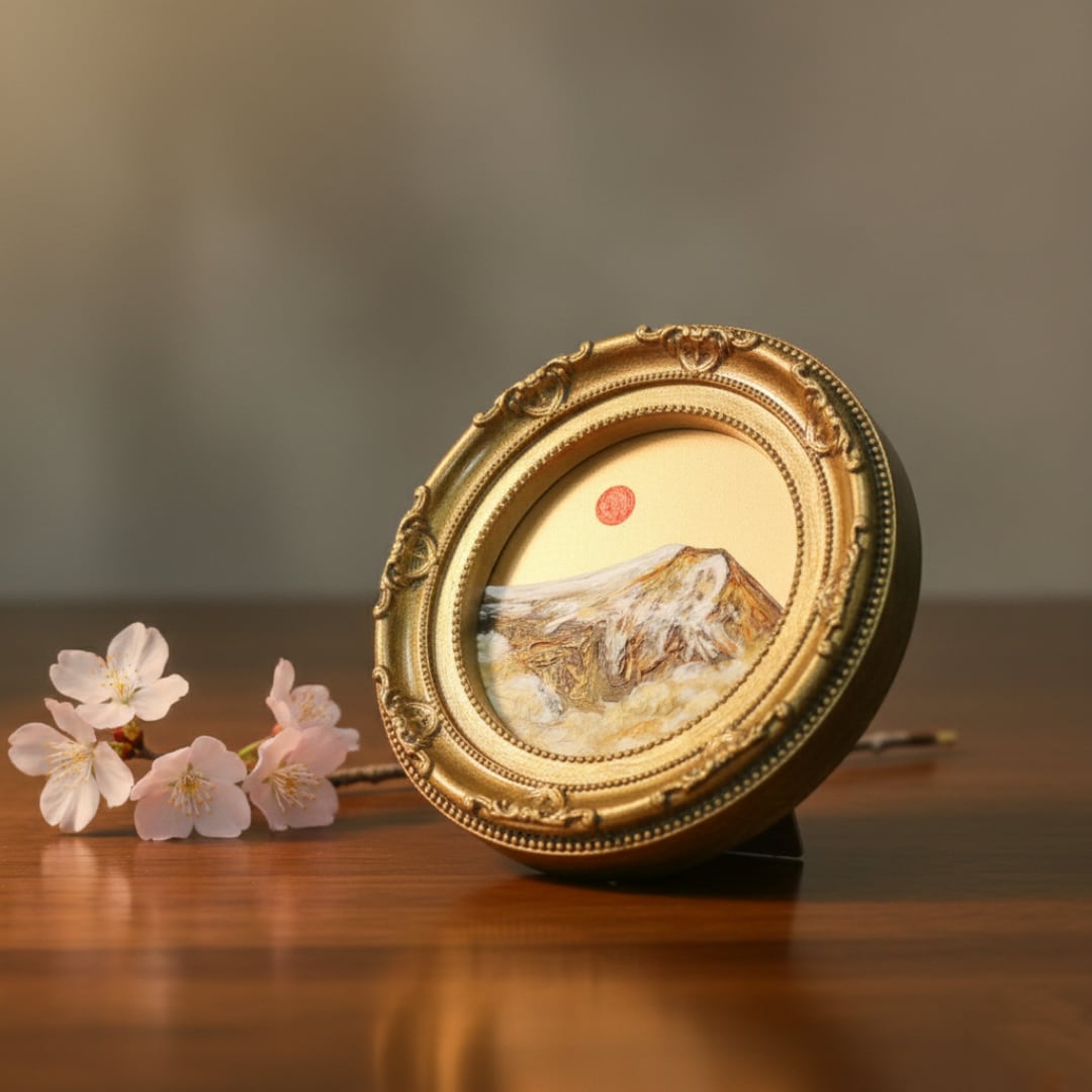 手のひらサイズの可愛らしいアート作品でありながら、日本の美しい風景と縁起の良いモチーフが見事に融合しており、日常に少しの贅沢と開運の雰囲気をもたらしてくれる、非常に魅力的な一点です。