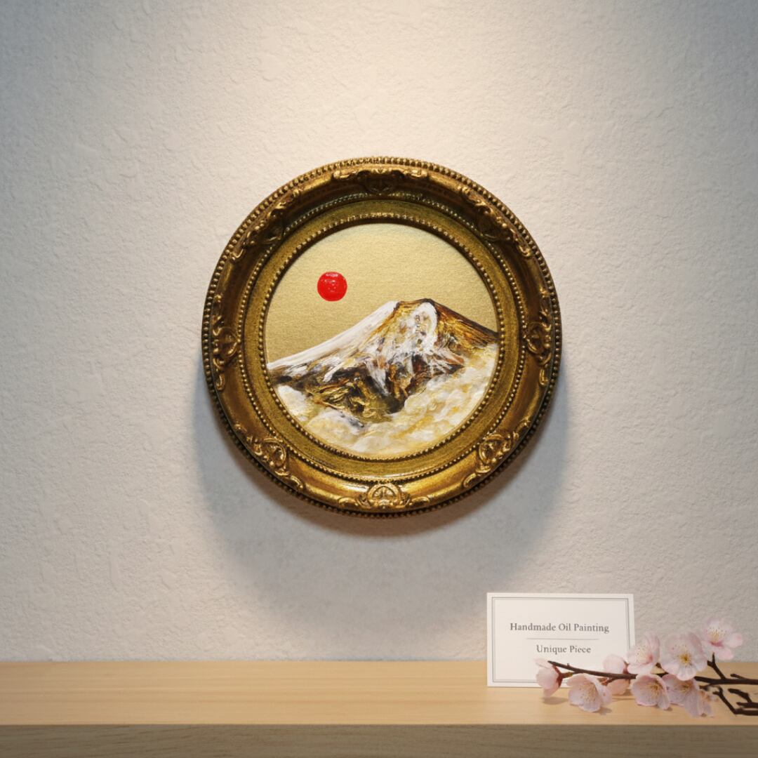 油絵 油彩 円形ミニ絵画「黄金富士山」絵画 油彩画 インテリア 風景画 富士山 縁起物 壁掛け 贈り物に 風水