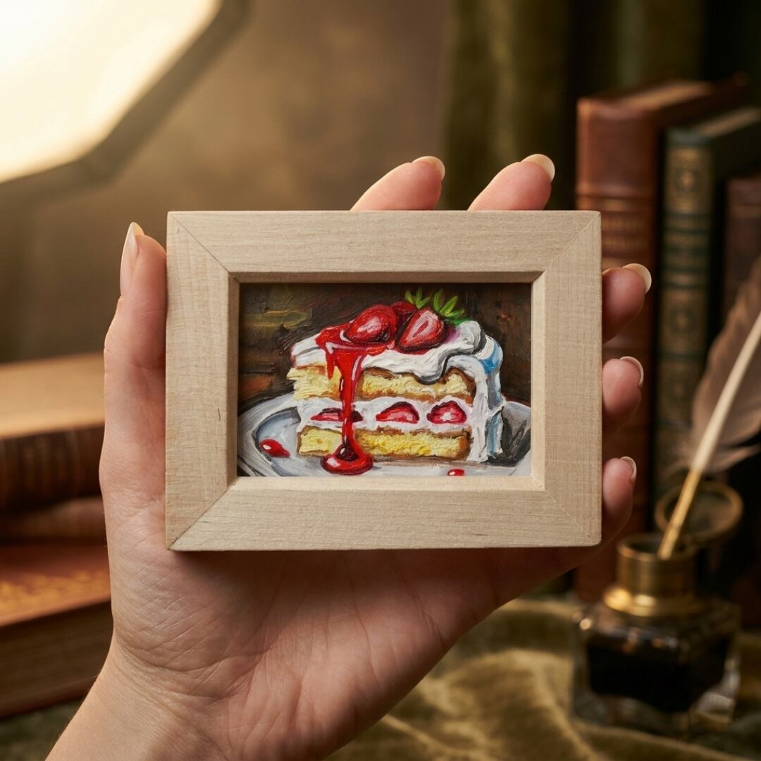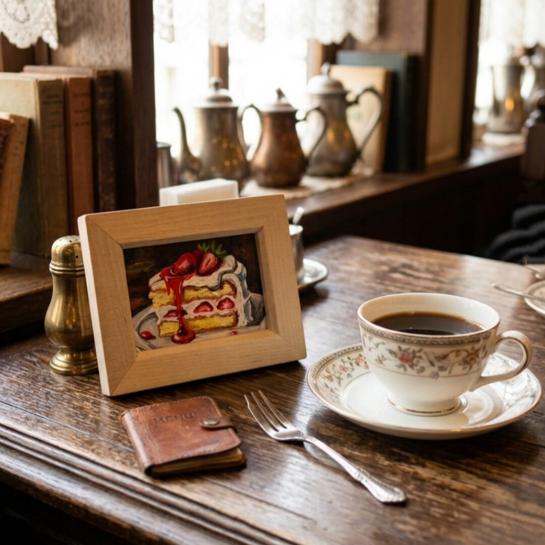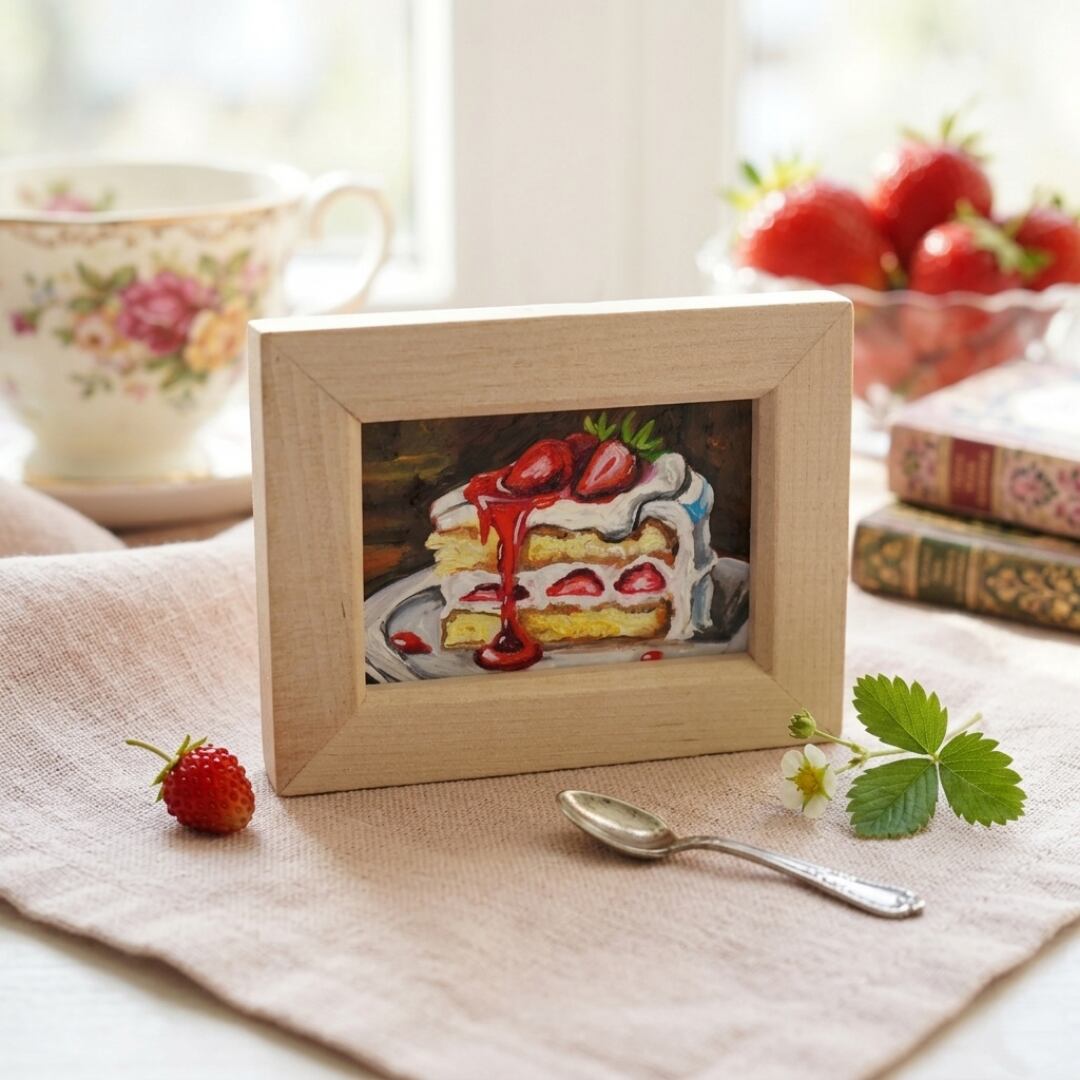 背景には落ち着いたダークトーンが使用され、主役であるケーキの明るい色彩を引き立てています。また、額縁から感じられる木の温もりが、まるで宝石のような特別感を一層際立たせています。小さなサイズだからこそ、日常のふとした瞬間に視界に入るだけで、心を和ませてくれる力を持った作品です。