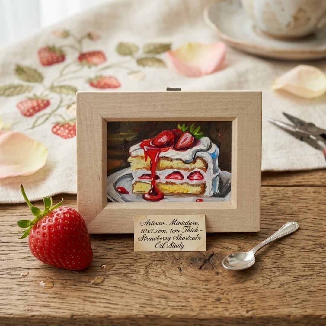 「ショートケーキ」は、小さなキャンバスの中に甘美な世界を閉じ込めた特別なミニ絵画です。横10cm、縦7.7cm、厚さ1cmというコンパクトなサイズながらも、絵の中の「美味しさ」が見事に表現されています。最初に目に飛び込んでくるのは、鮮やかな赤色のイチゴと、その上からたっぷりとかけられたソースの存在感です。