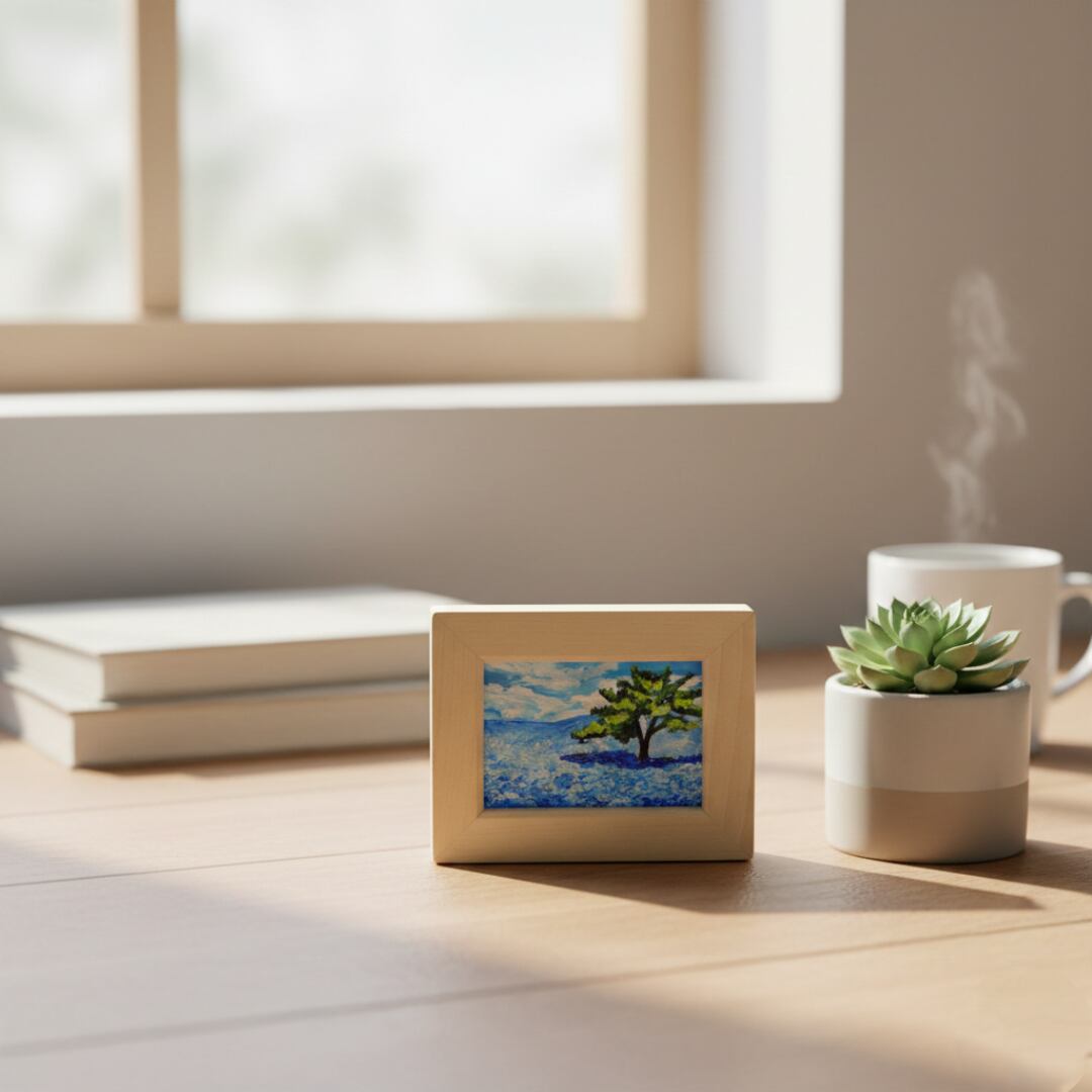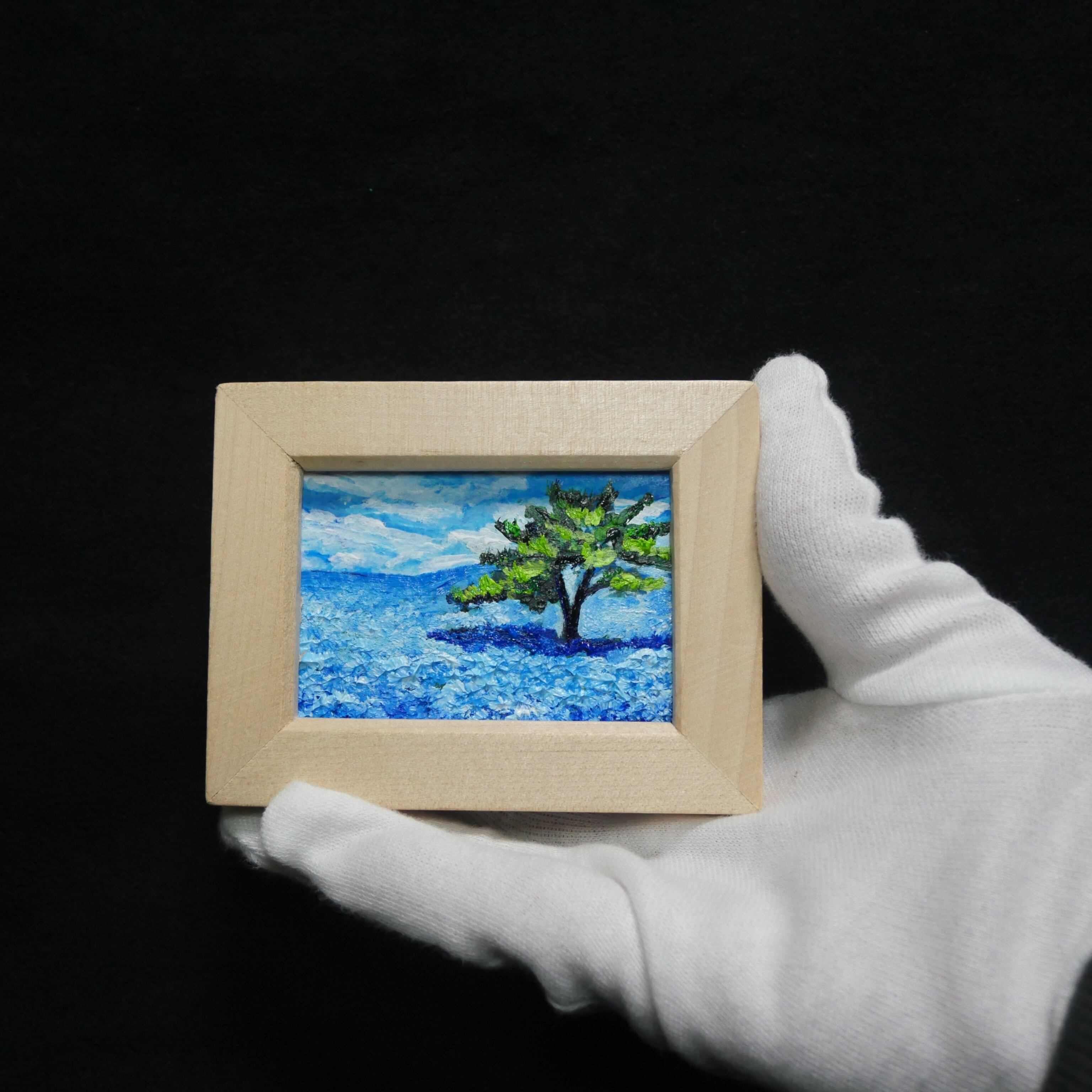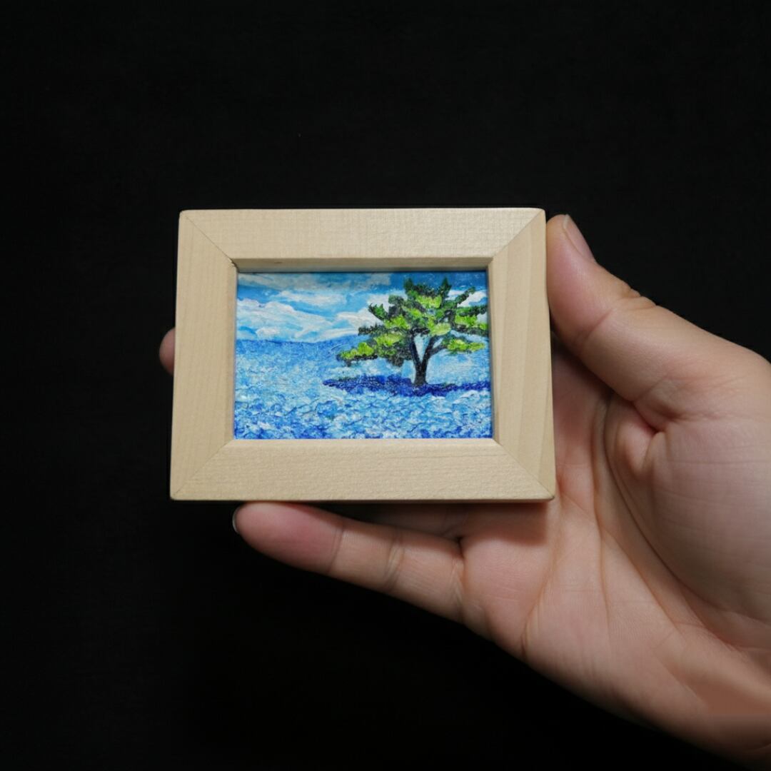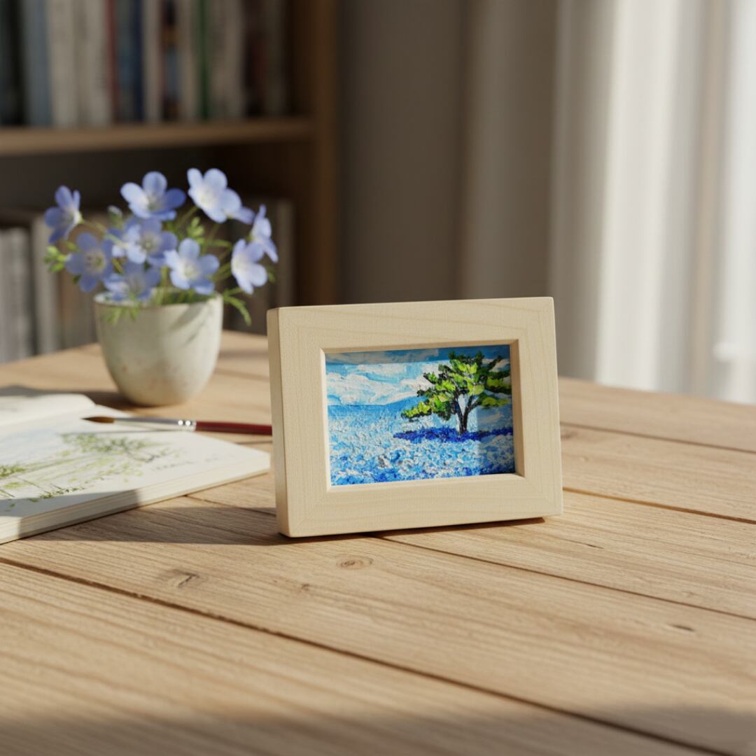 「ネモフィラの丘」は、心を洗う爽やかな青の世界が広がる特別なミニ絵画です。横10cm、縦7.7cm、厚さ1cmというコンパクトなサイズながらも、画面いっぱいに描かれた可憐なネモフィラの花々が、春の光を浴びた丘に立つ感覚を呼び起こします。特に、青い花々に囲まれる一本の木の姿は、見る者に力強さと安心感を与え、「自分らしくいていい」と語りかけているようです。