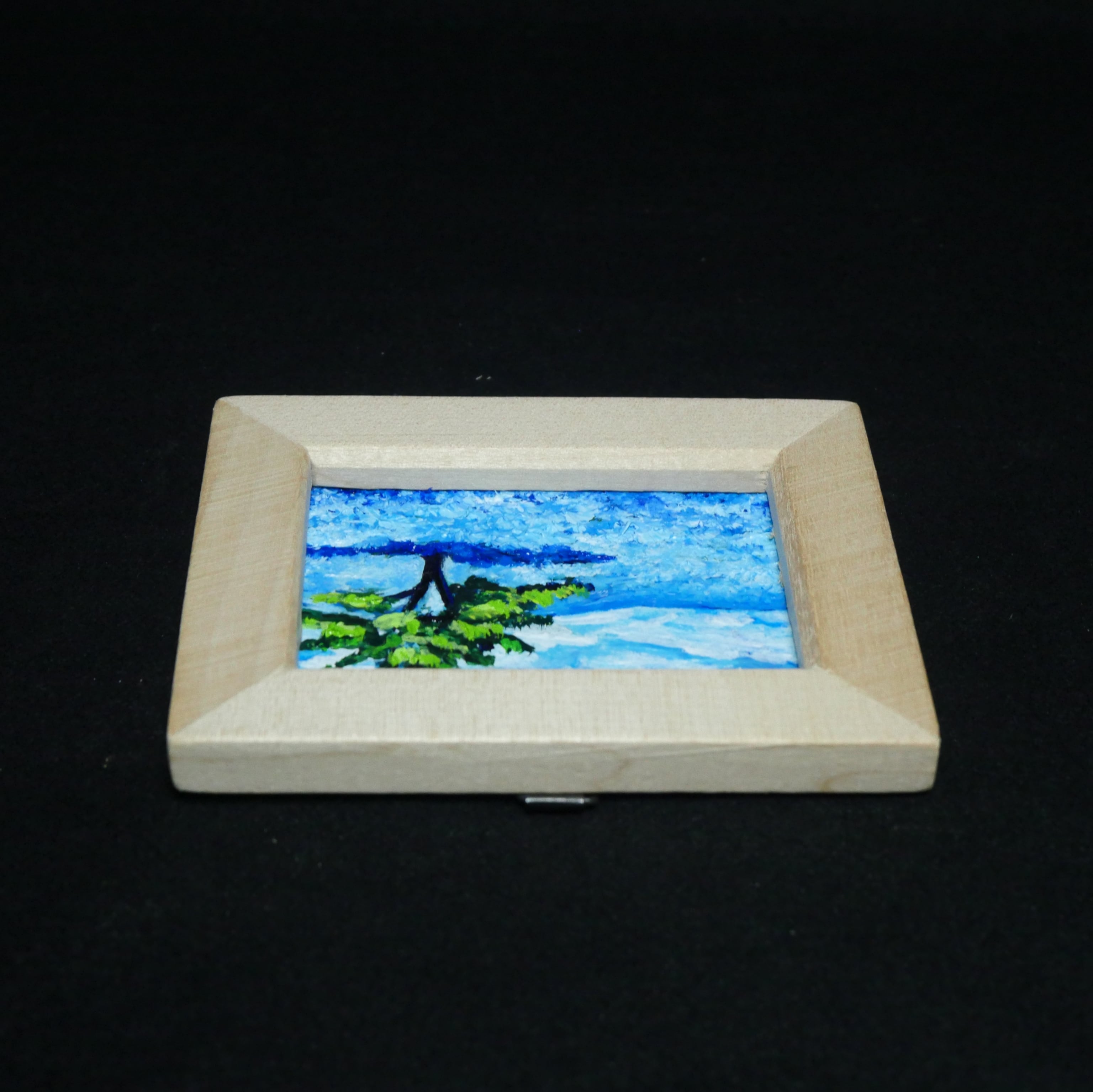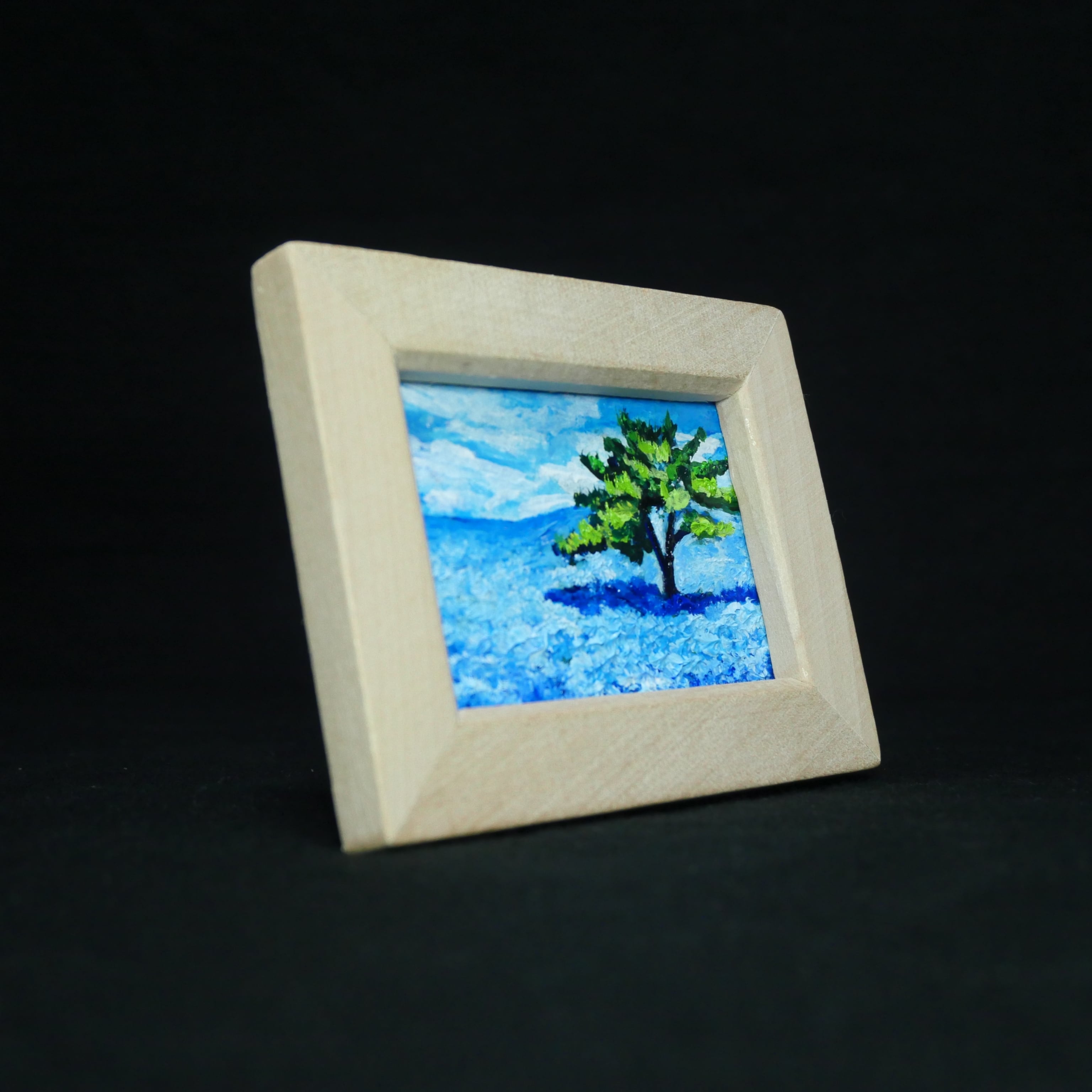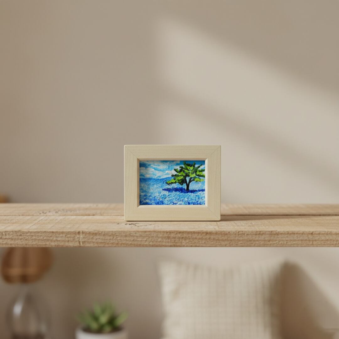 「ネモフィラの丘」は、心を洗う爽やかな青の世界が広がる特別なミニ絵画です。横10cm、縦7.7cm、厚さ1cmというコンパクトなサイズながらも、画面いっぱいに描かれた可憐なネモフィラの花々が、春の光を浴びた丘に立つ感覚を呼び起こします。特に、青い花々に囲まれる一本の木の姿は、見る者に力強さと安心感を与え、「自分らしくいていい」と語りかけているようです。