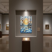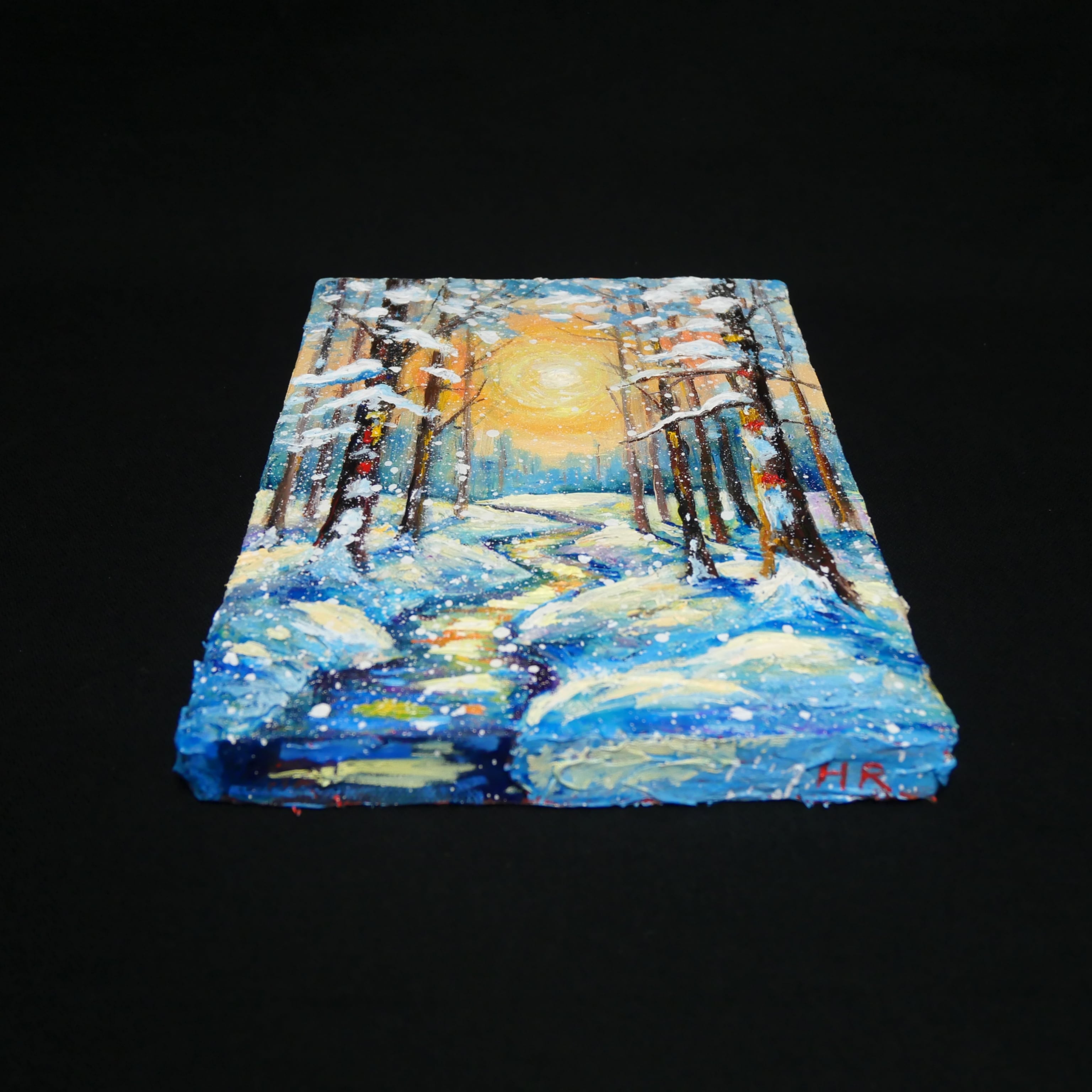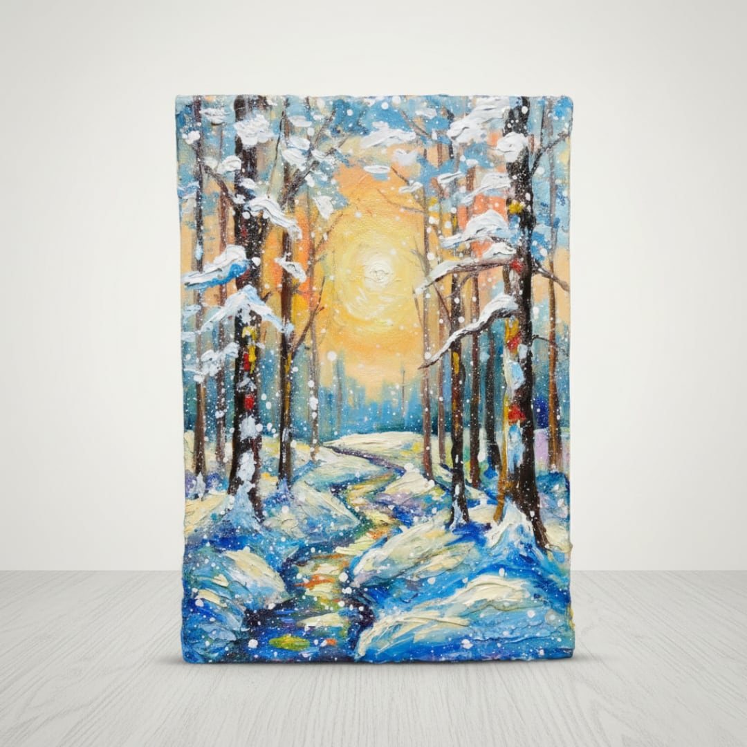 森に続く小川の流れは、光を反射しながら蛇行し、静止した冬の風景の中に生命の躍動感を与えています。冷たい寒色と情熱的な暖色のコントラストが、冬という季節の美しさを際立たせ、厳しい冬の先に必ず訪れる春の兆しを予感させる作品です。