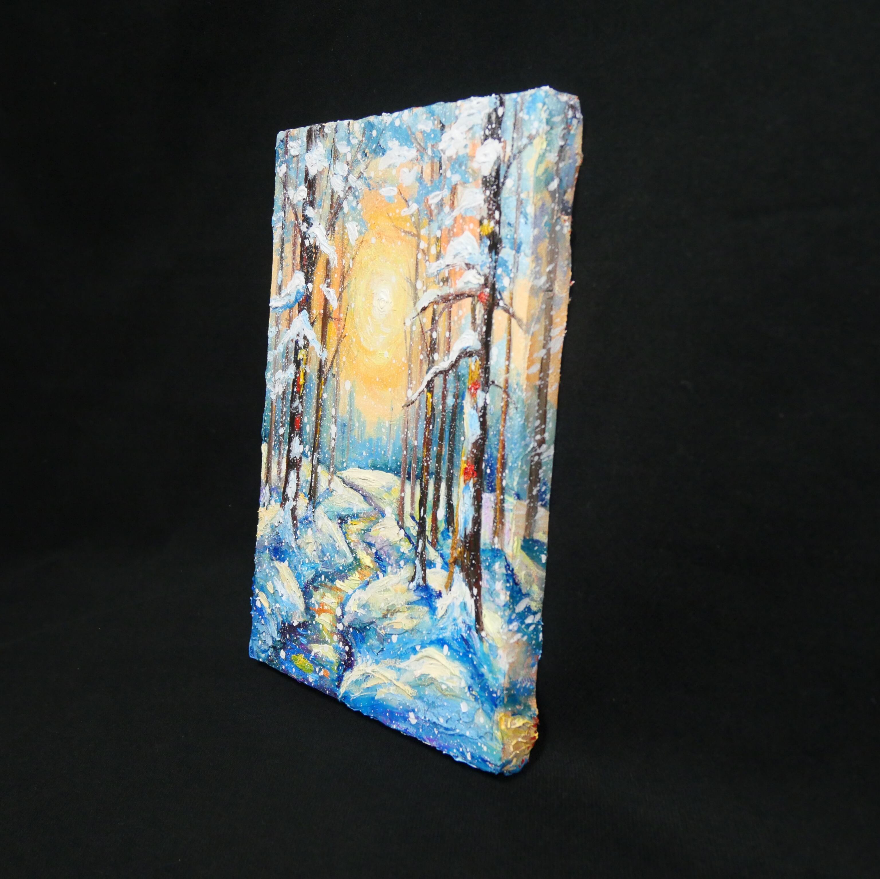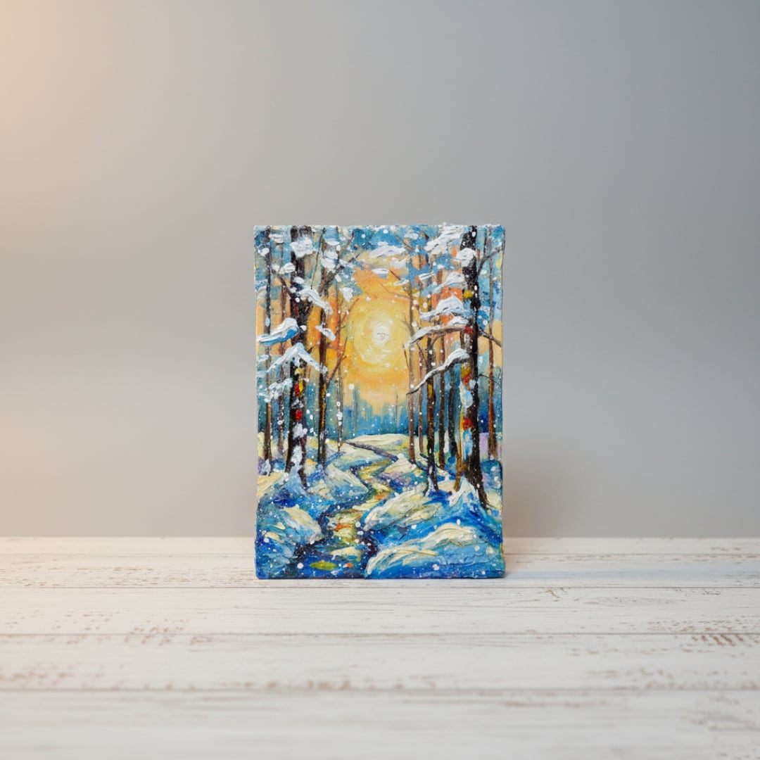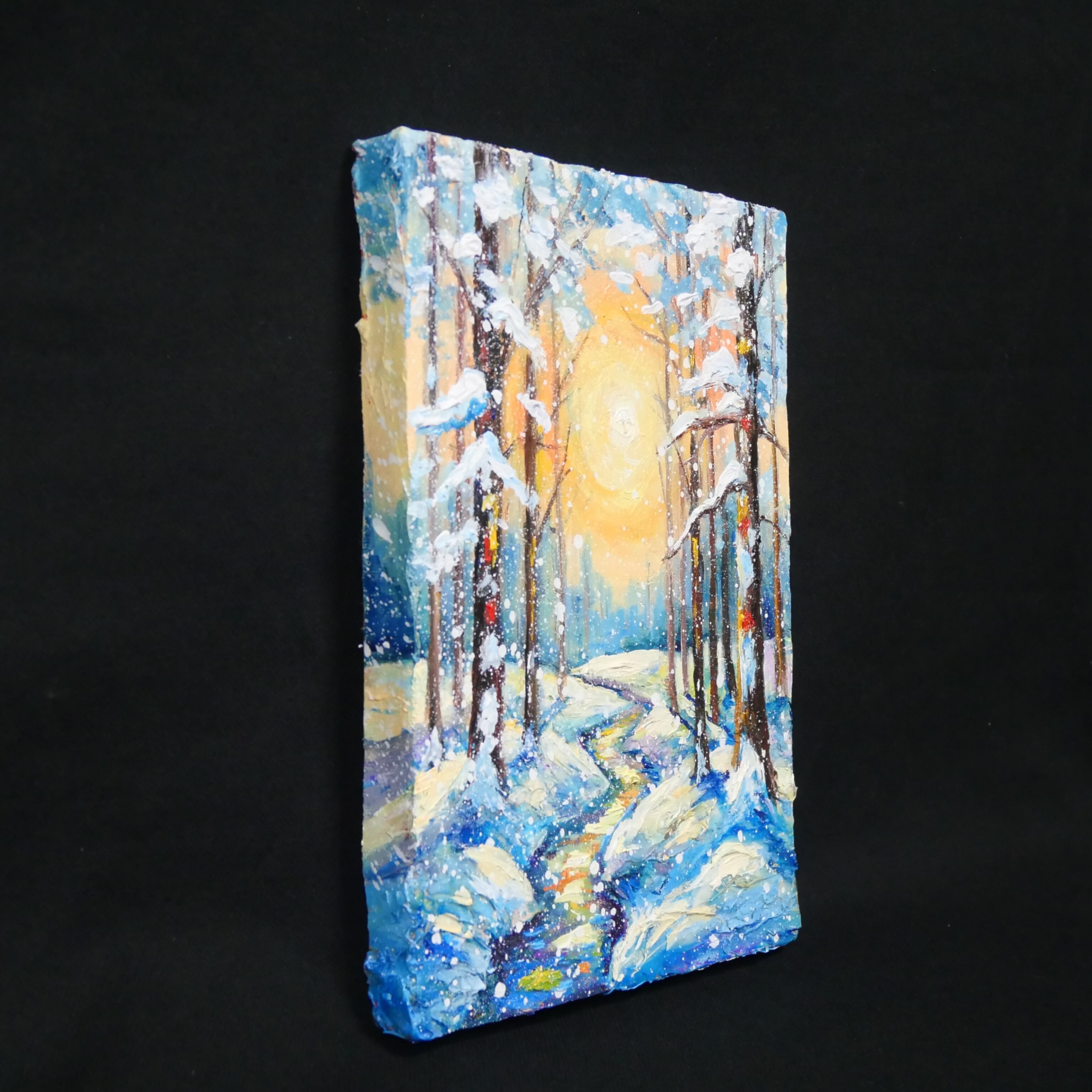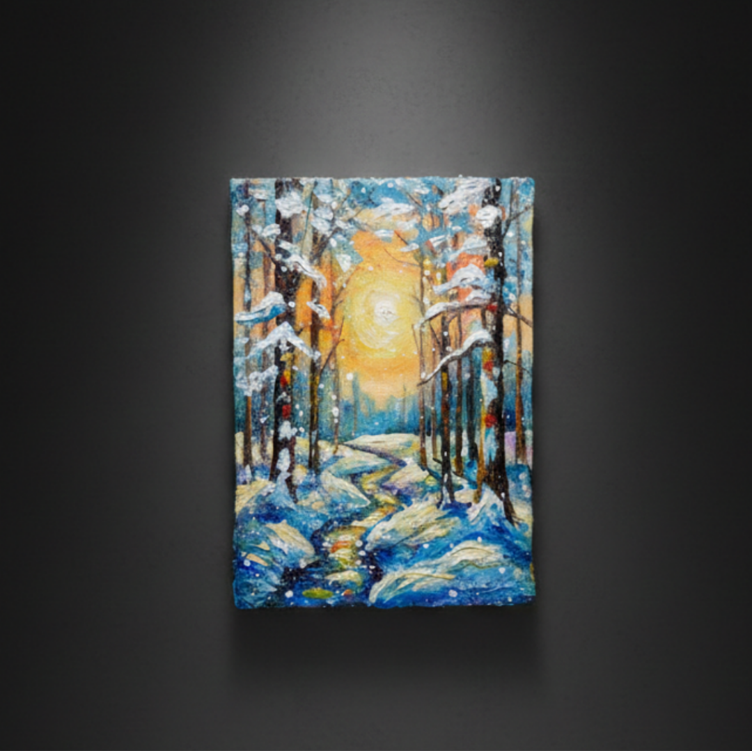 本作品の特筆すべきポイントは、油彩ならではの厚塗り技法による重厚感と立体感です。太陽の光は、ただの色に留まらず、見る者にその熱が伝わってくるかのような力強さを持っています。この光が雪に反射し、冷たい白や青の景色に暖かなニュアンスを添え、全体の調和を生み出しています。また、雪を頂いた木立の描写は見事で、白く積もった雪が生き物のように枝を覆い、その背後には光の粒子がさりげなく散りばめられています。