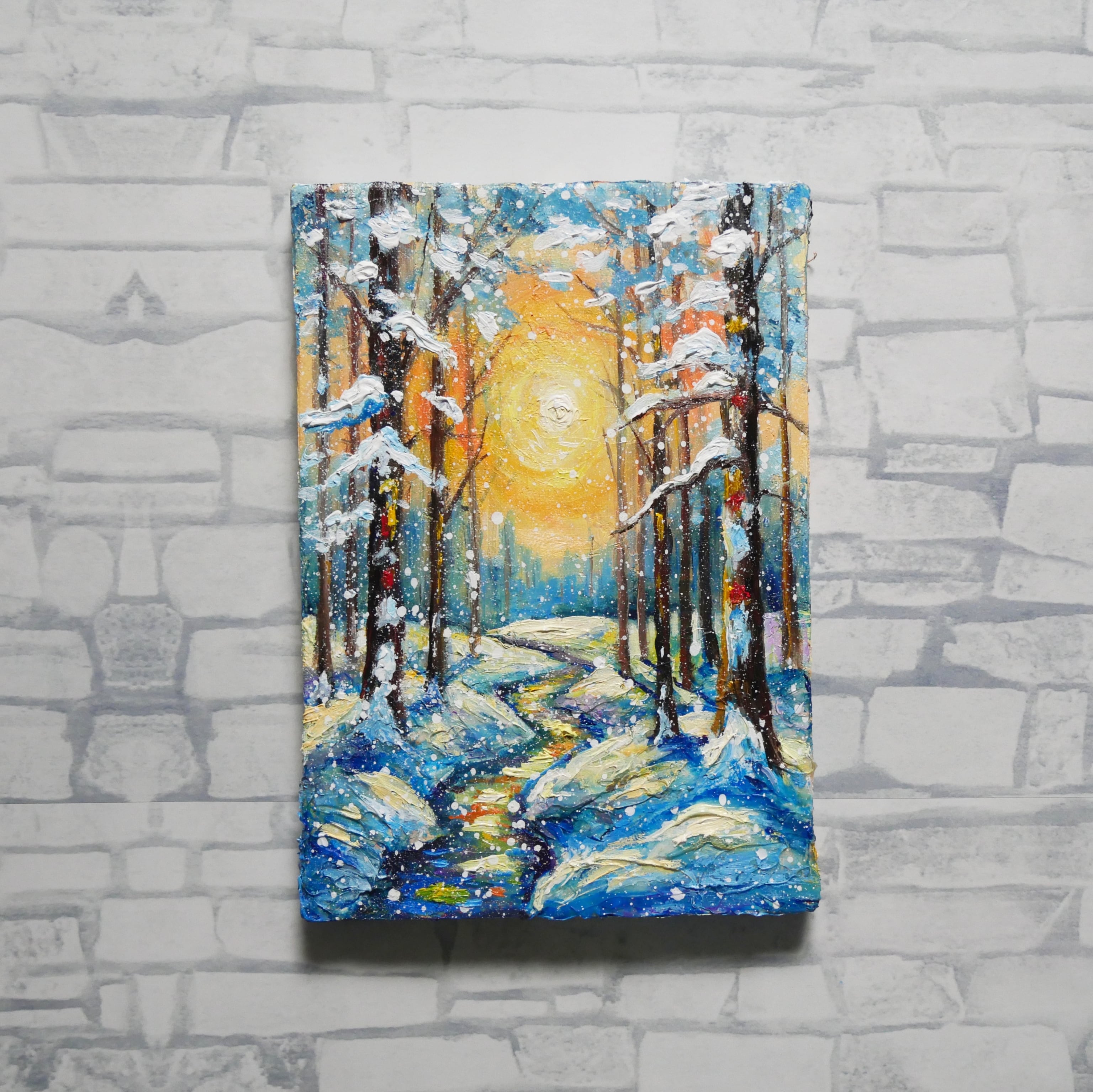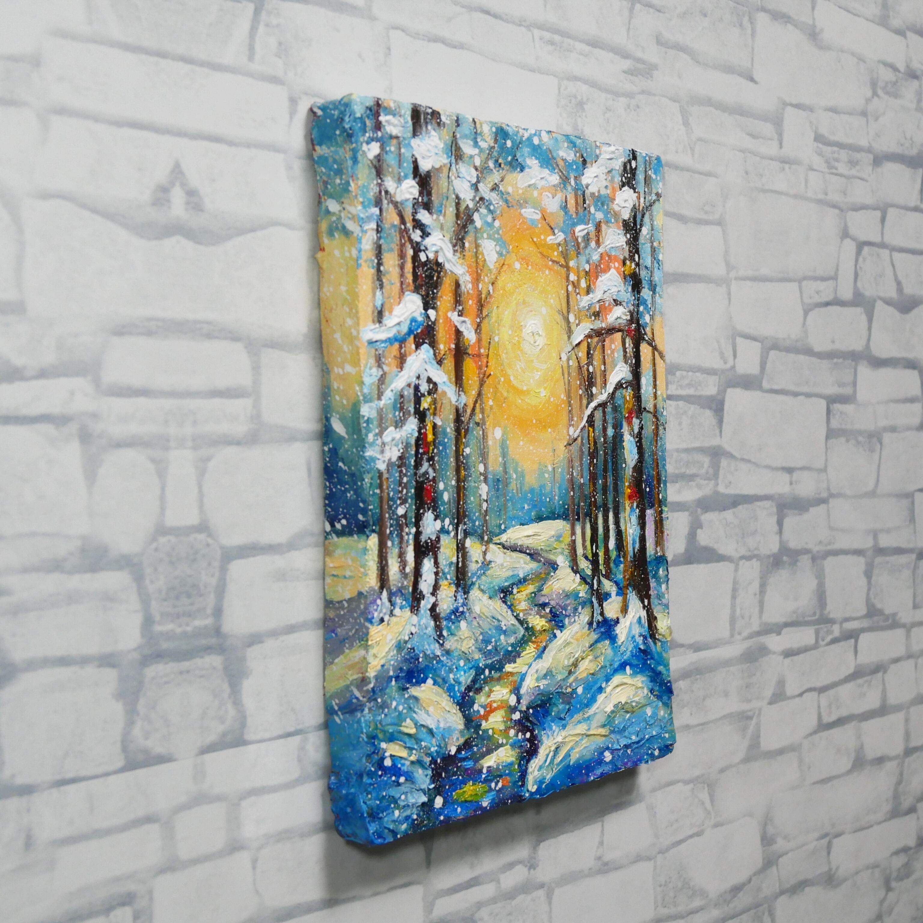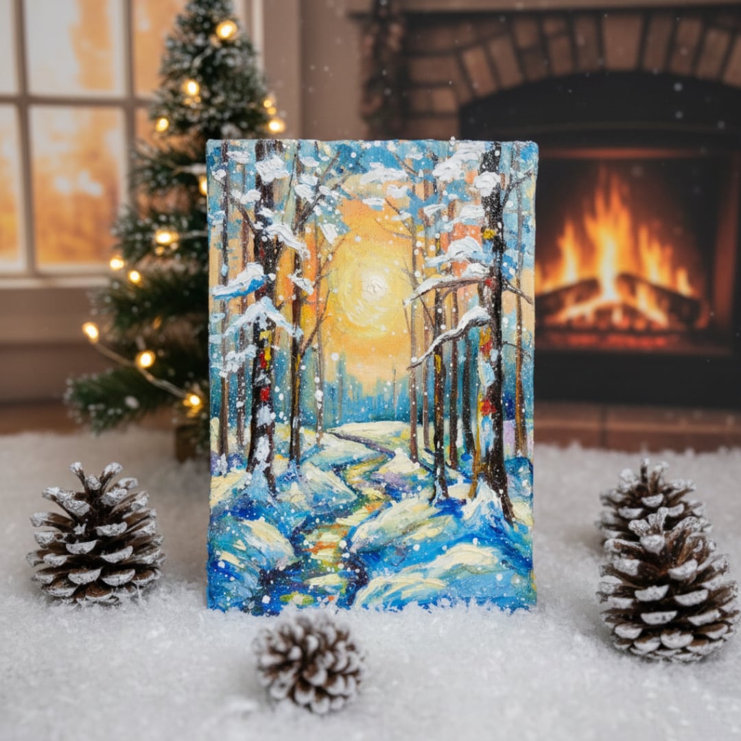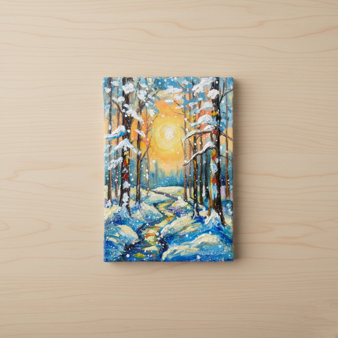 本作品の特筆すべきポイントは、油彩ならではの厚塗り技法による重厚感と立体感です。太陽の光は、ただの色に留まらず、見る者にその熱が伝わってくるかのような力強さを持っています。この光が雪に反射し、冷たい白や青の景色に暖かなニュアンスを添え、全体の調和を生み出しています。また、雪を頂いた木立の描写は見事で、白く積もった雪が生き物のように枝を覆い、その背後には光の粒子がさりげなく散りばめられています。