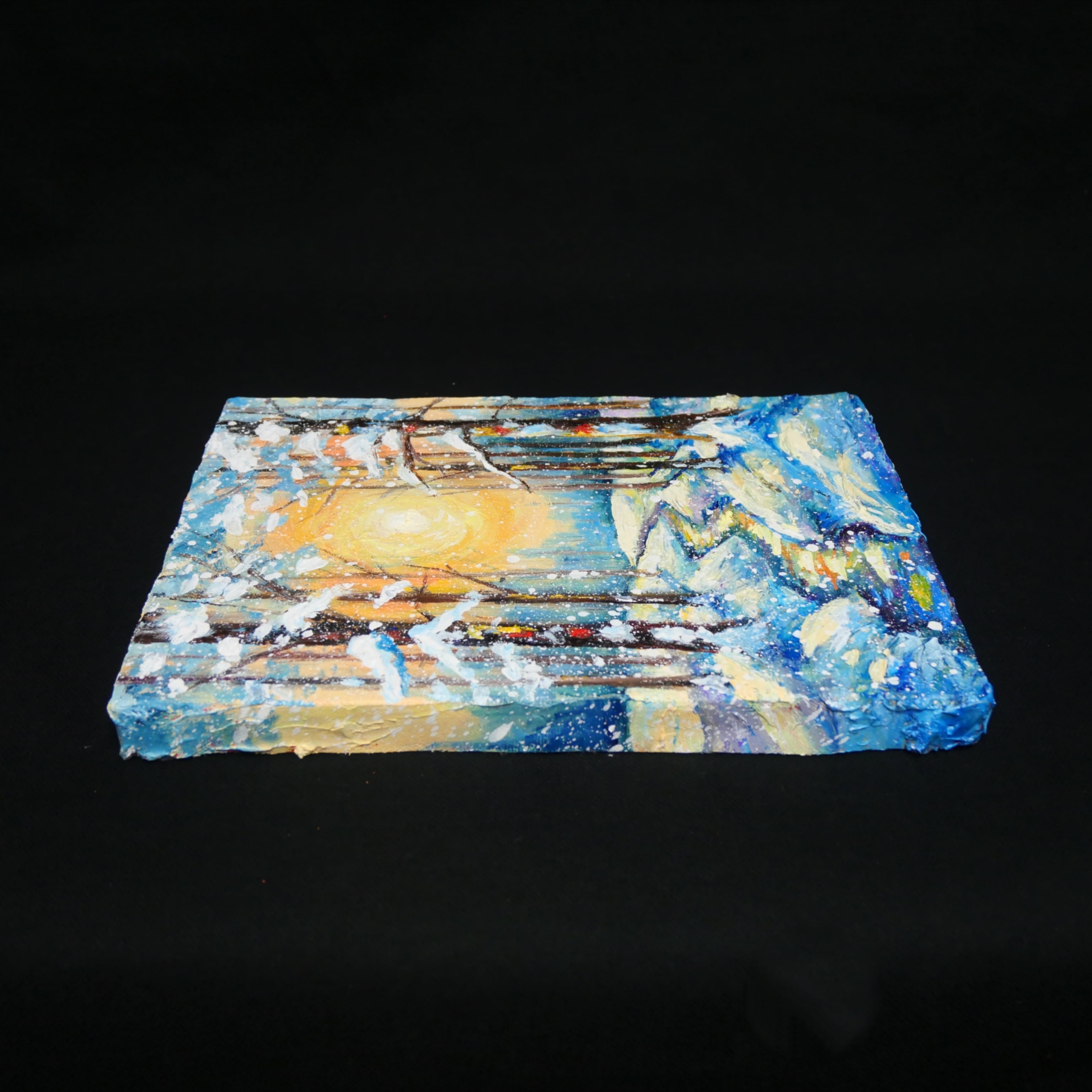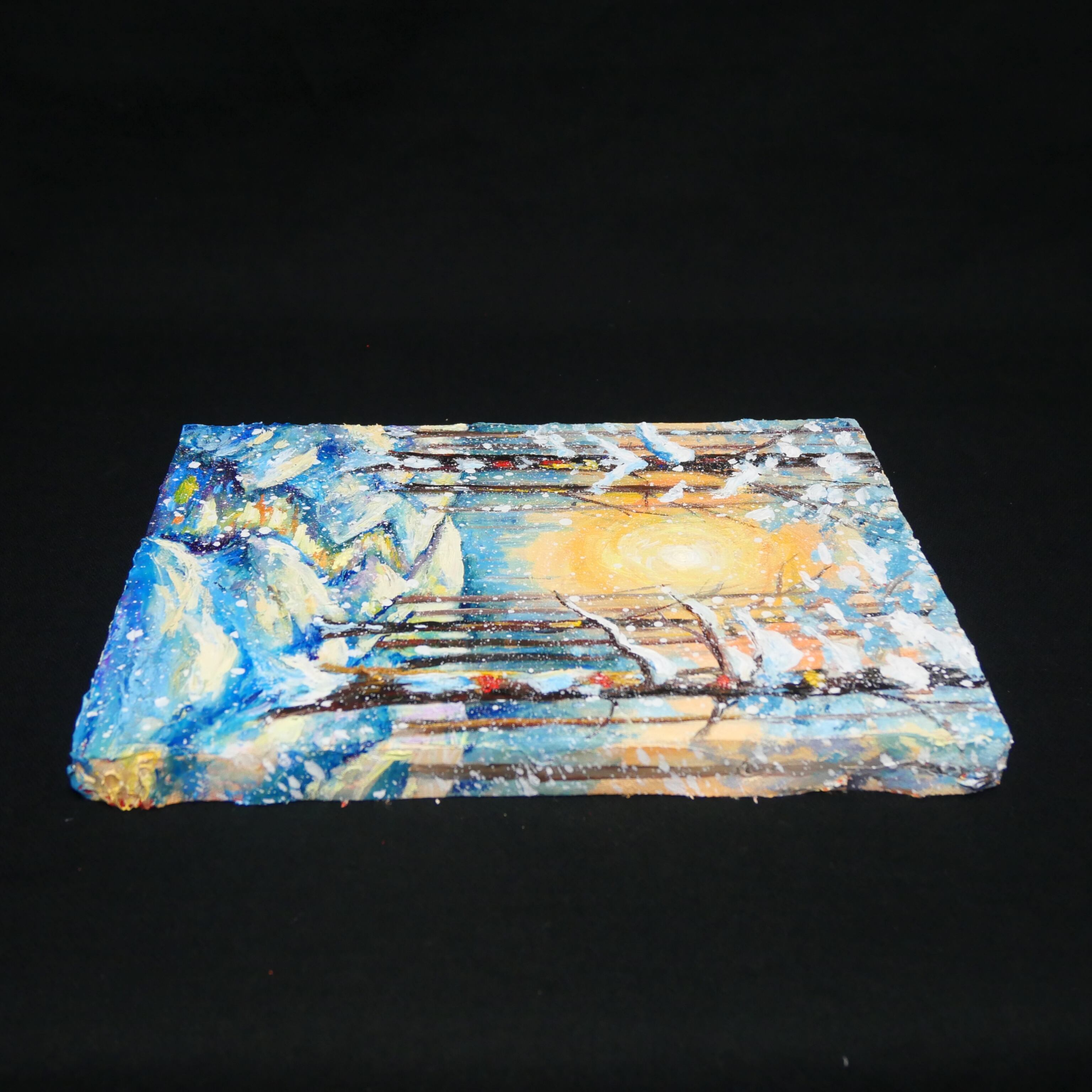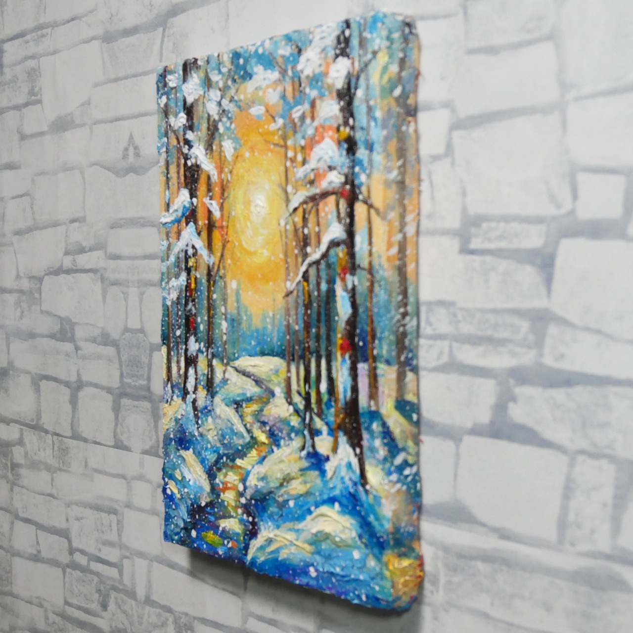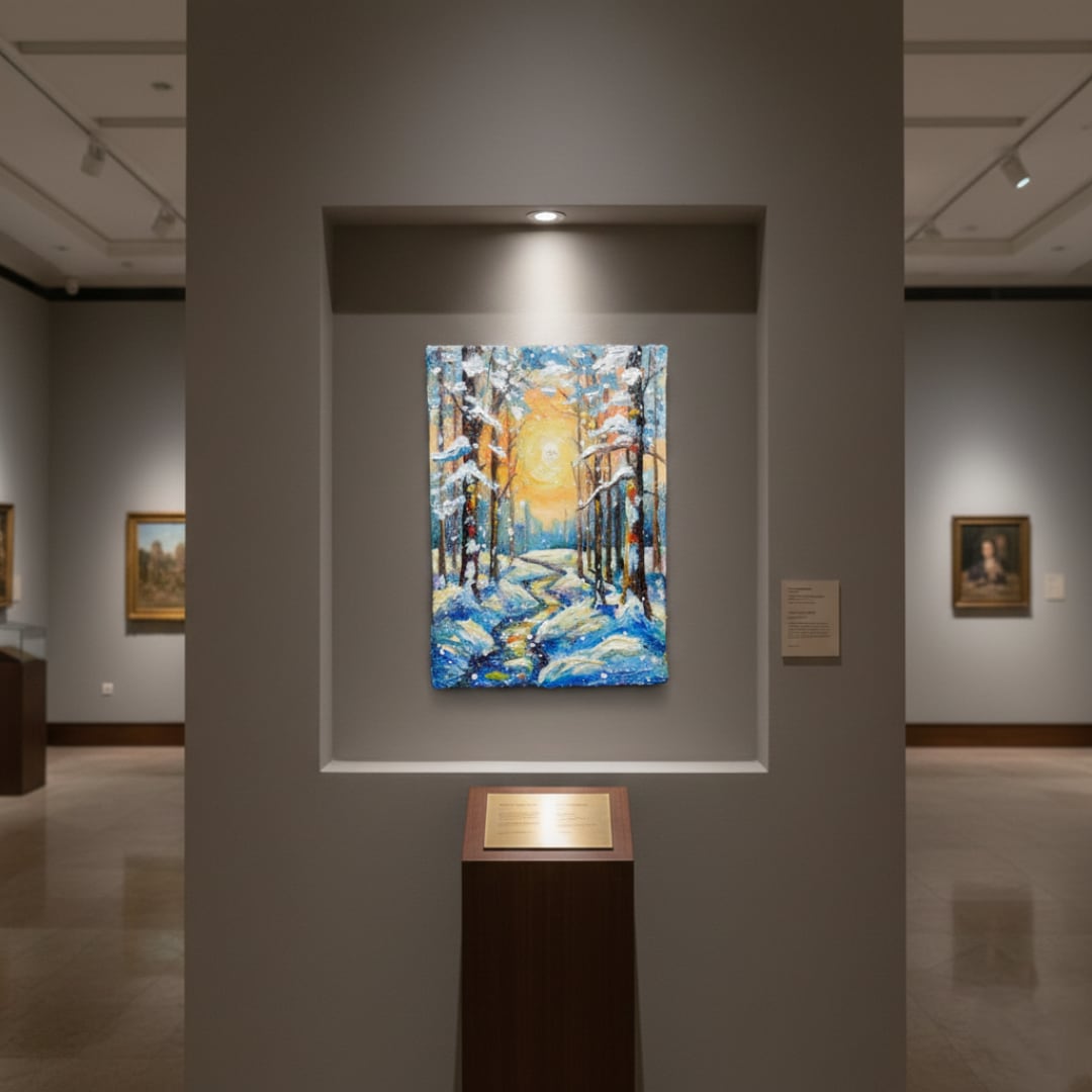 本作品の特筆すべきポイントは、油彩ならではの厚塗り技法による重厚感と立体感です。太陽の光は、ただの色に留まらず、見る者にその熱が伝わってくるかのような力強さを持っています。この光が雪に反射し、冷たい白や青の景色に暖かなニュアンスを添え、全体の調和を生み出しています。また、雪を頂いた木立の描写は見事で、白く積もった雪が生き物のように枝を覆い、その背後には光の粒子がさりげなく散りばめられています。