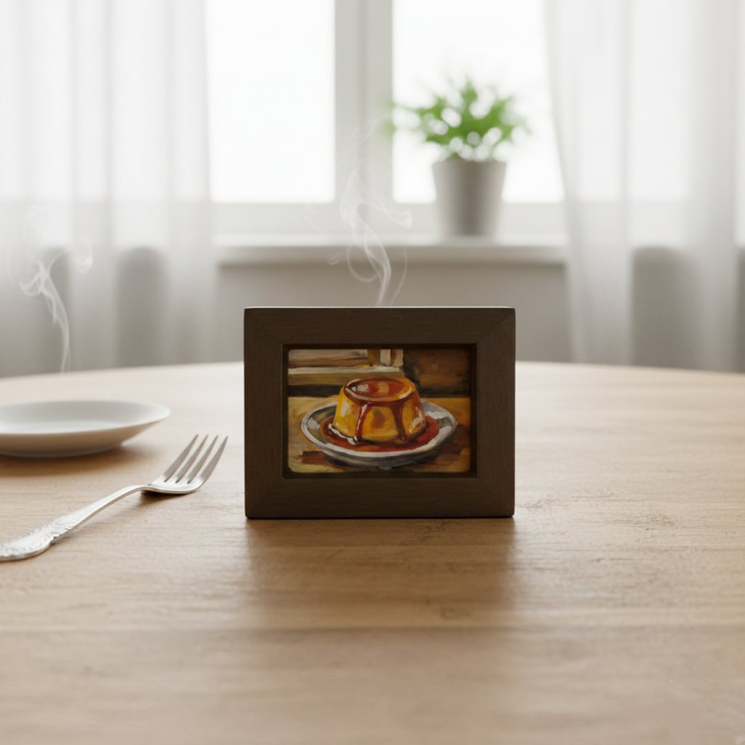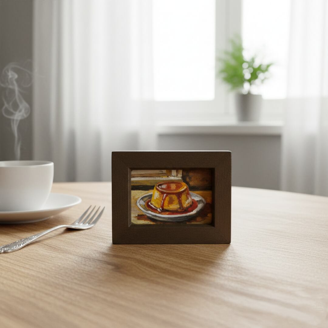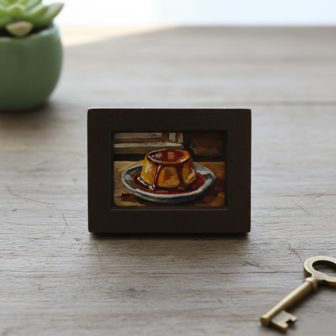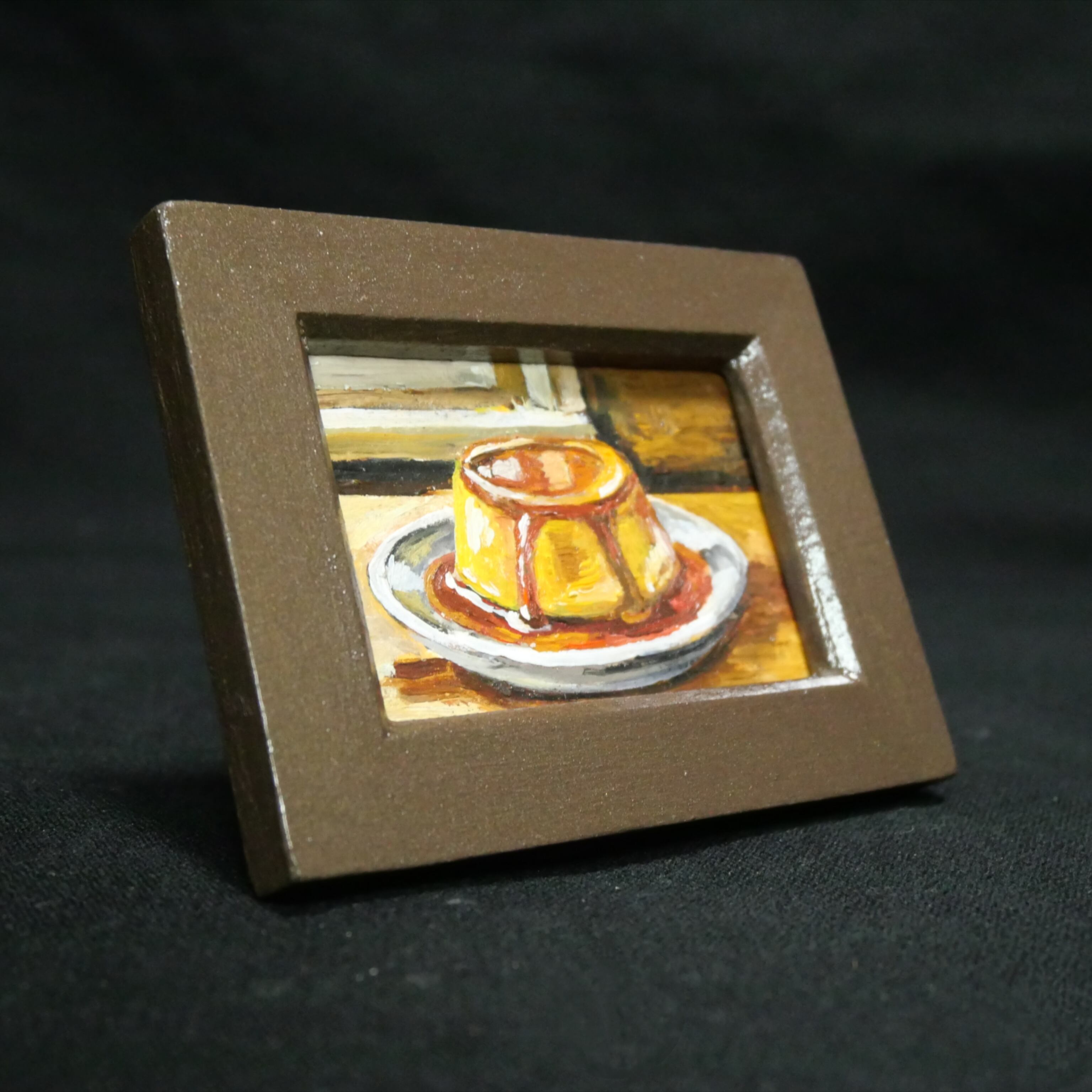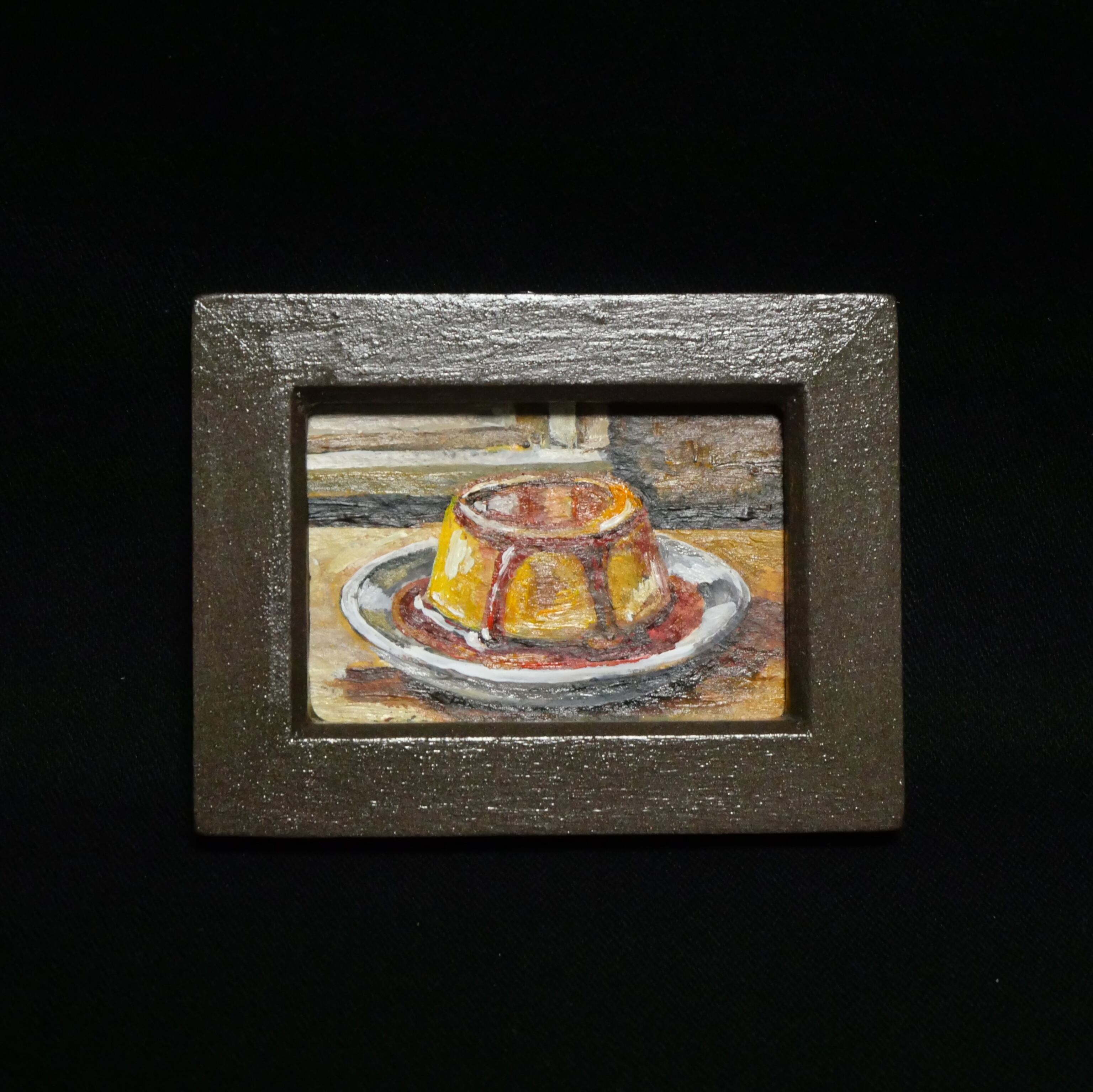 「プリン」は、小さな額縁に閉じ込められた、贅沢なひとときをお届けする特別なミニ絵画です。この作品は、プリンの表面に滴るキャラメルソースの艶やかな表現に始まり、見る人の目を惹きつけ、心を癒やします。油彩ならではの重厚な絵具の重なりは、ソースの粘り気や甘い香りを想像させ、リアルな質感を生み出しています。