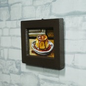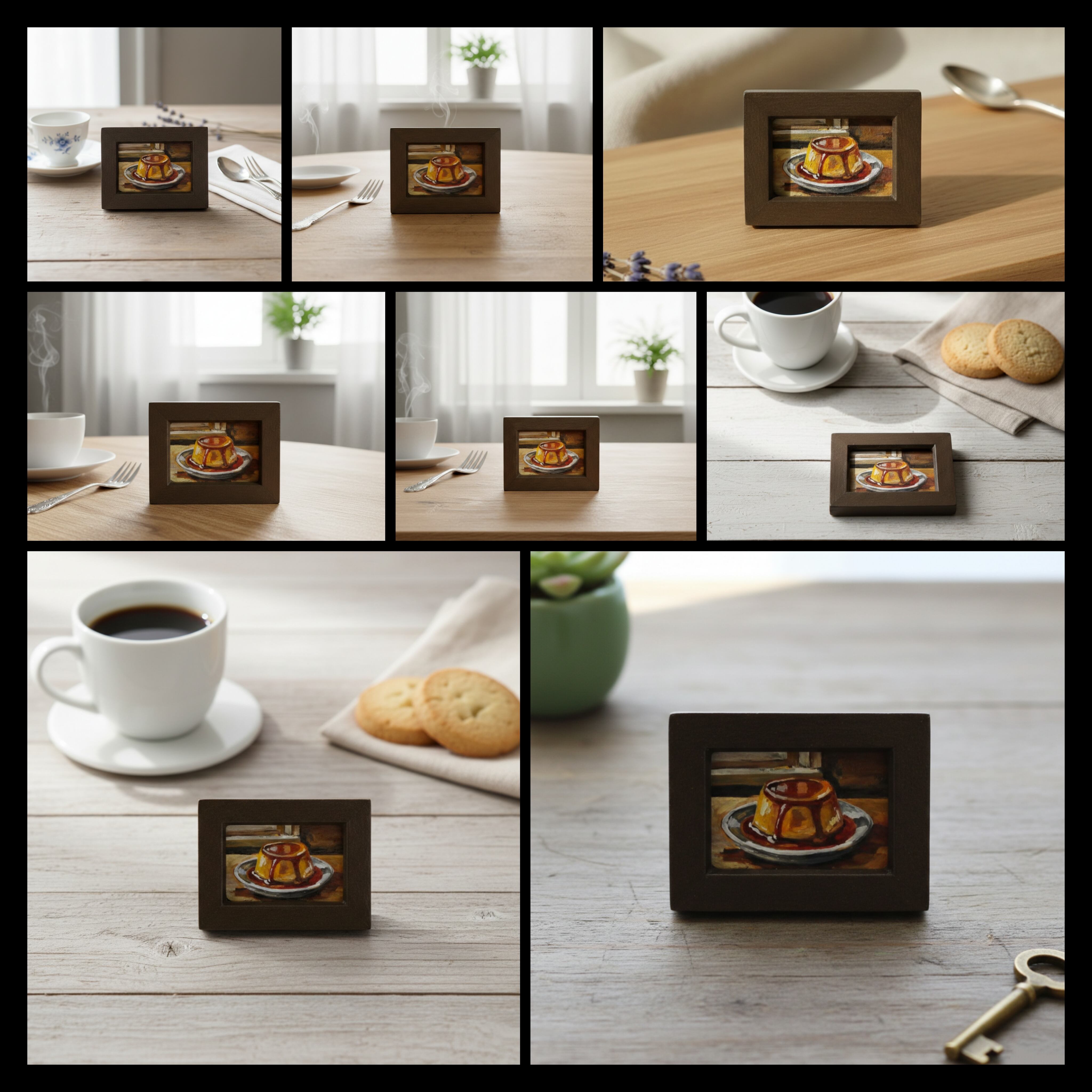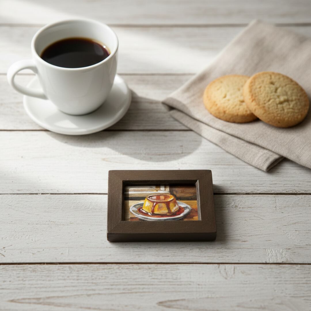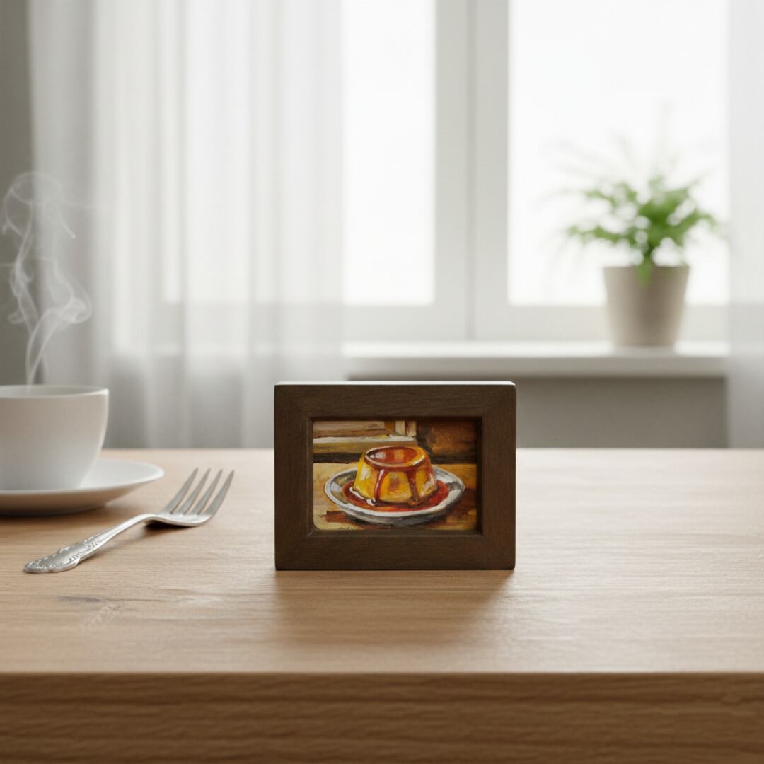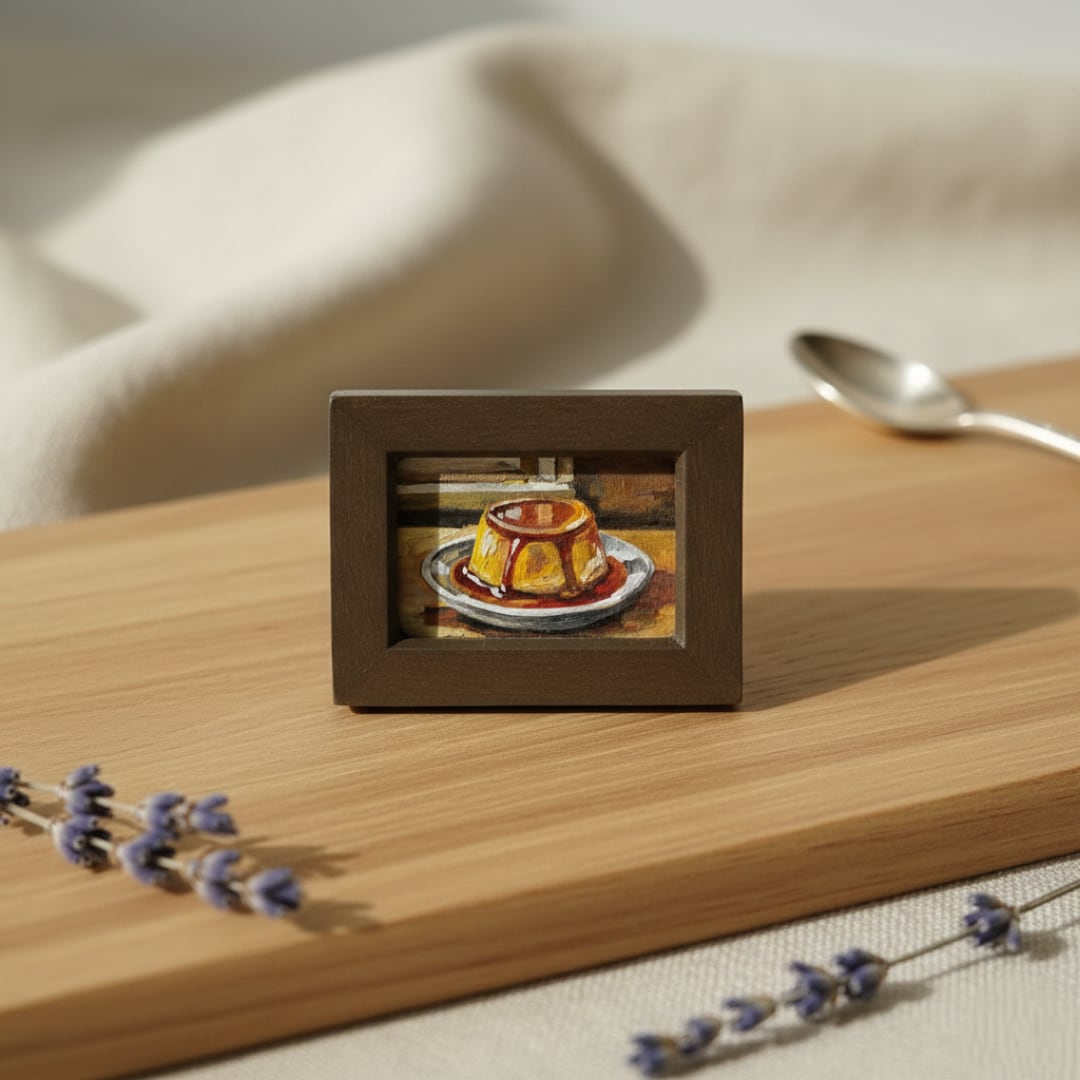 「プリン」は、小さな額縁に閉じ込められた、贅沢なひとときをお届けする特別なミニ絵画です。この作品は、プリンの表面に滴るキャラメルソースの艶やかな表現に始まり、見る人の目を惹きつけ、心を癒やします。油彩ならではの重厚な絵具の重なりは、ソースの粘り気や甘い香りを想像させ、リアルな質感を生み出しています。