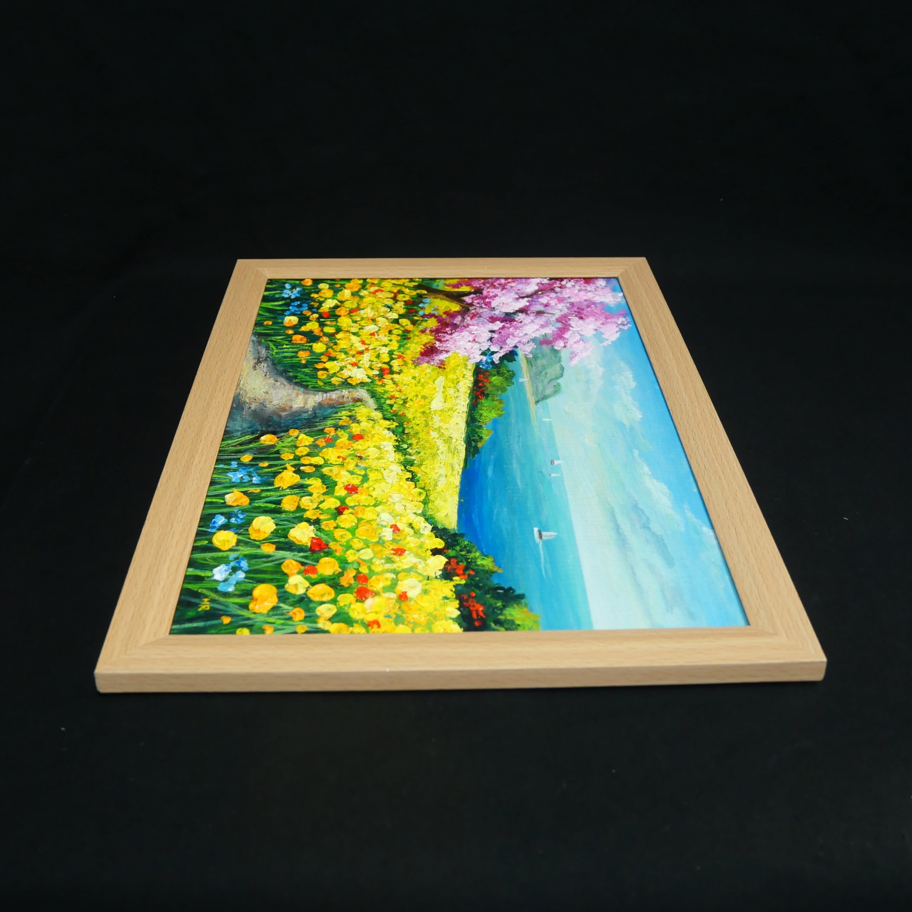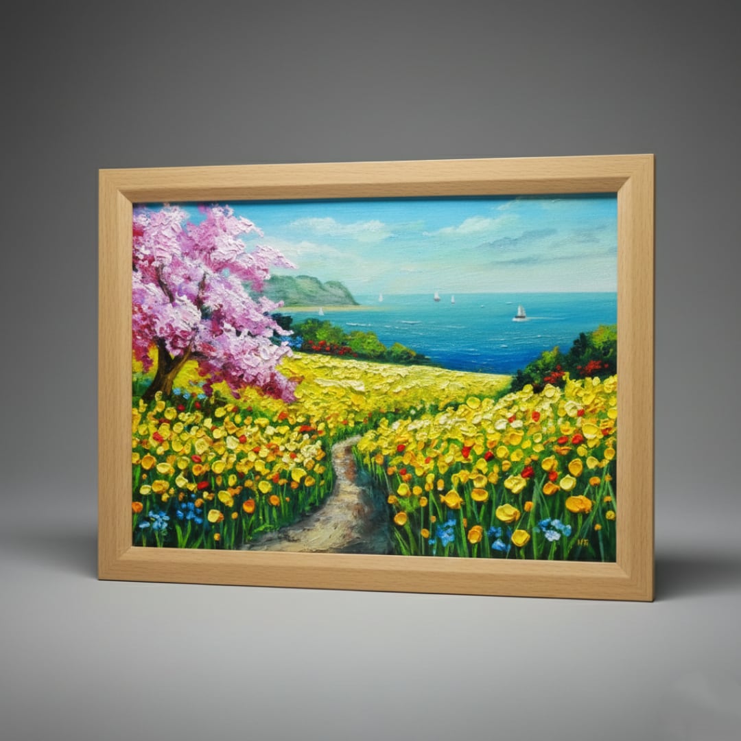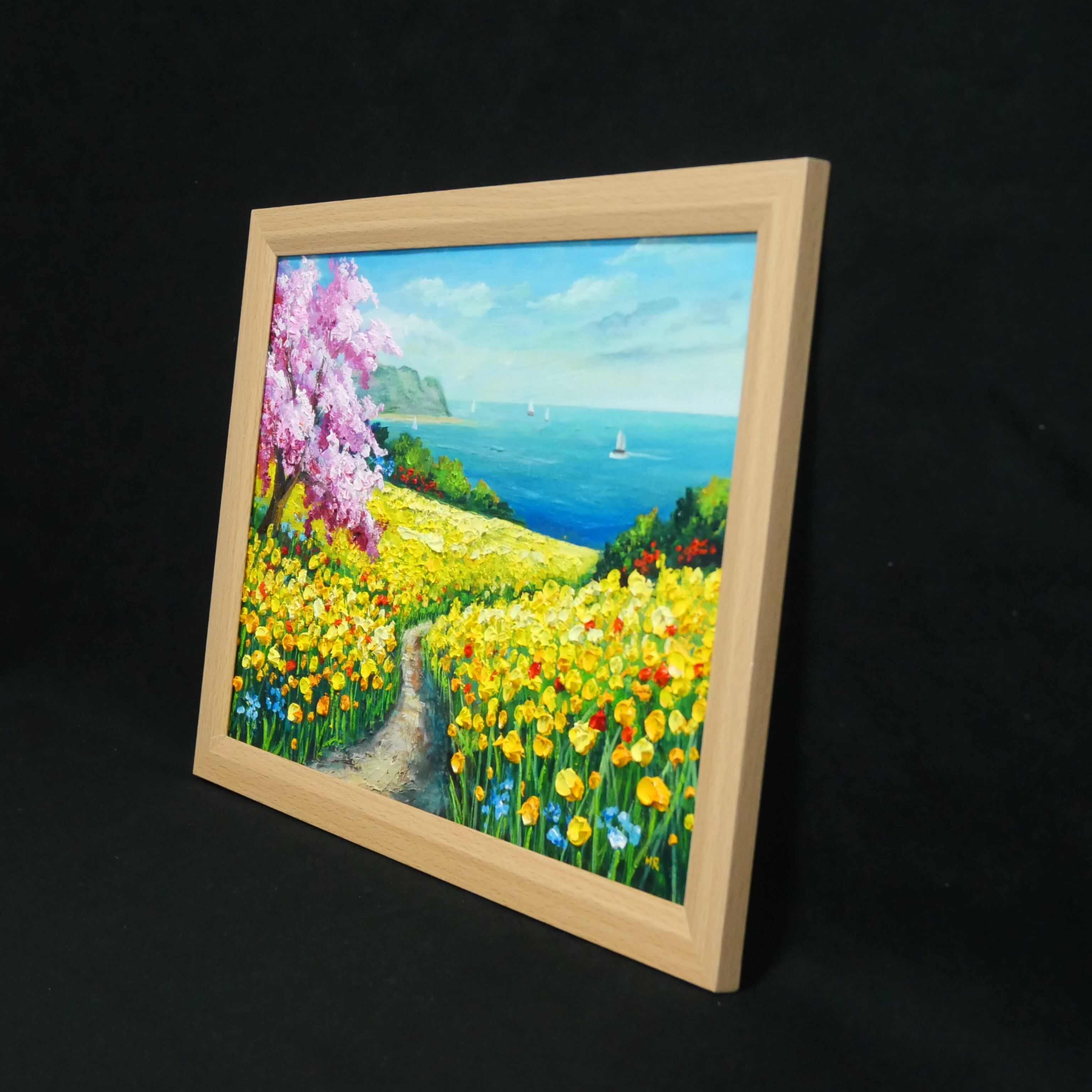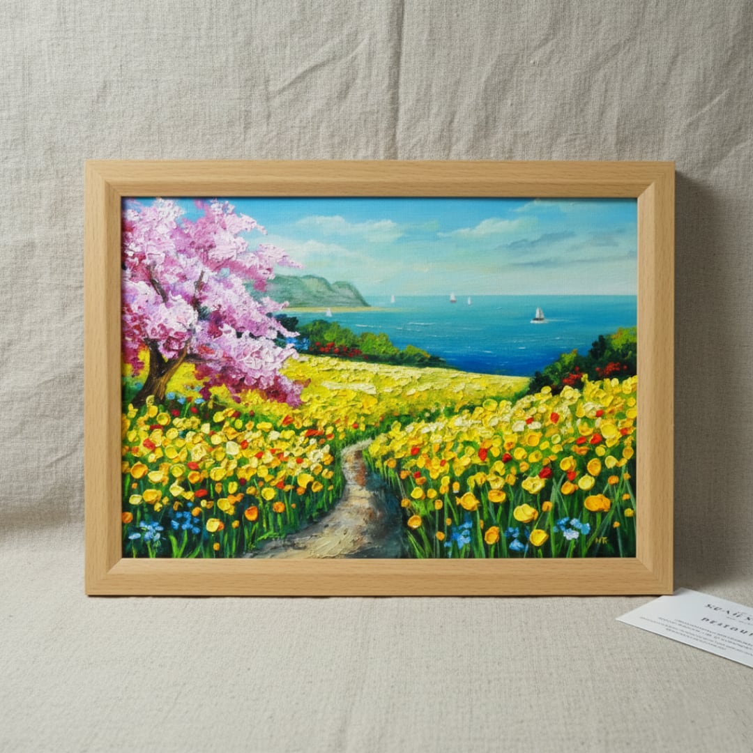 この絵を眺めていると、春の柔らかな日差しと潮風の香りが伝わってくるような、瑞々しくも温かい癒しの空間が見事に表現されています。お部屋に飾ることで、日常に彩りを加える素敵なアート作品となるでしょう。