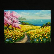 本作品の特筆すべきポイントは、桜の下から手前、そして奥へと広がる菜の花畑の鮮烈な黄色です。この明るい色合いは、希望に満ちたエネルギーを感じさせ、見る人の心にぱっと明かりを灯します。中央の小径を辿ると、抜けるような青空と深い藍色の海が広がり、遠くに浮かぶ白い帆船が静かな時間の流れを演出しています。海辺の切り立った崖の緑と空の淡い雲が奥行きを生み出し、まるで鑑賞者をこの穏やかな春の景色へと誘い込んでくれるかのようです。