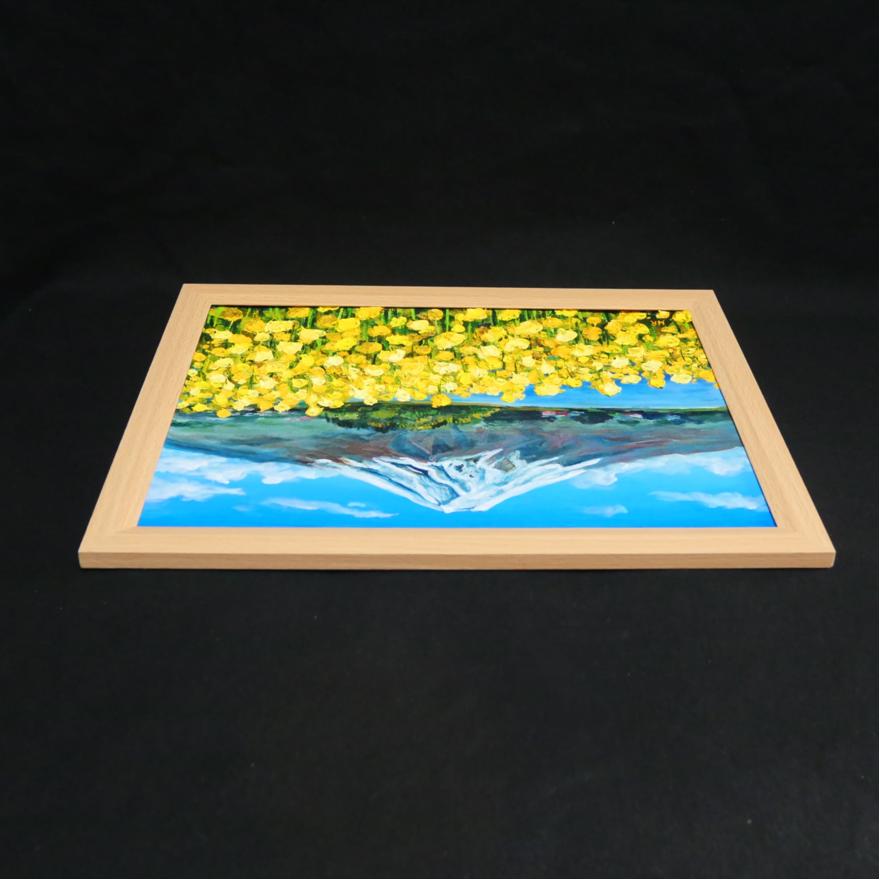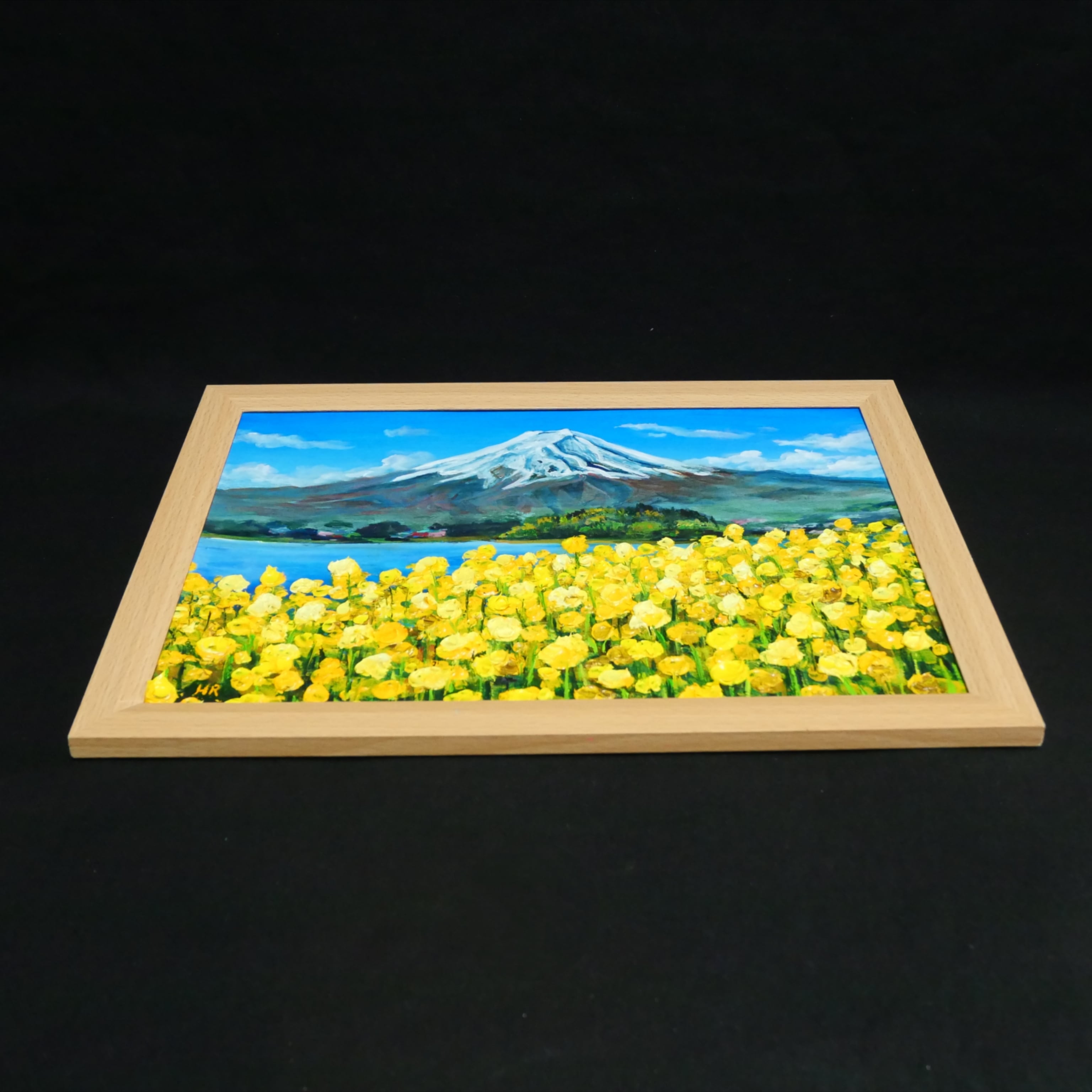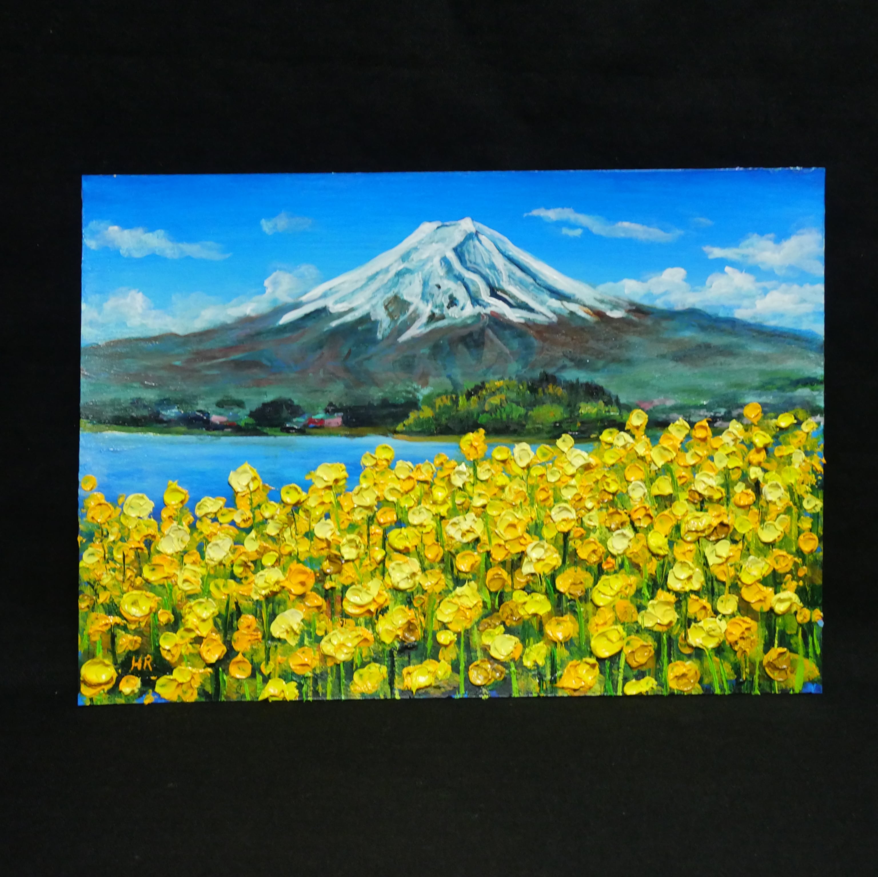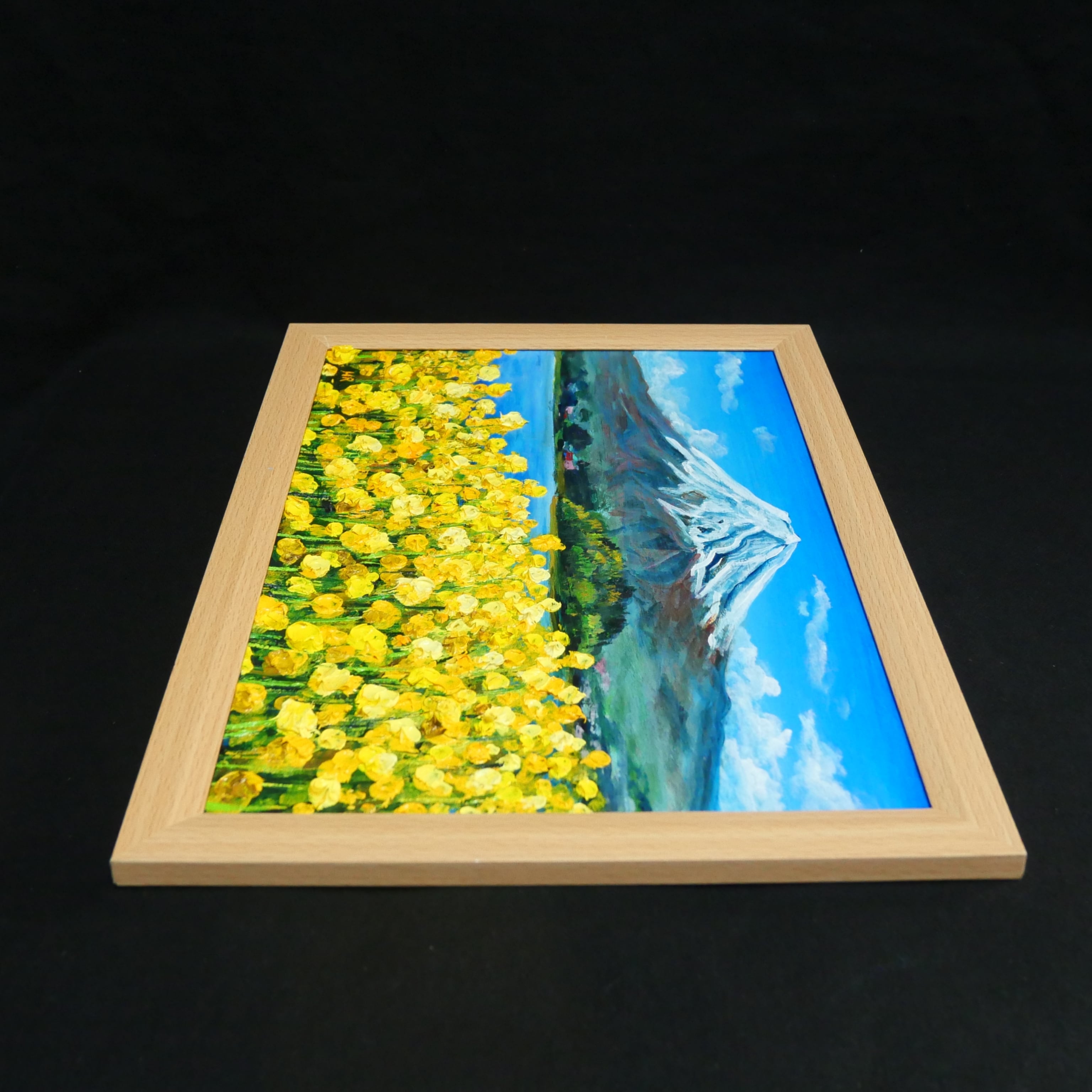 本作品の特筆すべきポイントは、動(菜の花)と静(富士山)が織り成す見事なコントラストです。青と黄色の色彩が心に希望と安らぎを届け、見る者を温かい思いで包み込みます。油彩特有の厚塗りにより、菜の花一輪一輪に立体感が与えられ、まるで実際の花畑が目の前に広がっているかのような臨場感があります。また、下から上へと視線を誘導する構図が、菜の花の密度と富士山の雄大さを強調しています。