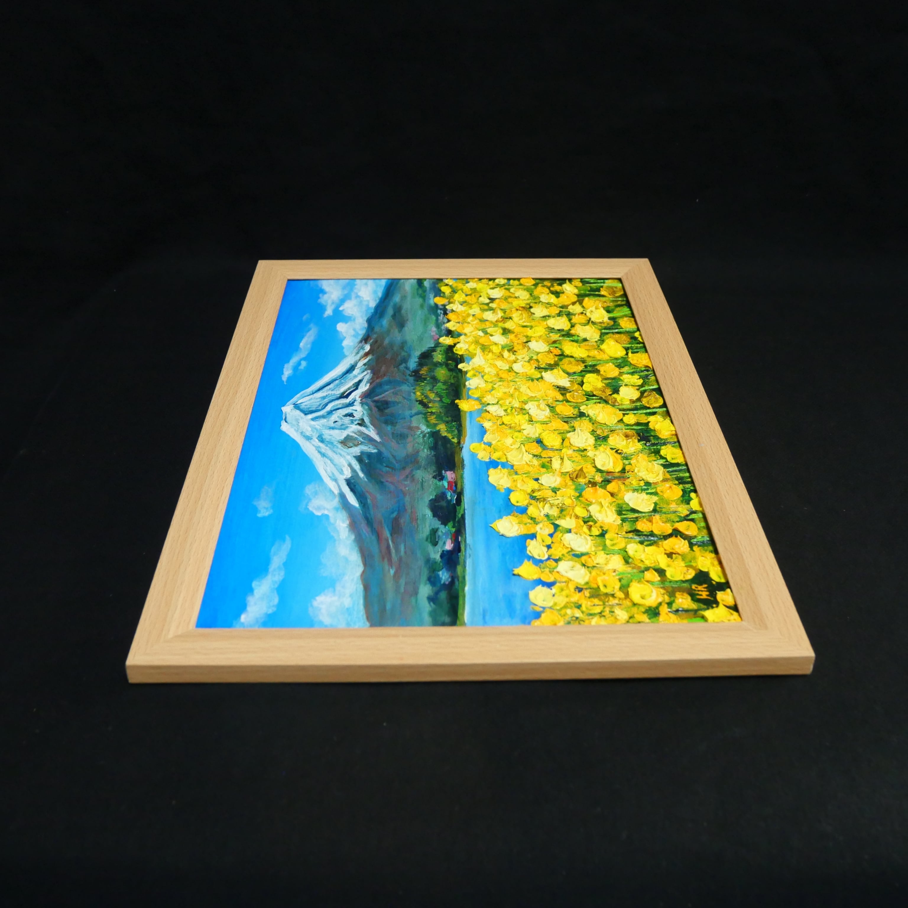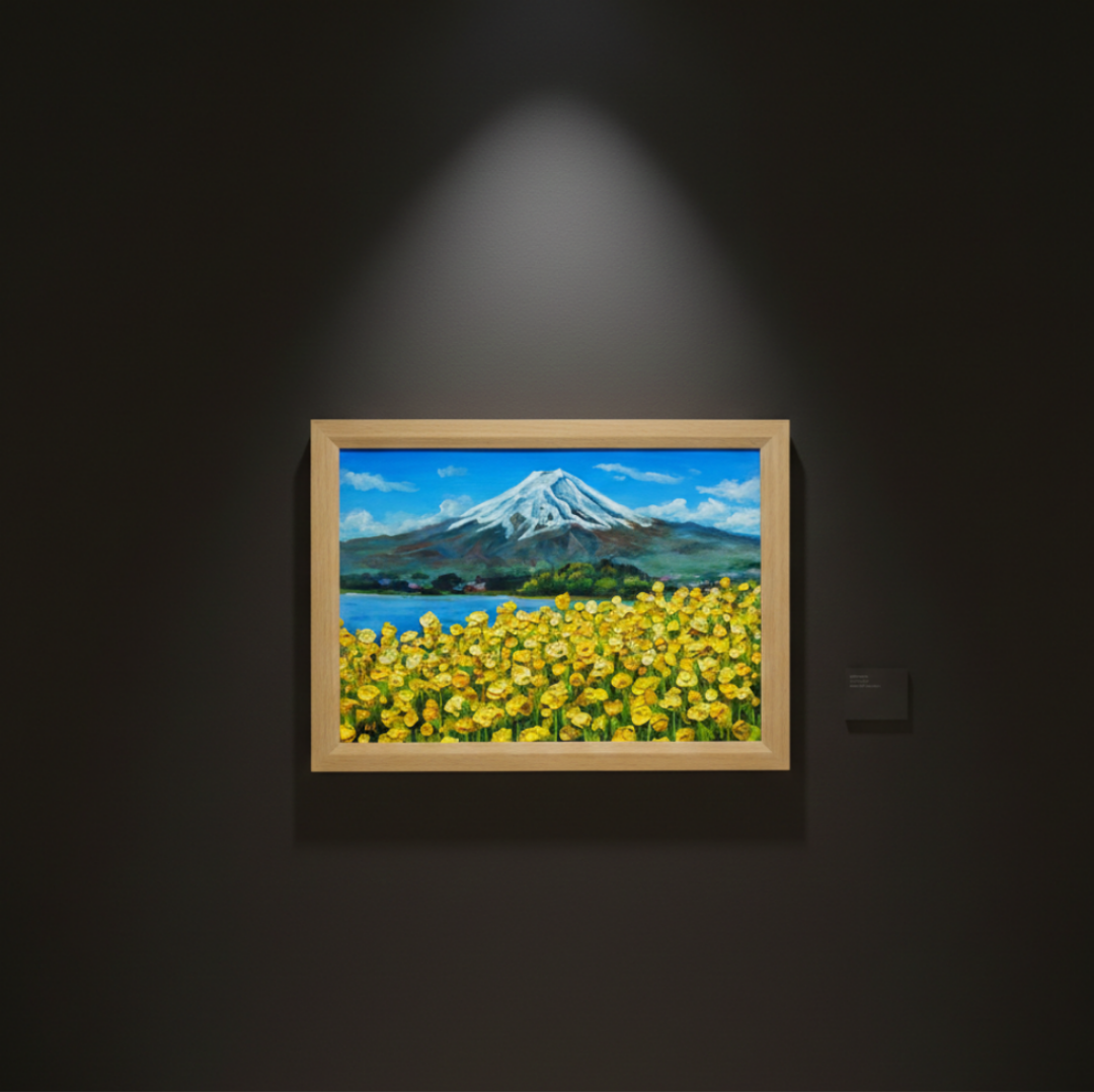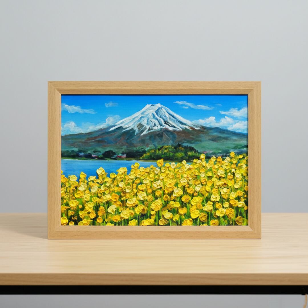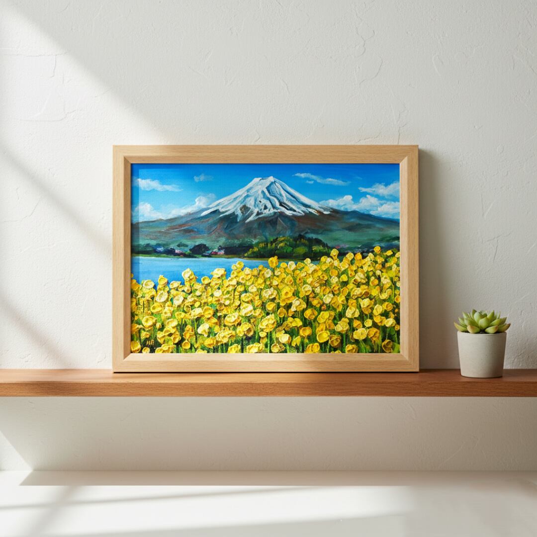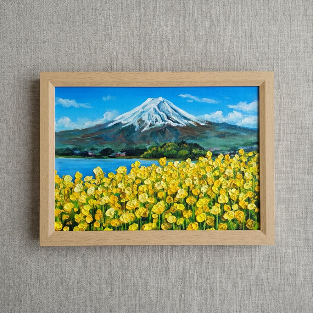 「春の息吹と、悠久の富士」は、春の柔らかな光と、菜の花の甘い香りが漂う感覚を見事に表現した特別な油絵です。画面いっぱいに広がる鮮烈な黄色は、冬の寒さを乗り越えて咲き誇る生命の力強さを感じさせ、見る者の心を打ちます。裏には悠然とした富士山が鎮座し、雪を戴いたその姿は神々しく、手前の可憐な花々を優しく見守っているようです。