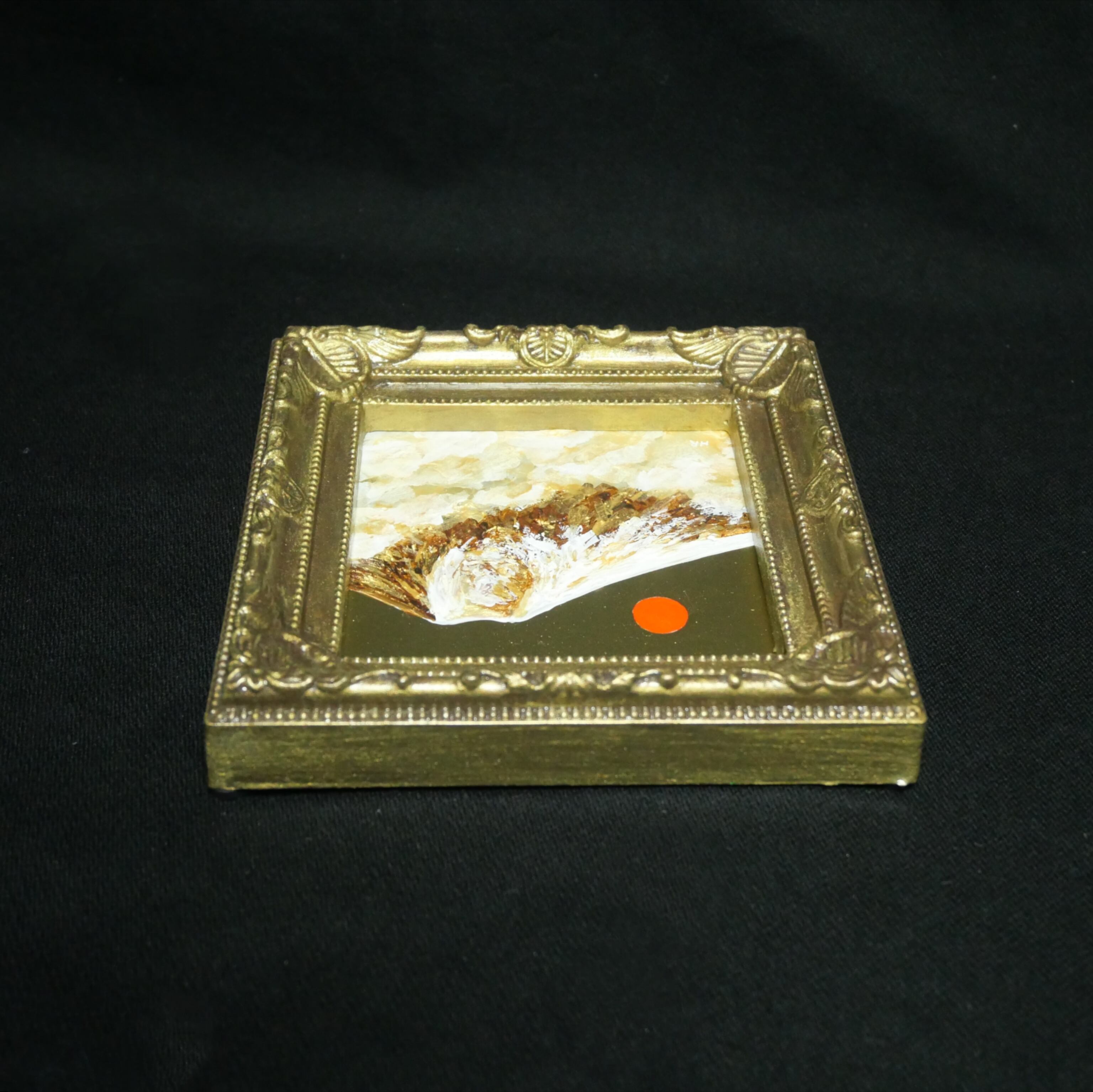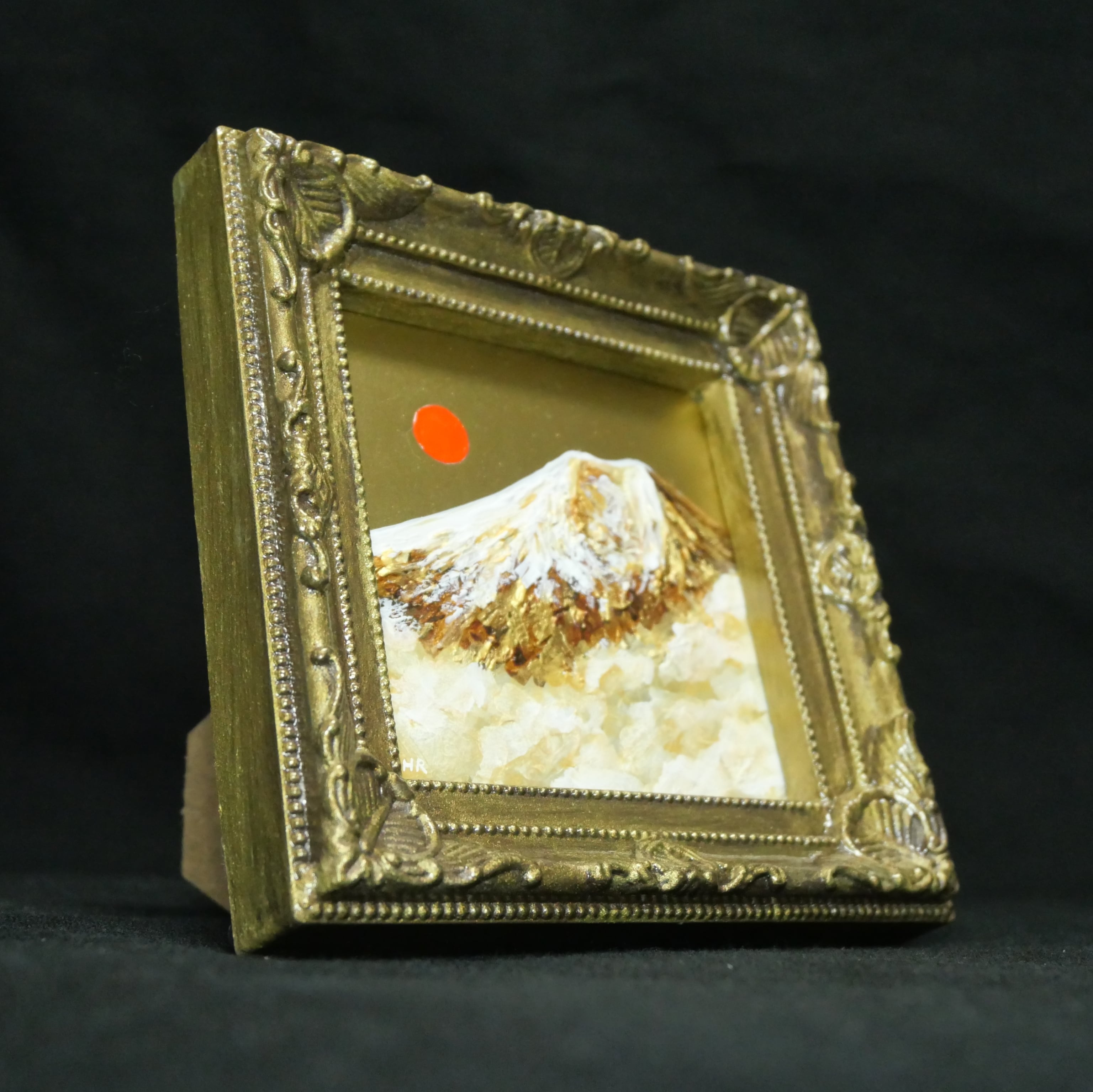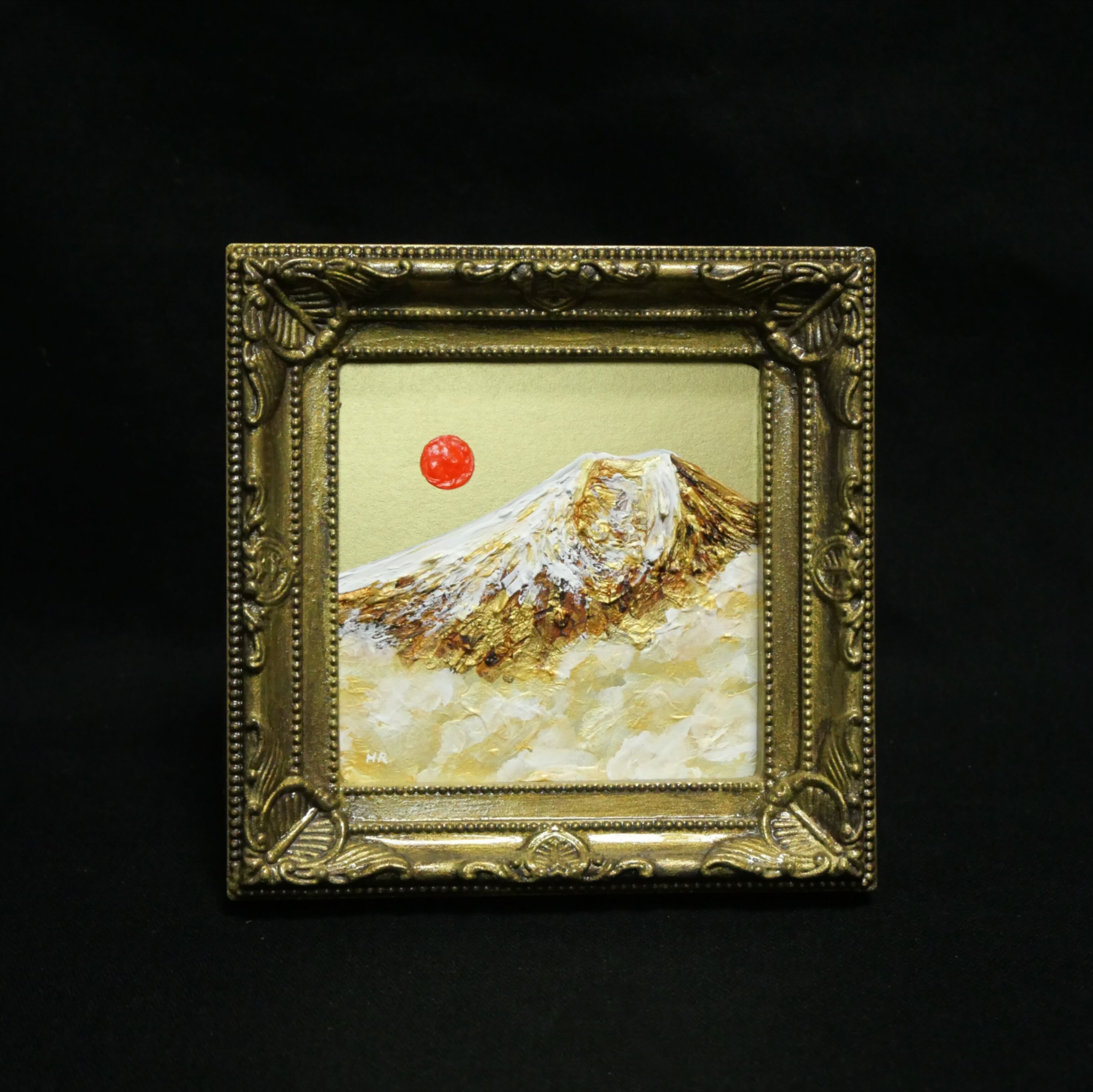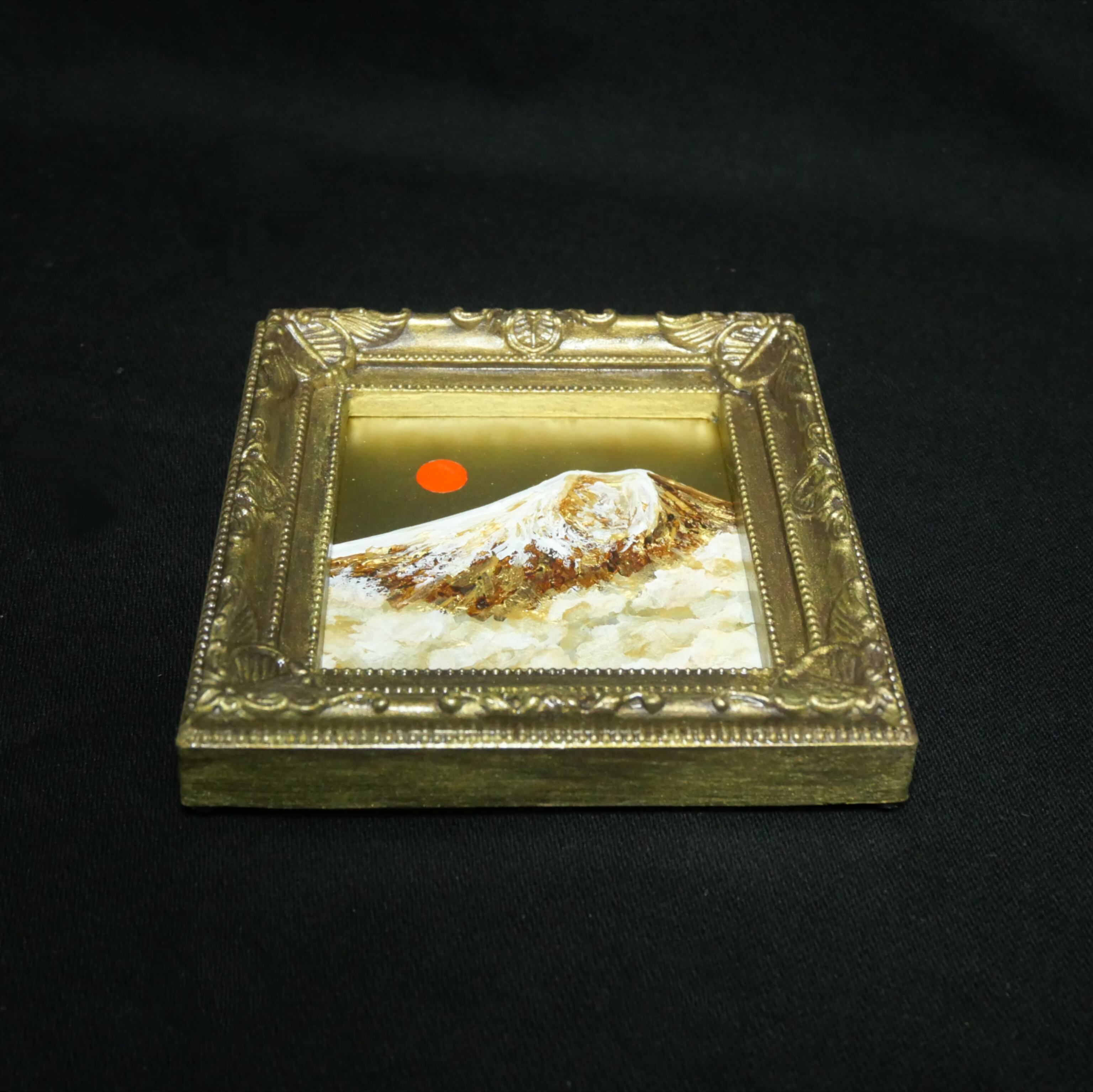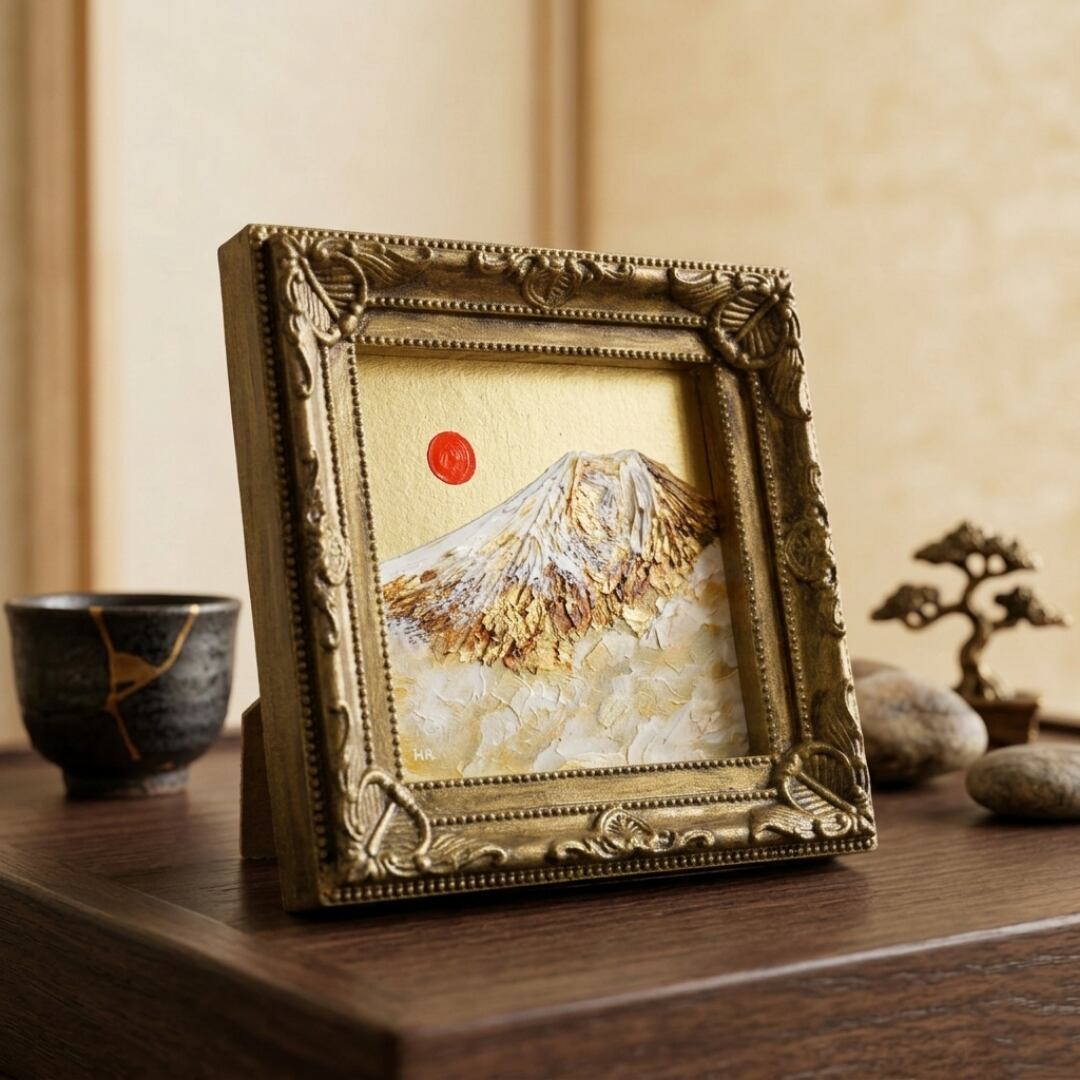 風水において、金色や富士山、旭日の組み合わせは「富と繁栄」や「金運アップ」を象徴する極めて縁起の良いモチーフです。豪華なアンティーク調のゴールド額縁が作品の格調をさらに高めており、手のひらサイズながら、空間全体のエネルギーを明るく変えてくれるような力強い存在感があります。