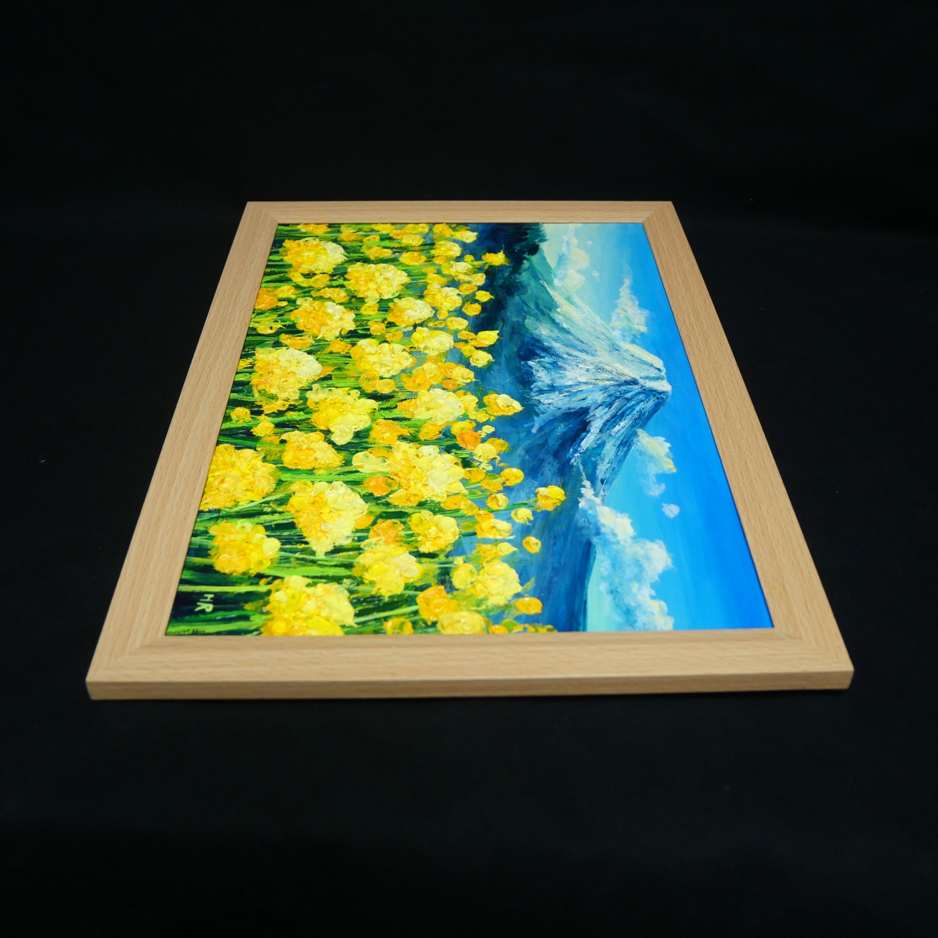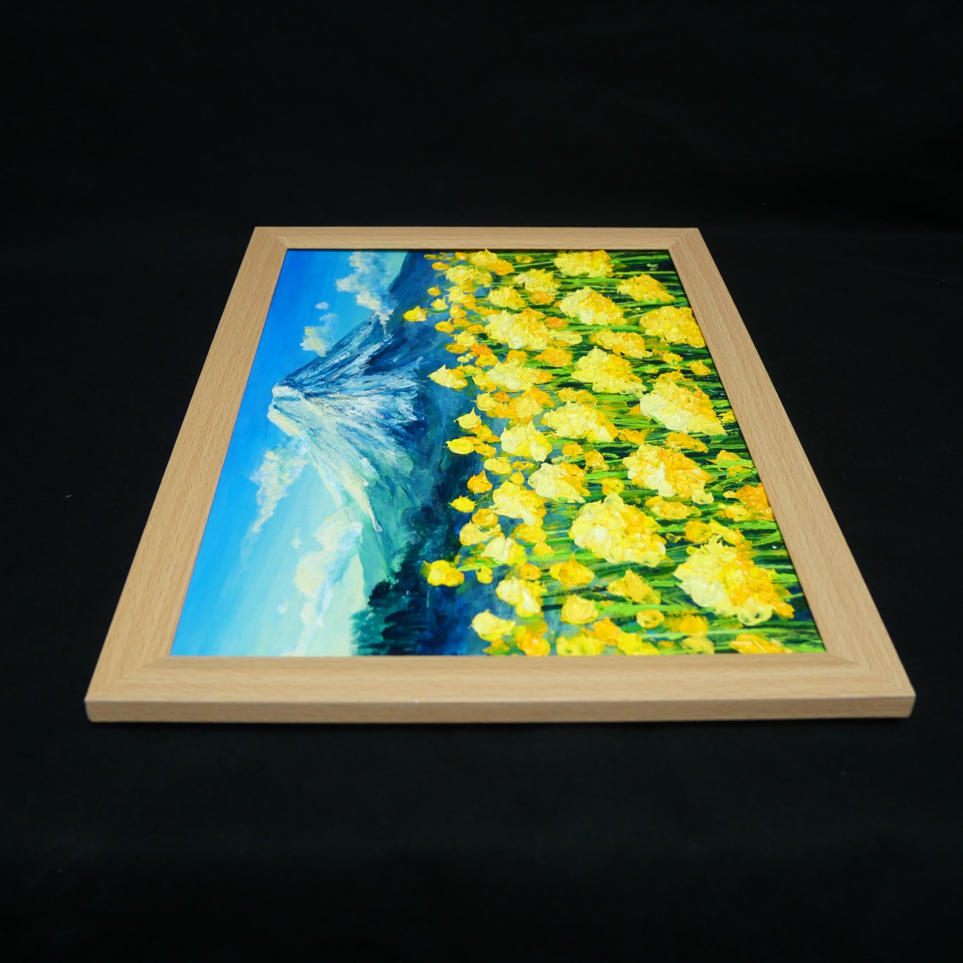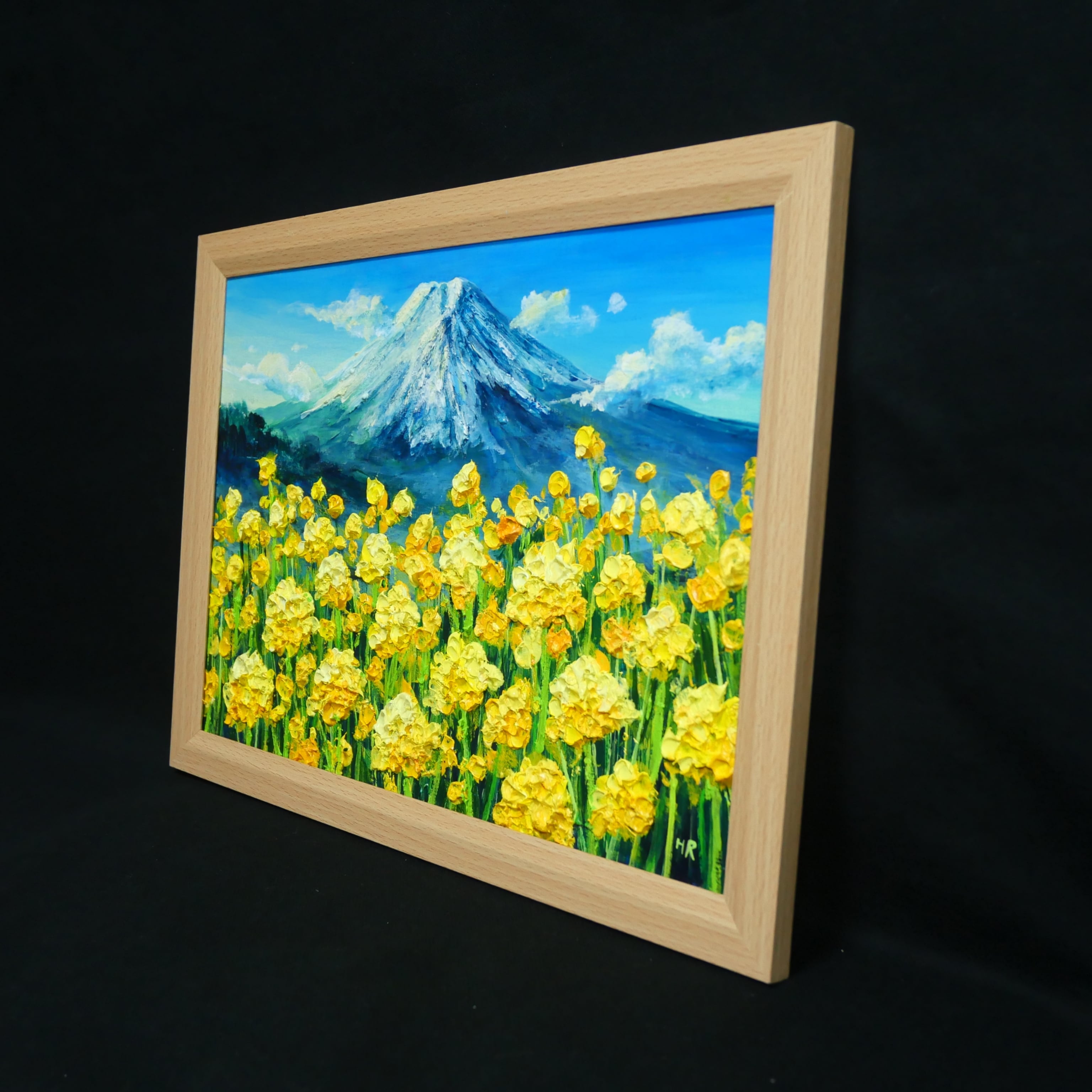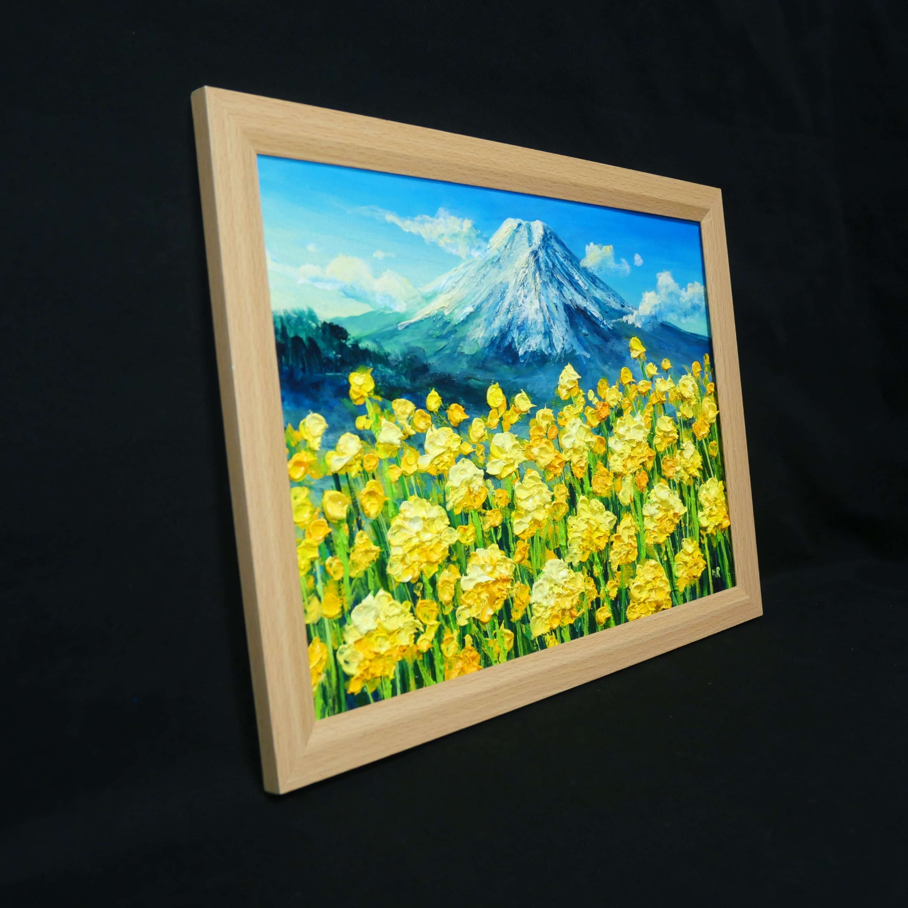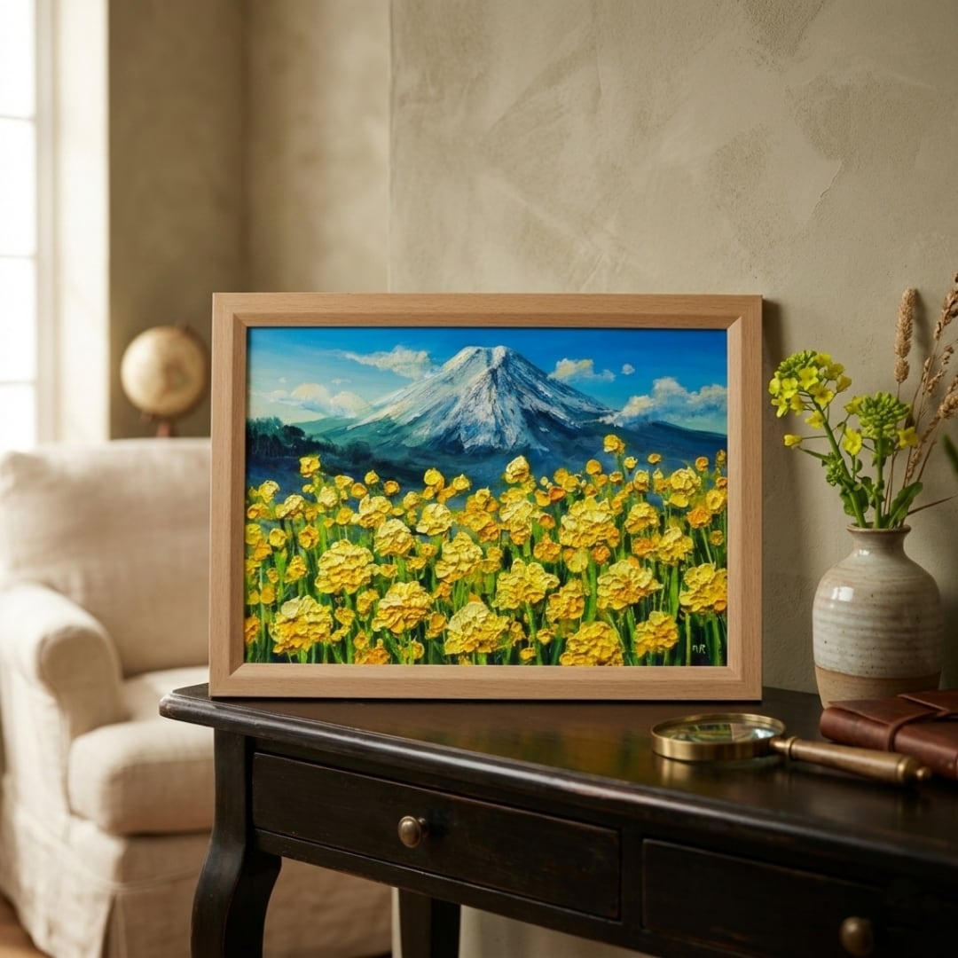 特に際立つのは、油彩の厚塗り技法(インパスト)が生む立体感です。一輪一輪が春の優しい風に揺れ、しっかりと大地に根ざし、空へと手を伸ばす息吹を感じさせます。背後にそびえる富士山は静謐な青と白のコントラストで描かれ、華やかな菜の花の存在感を見事に引き立てています。