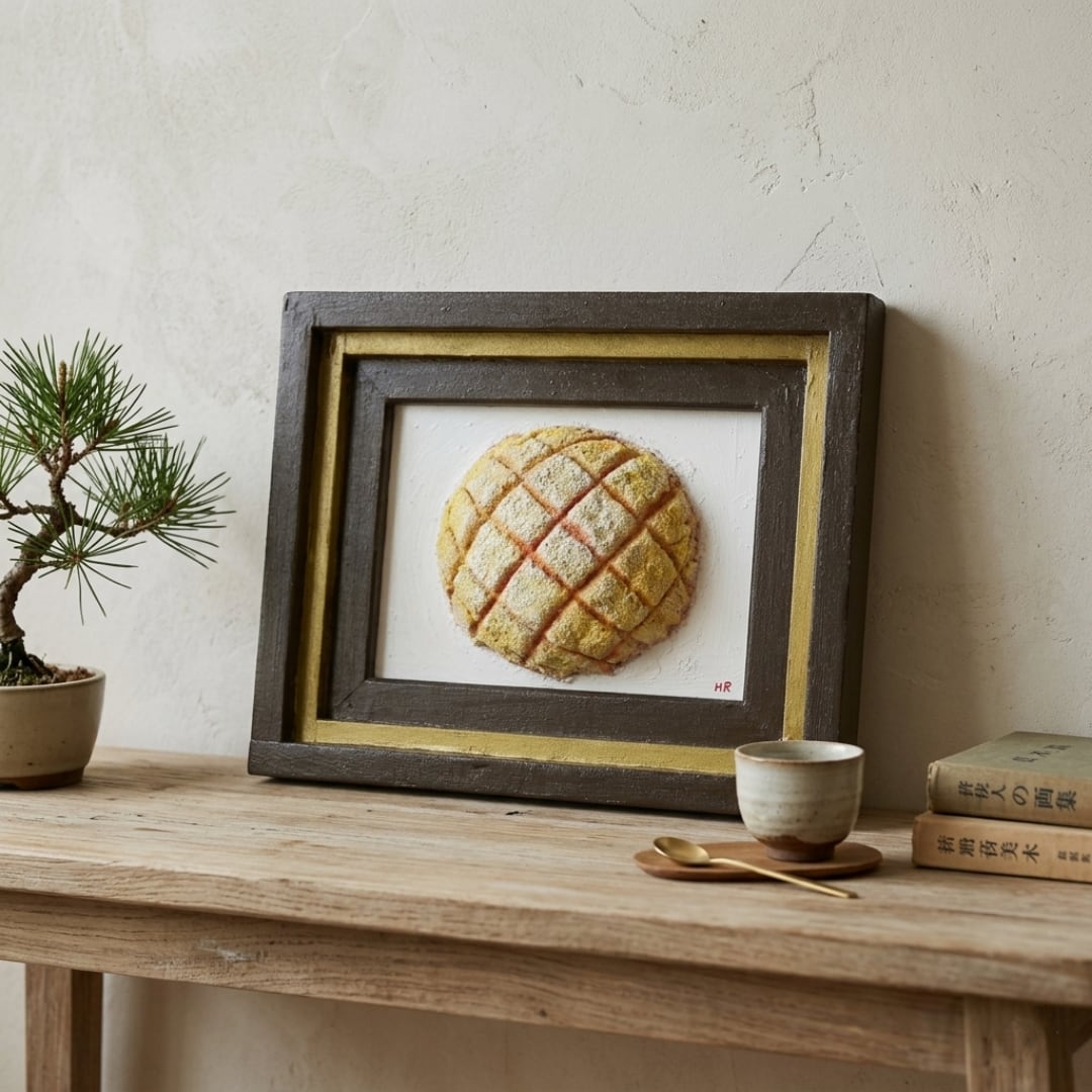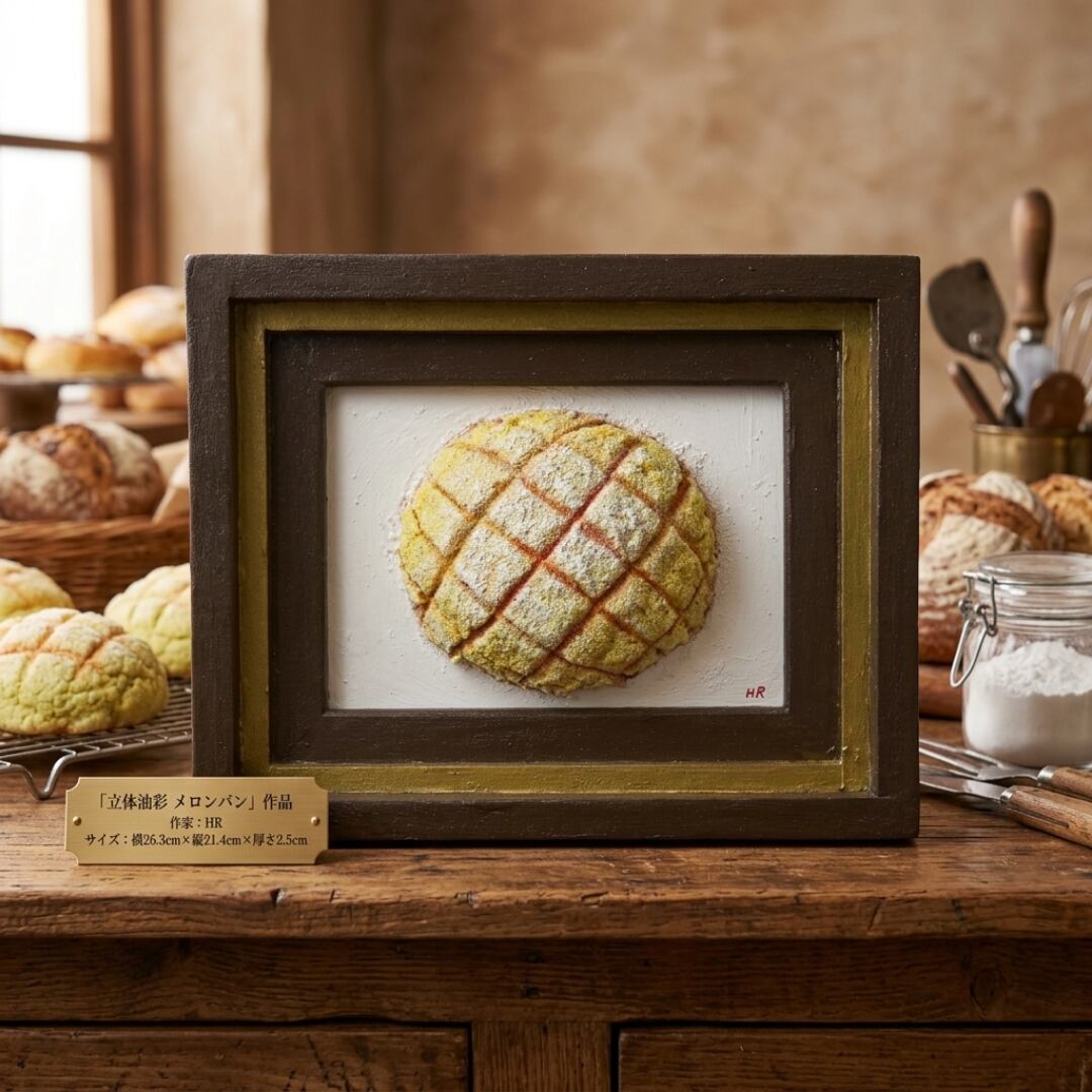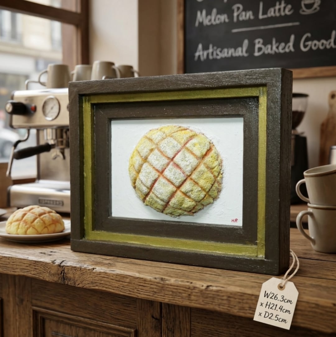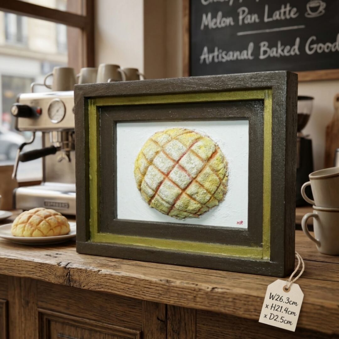 「焼きたての記憶」は、香ばしい香りと共に立ち上る焼きたてのメロンパンをリアルに描いた油絵作品です。その独特の立体感は、見る者を優しいノスタルジーへと誘い、思わず手を伸ばしたくなるような魅力を放っています。多くの人々に愛される「メロンパン」を主役にしたこの一点物の油彩作品は、特別なひとときを演出します。