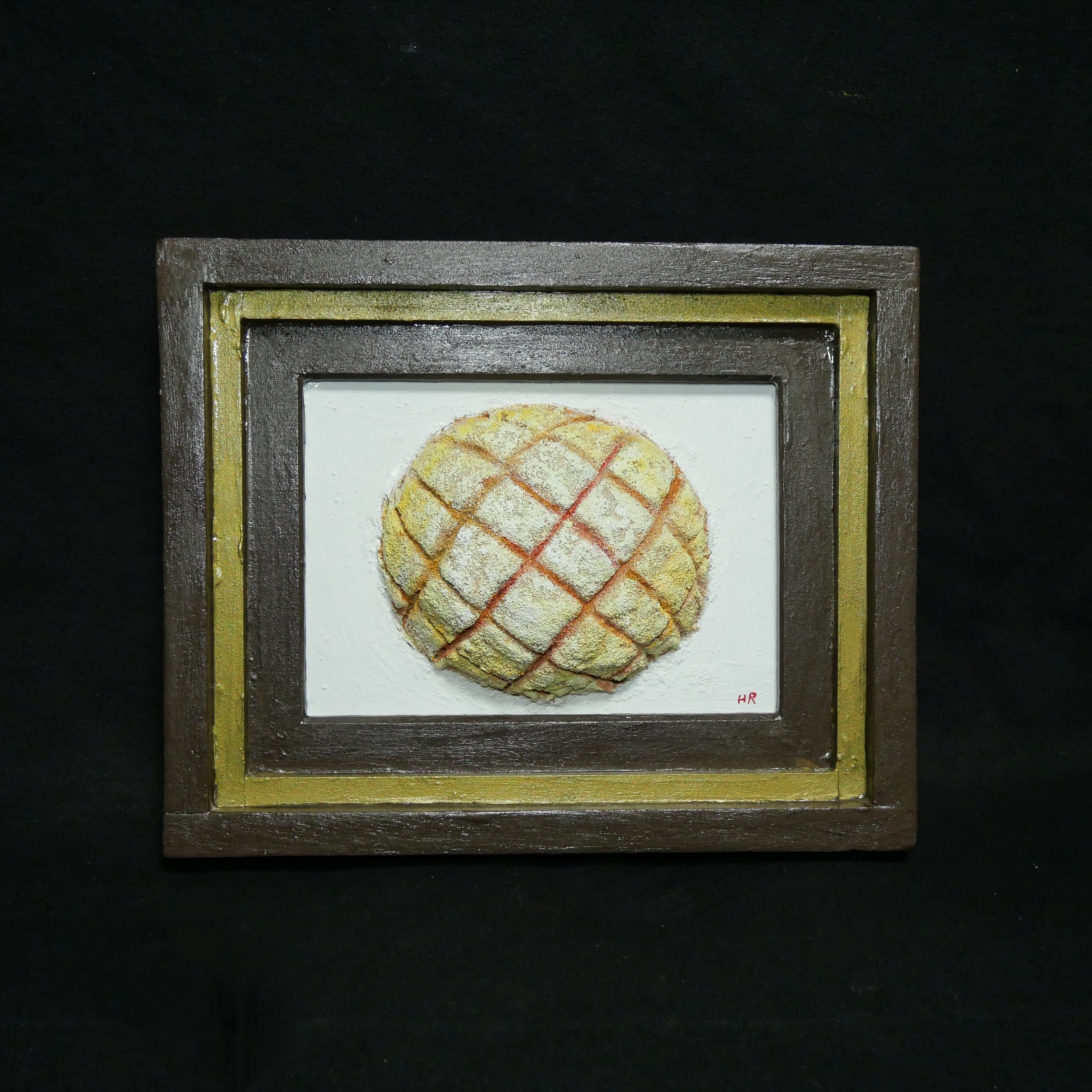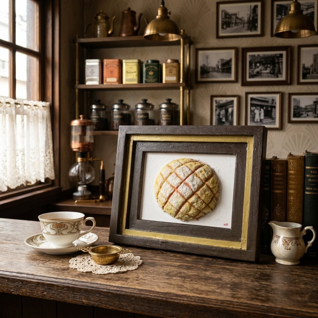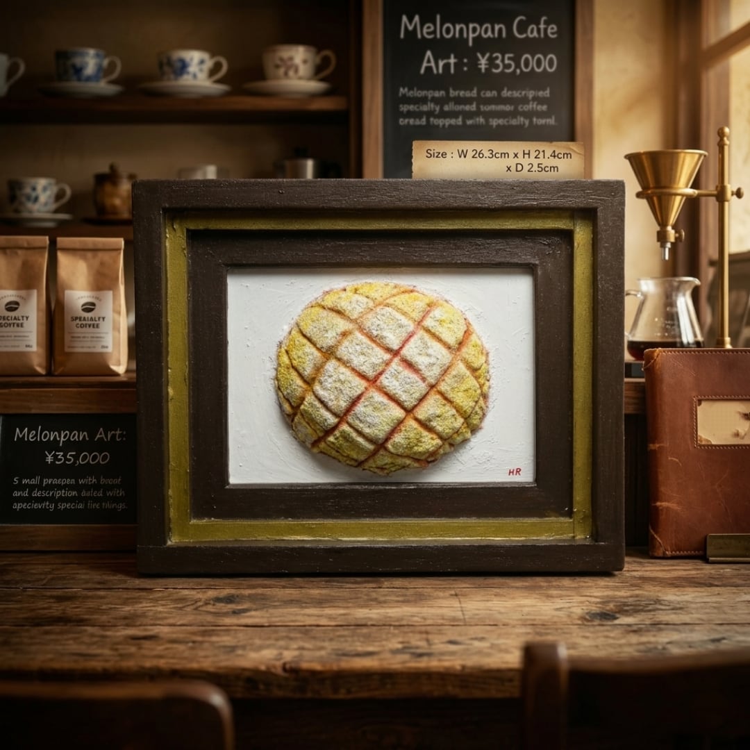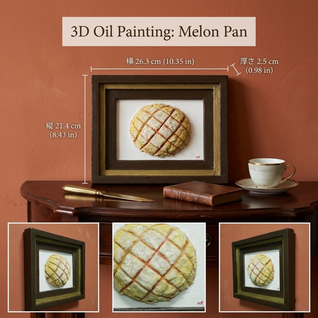 「焼きたての記憶」は、香ばしい香りと共に立ち上る焼きたてのメロンパンをリアルに描いた油絵作品です。その独特の立体感は、見る者を優しいノスタルジーへと誘い、思わず手を伸ばしたくなるような魅力を放っています。多くの人々に愛される「メロンパン」を主役にしたこの一点物の油彩作品は、特別なひとときを演出します。