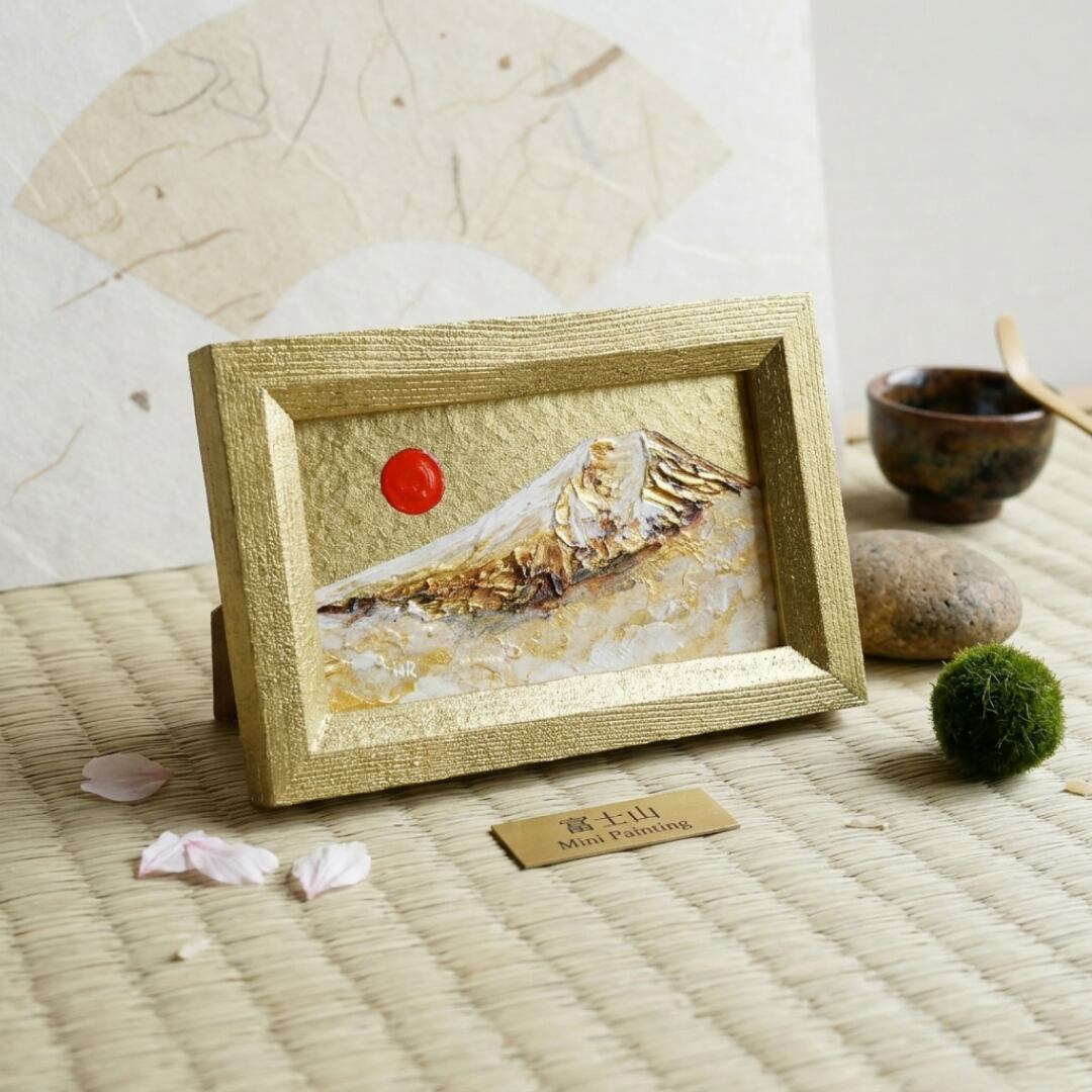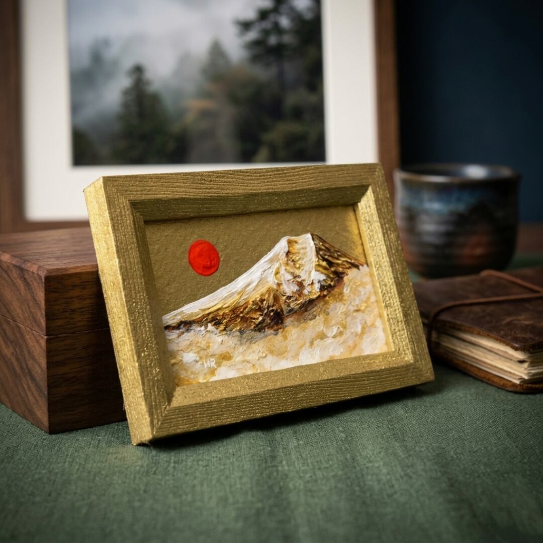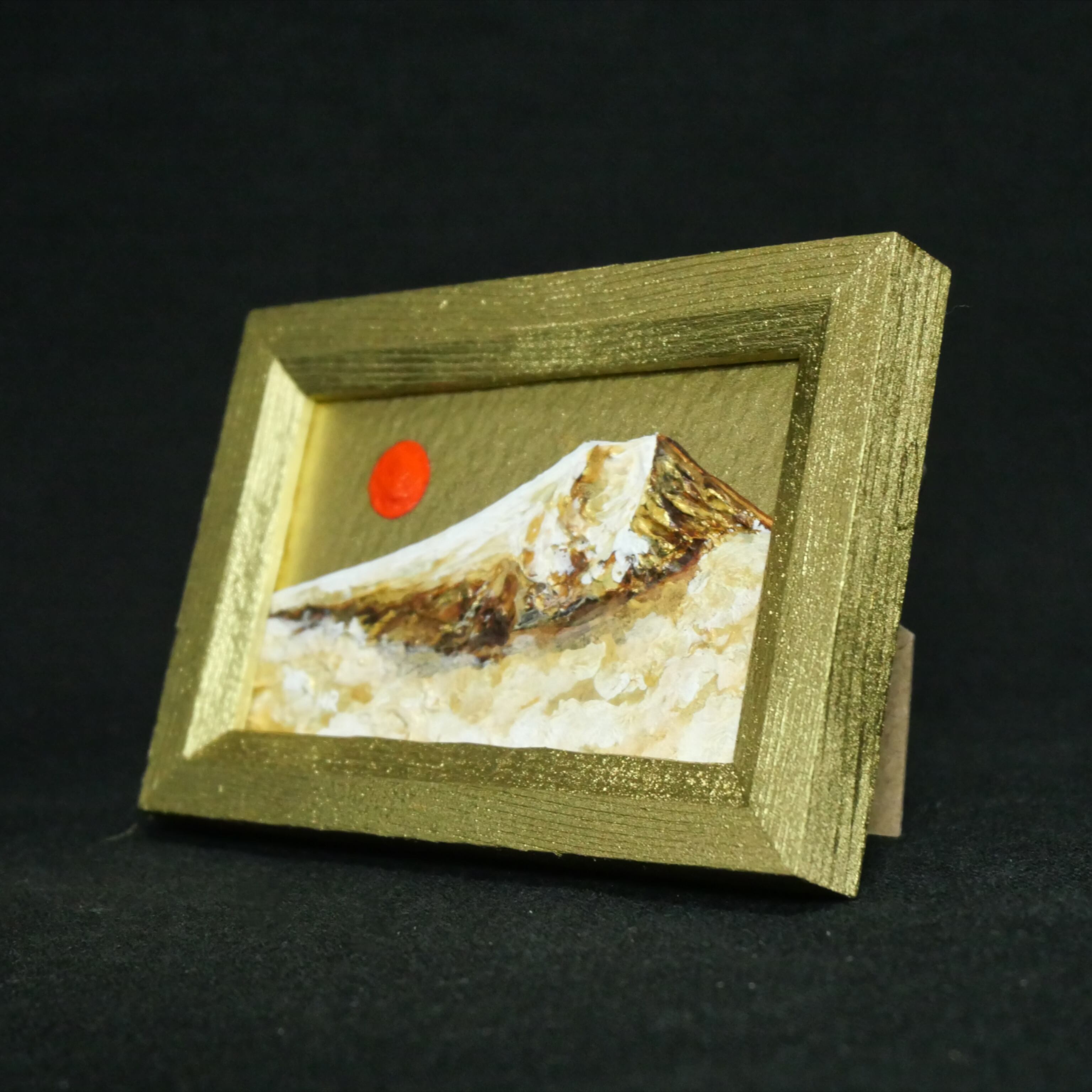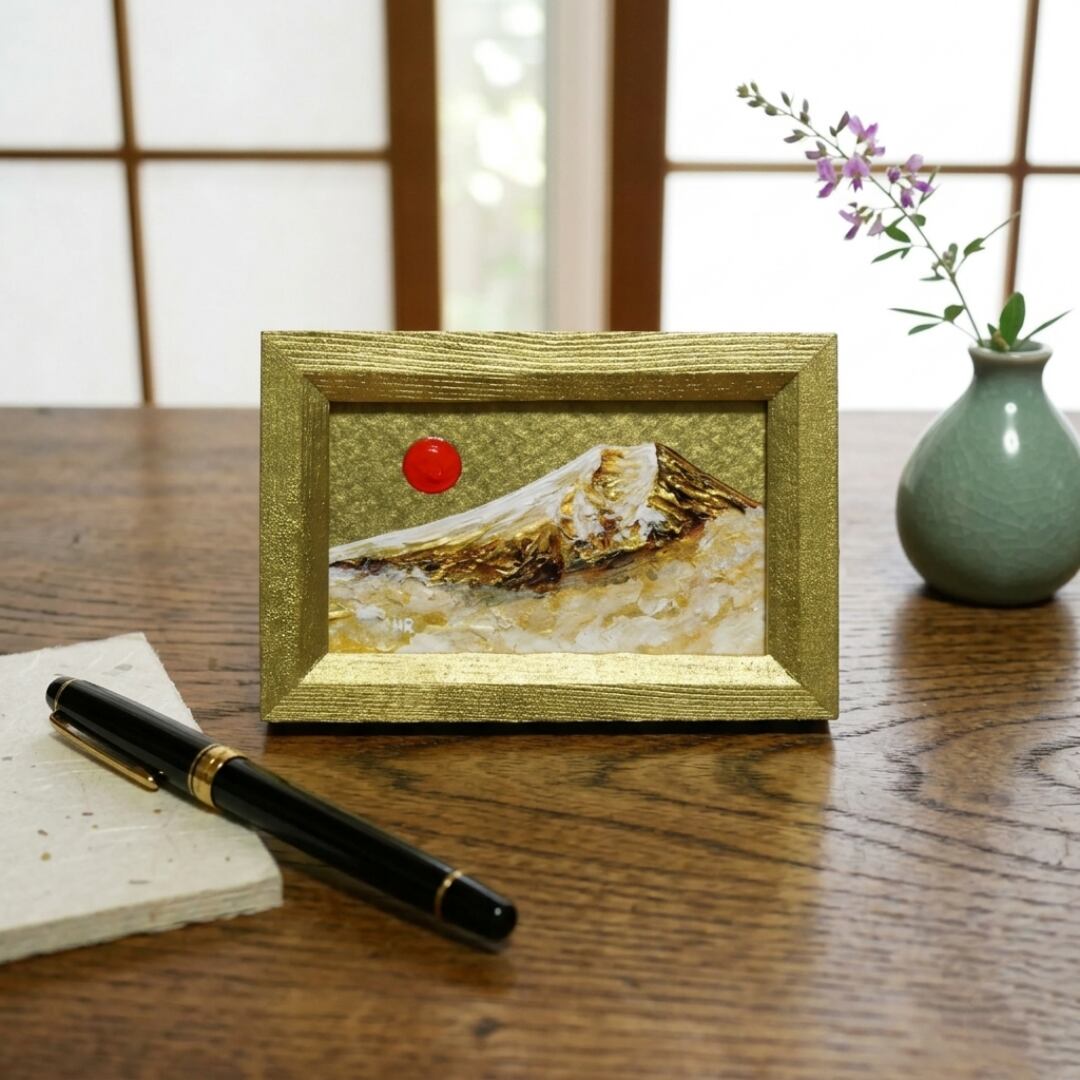 重厚感のある油彩技法と、ホルベインの上質な絵具を使用し、「黄金富士」を現代的な表現で仕上げました。光の当たり方で変化するその輝きは、まるで生命を持つかのような息吹を感じさせます。サイズはわずか11cmですが、その中に凝縮された美しさは圧倒的です。横11.0cm、縦7.3cmのコンパクトサイズは、玄関やデスクなど、日常の中の特別な場所にぴったりです。