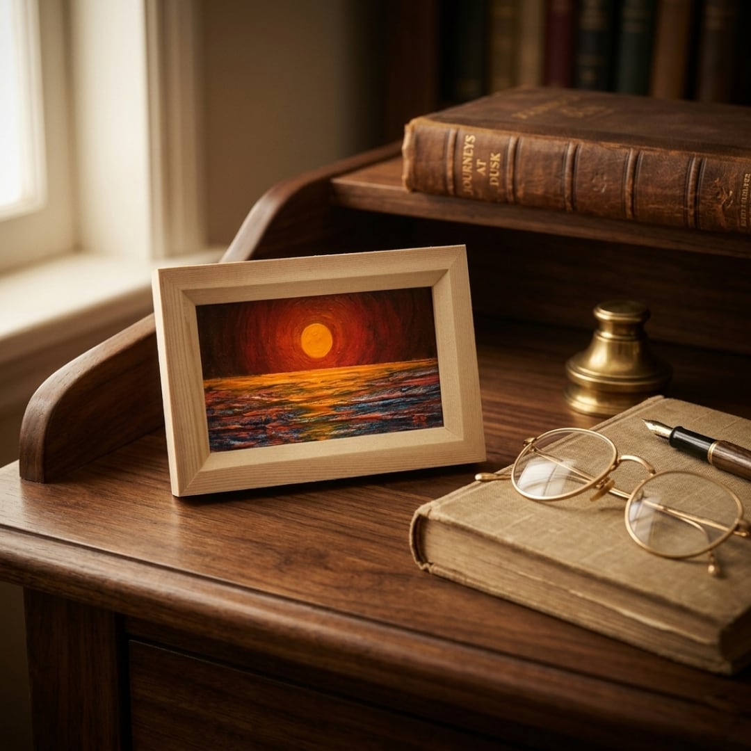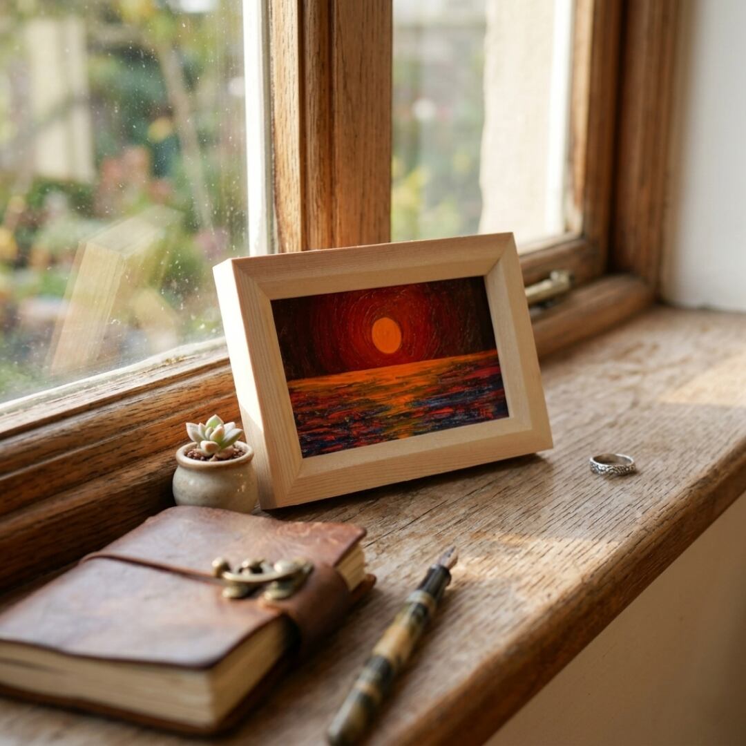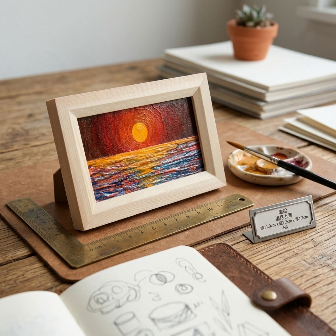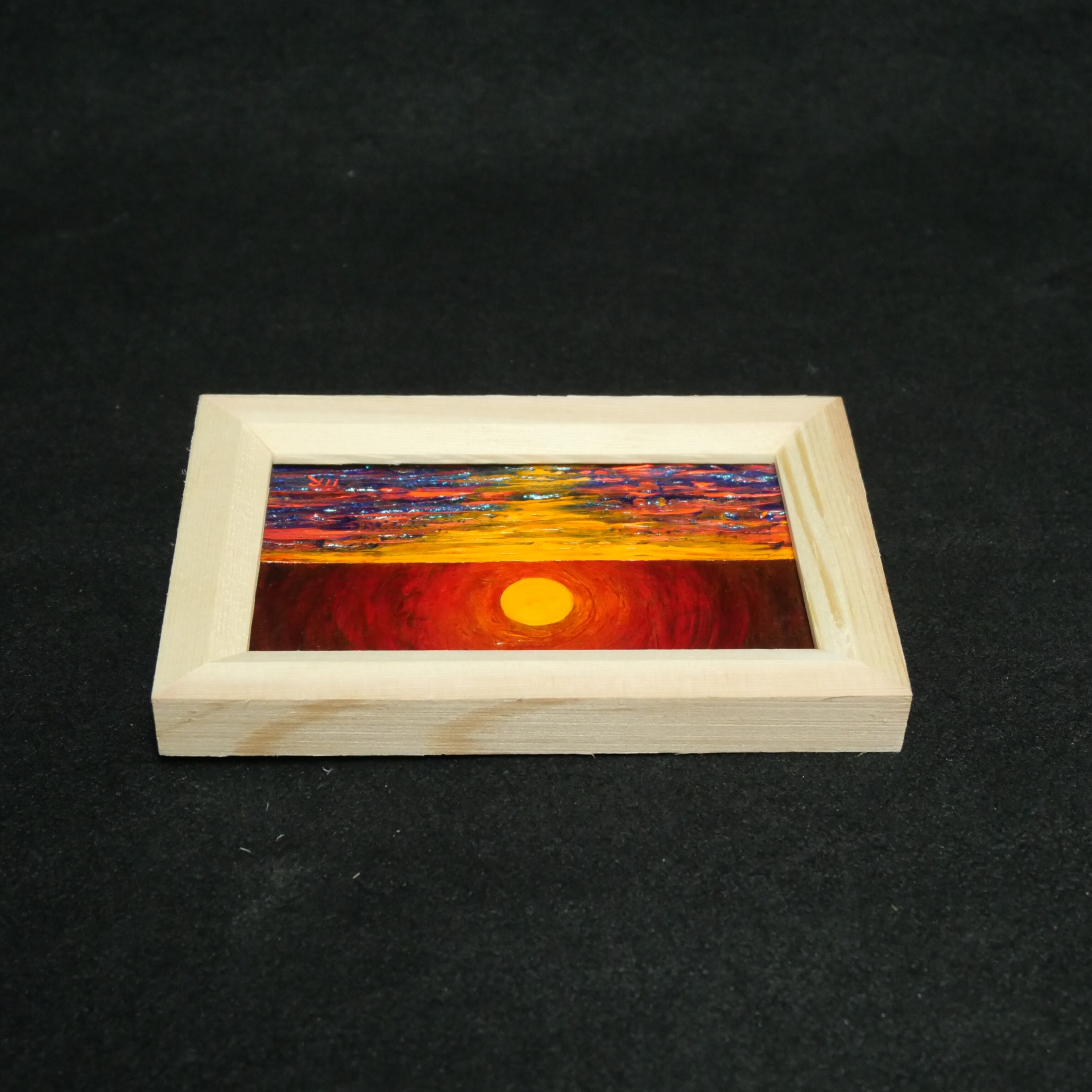 一流メーカー「ホルベイン」の油絵具を贅沢に使用し、小さなフレームの中に折り重なるように描かれたオレンジの月と海の煌めきが、観る人の心に深い感動をもたらします。ミニサイズながらも、油彩特有の立体的な筆致が光を受け止め、空のグラデーションを見事に表現しており、サイズは横11.0cm、縦7.3cmで、どんなスペースにもフィットします。