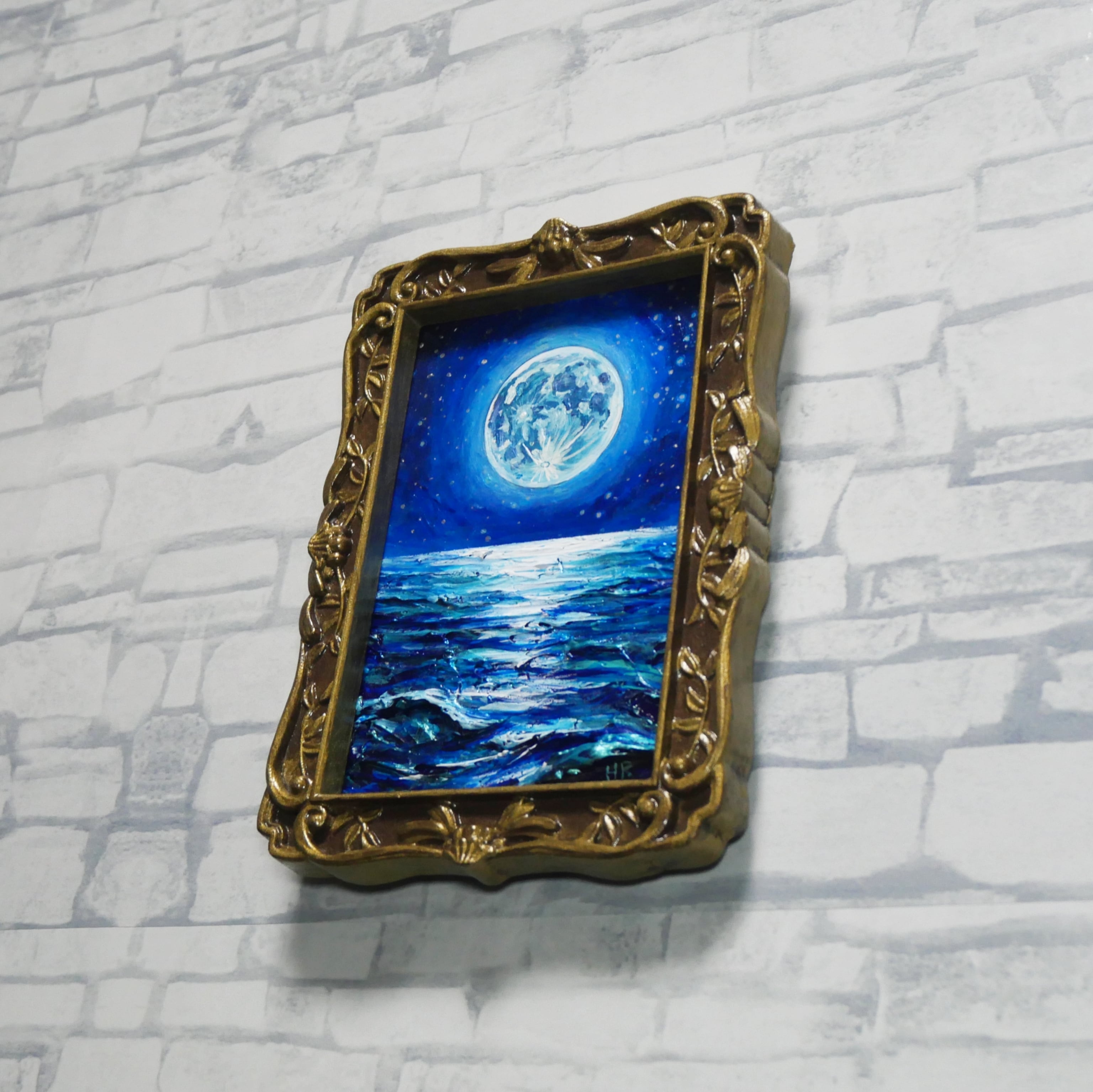油絵 原画『海を照らす蒼き満月』ミニ絵画 | 月 夜空 風景画 インテリア アート