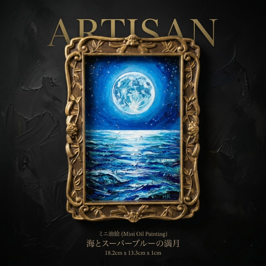 「奇跡の瞬き 〜海を照らす蒼き満月〜」は、心を奪う深く澄んだ蒼の世界が広がる、特別な油絵作品です。このアートは、天文学的な偶然が生み出した「スーパーブルームーン」という特別な夜を描いており、観る者は一瞬でその美しさに引き込まれること間違いなしです。