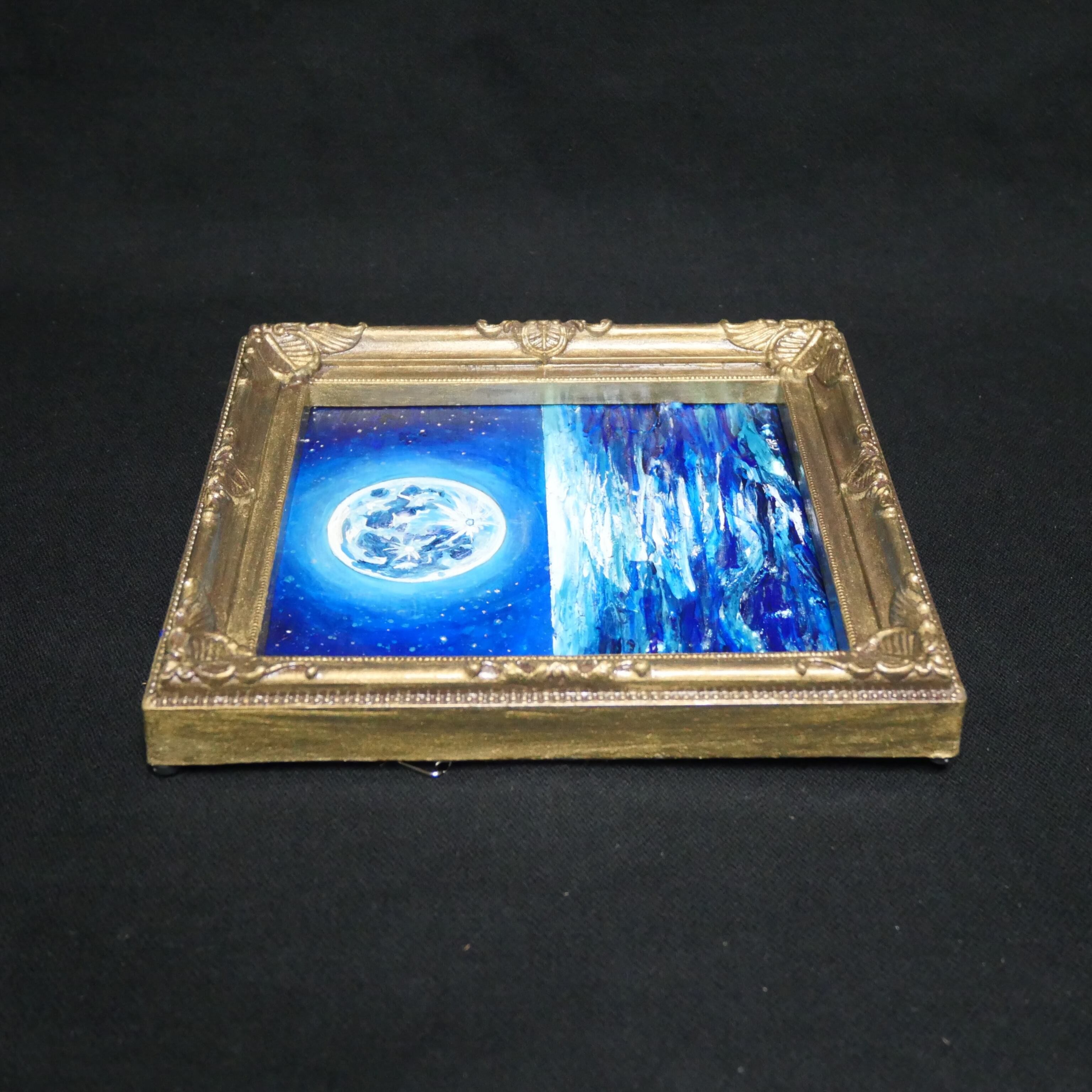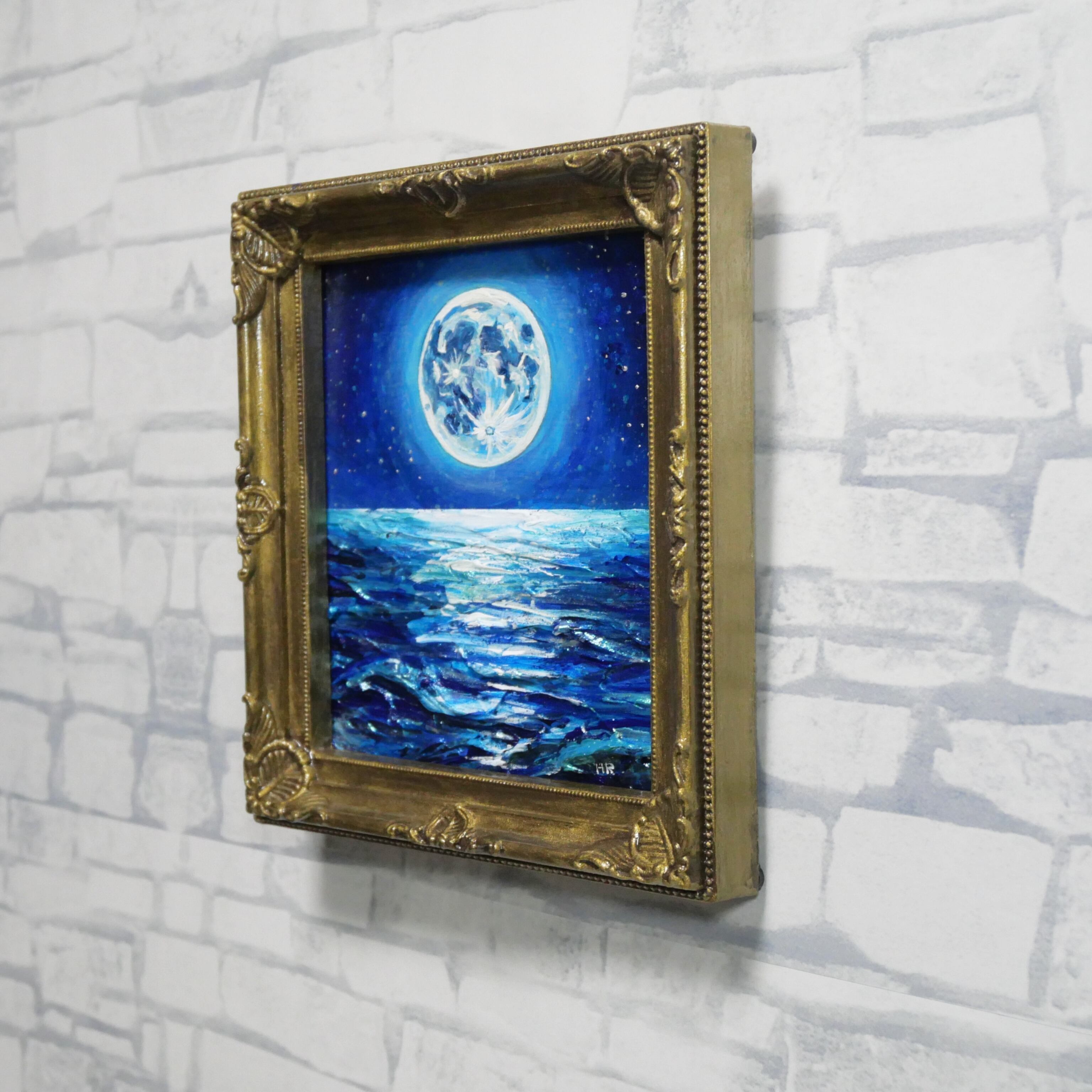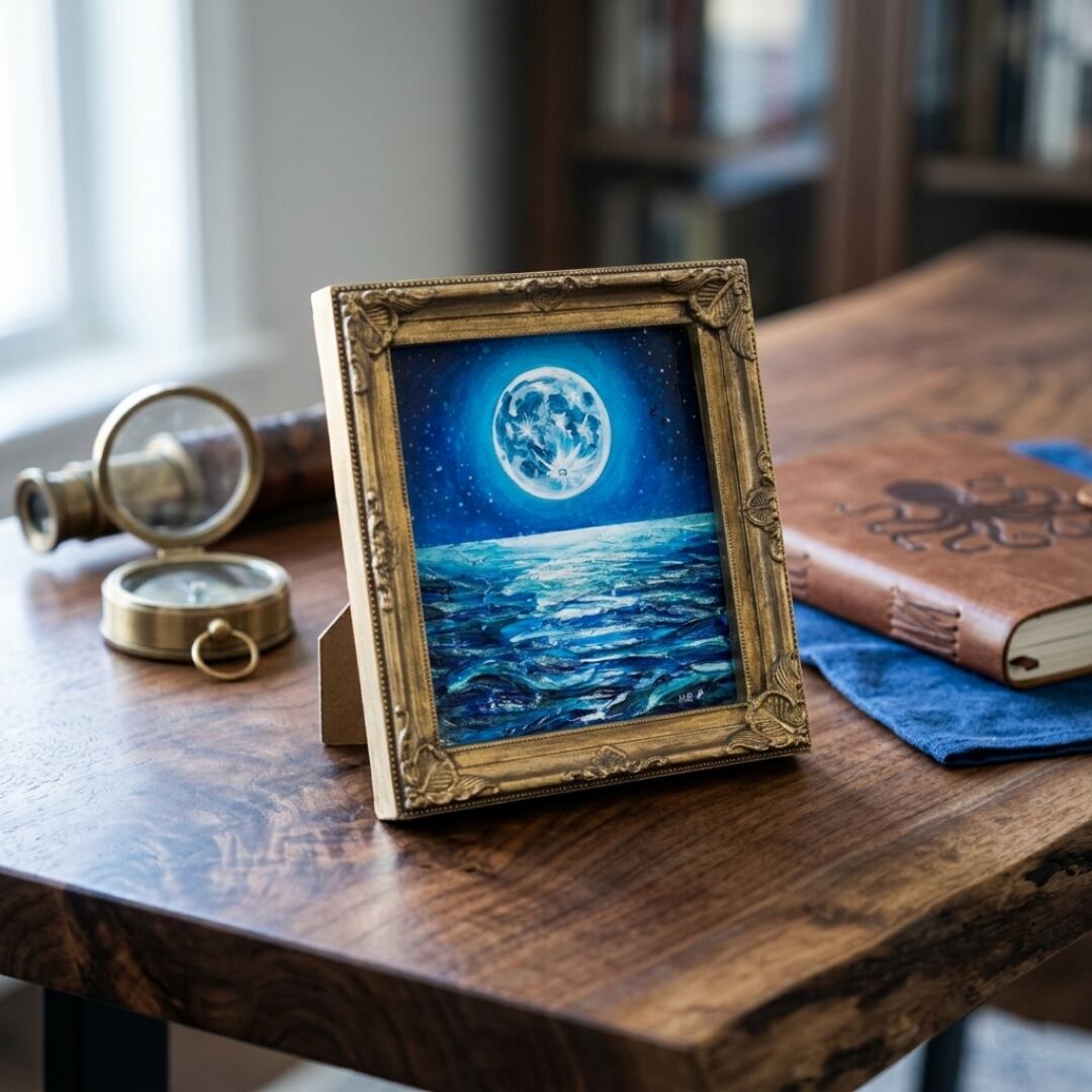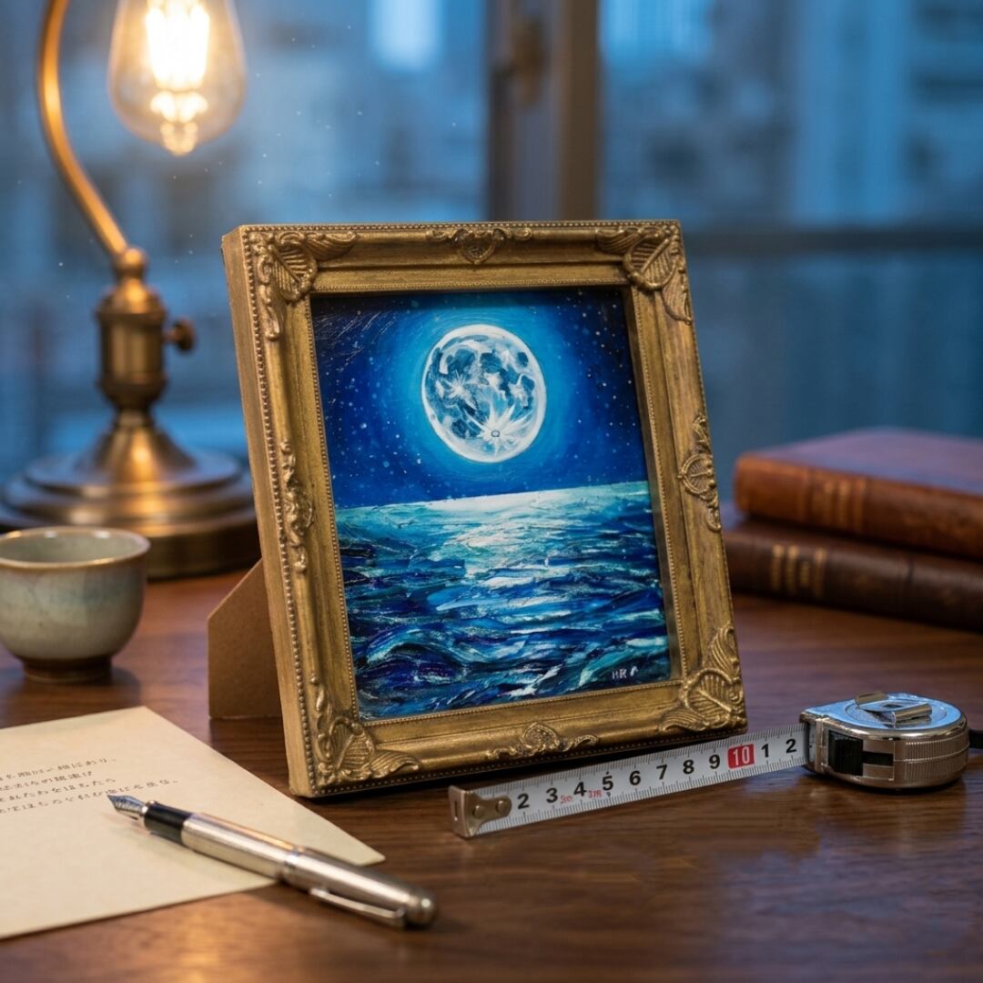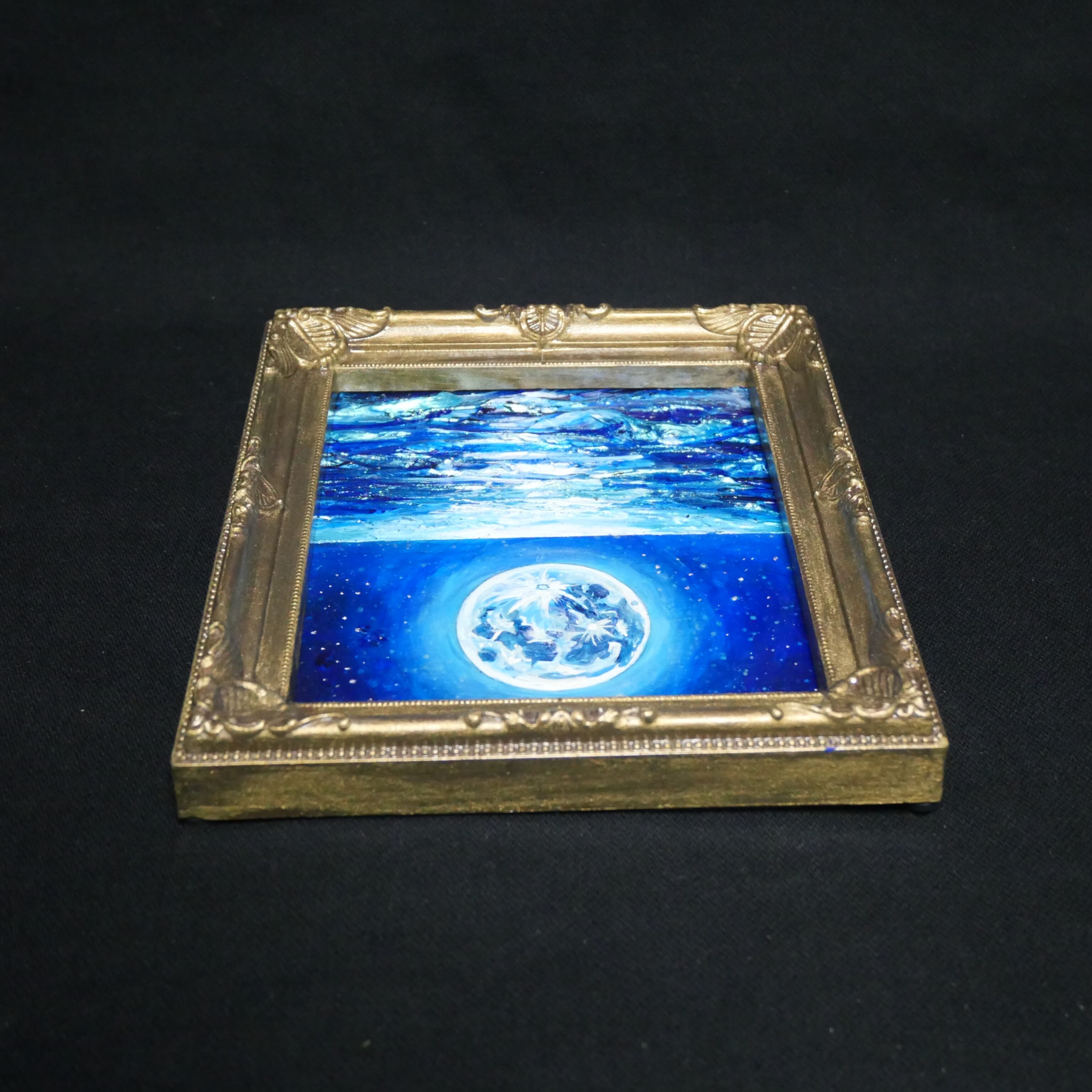 数年に一度しか現れないスーパーブルームーンをモチーフにしており、その月光が海面に描き出す「光の道」は、未来への案内役としての力強さを持っています。お守りのように身近に置きたいと思わせるこの作品は、眺める者に希望と安らぎをもたらします。