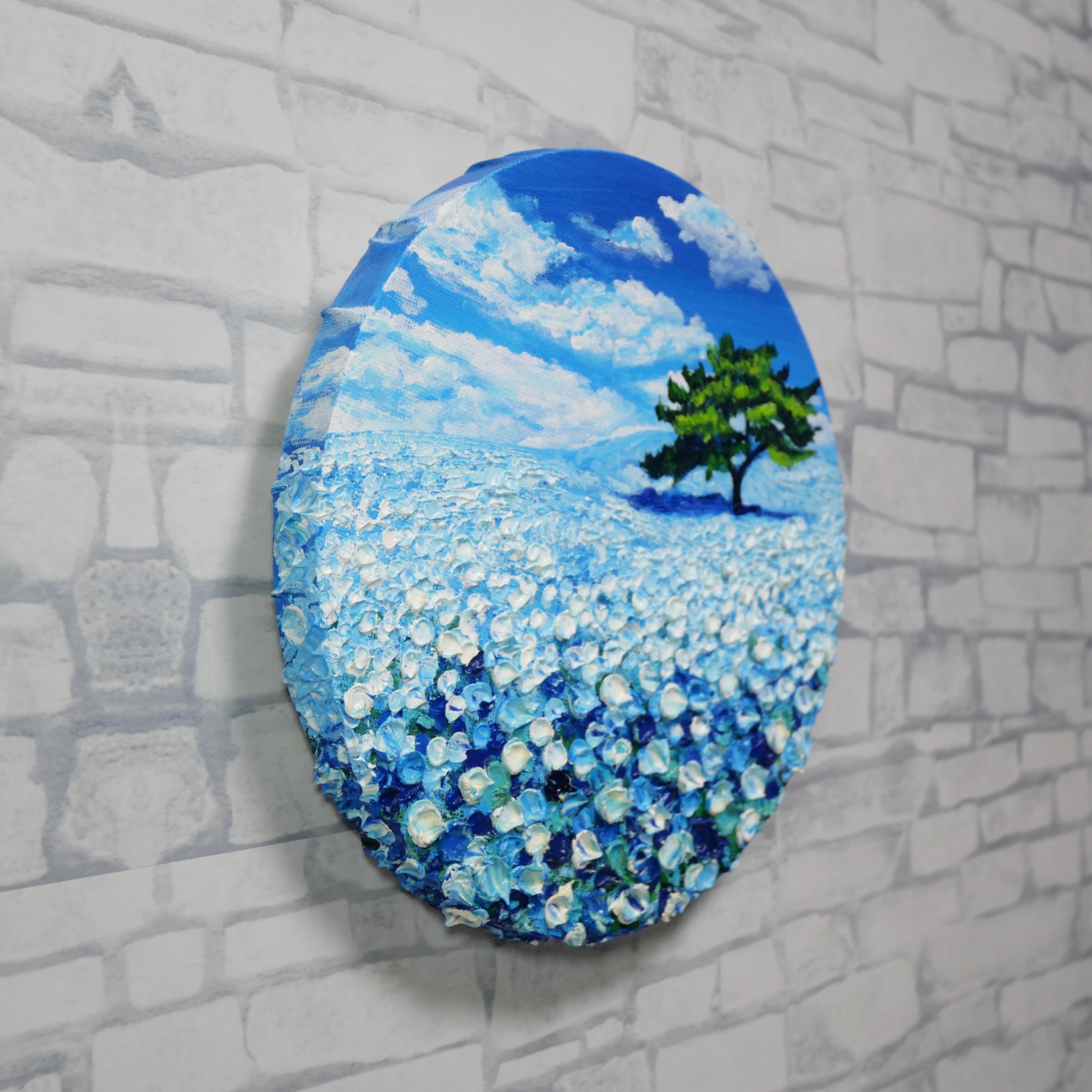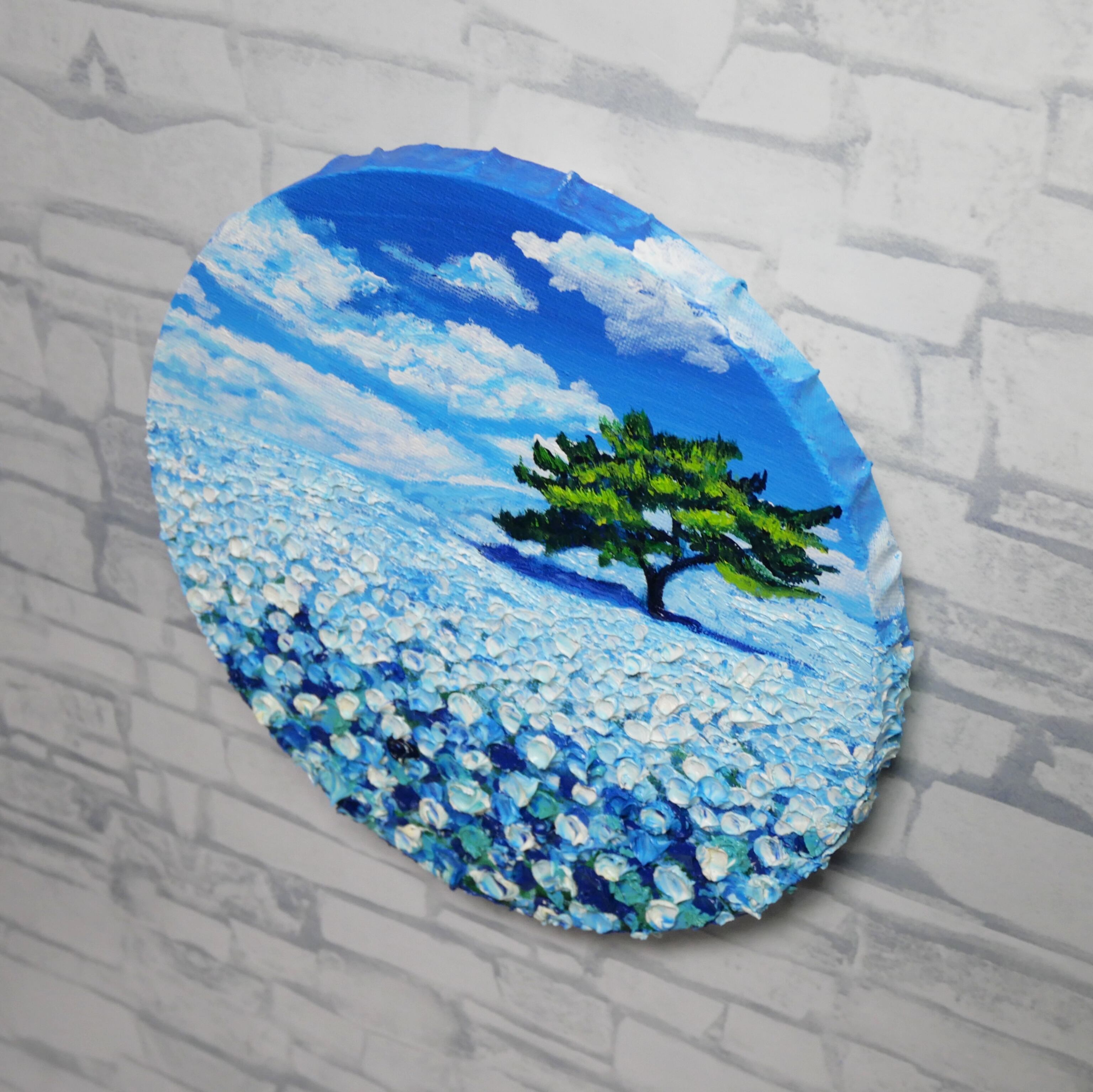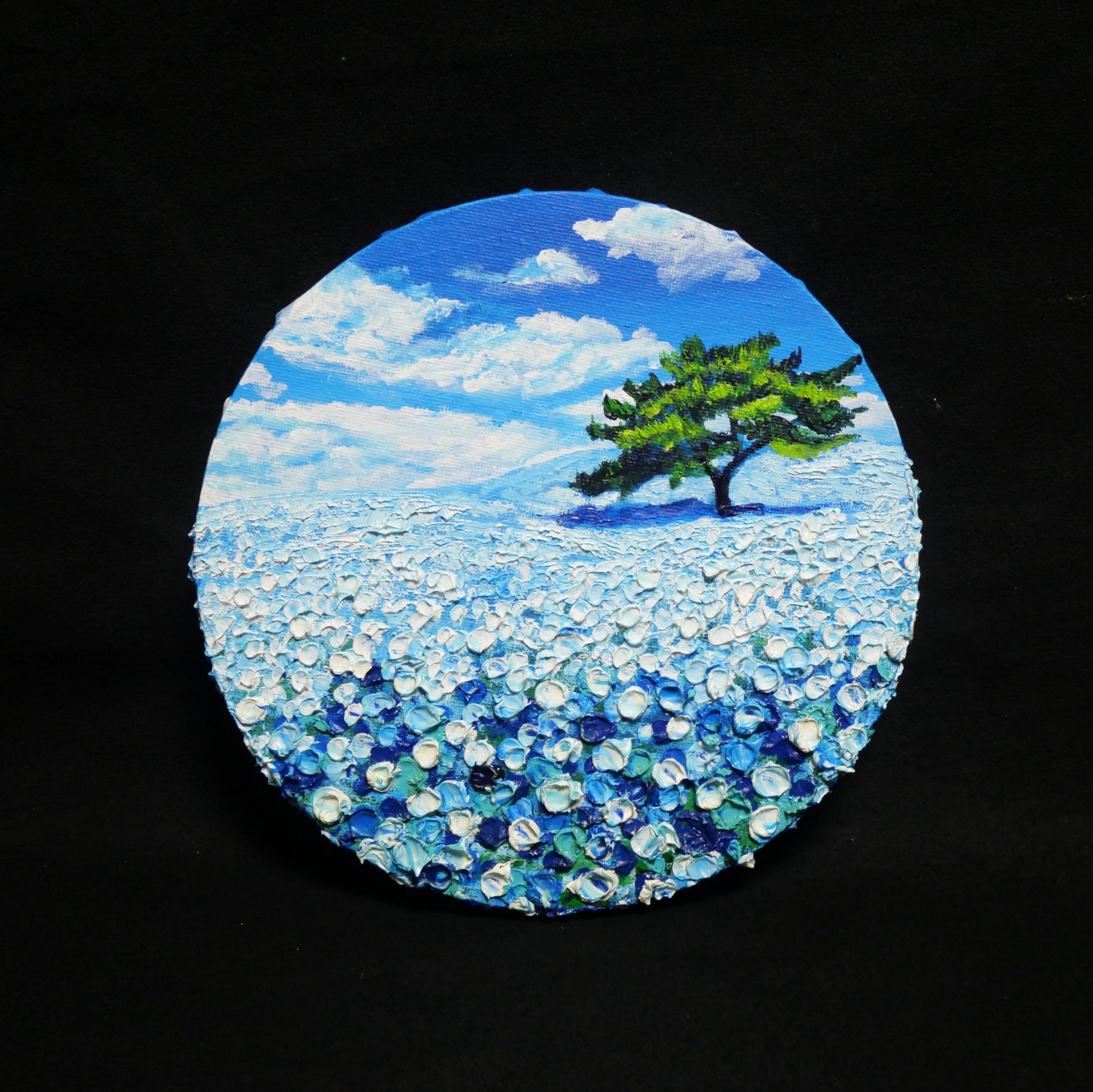 珍しい円形の張りキャンバスを用いることで、風景が中央に凝縮され、その強い存在感が際立ちます。青空に映える透明感のあるネモフィラと、印象的な一本の木が全体を引き締め、まるで心をリフレッシュさせる場所へと誘います。20cmという飾りやすいサイズながら、実物は写真以上の重厚感と色彩の輝きを感じていただけることでしょう。
