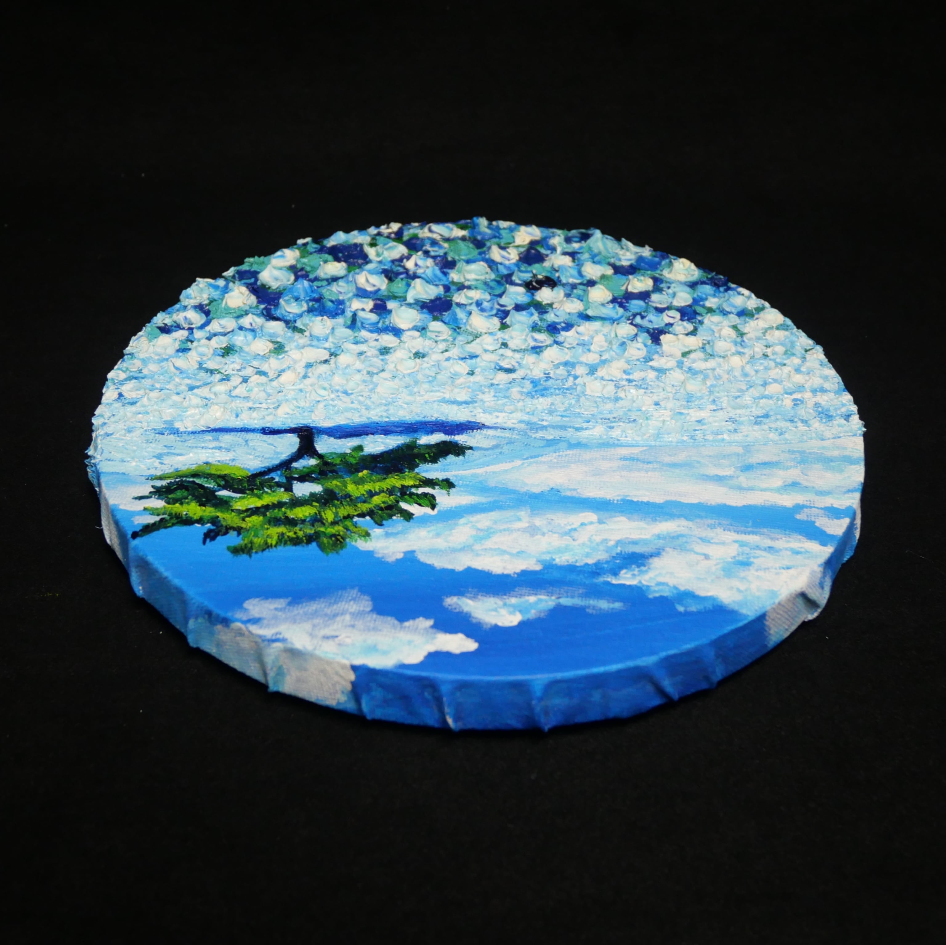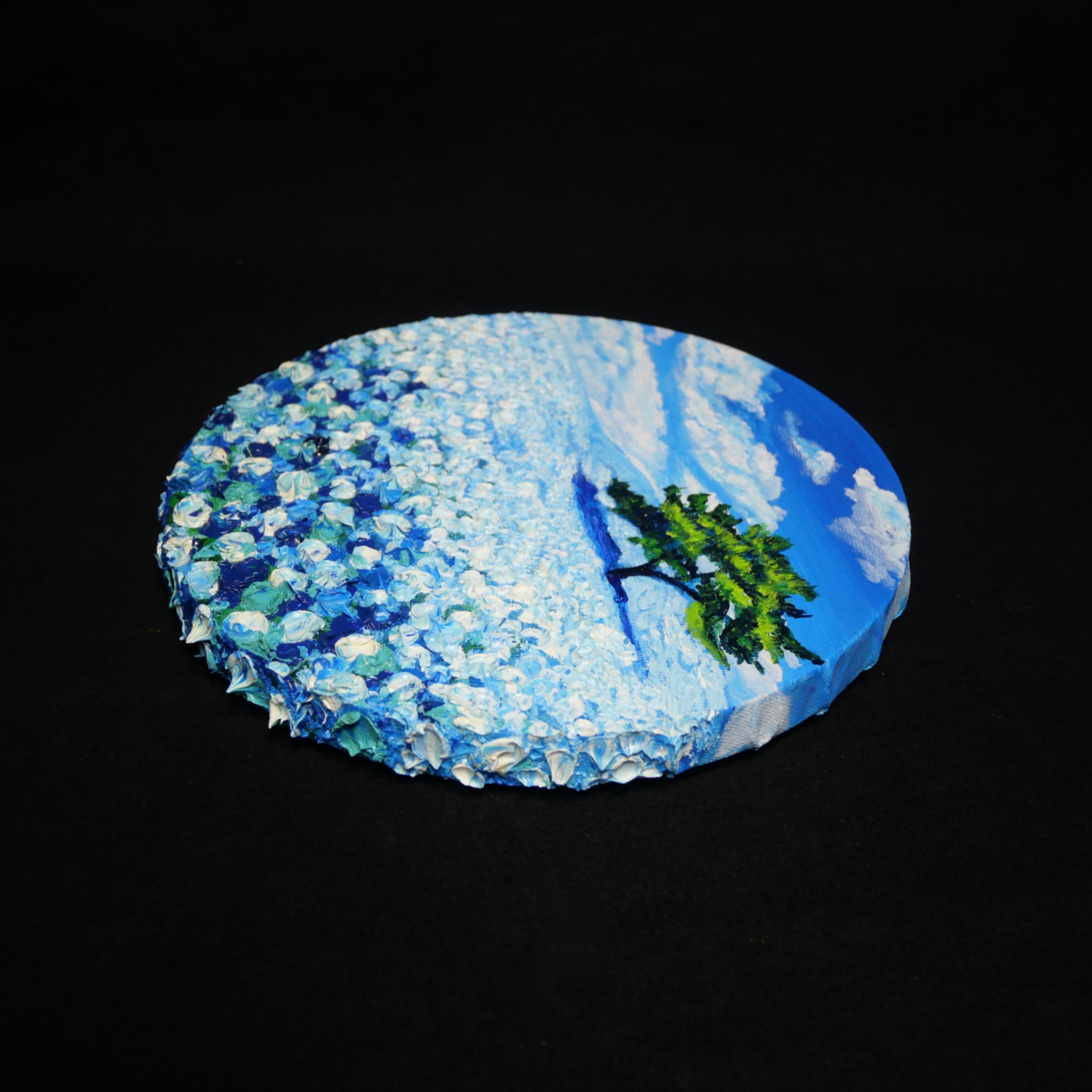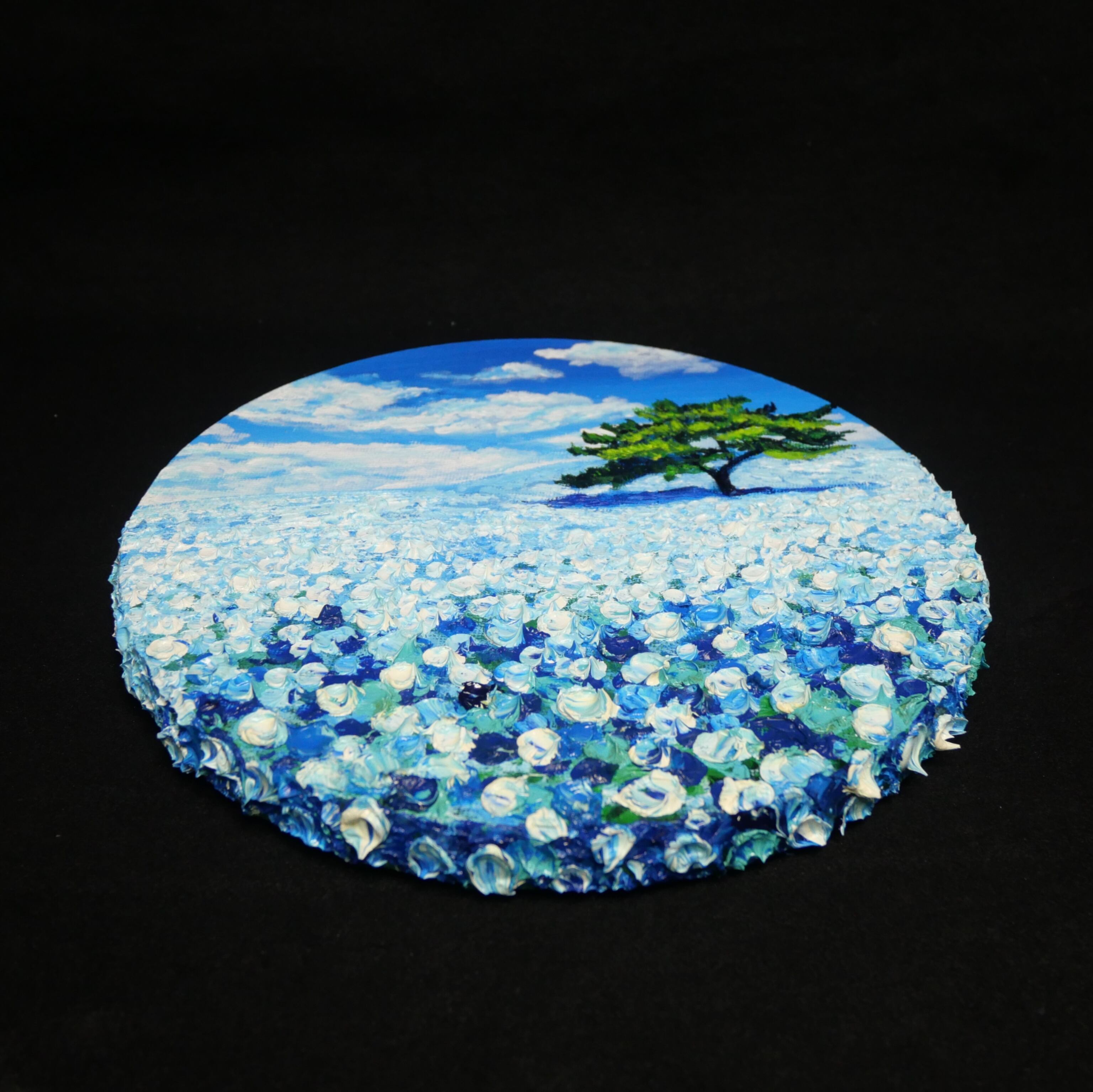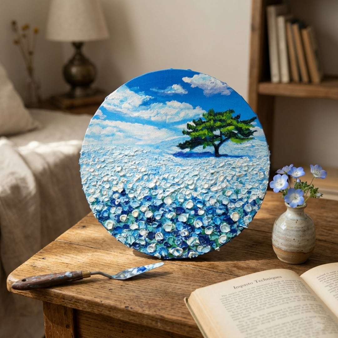 珍しい円形の張りキャンバスを用いることで、風景が中央に凝縮され、その強い存在感が際立ちます。青空に映える透明感のあるネモフィラと、印象的な一本の木が全体を引き締め、まるで心をリフレッシュさせる場所へと誘います。20cmという飾りやすいサイズながら、実物は写真以上の重厚感と色彩の輝きを感じていただけることでしょう。