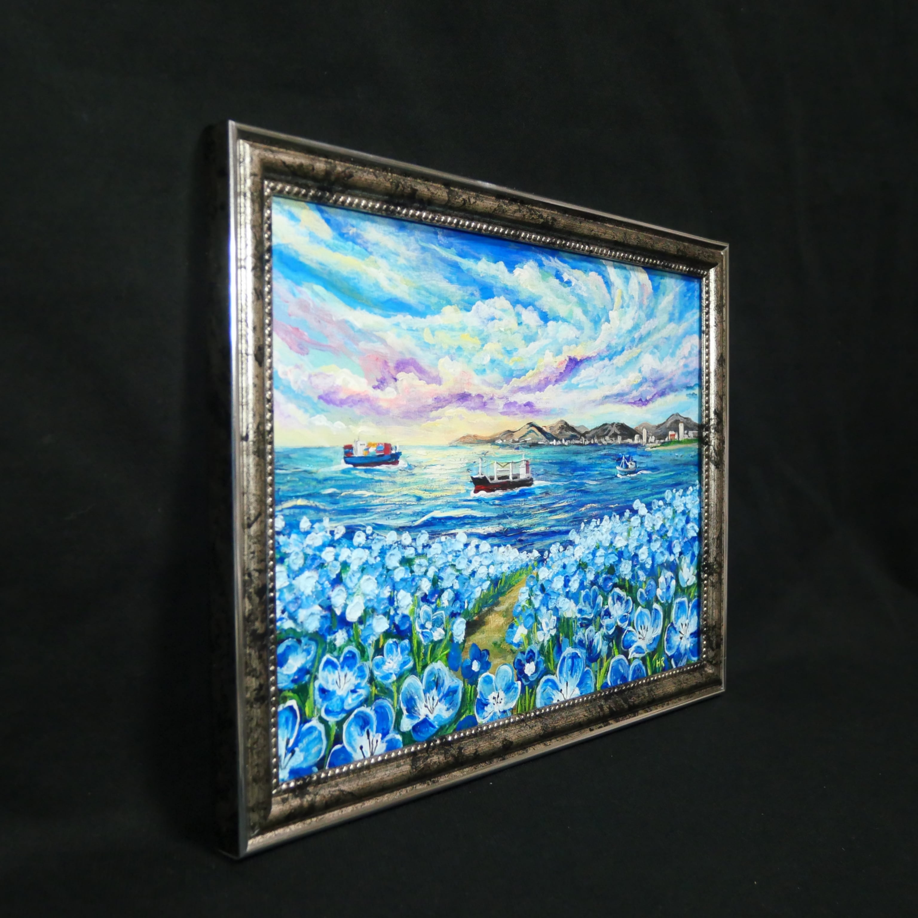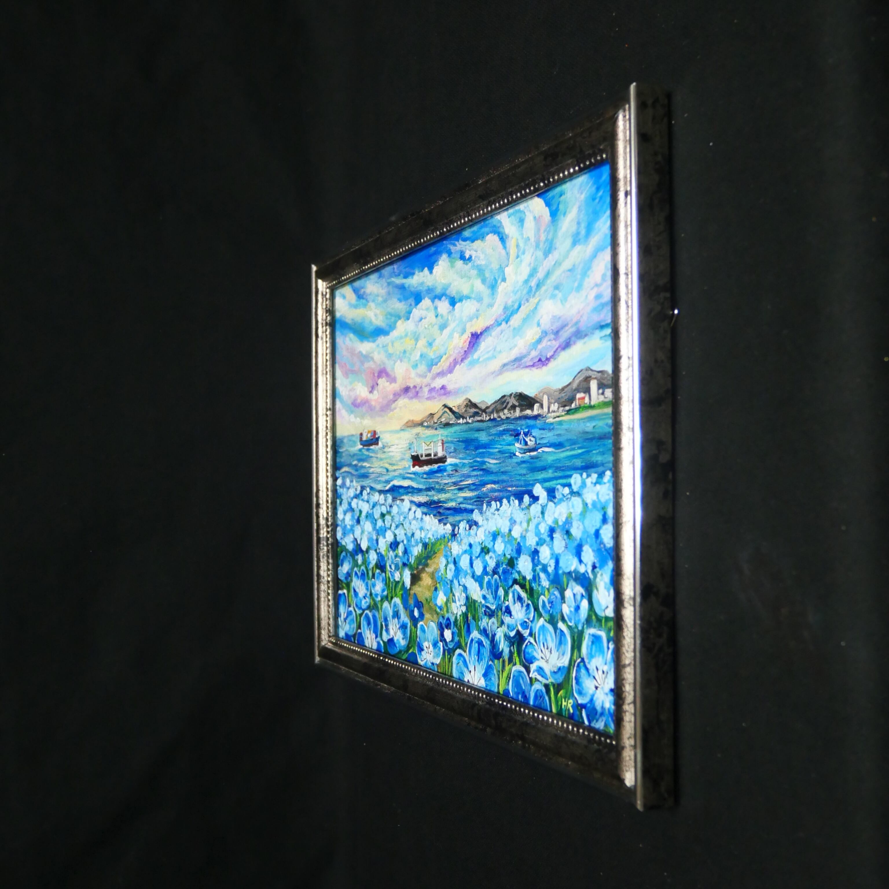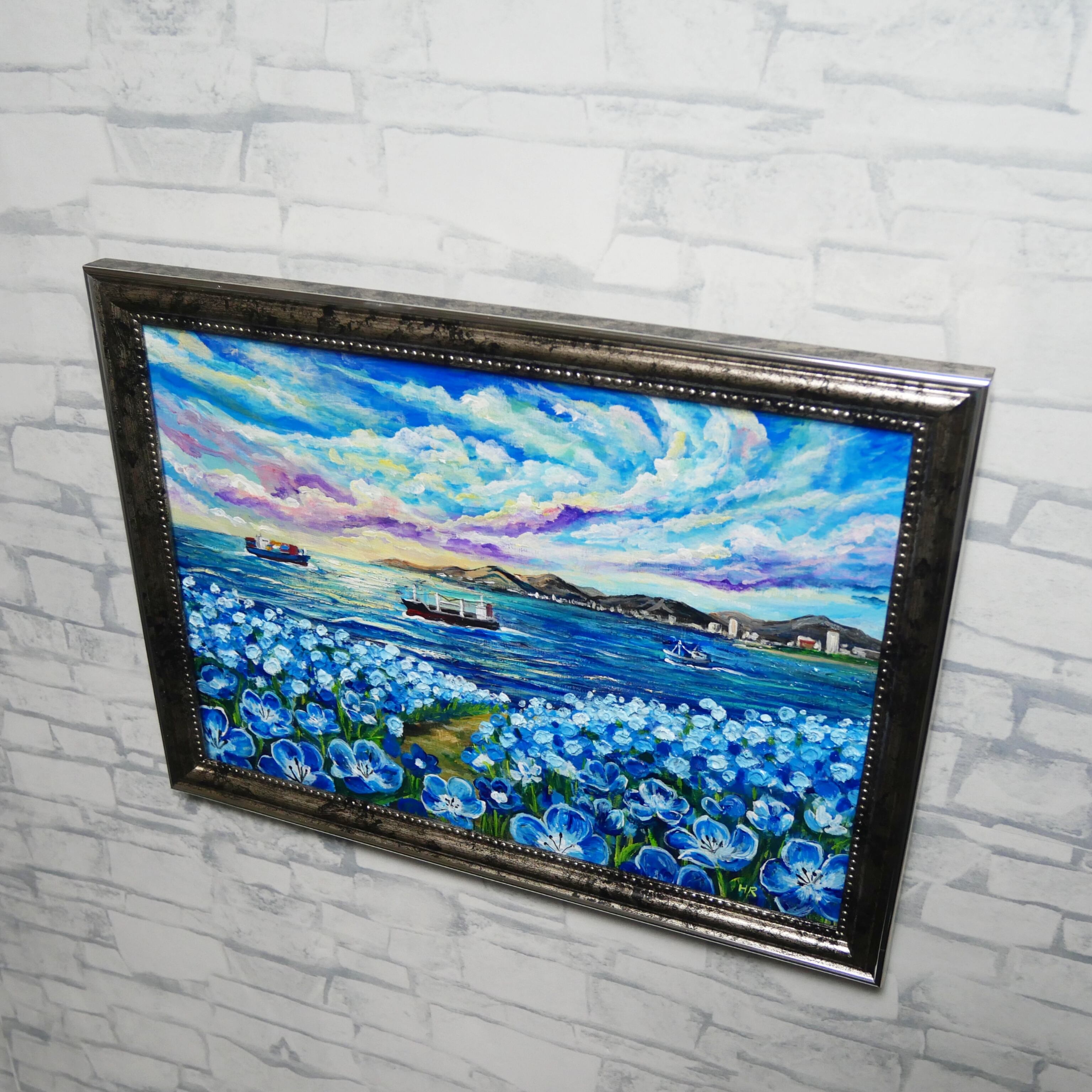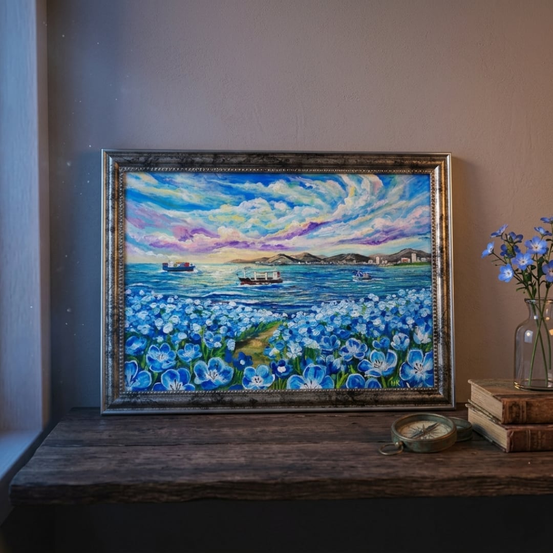 心が整う「青」のグラデーションが魅力。可憐なネモフィラのブルーから、深く澄んだ海の紺碧、そして夕暮れを予感させる空の紫まで、色彩の魔術が癒やしと静寂をもたらします。油絵ならではの立体感と、幾重にも重ねられた絵の具が生み出す厚塗りの質感は、この作品をただの風景画から一歩進めた「本物の絵画」としての実感を与えます。